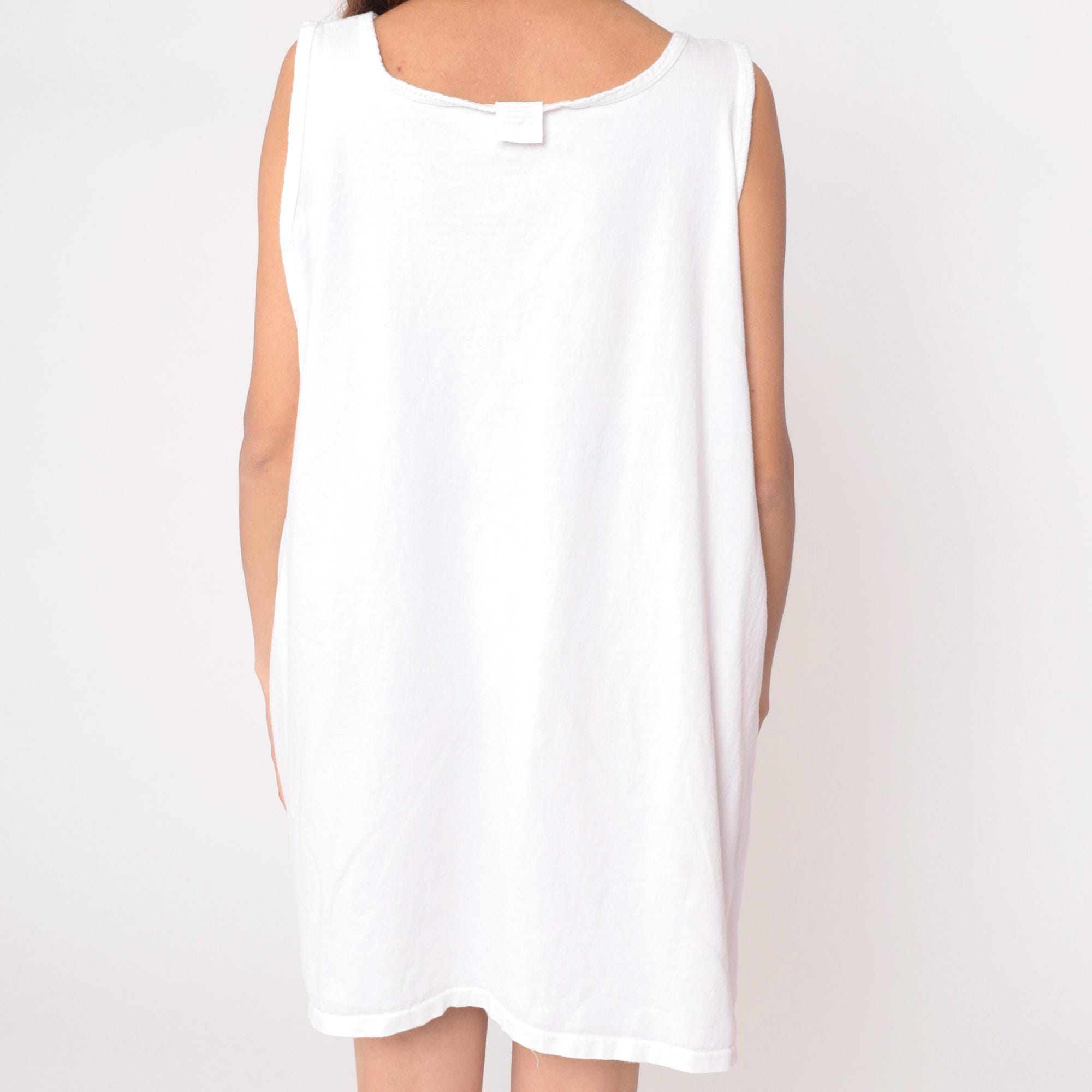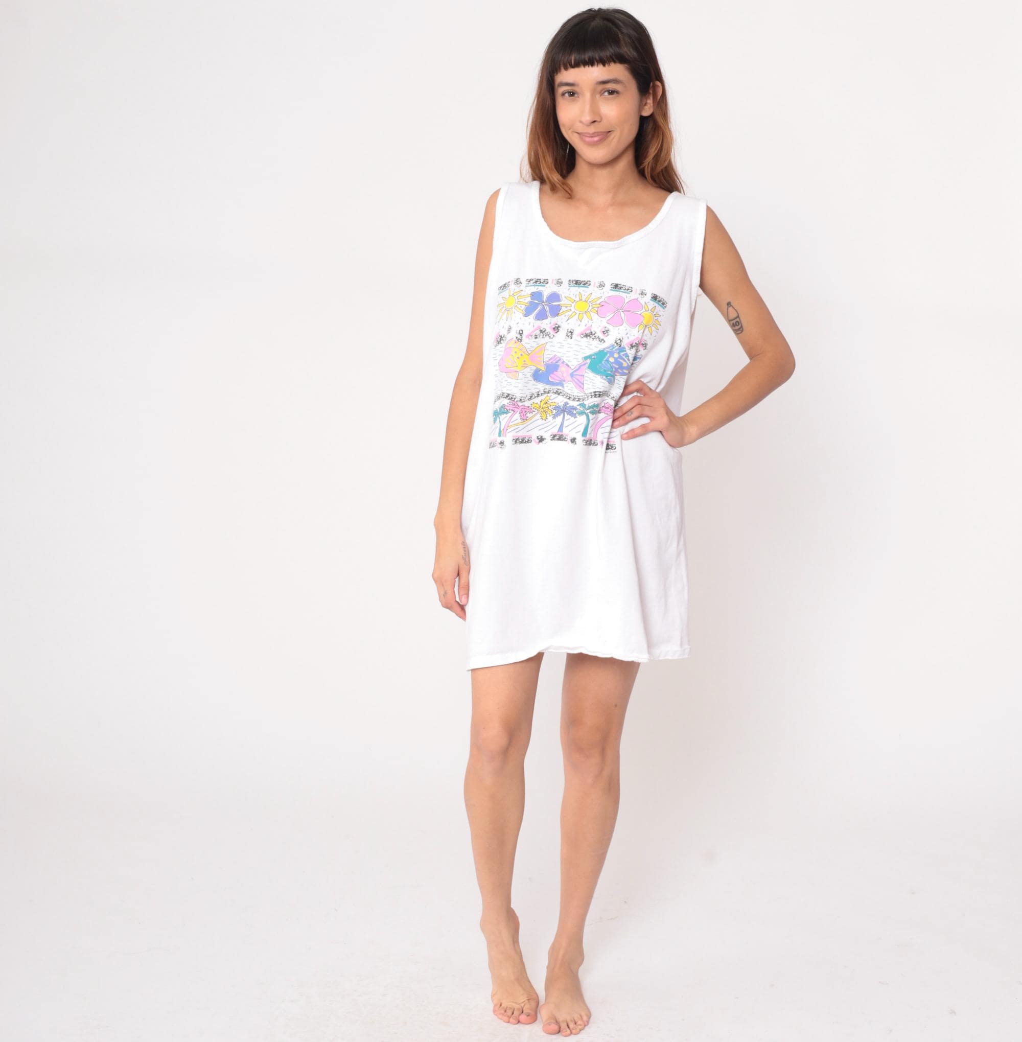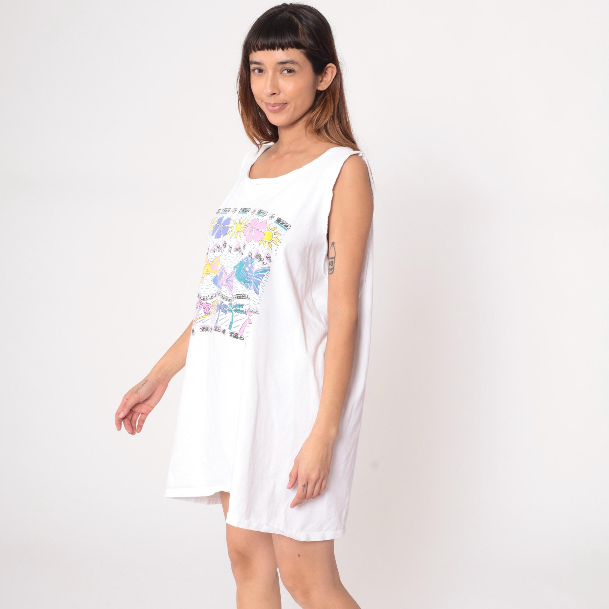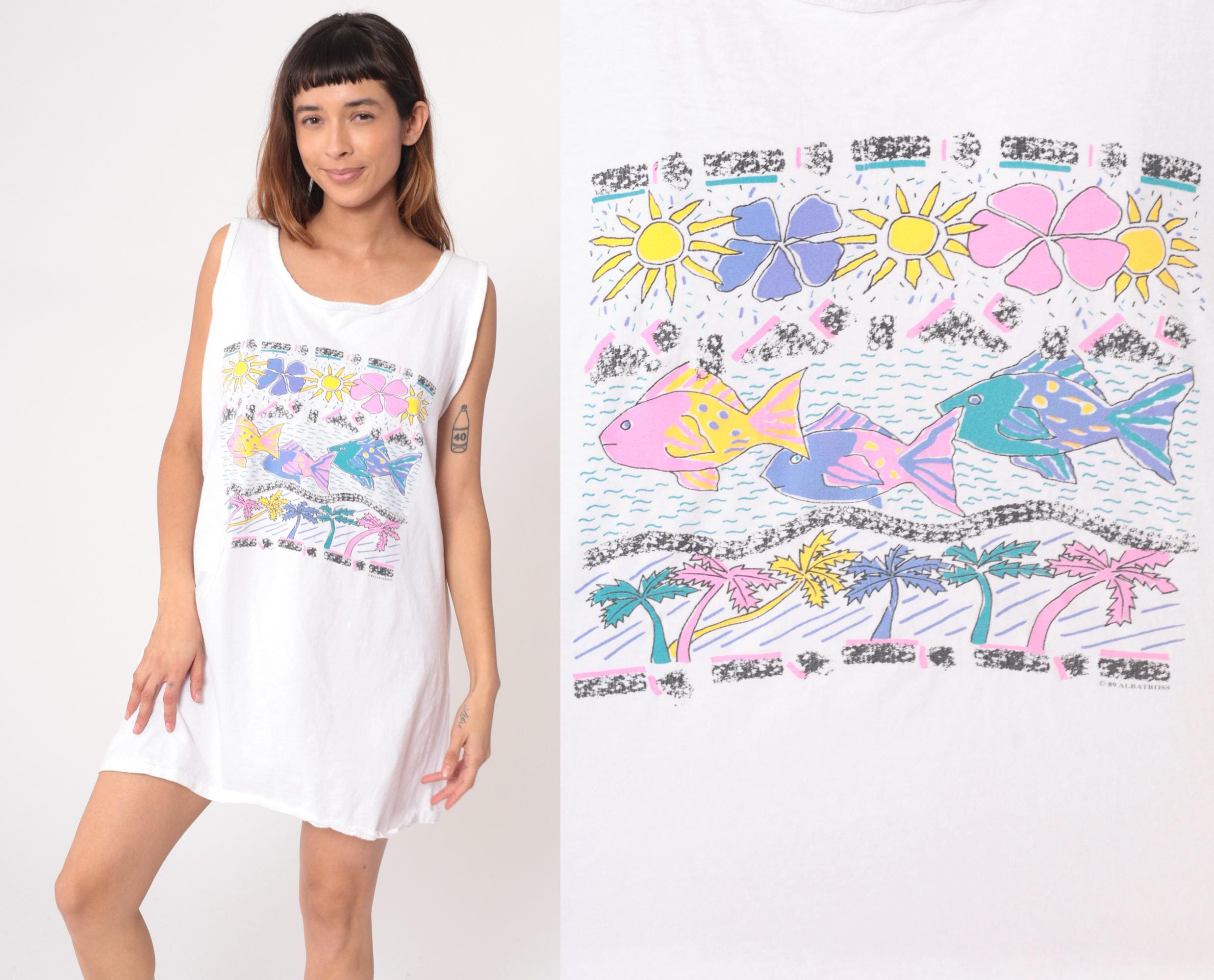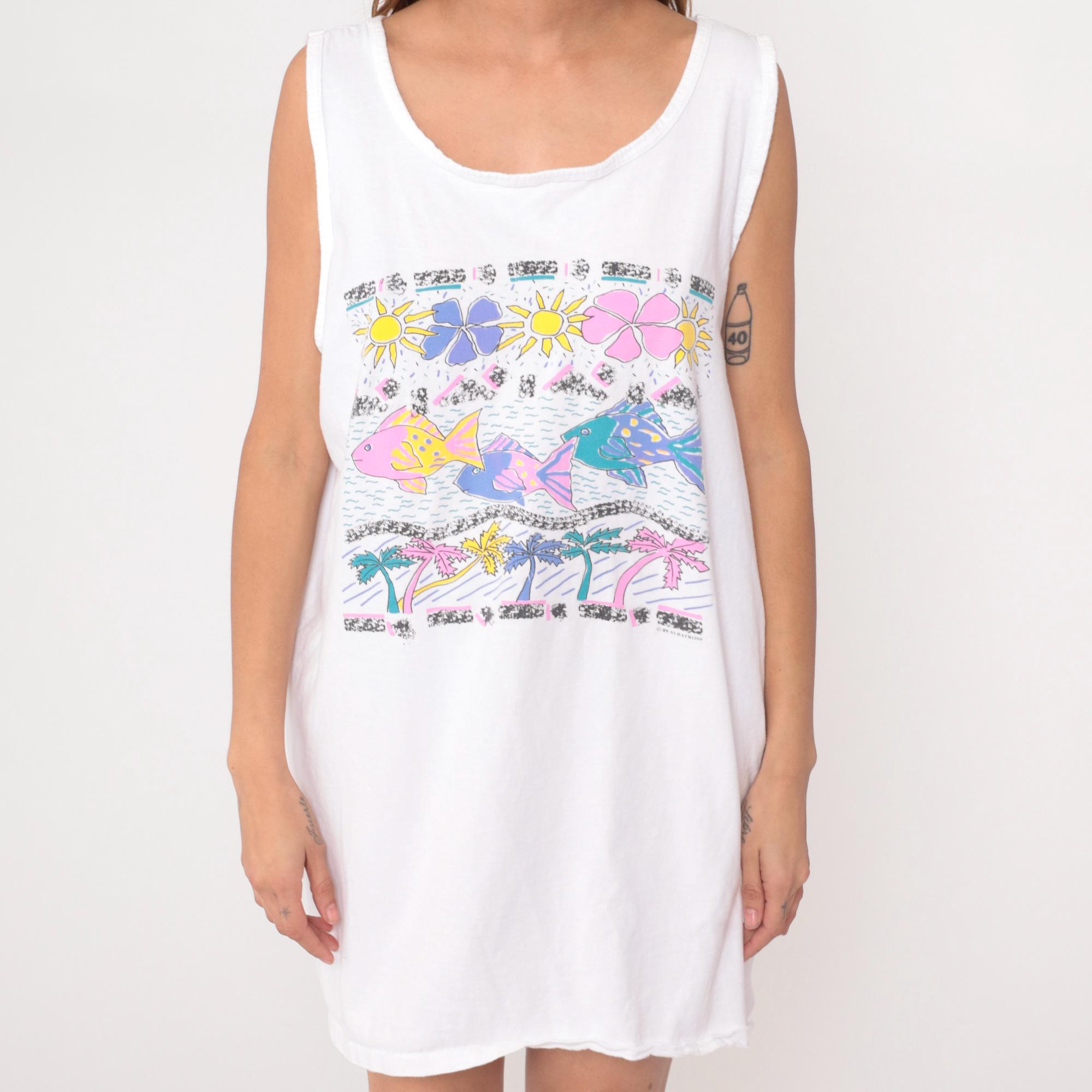 80s white mini dress from white house with tropical graphic print featuring colorful fish, flowers, palm trees, and sun motifs in pink, purple, yellow, and teal. Sleeveless shift style with scoop neckline and straight A-line silhouette.