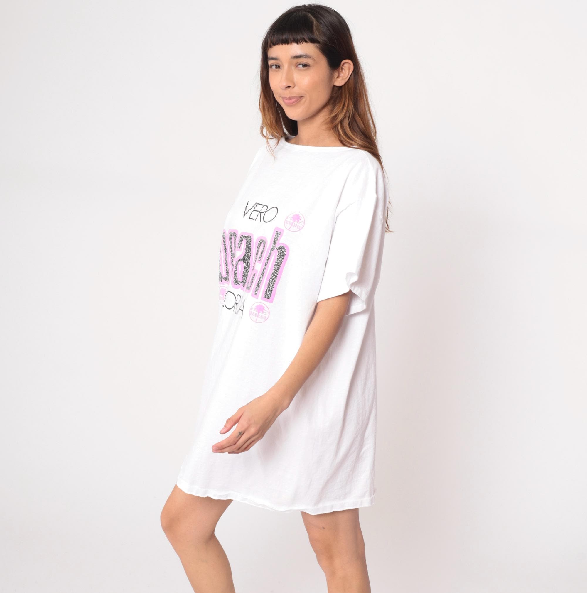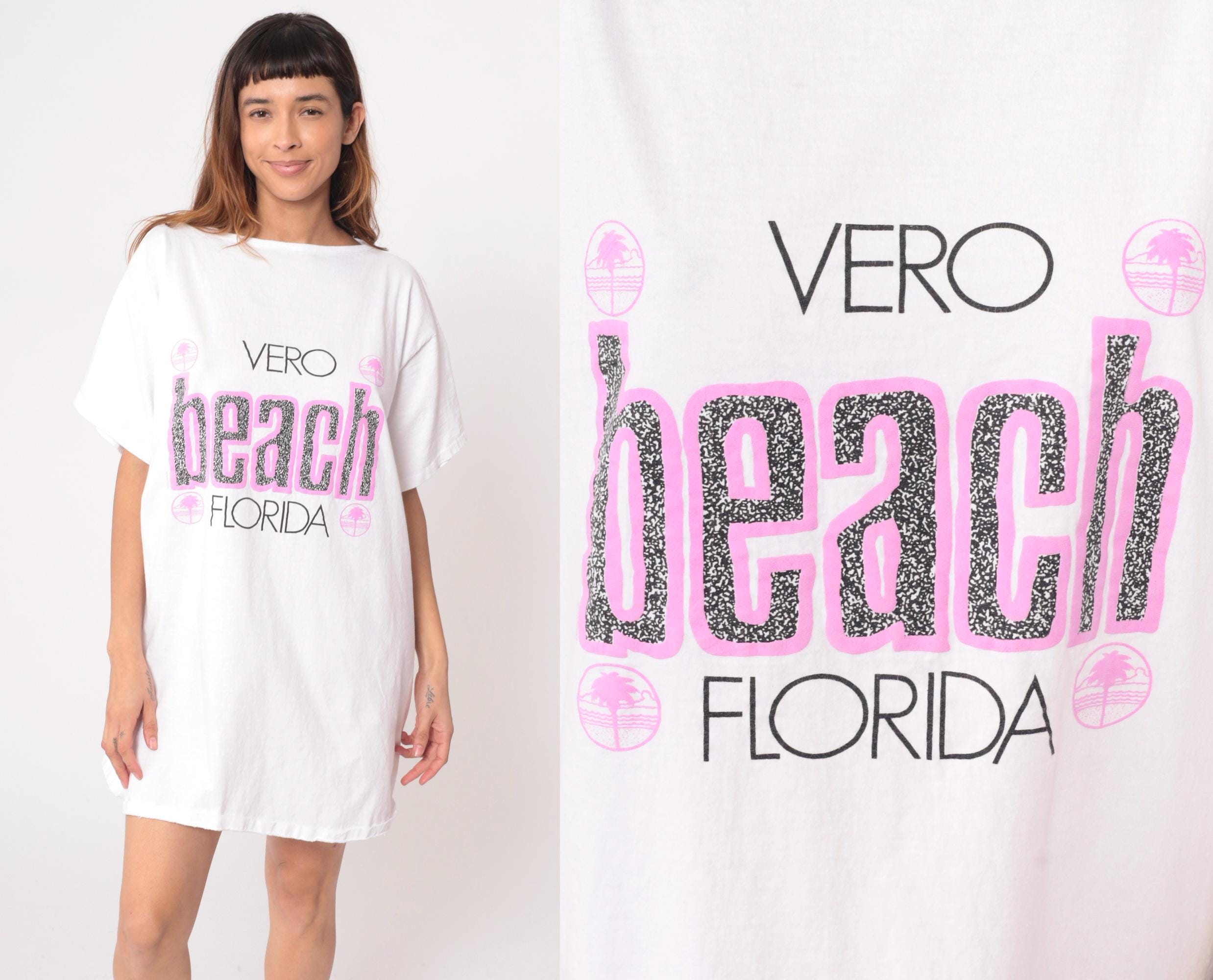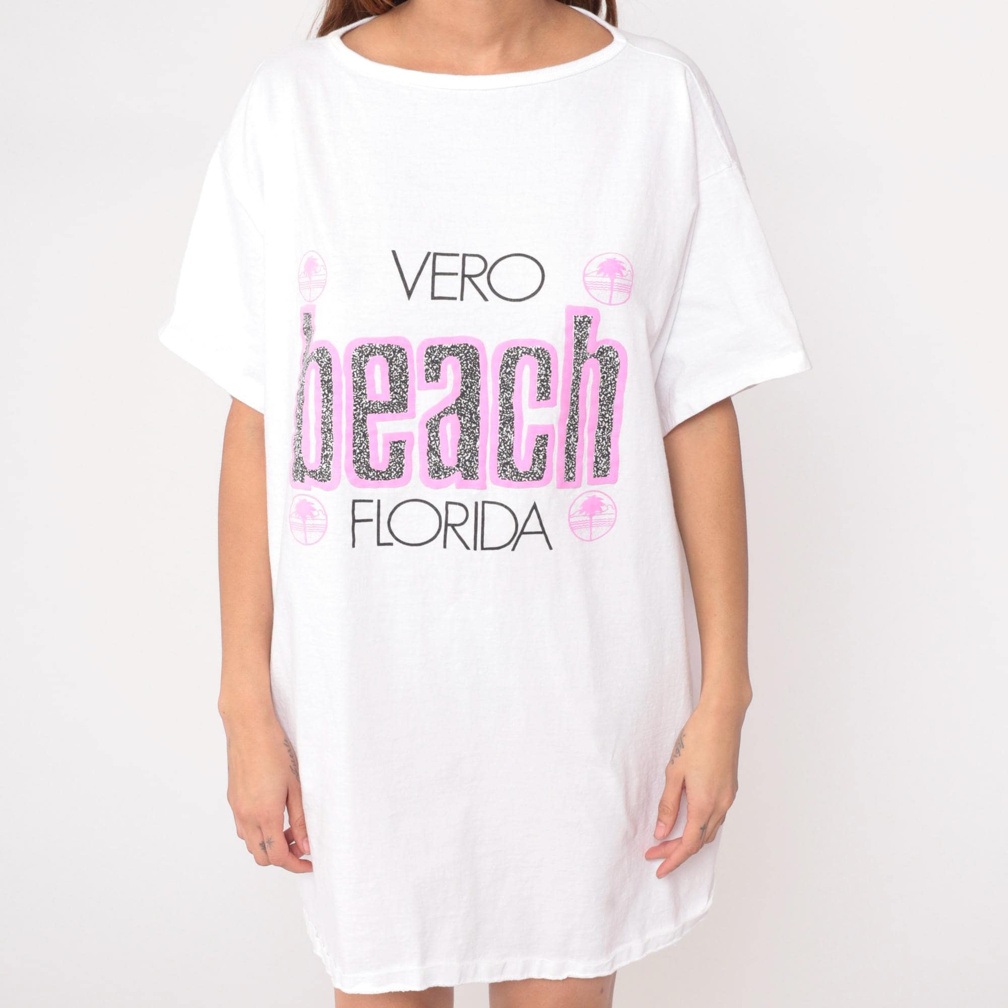 90s white oversized t-shirt from white house with "VERO beach FLORIDA" graphic in pink and textured black lettering, palm tree and sunset circle icons surrounding the text. Short sleeves with dropped shoulders and relaxed, oversized fit that can be worn as a dress or shirt.