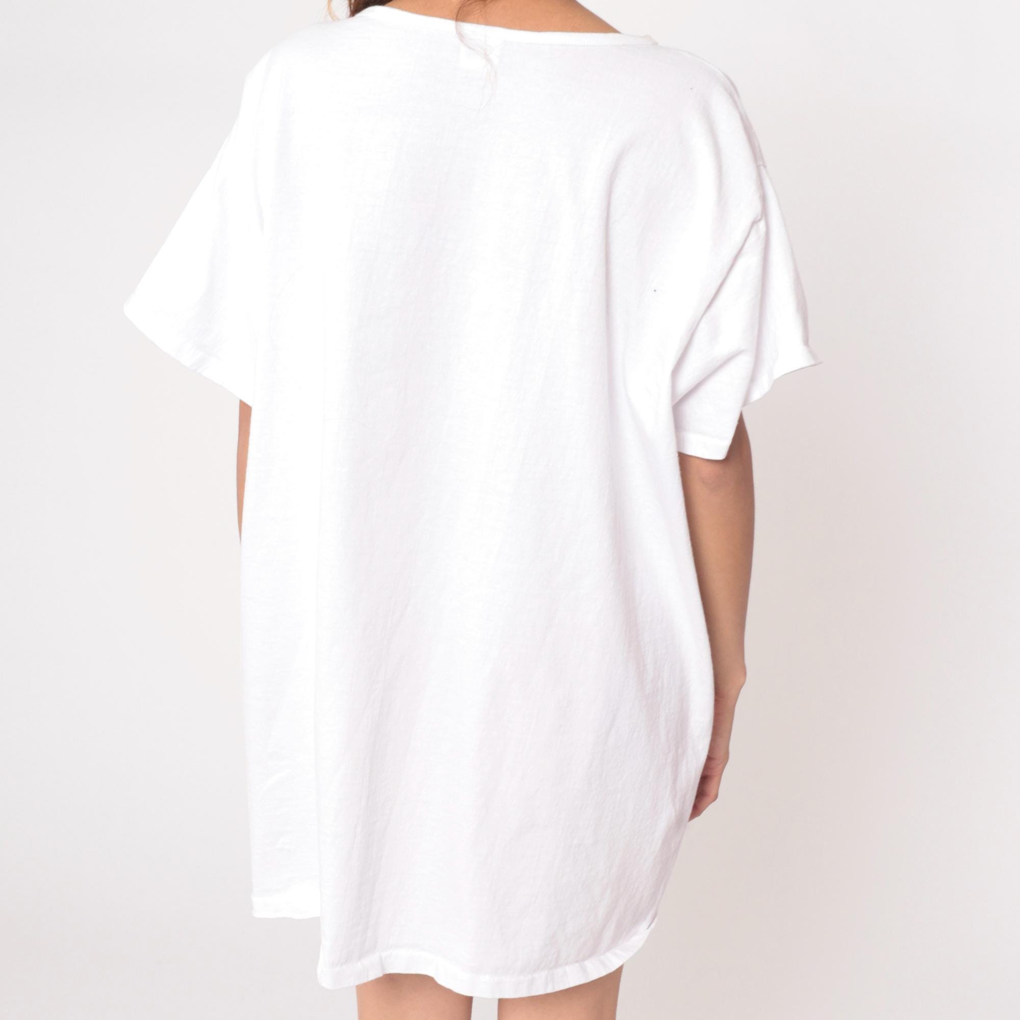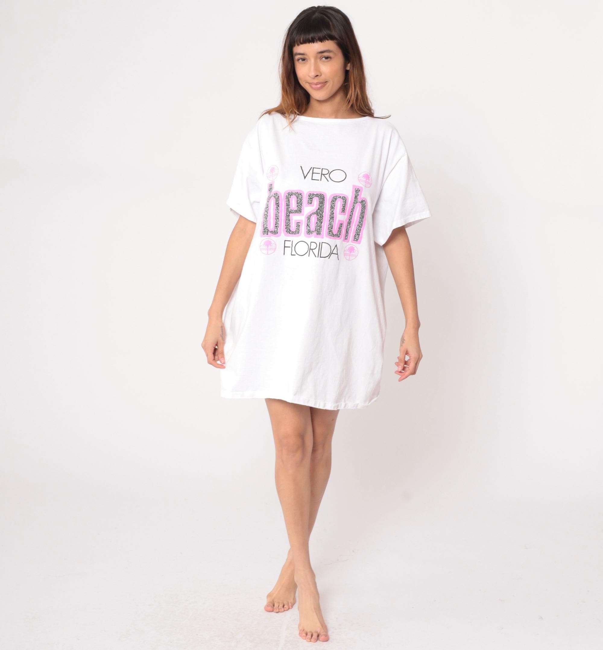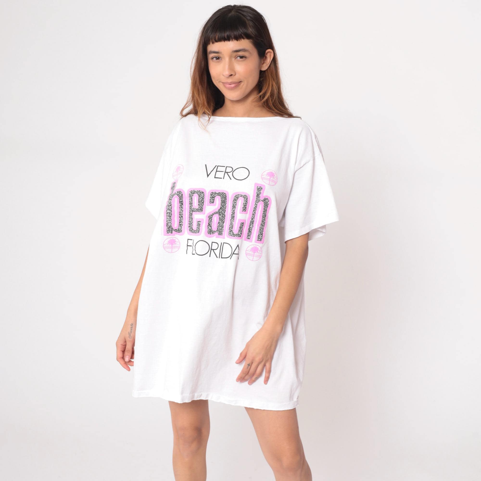 90s white oversized t-shirt from white house with "VERO beach FLORIDA" graphic in pink and textured black lettering, palm tree and sunset circle icons surrounding the text. Short sleeves with dropped shoulders and relaxed, oversized fit that can be worn as a dress or shirt.