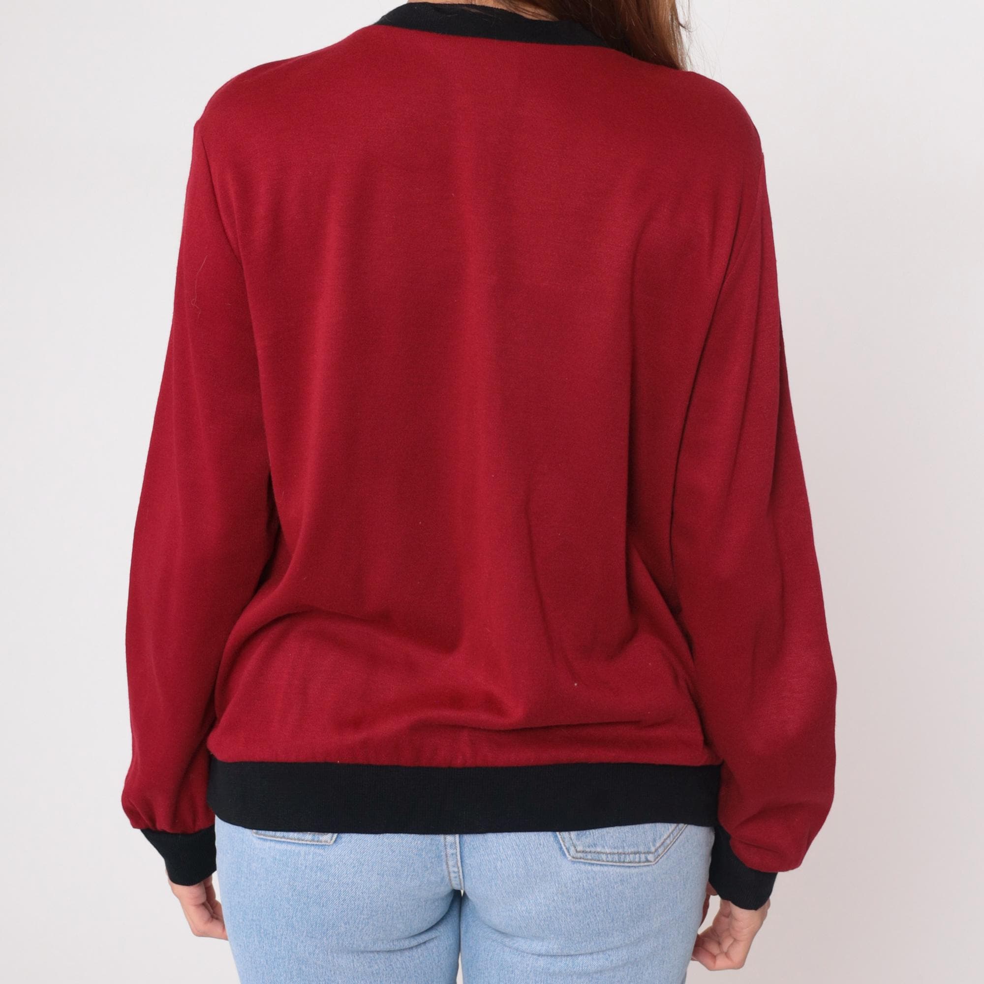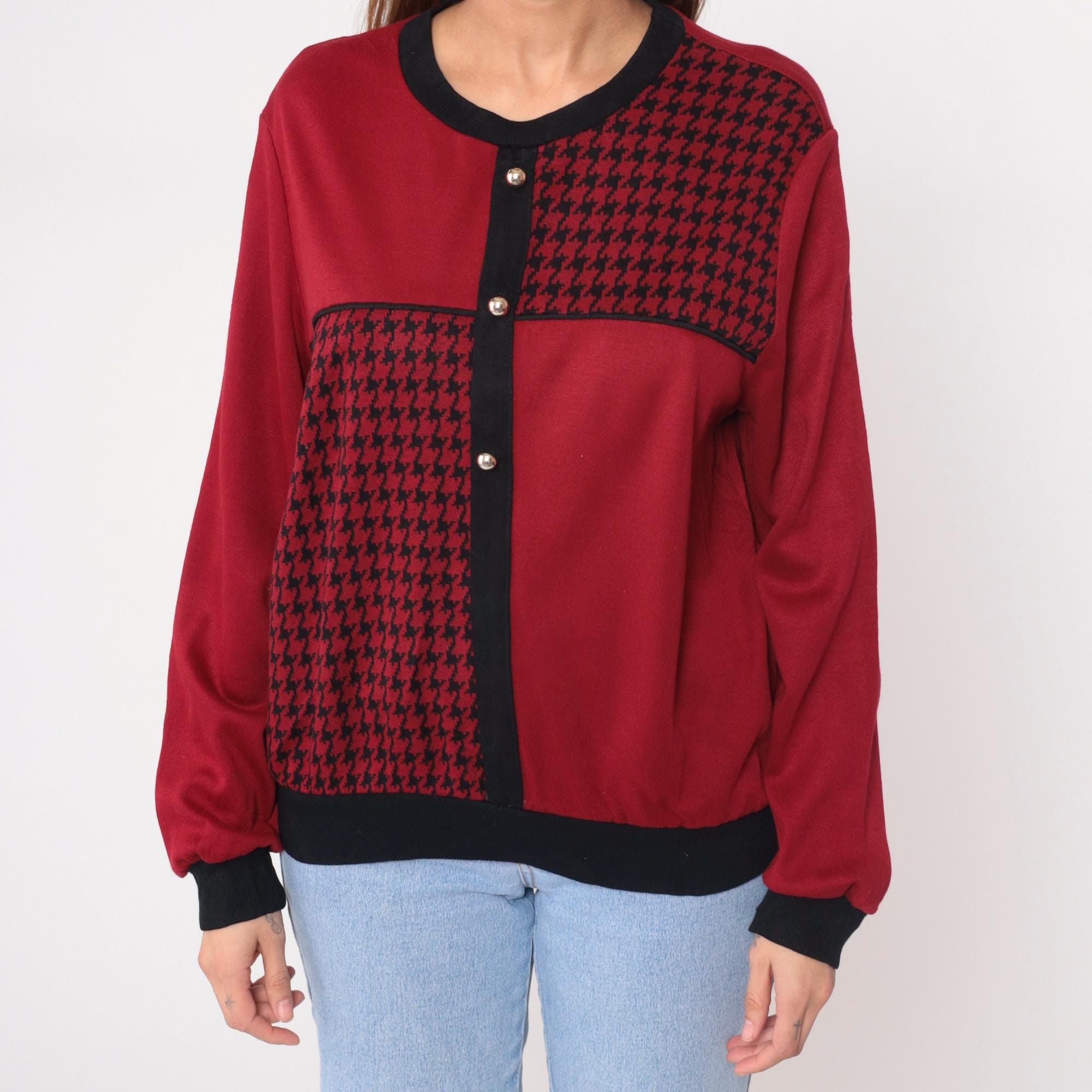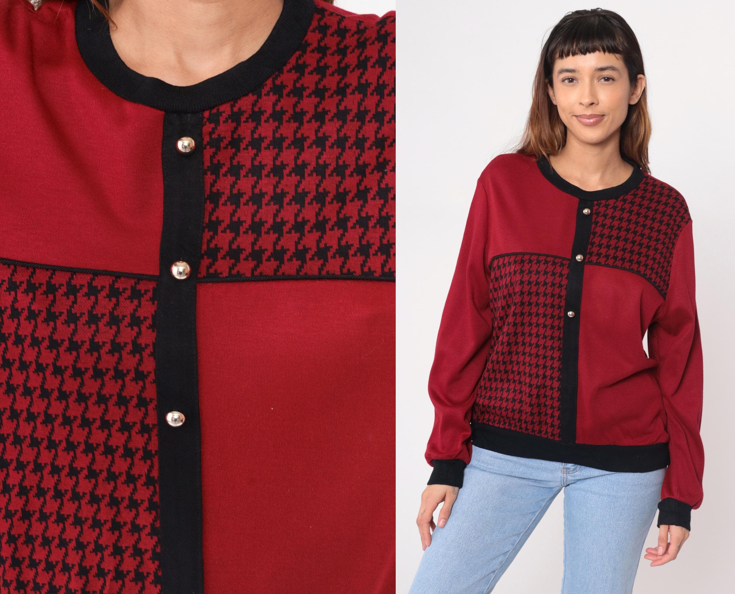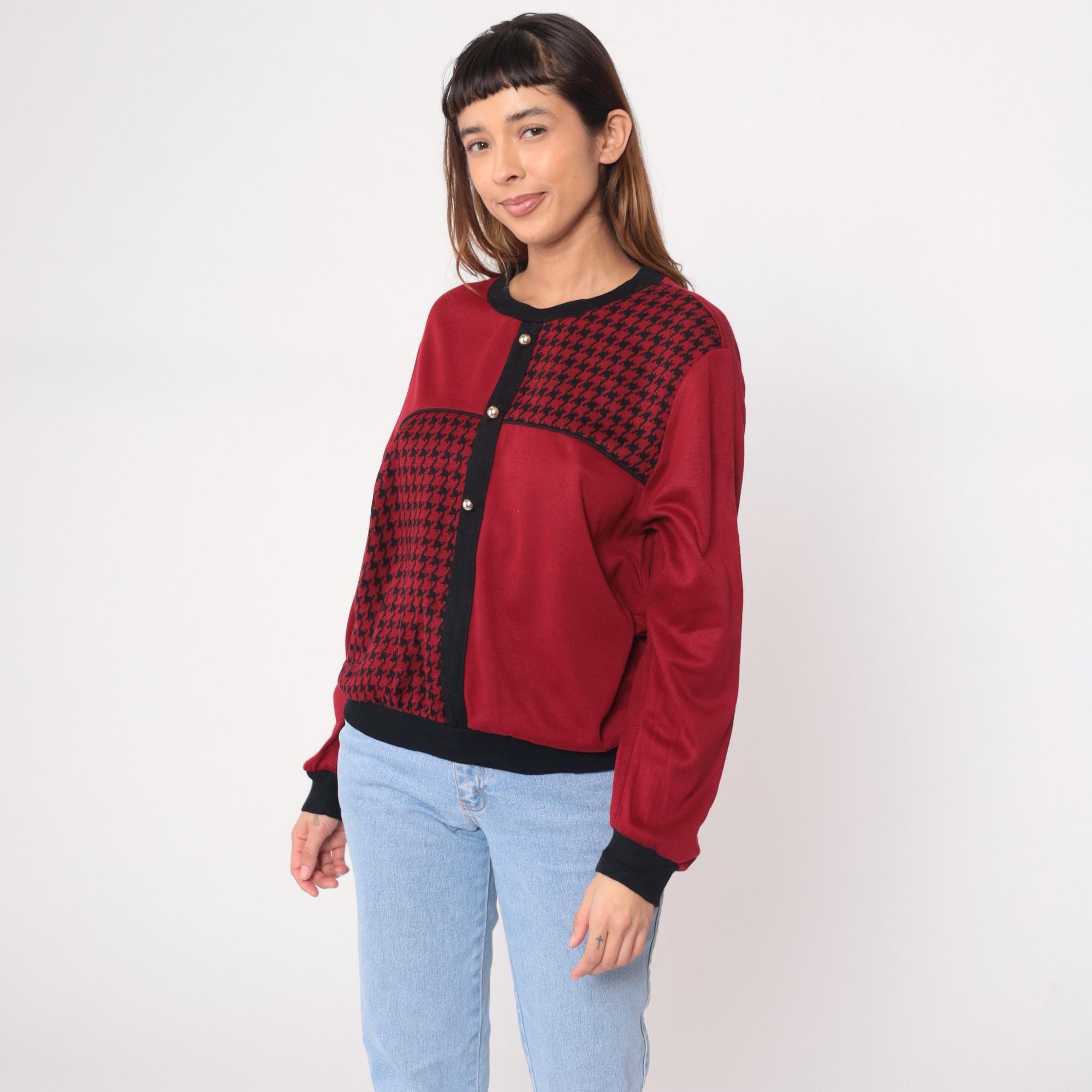 90s burgundy and black color blocked cardigan from Cricket Lane with houndstooth pattern sections. Button front closure with silver metallic buttons, round crew neckline, long sleeves with black ribbed cuffs. Black ribbed trim at collar and hem.