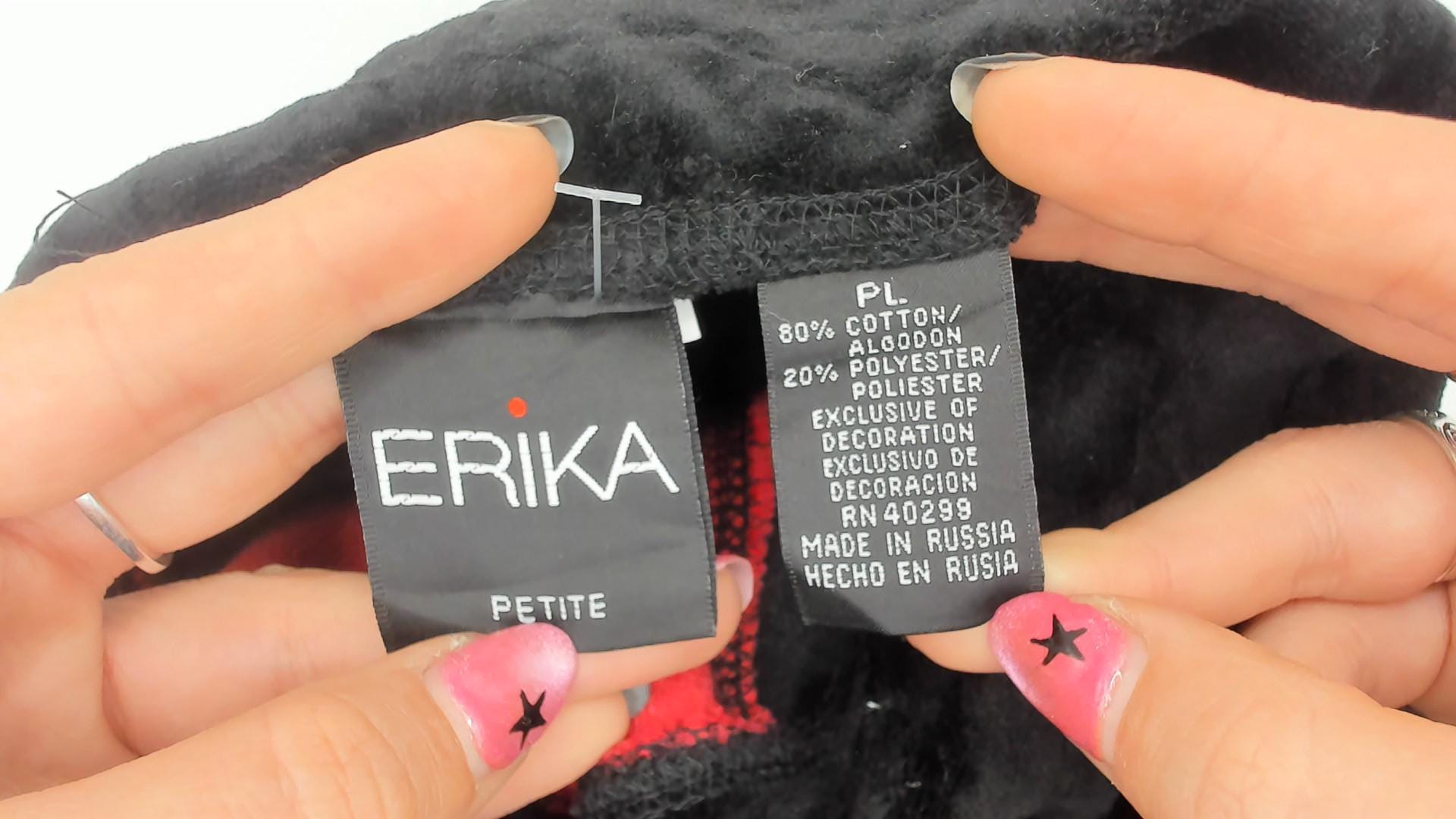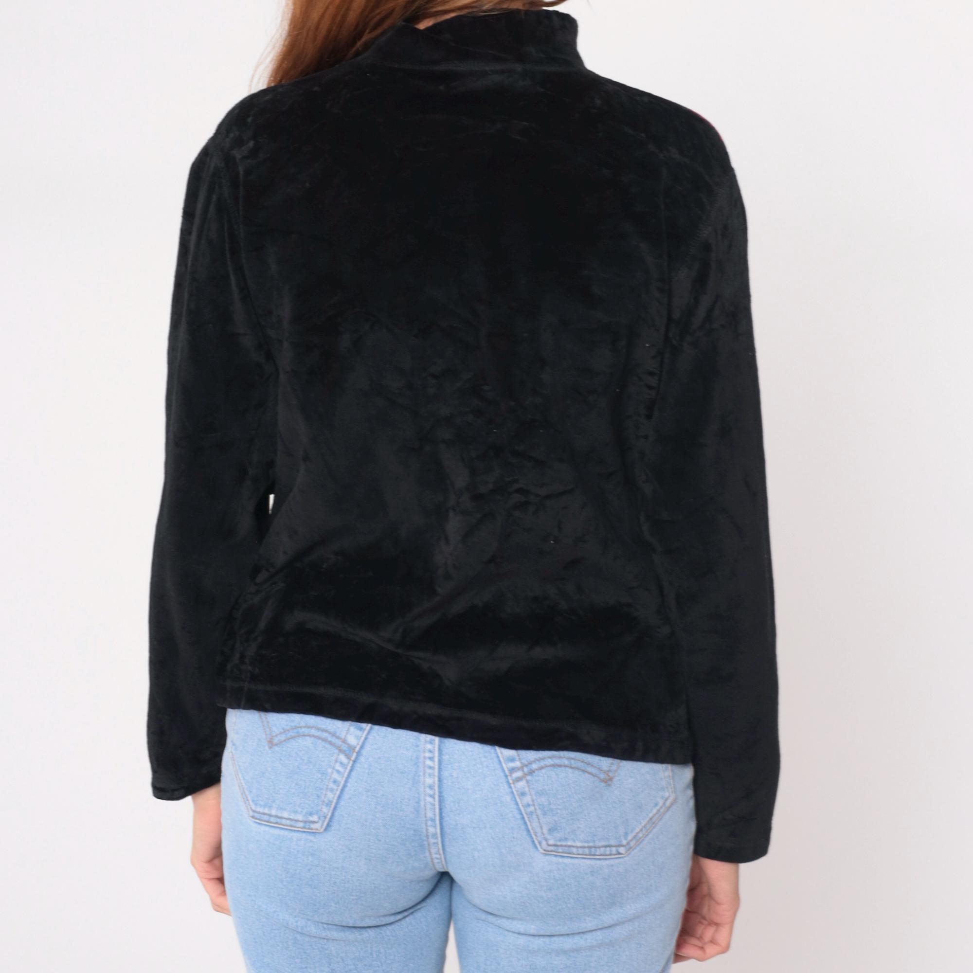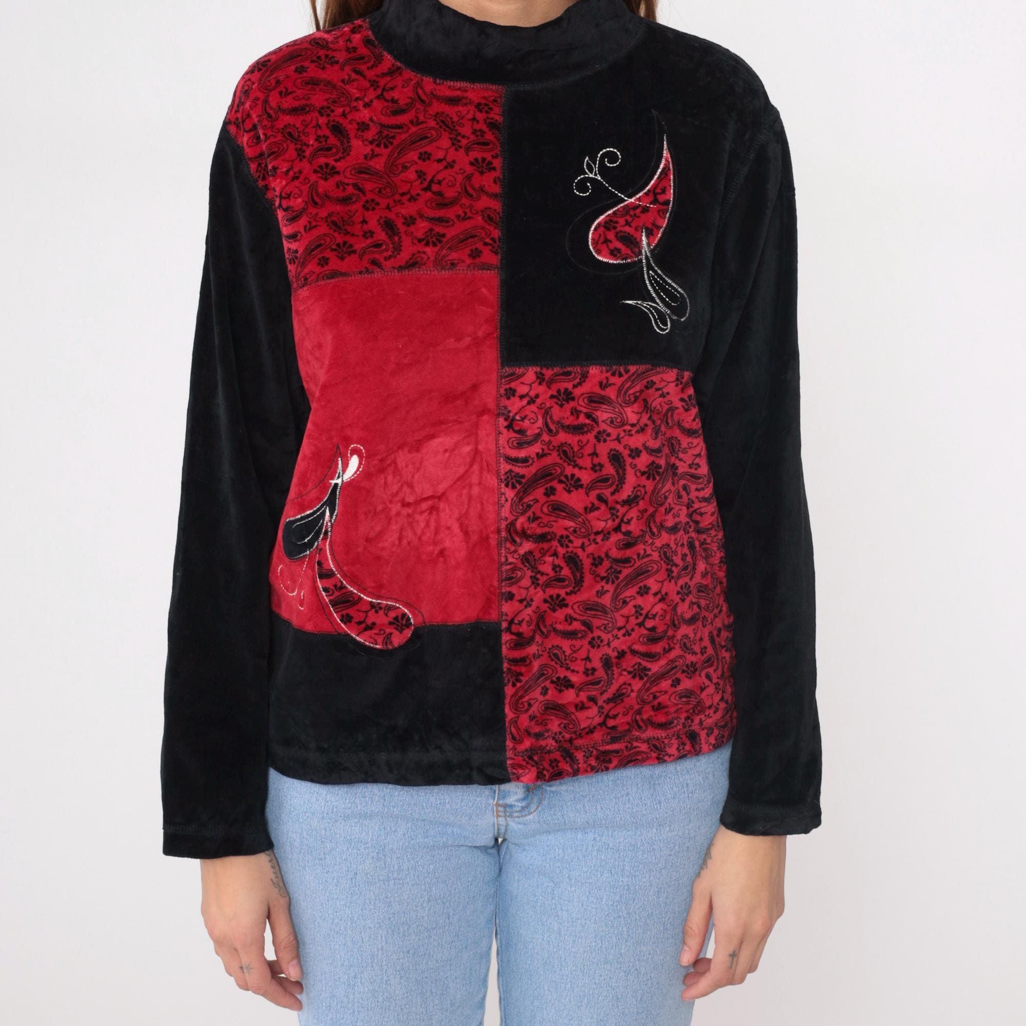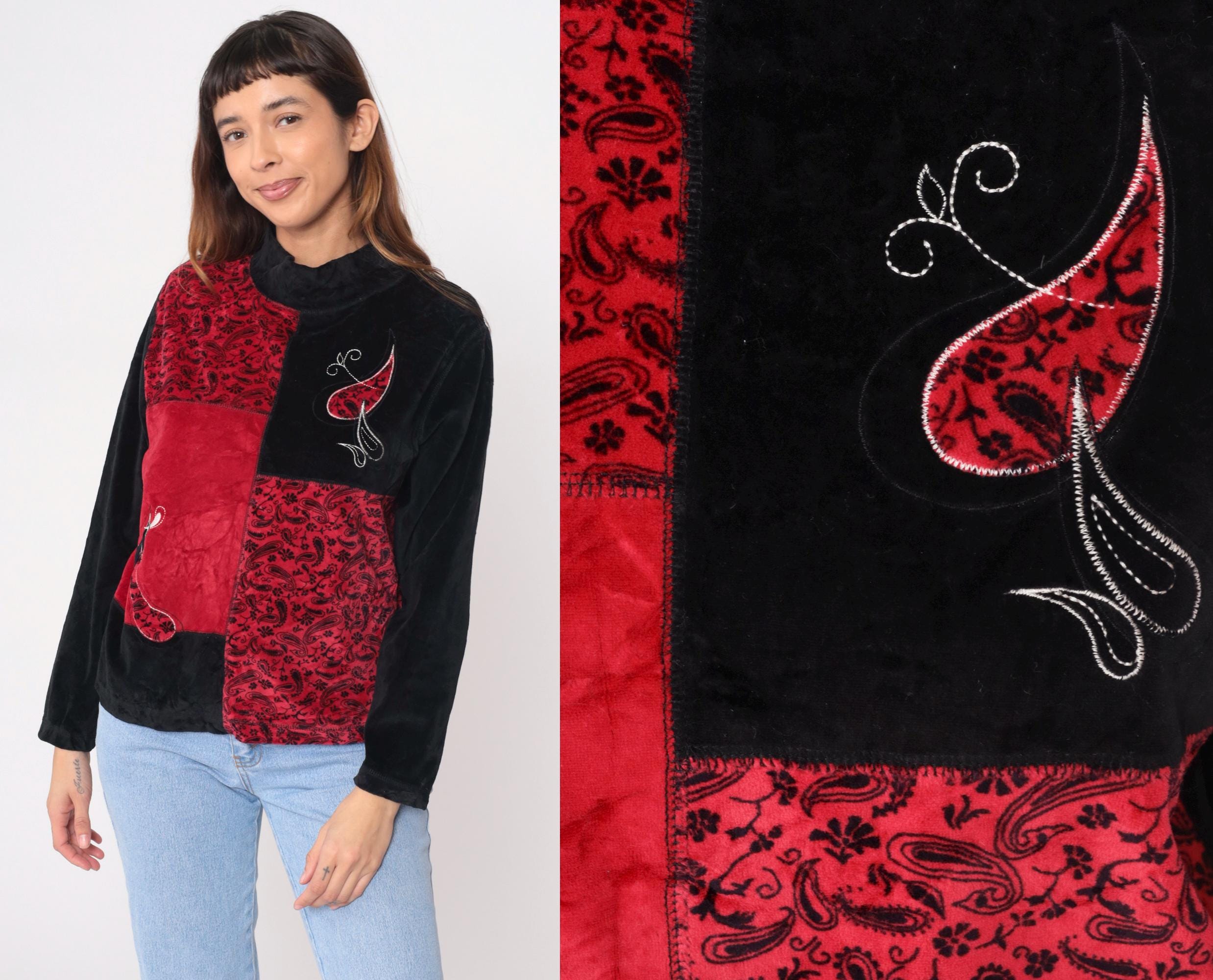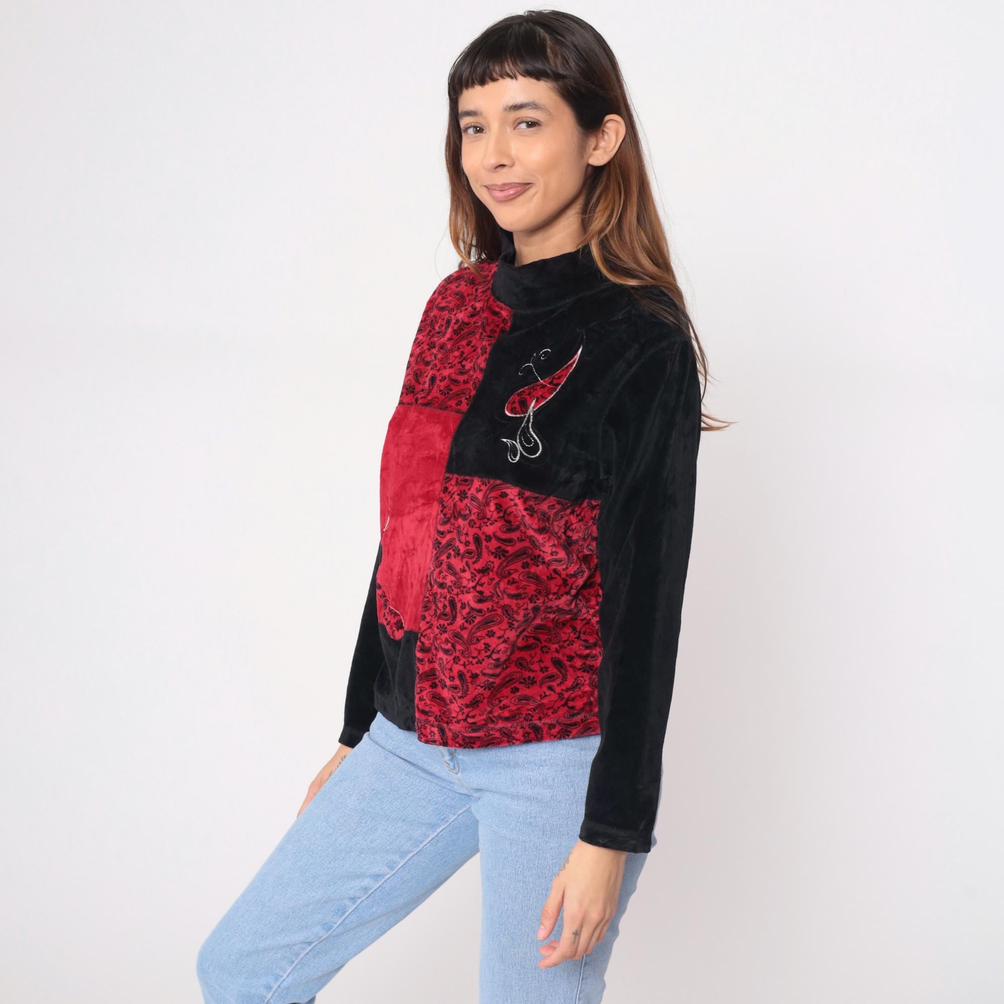 90s black velour top from Erika Petite with red paisley print color blocking across the front. Mock neck collar, long sleeves, embroidered butterfly and stocking appliqués in white and metallic thread. Red sections feature black paisley damask pattern.