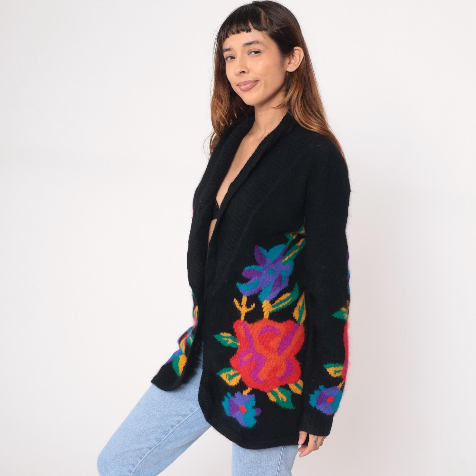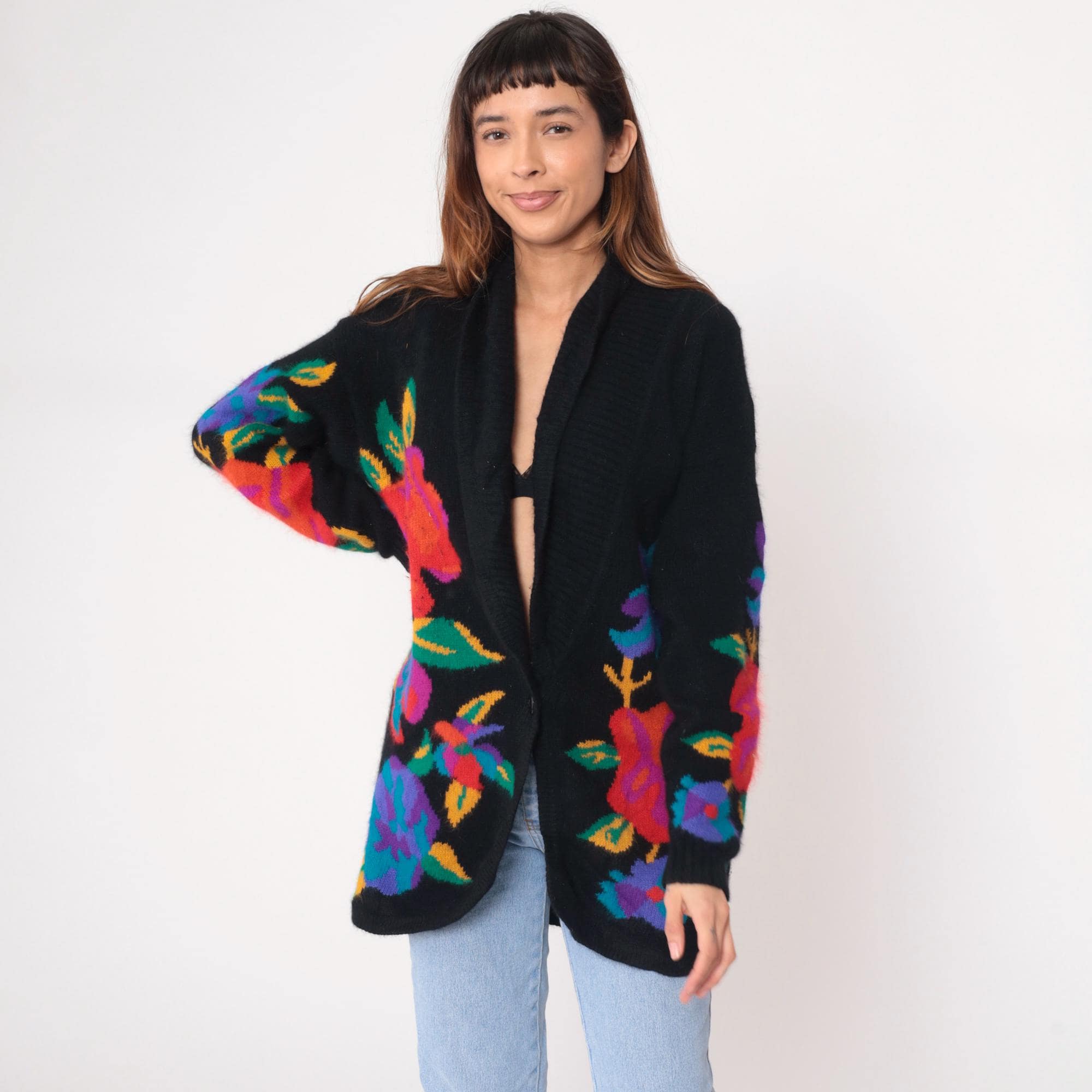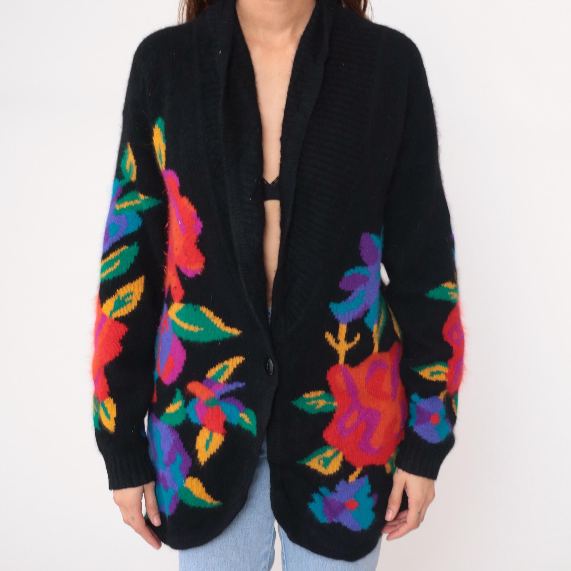 90s black floral cardigan from Rafaella with large multi-colored flowers in red, orange, pink, purple, blue, turquoise, yellow, and green concentrated on the sleeves and lower body. Shawl collar, button front closure, long sleeves with ribbed cuffs and hem. Angora rabbit hair, lambswool, and nylon blend.