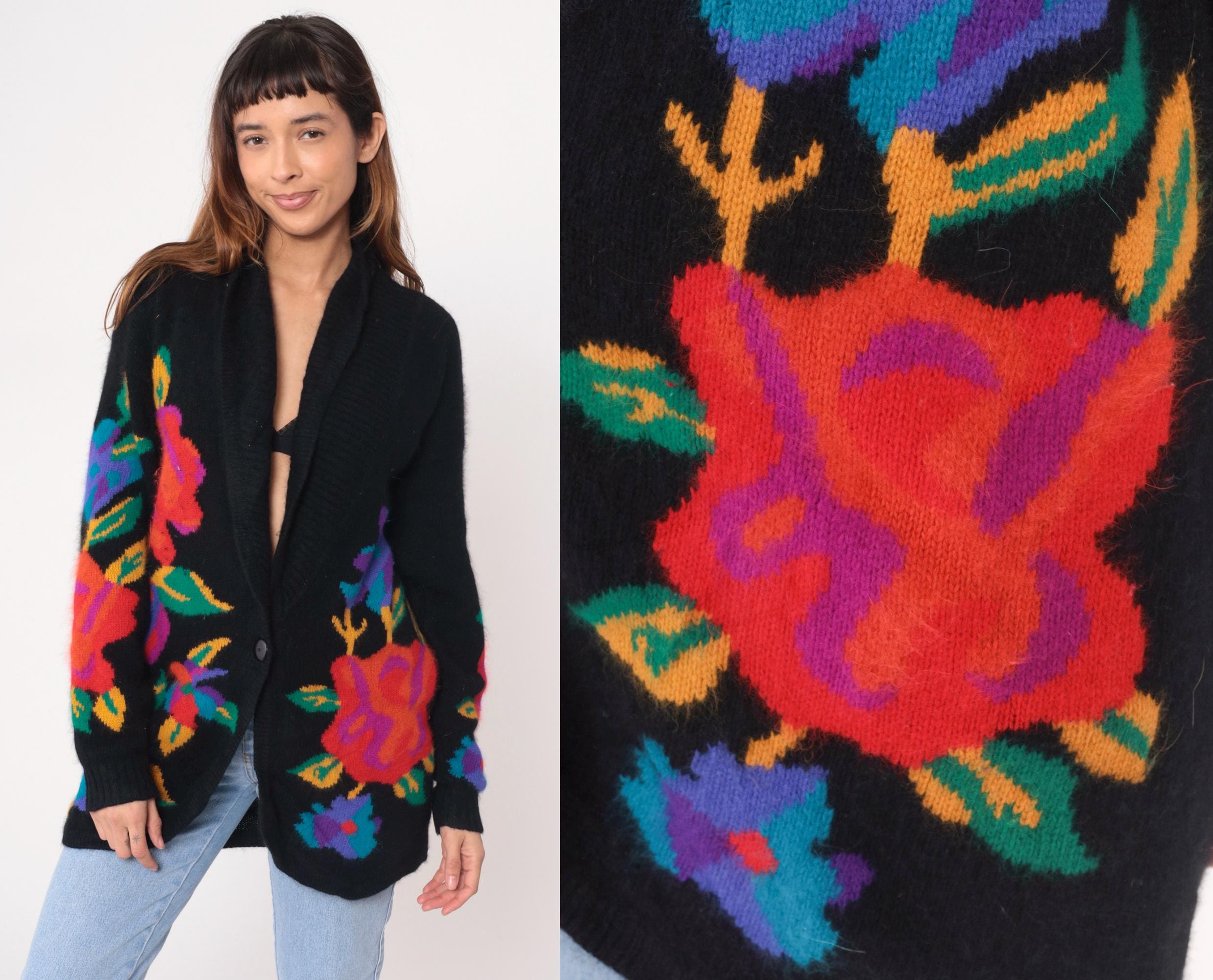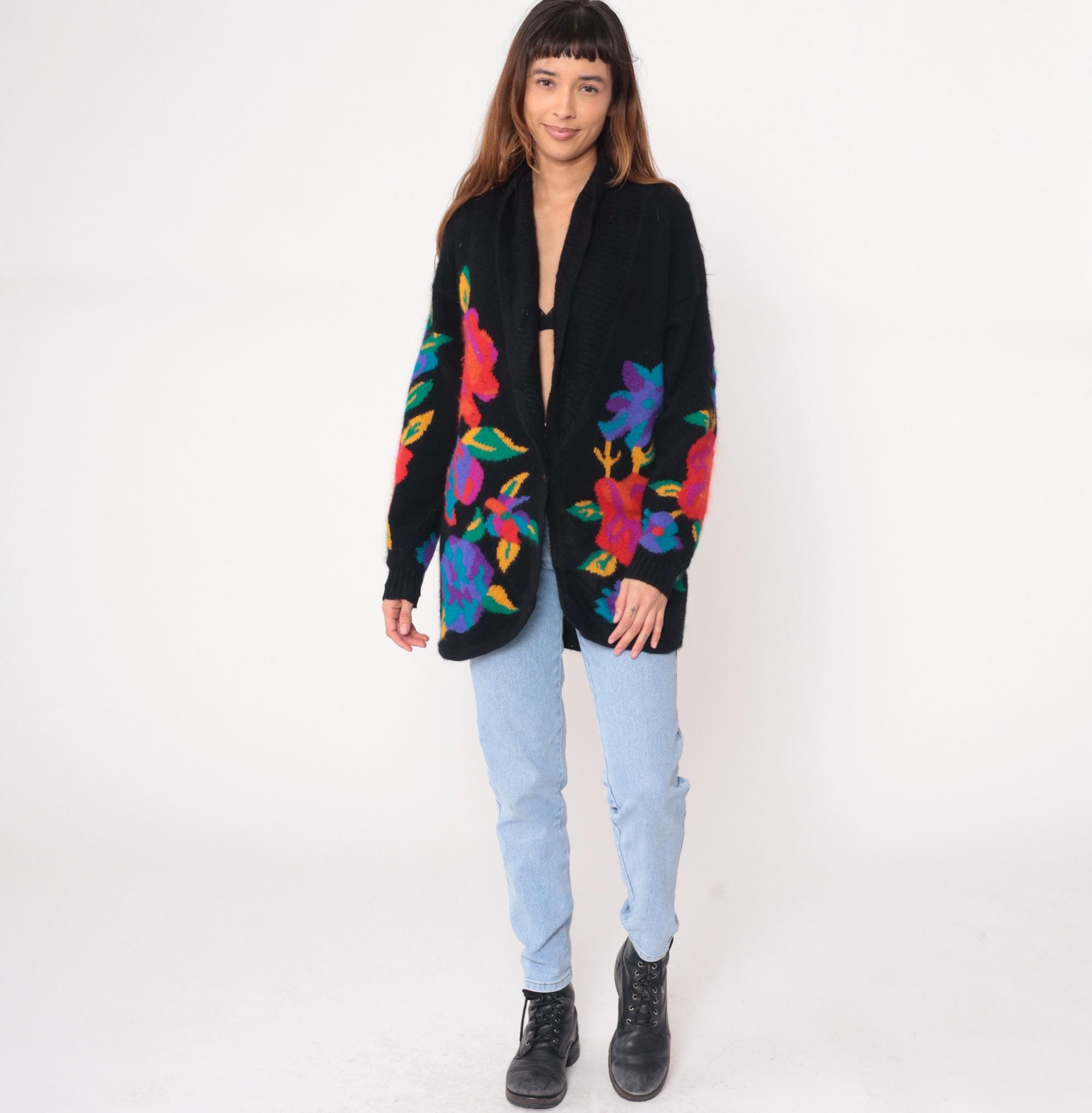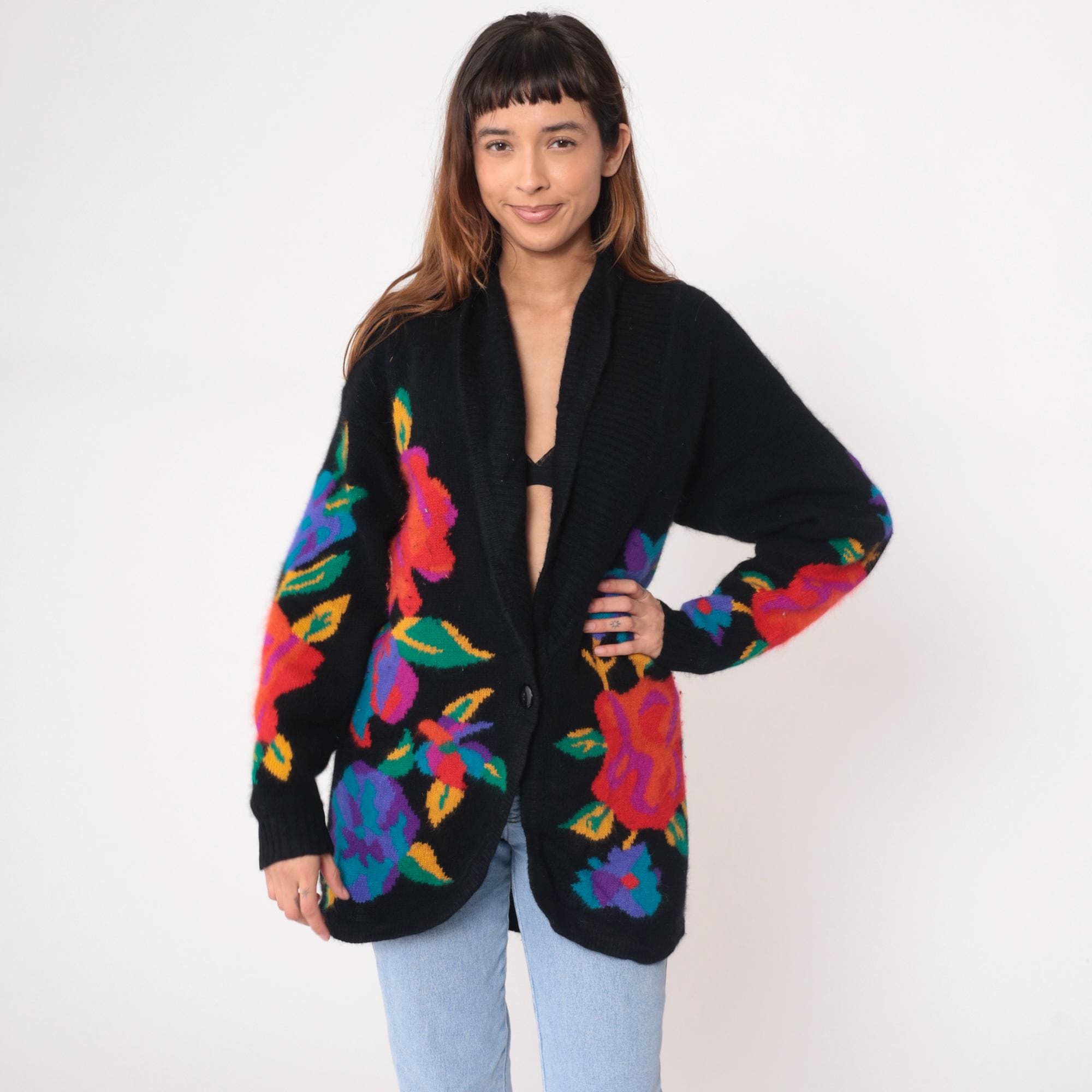 90s black floral cardigan from Rafaella with large multi-colored flowers in red, orange, pink, purple, blue, turquoise, yellow, and green concentrated on the sleeves and lower body. Shawl collar, button front closure, long sleeves with ribbed cuffs and hem. Angora rabbit hair, lambswool, and nylon blend.