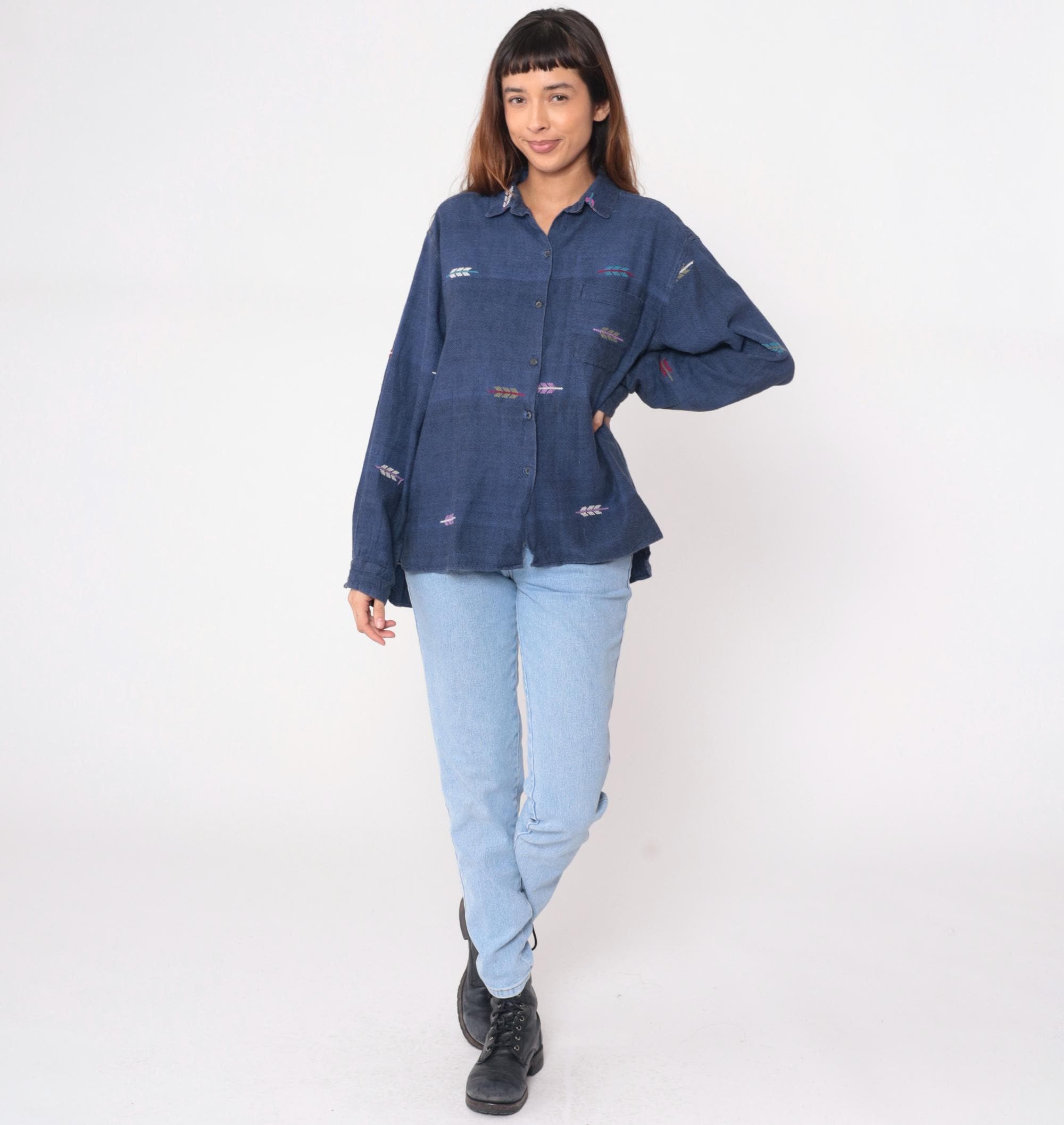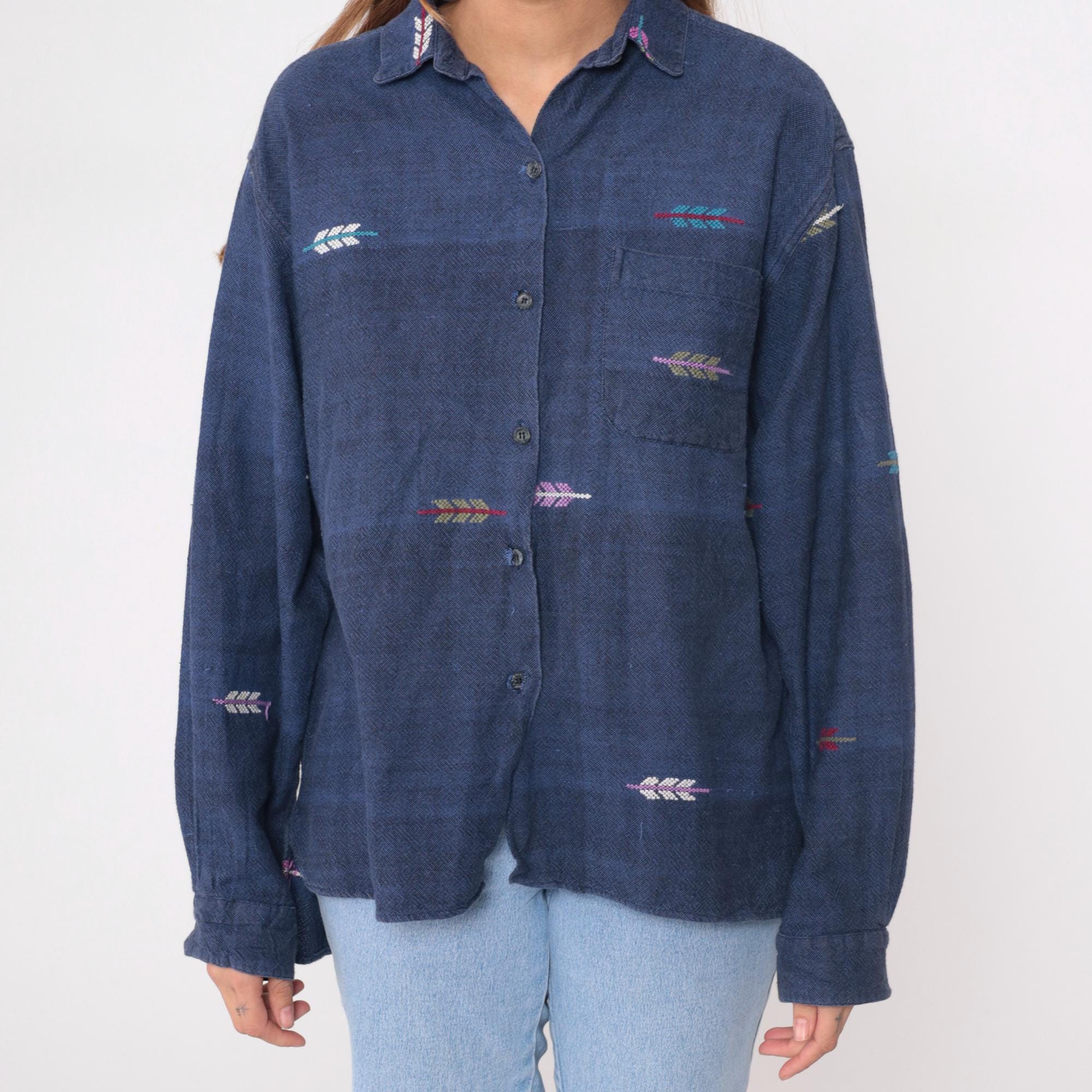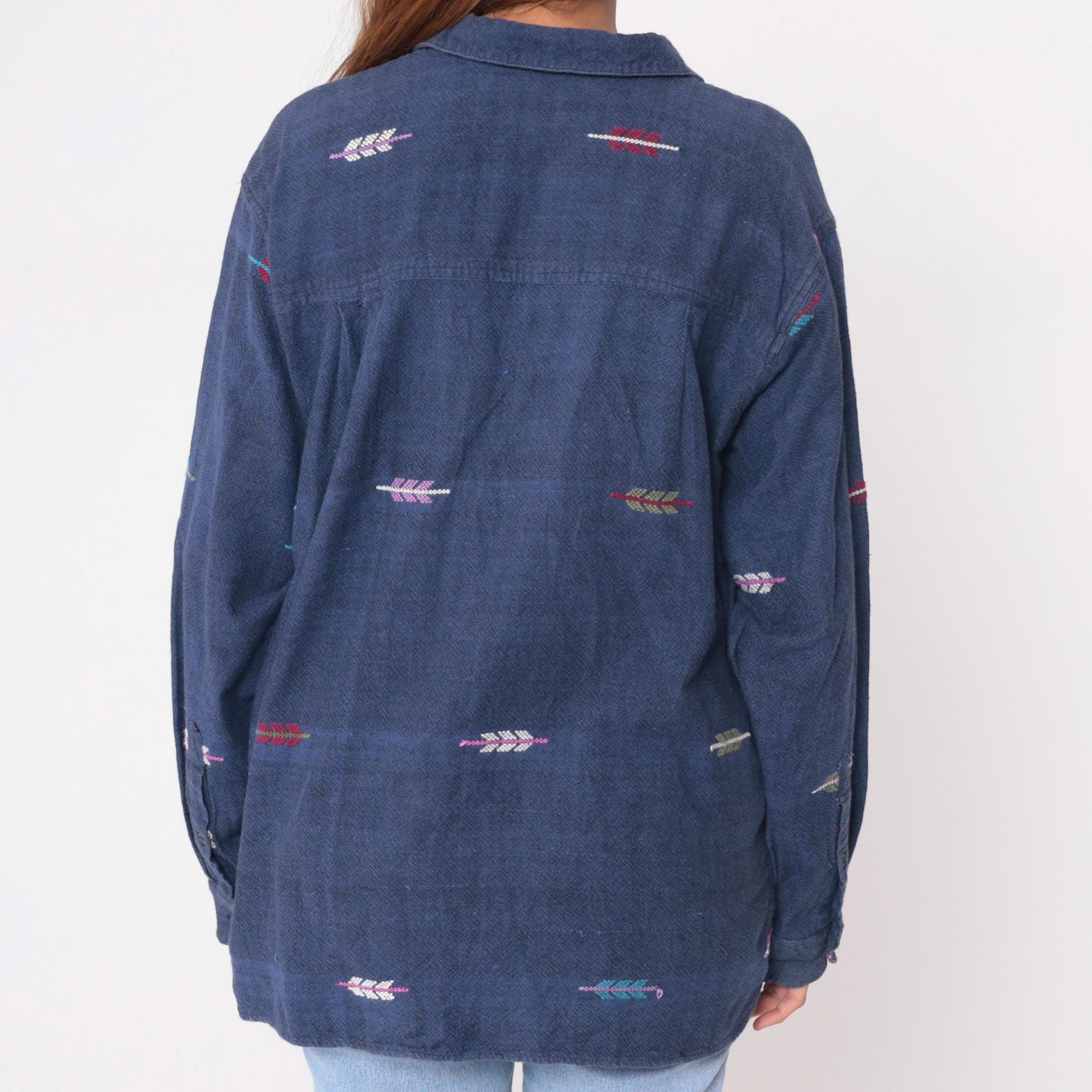 90s navy blue button-up shirt from Picante! with colorful embroidered arrows scattered across the entire garment in pink, white, red, turquoise, yellow, and green thread. Long sleeves, chest pocket, and front button closure.