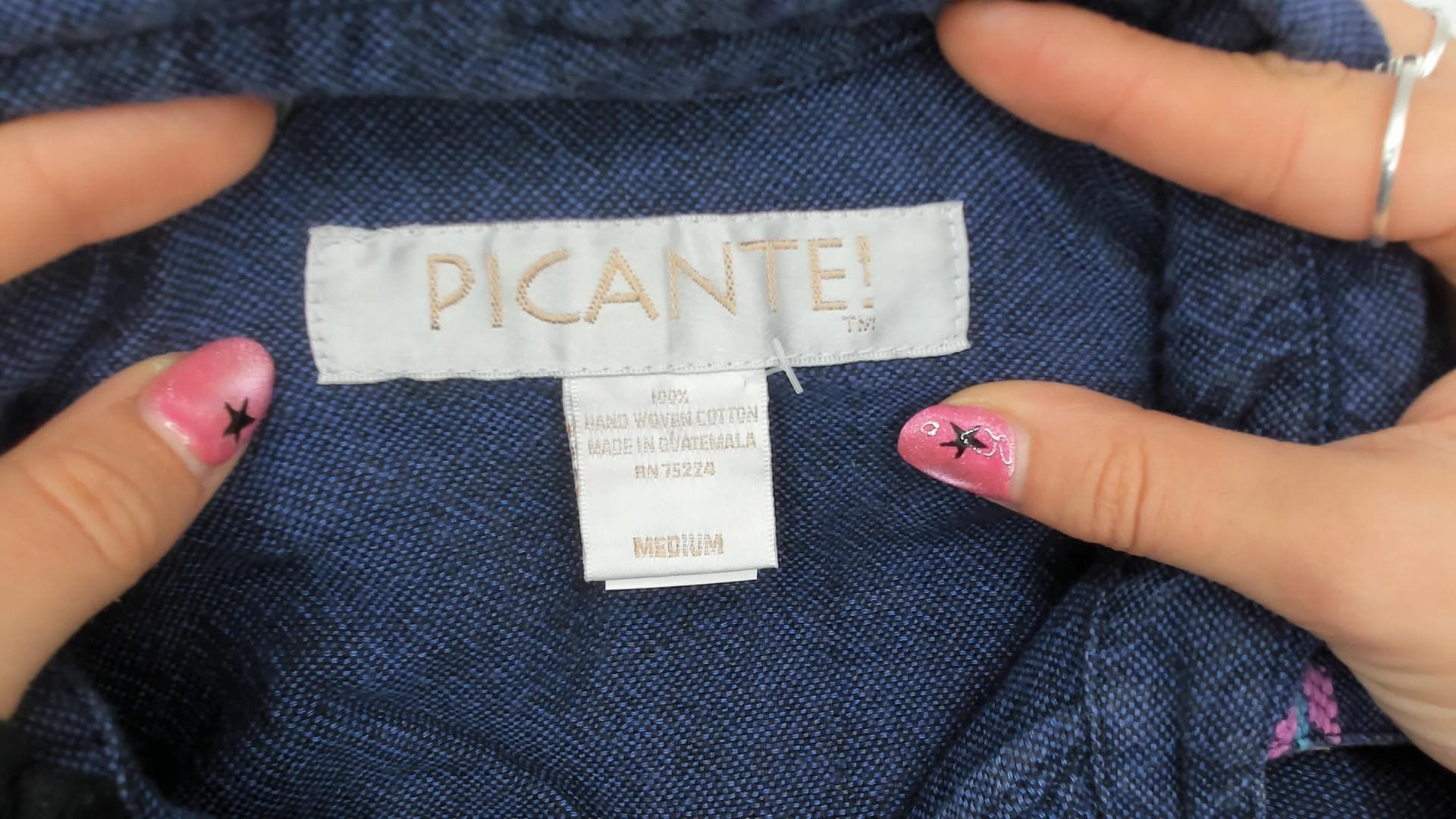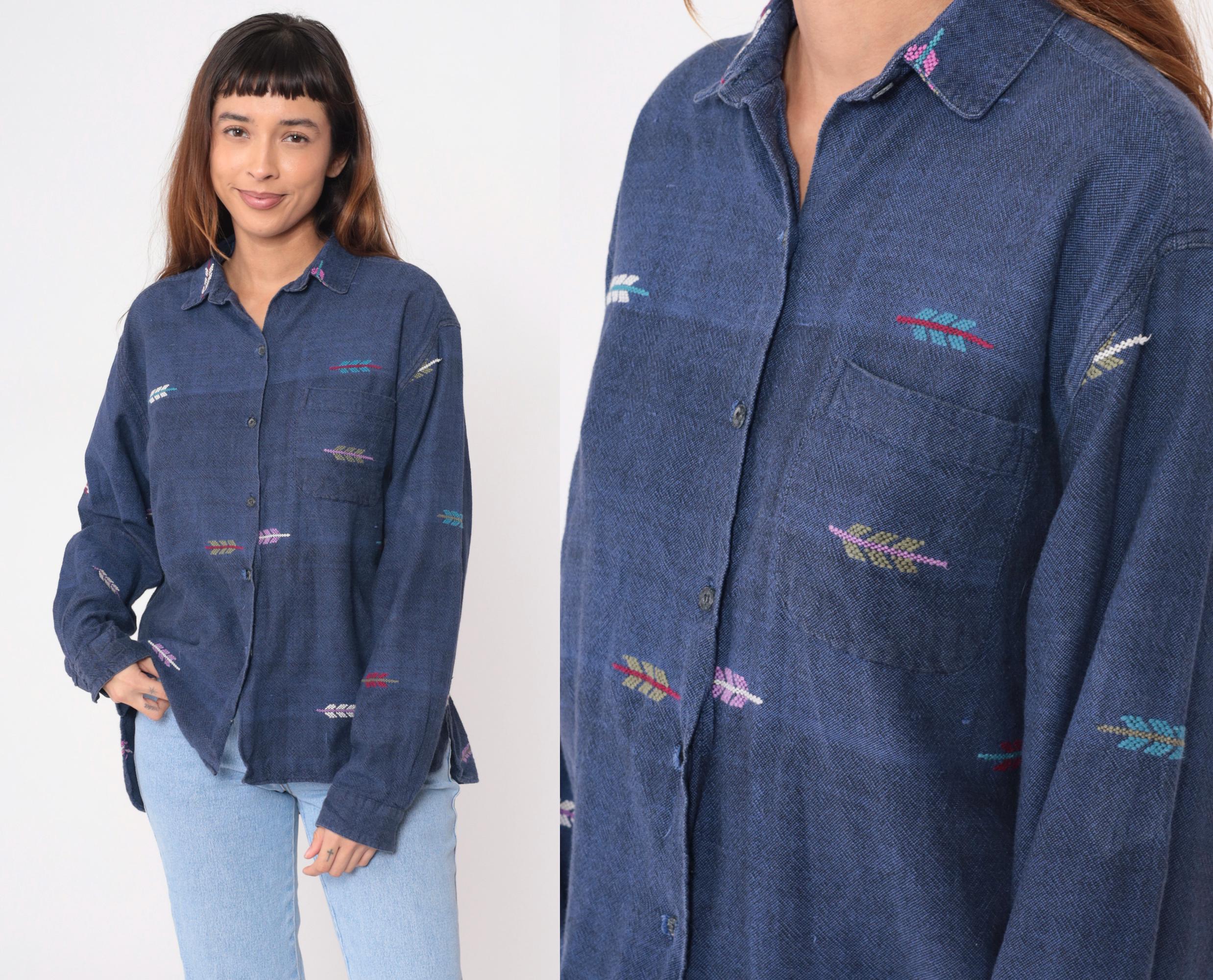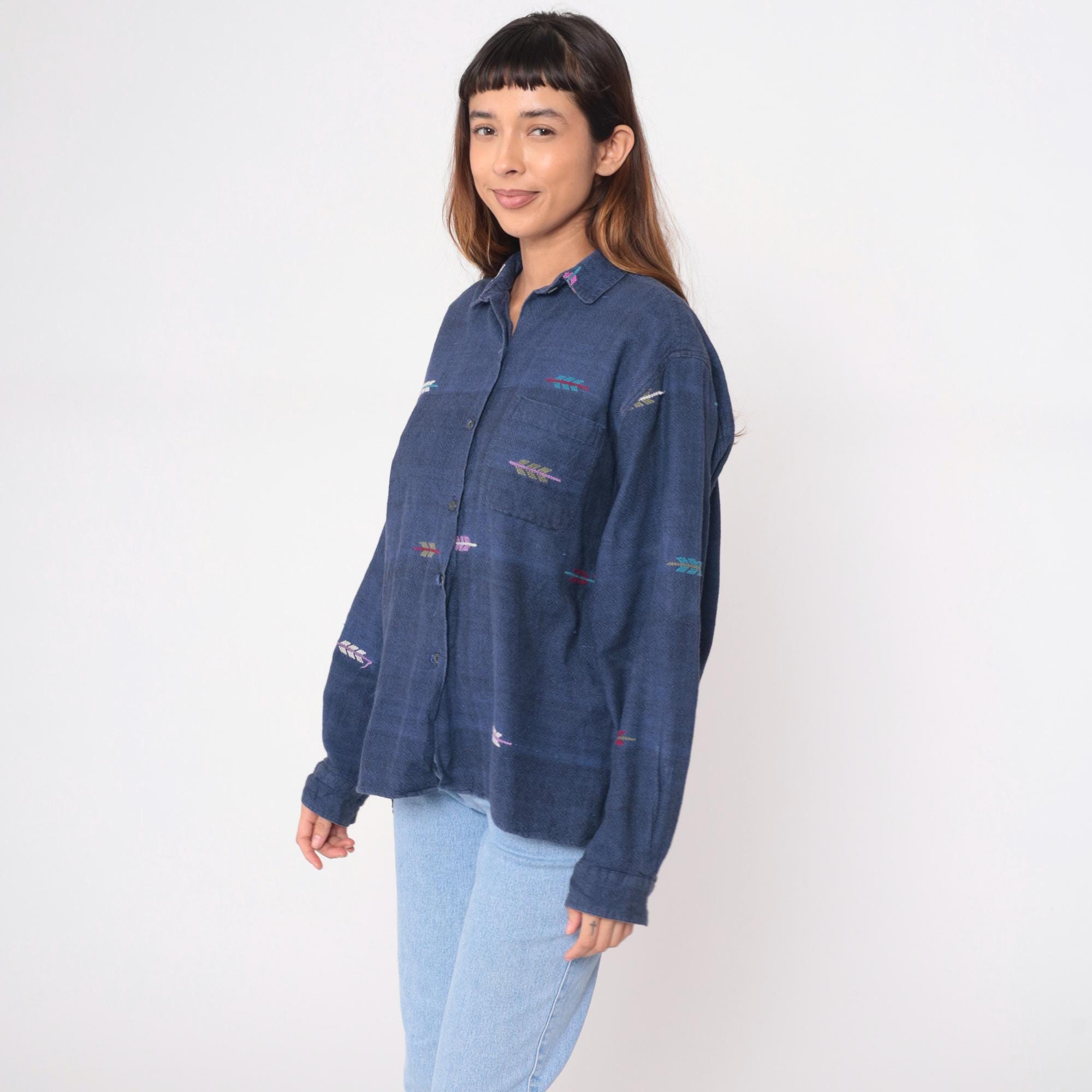 90s navy blue button-up shirt from Picante! with colorful embroidered arrows scattered across the entire garment in pink, white, red, turquoise, yellow, and green thread. Long sleeves, chest pocket, and front button closure.
