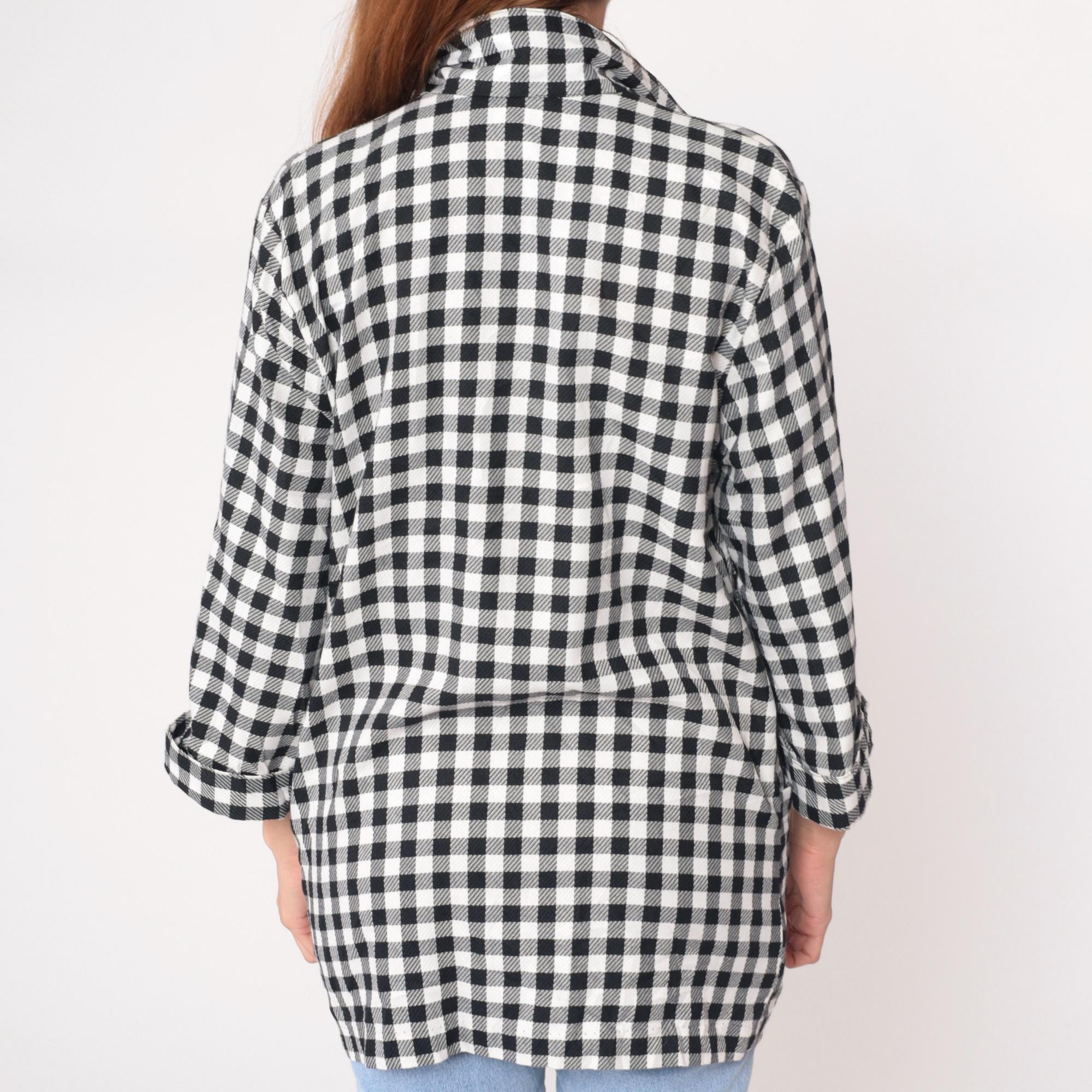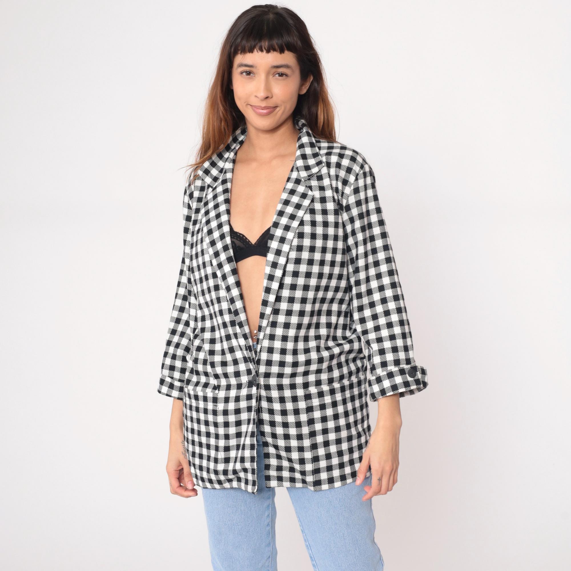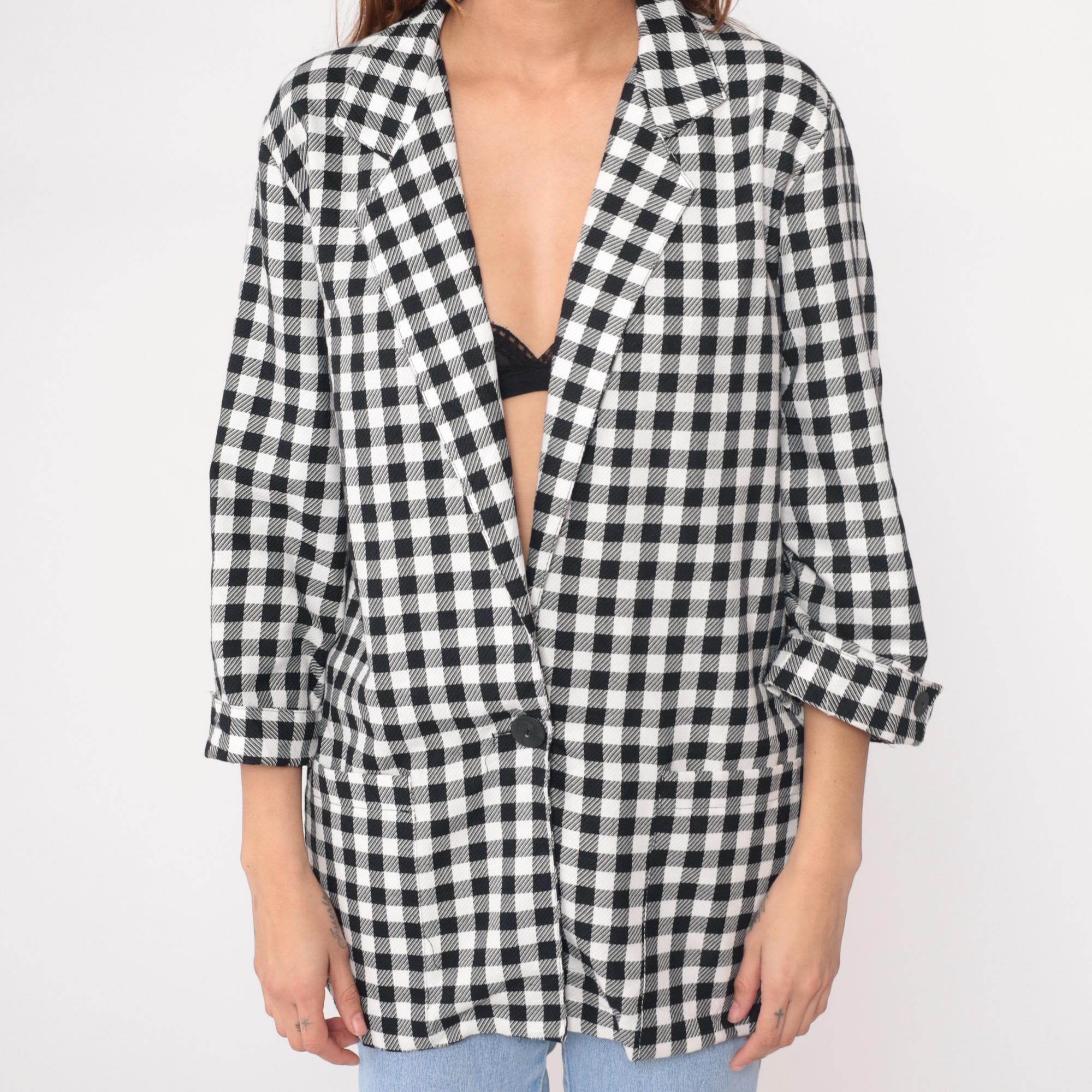 90s black and white gingham blazer from Kenneth Mitchell with notched collar and single button front closure. Relaxed silhouette with long sleeves and button cuffs.