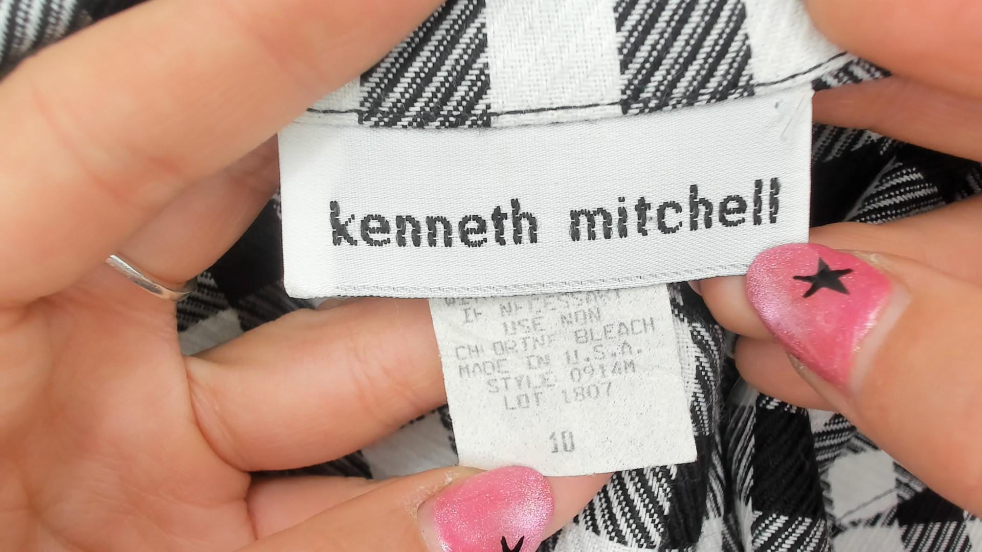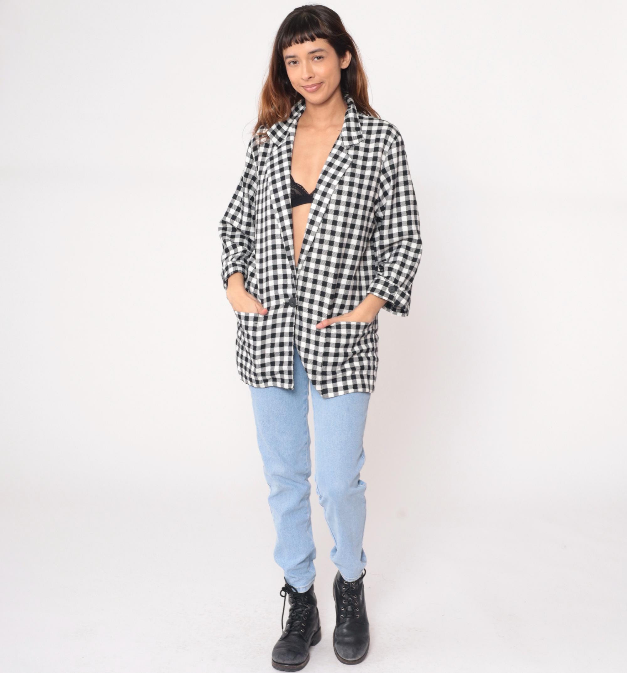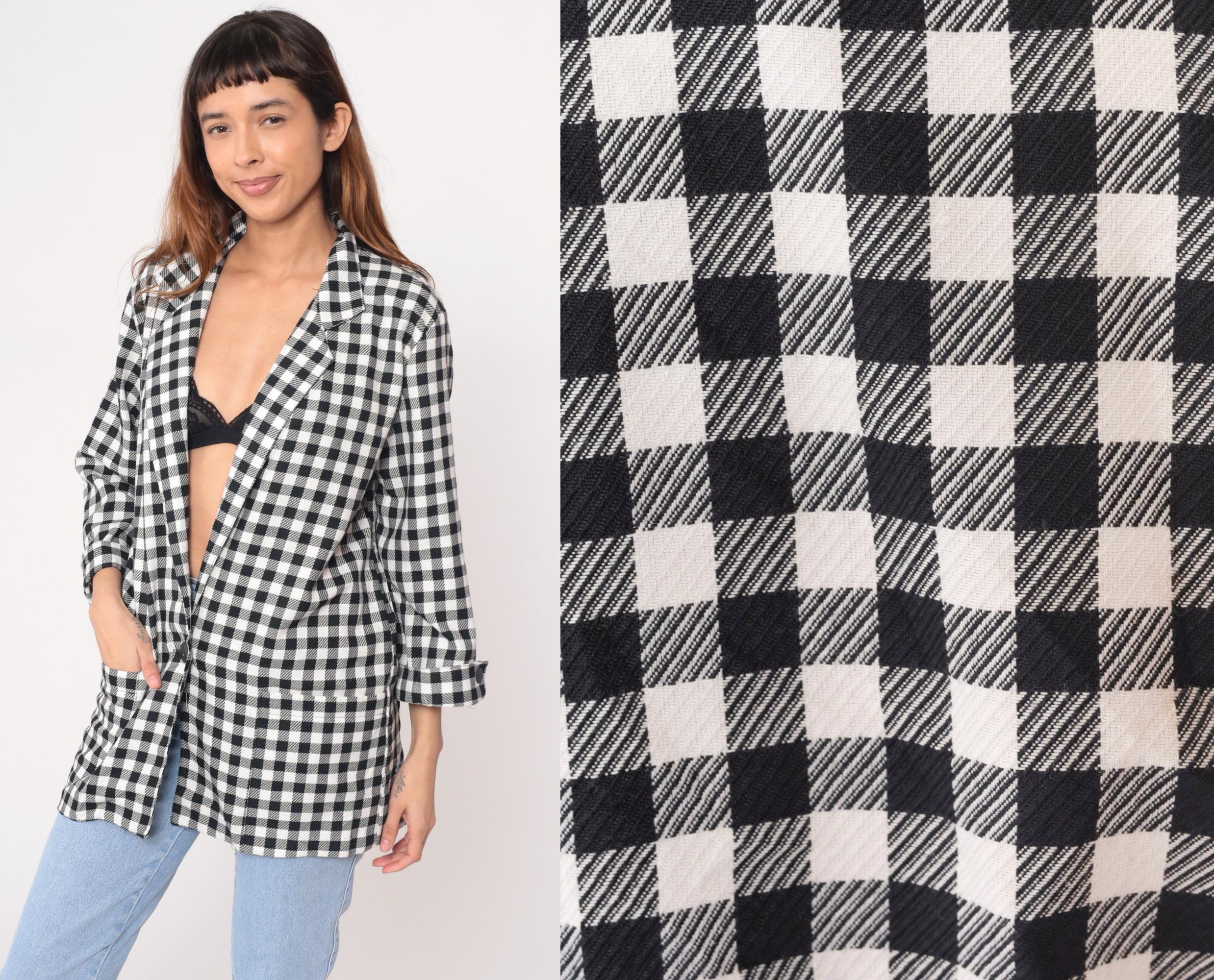 90s black and white gingham blazer from Kenneth Mitchell with notched collar and single button front closure. Relaxed silhouette with long sleeves and button cuffs.