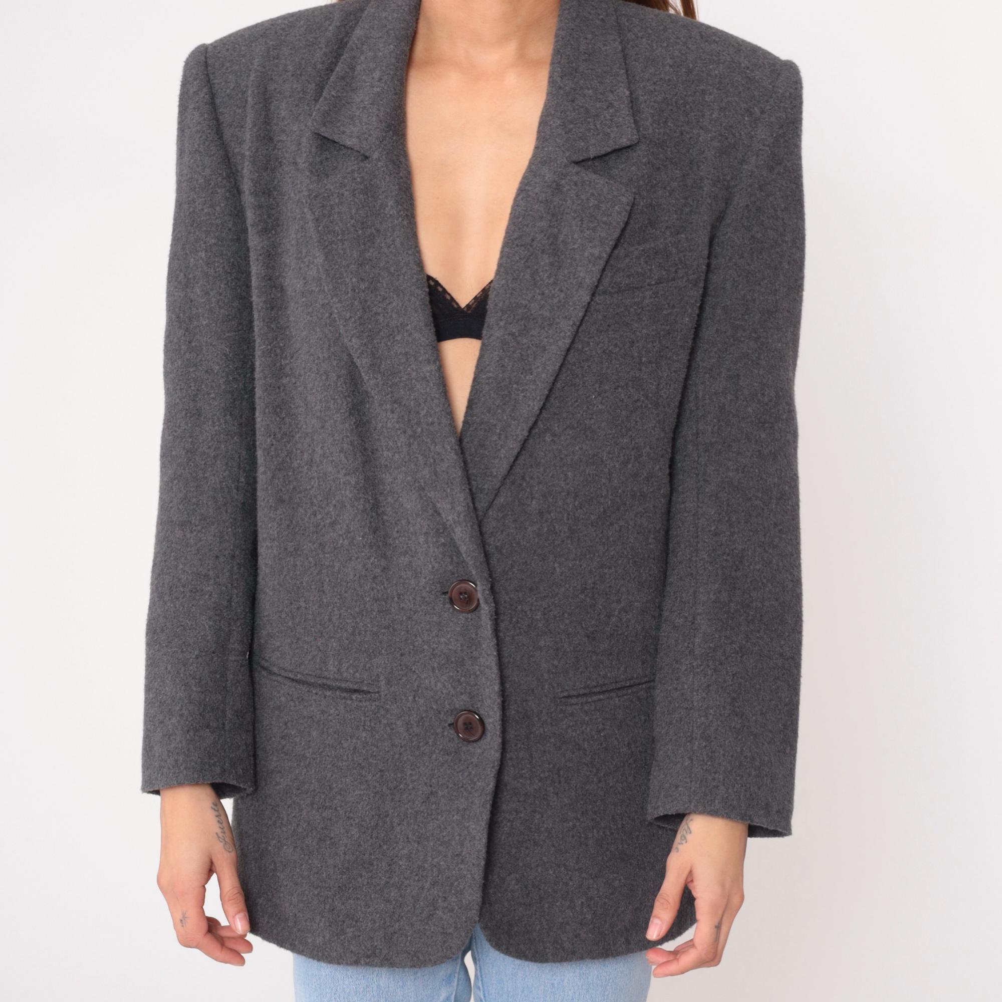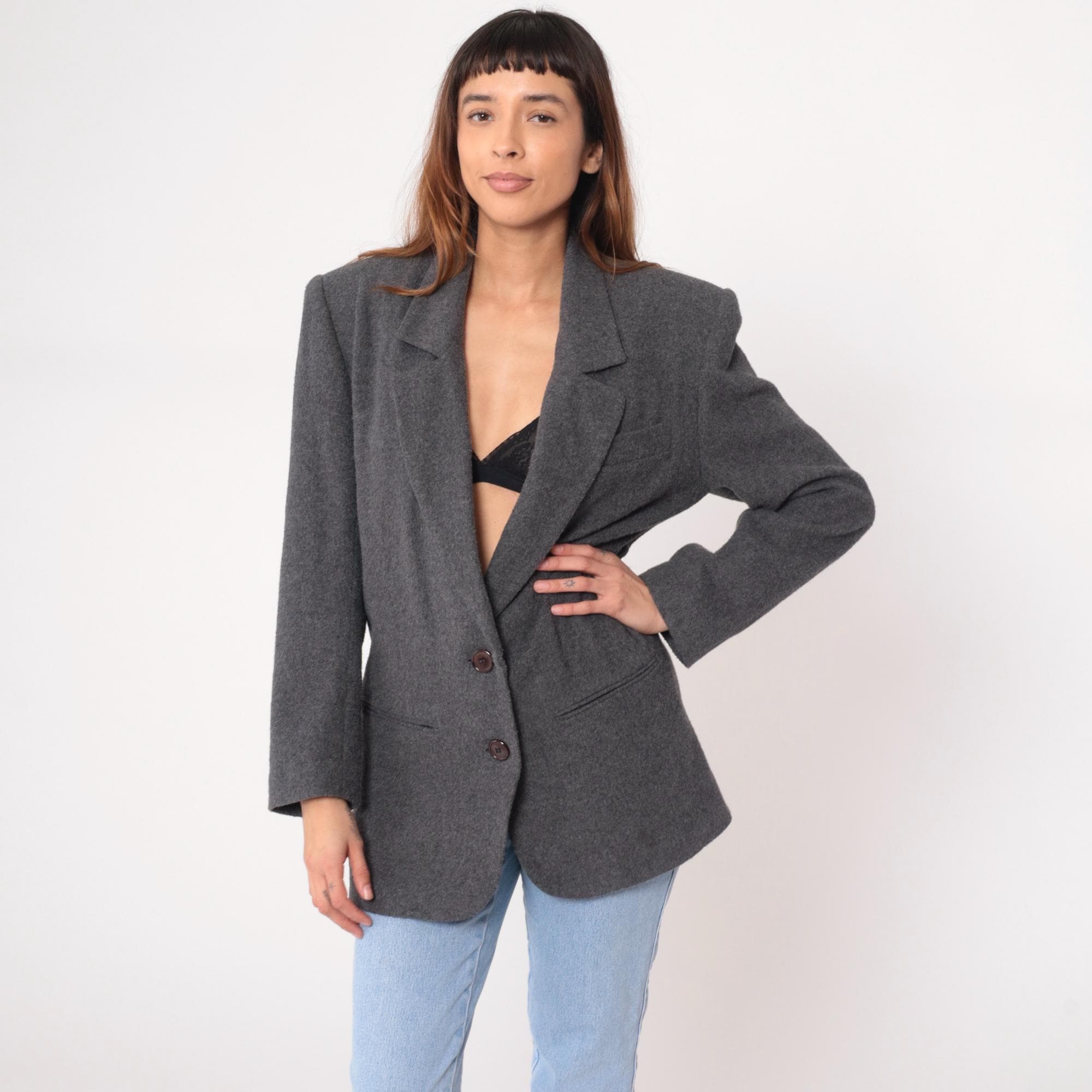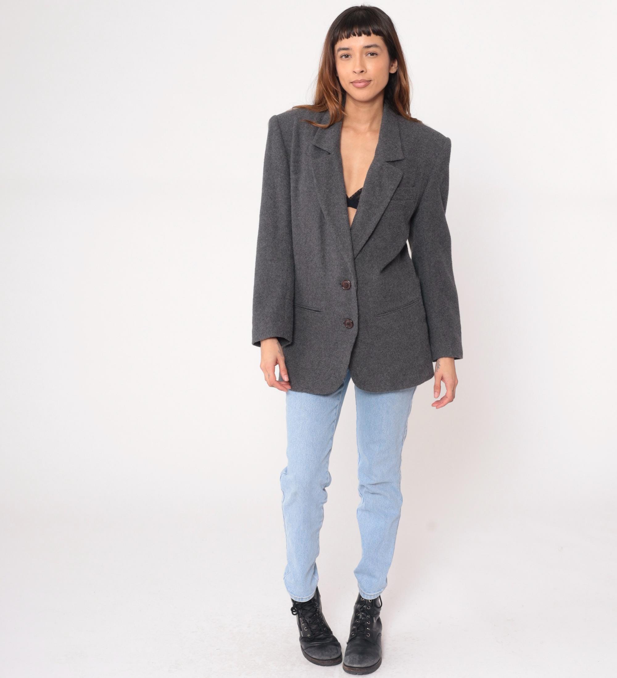 90s gray blazer from Rampage with notched lapels and two-button front closure. Long sleeves, structured shoulders, two front pockets with flaps.
