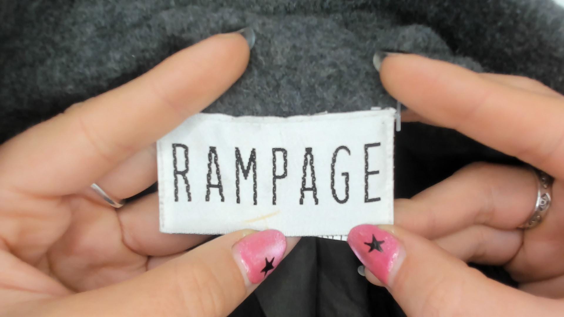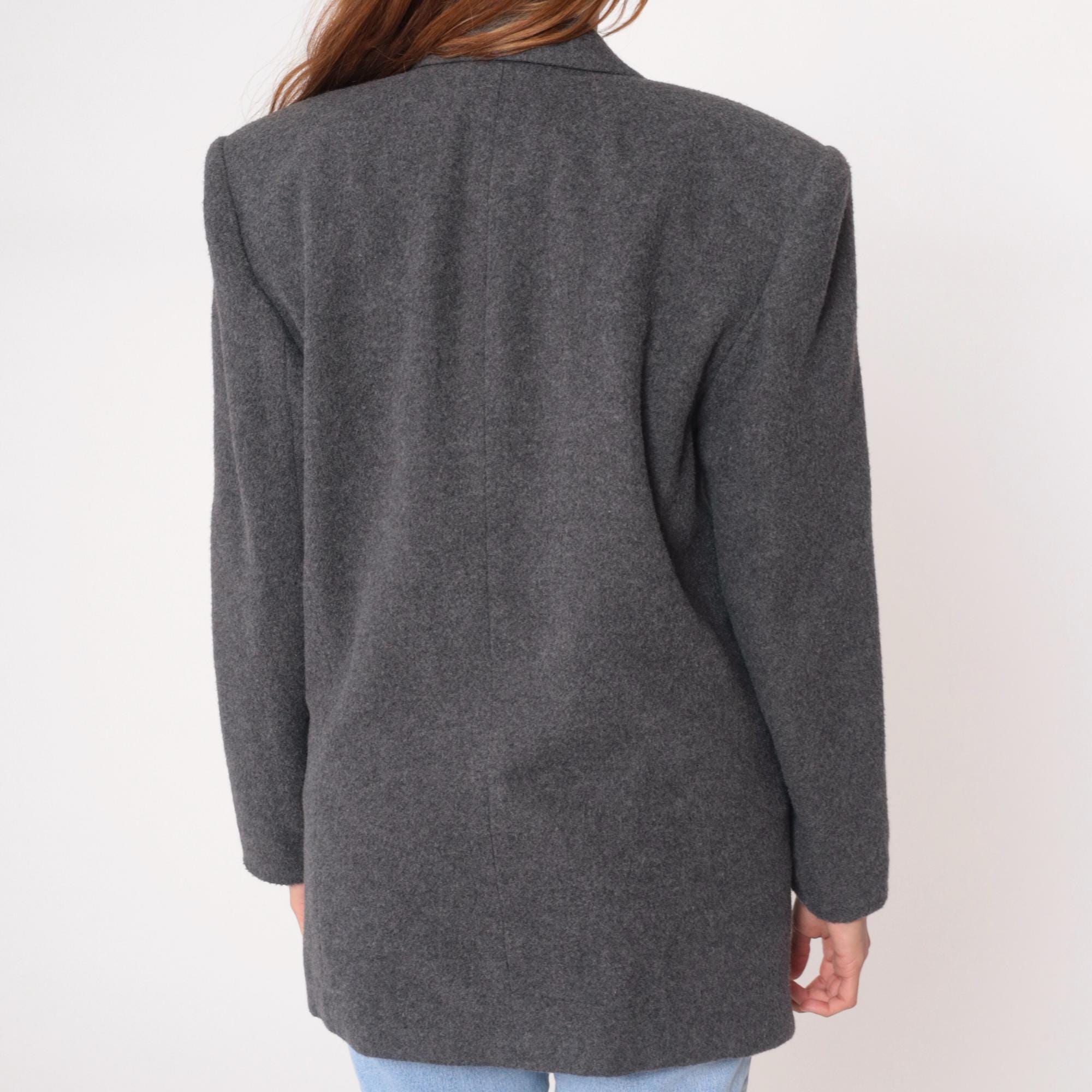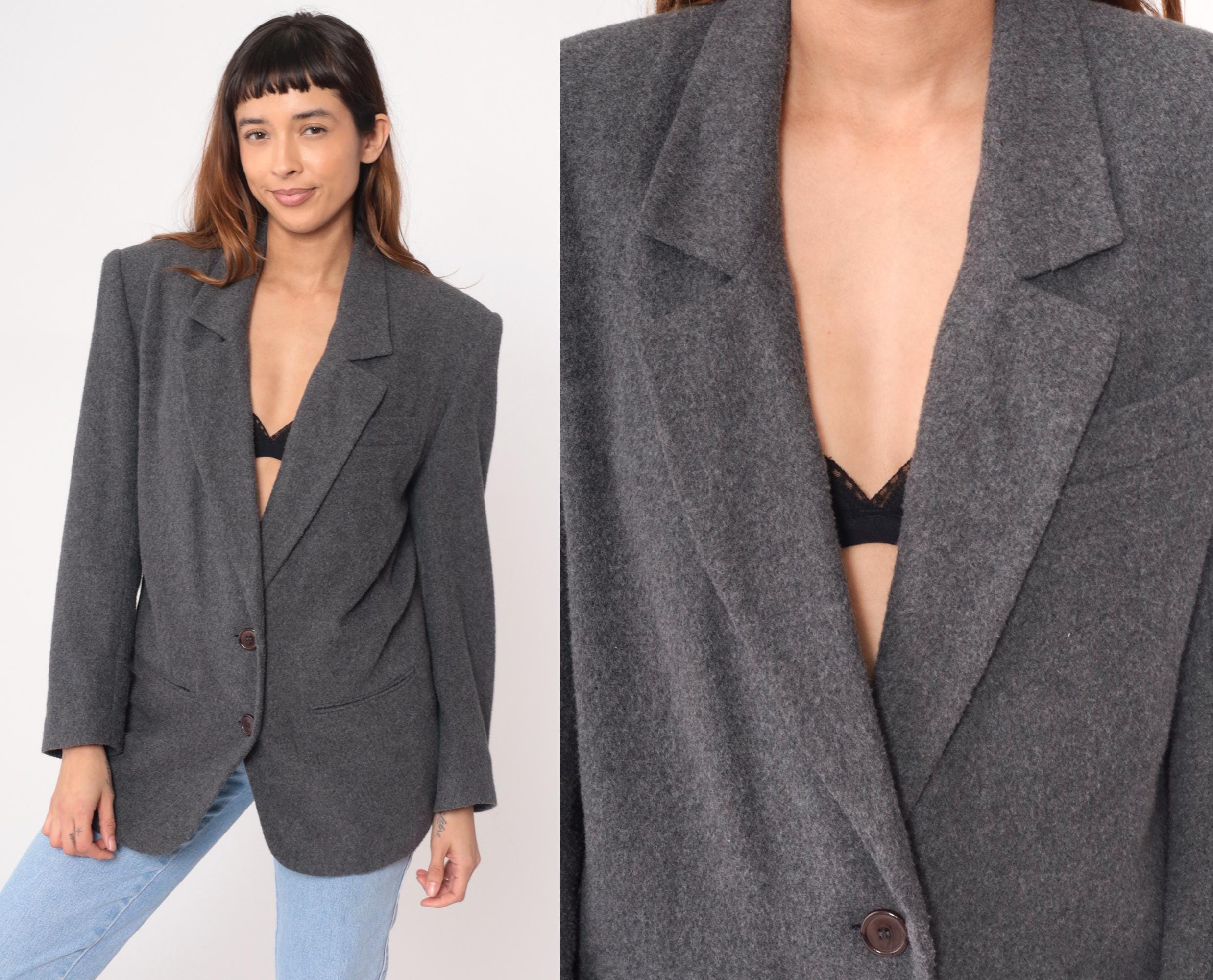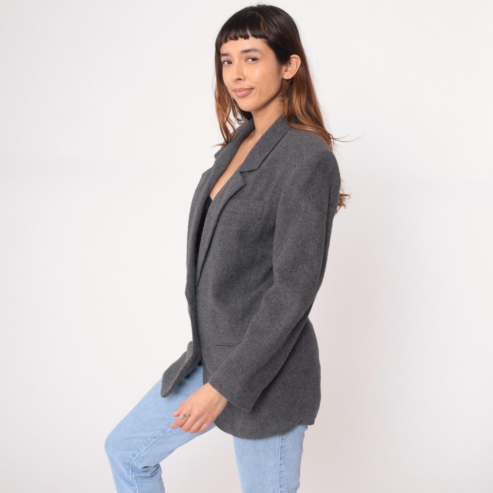 90s gray blazer from Rampage with notched lapels and two-button front closure. Long sleeves, structured shoulders, two front pockets with flaps.