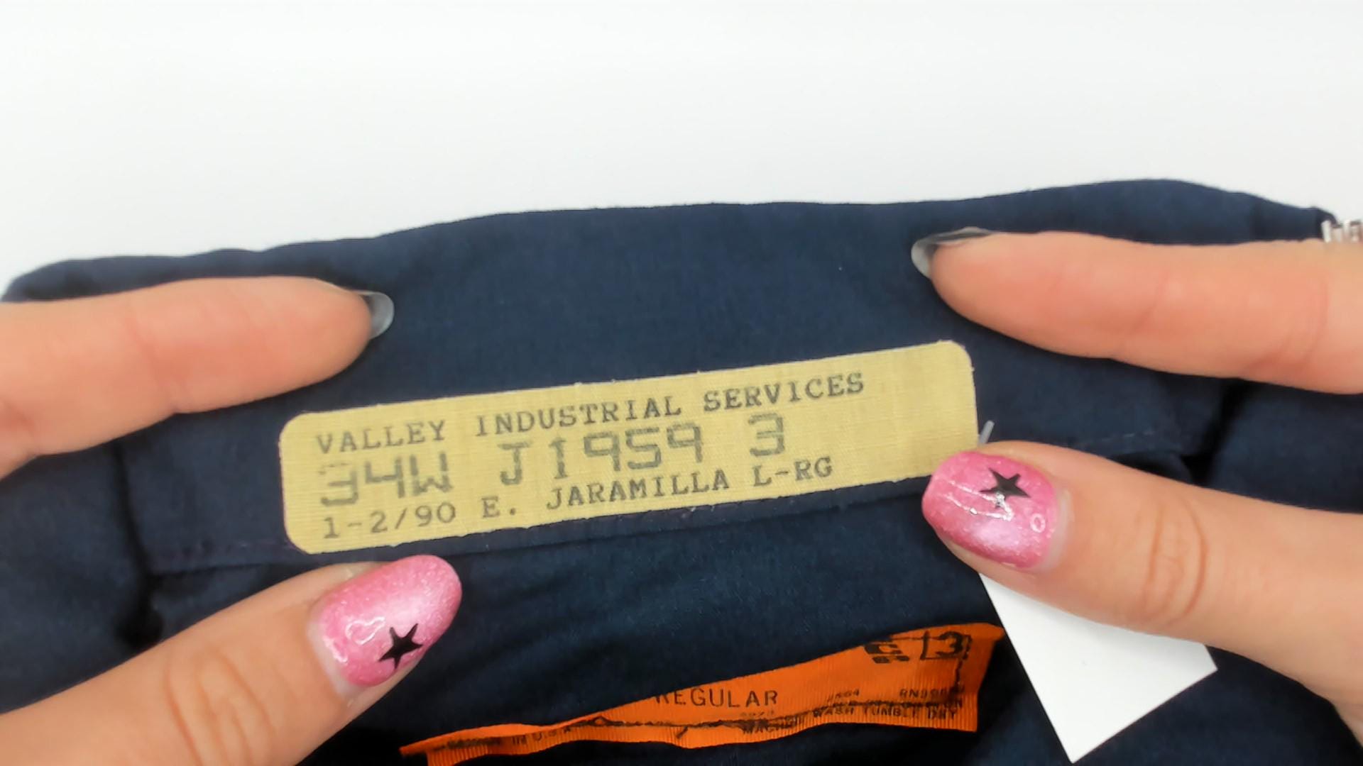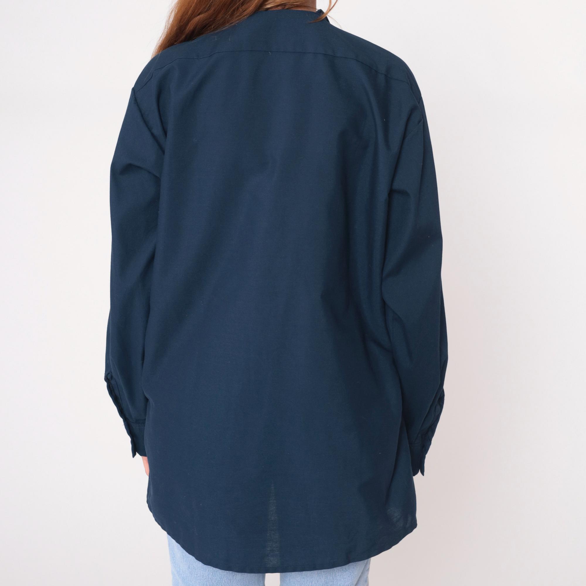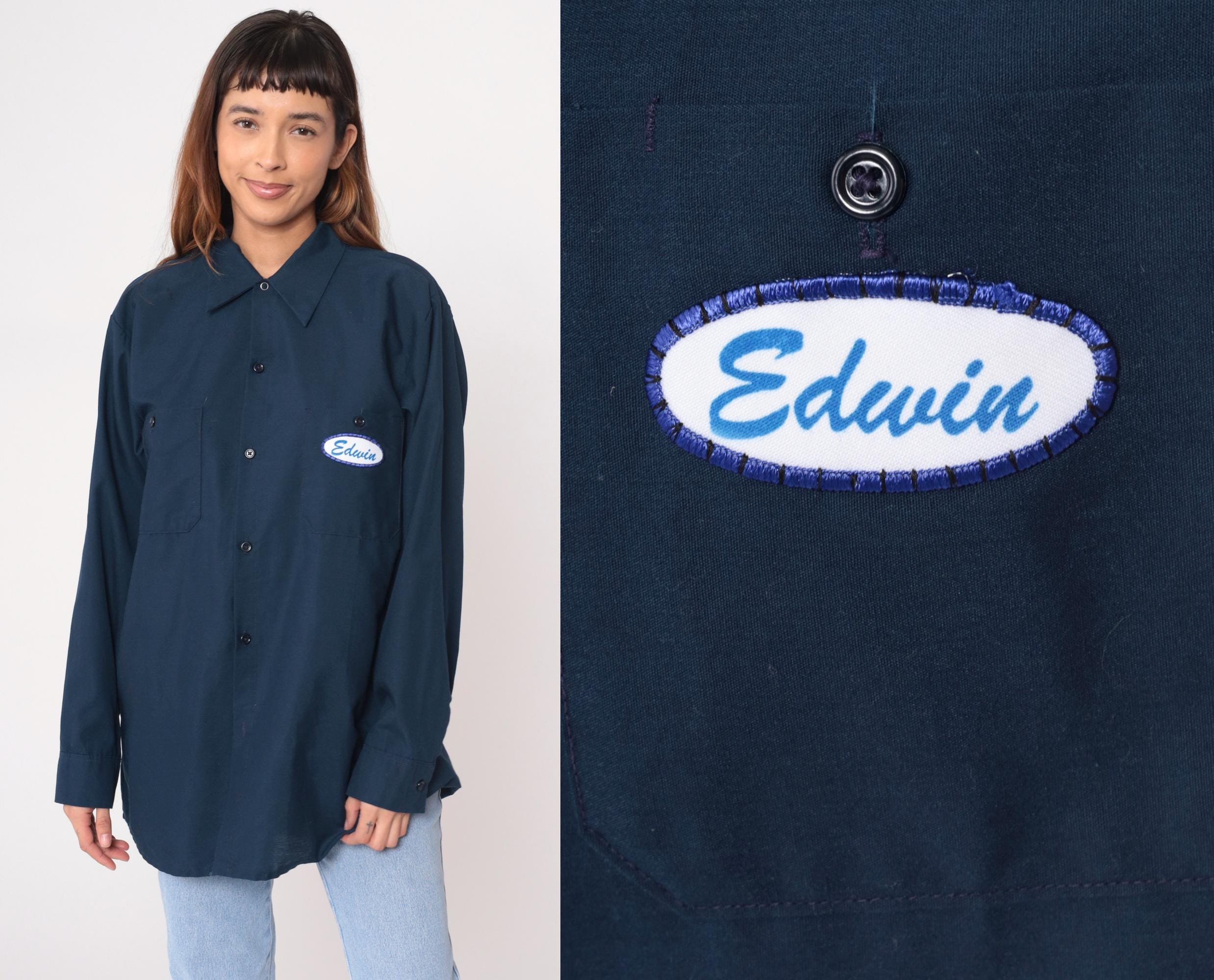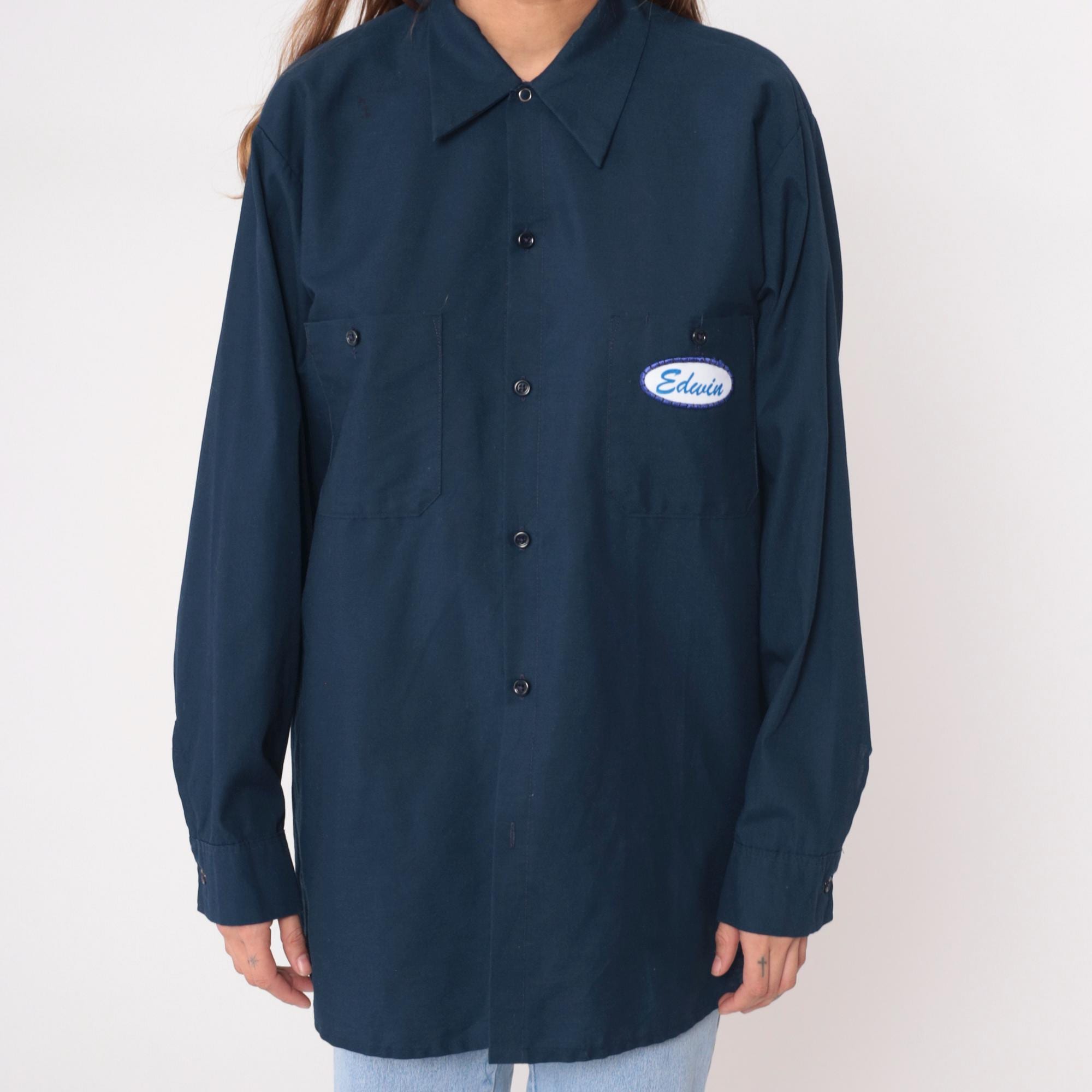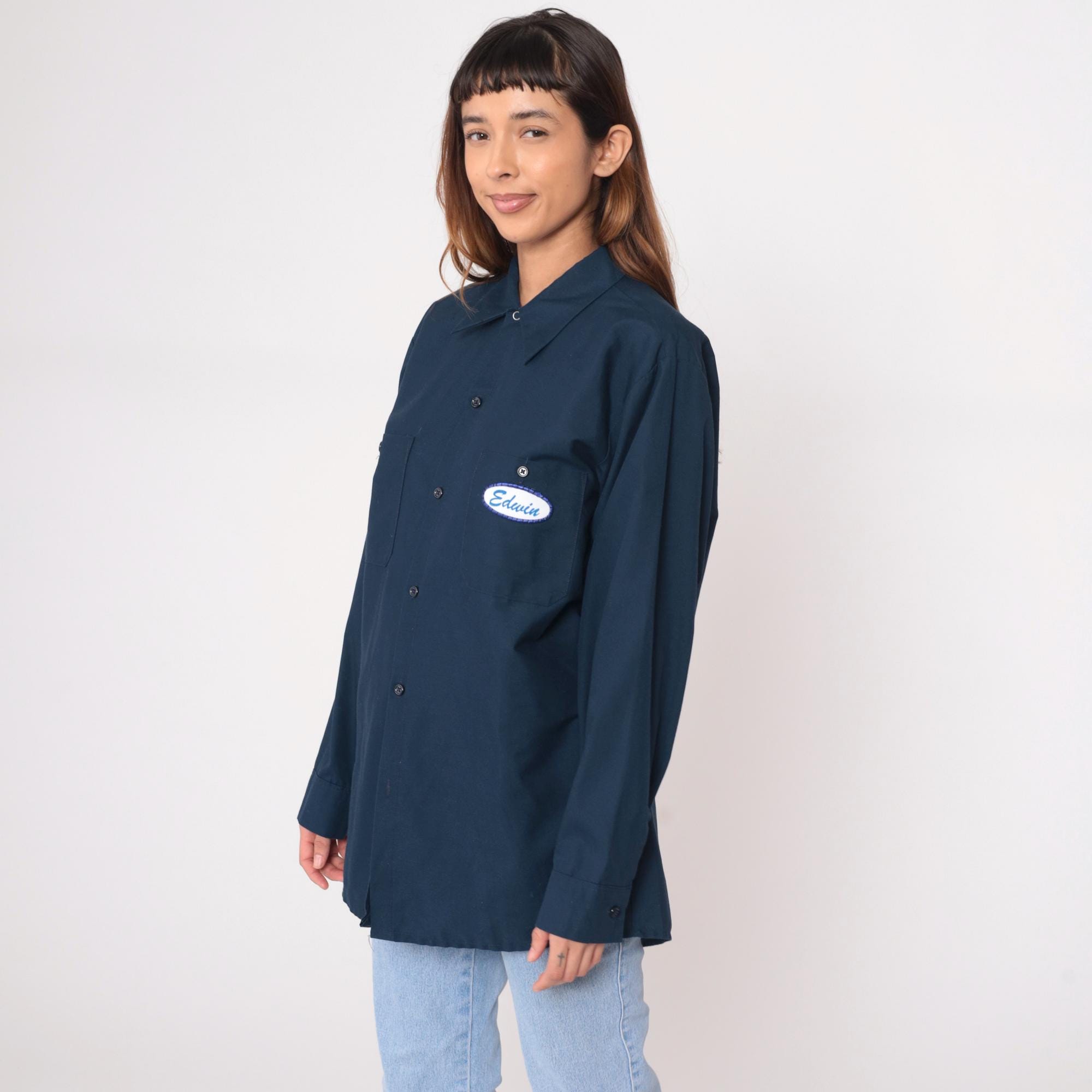 90s navy blue work shirt from Valley Industrial Services with embroidered "Edwin" name patch on chest. Button front closure with pointed collar, long sleeves with button cuffs, single chest pocket. Polyester and cotton blend.