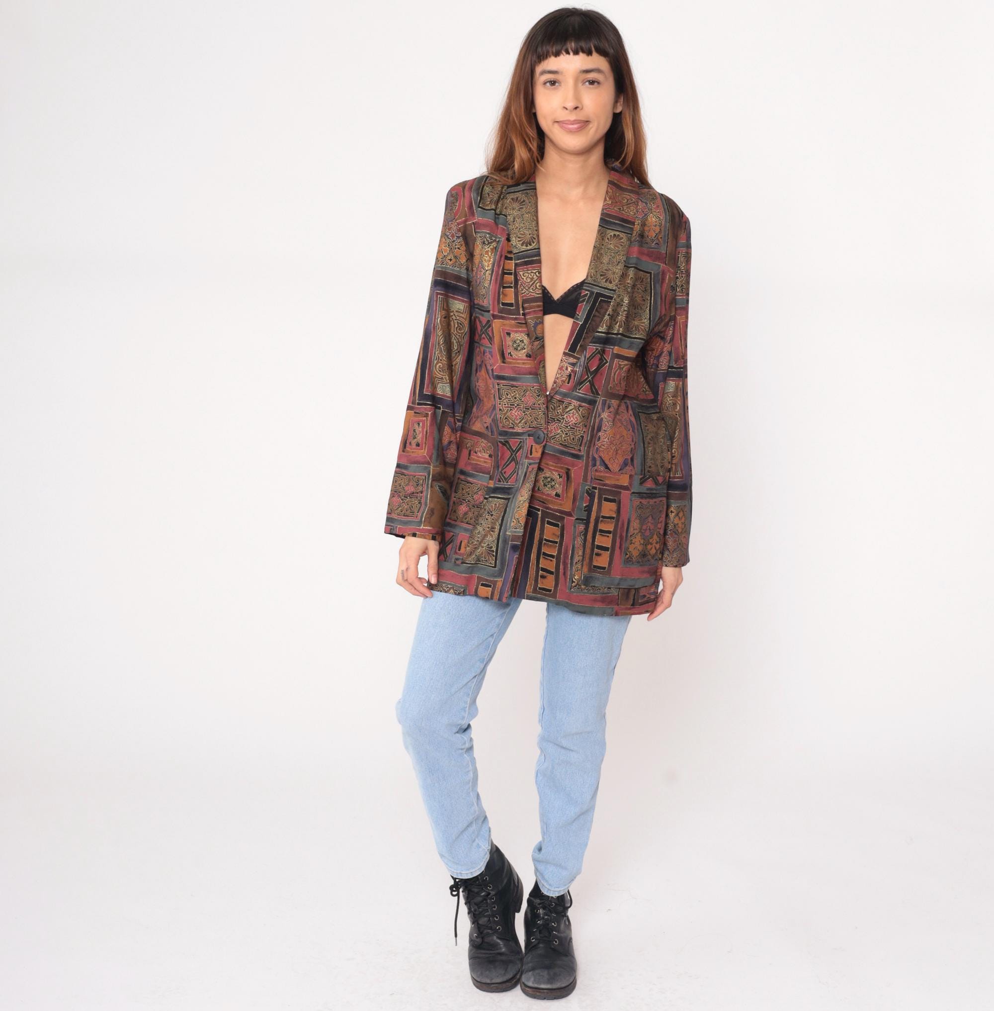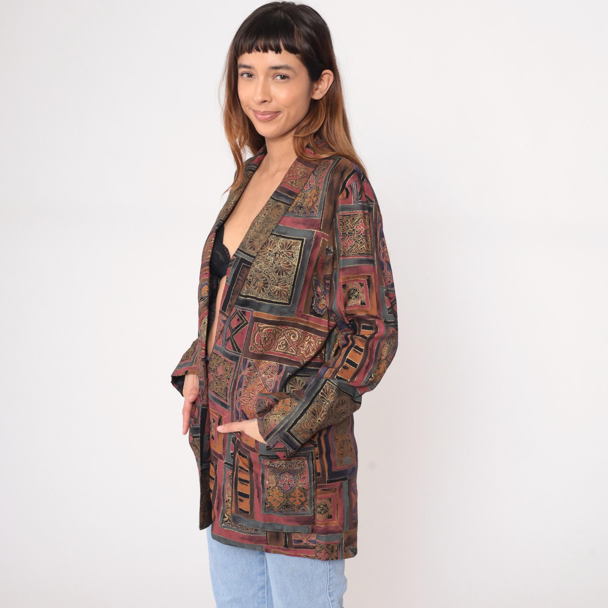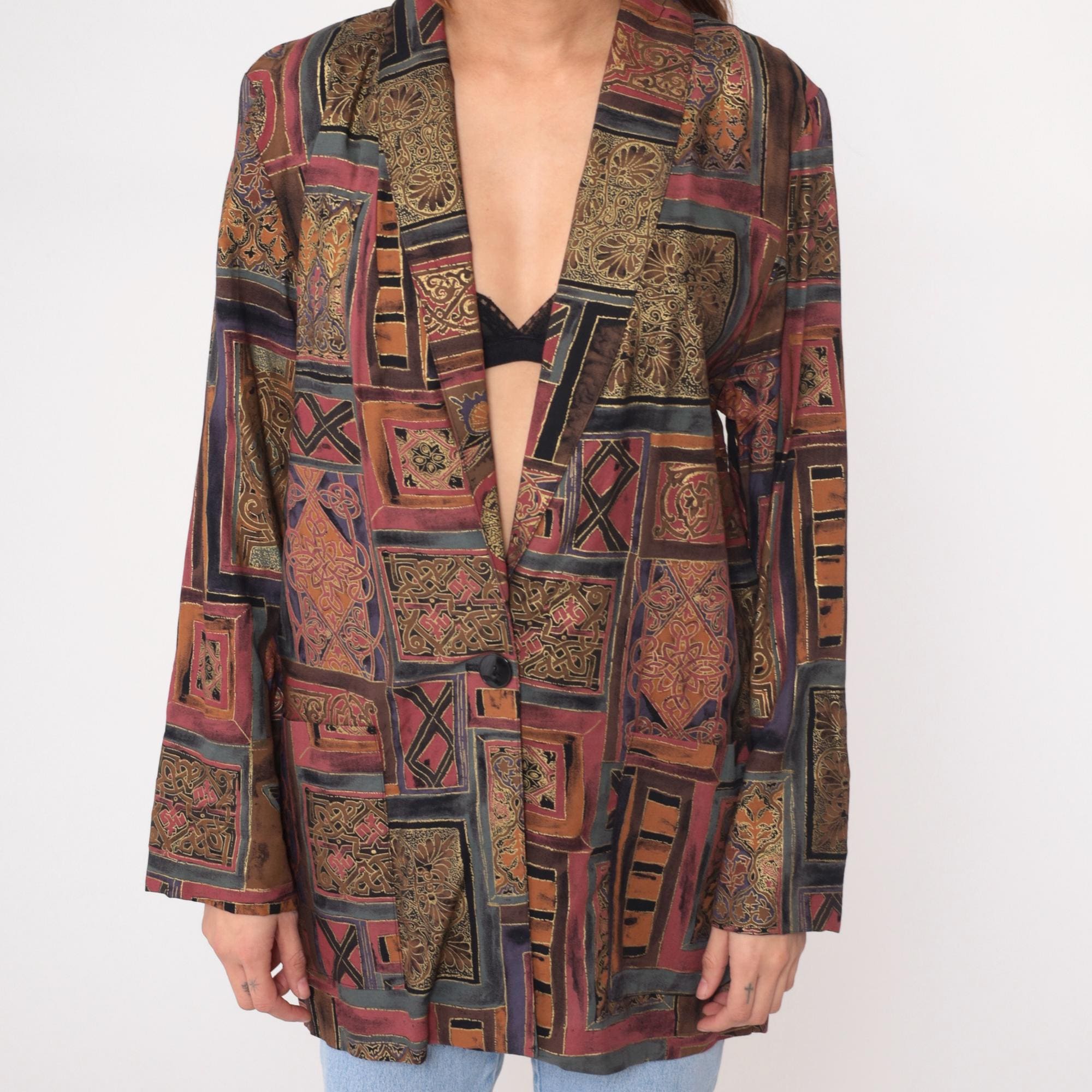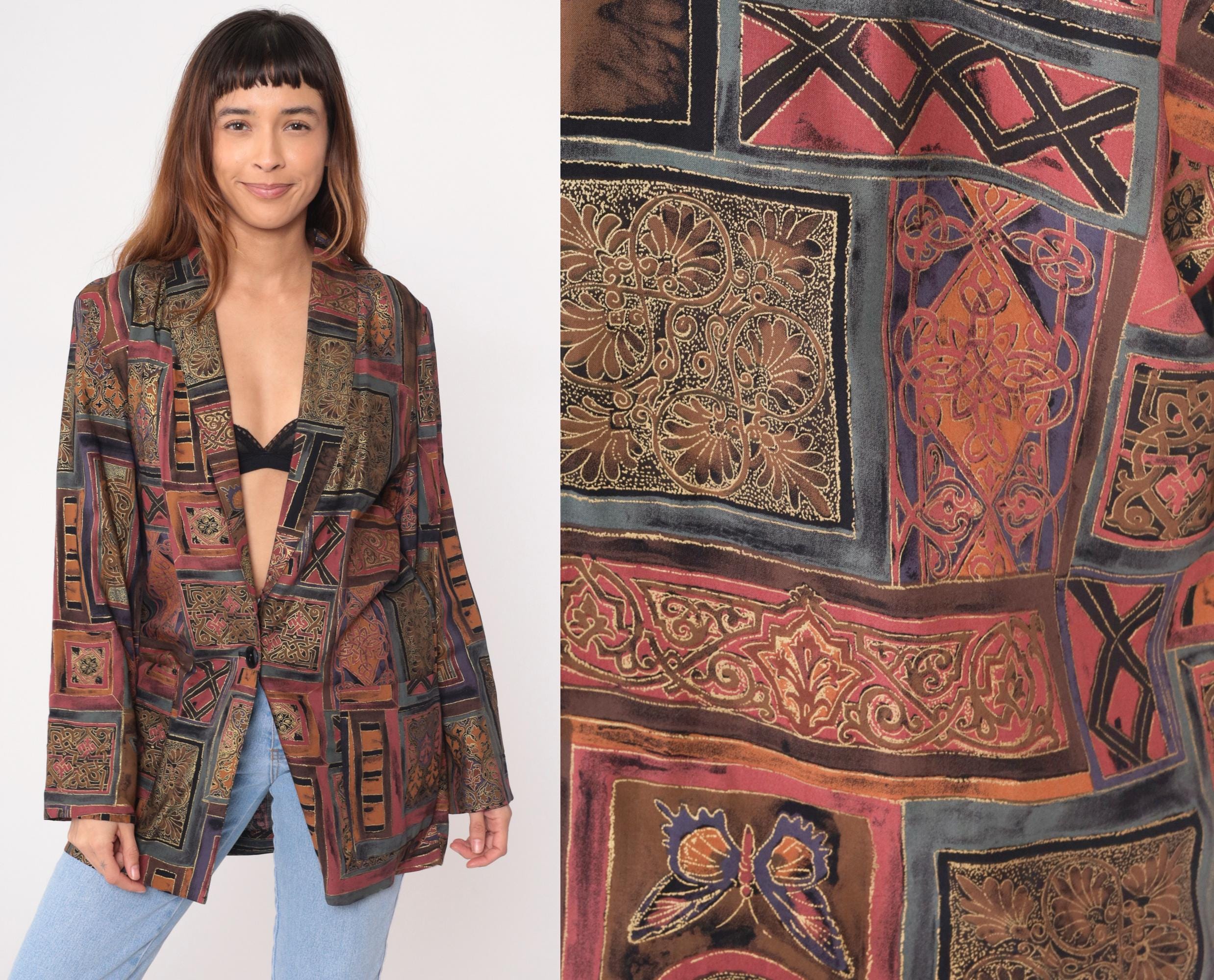 90s patchwork print blazer from Kensington Square with geometric tile-inspired pattern in burgundy, brown, tan, olive, and orange with ornate detailing and butterfly motifs throughout the fabric. Single button front closure, long sleeves, open front styling.