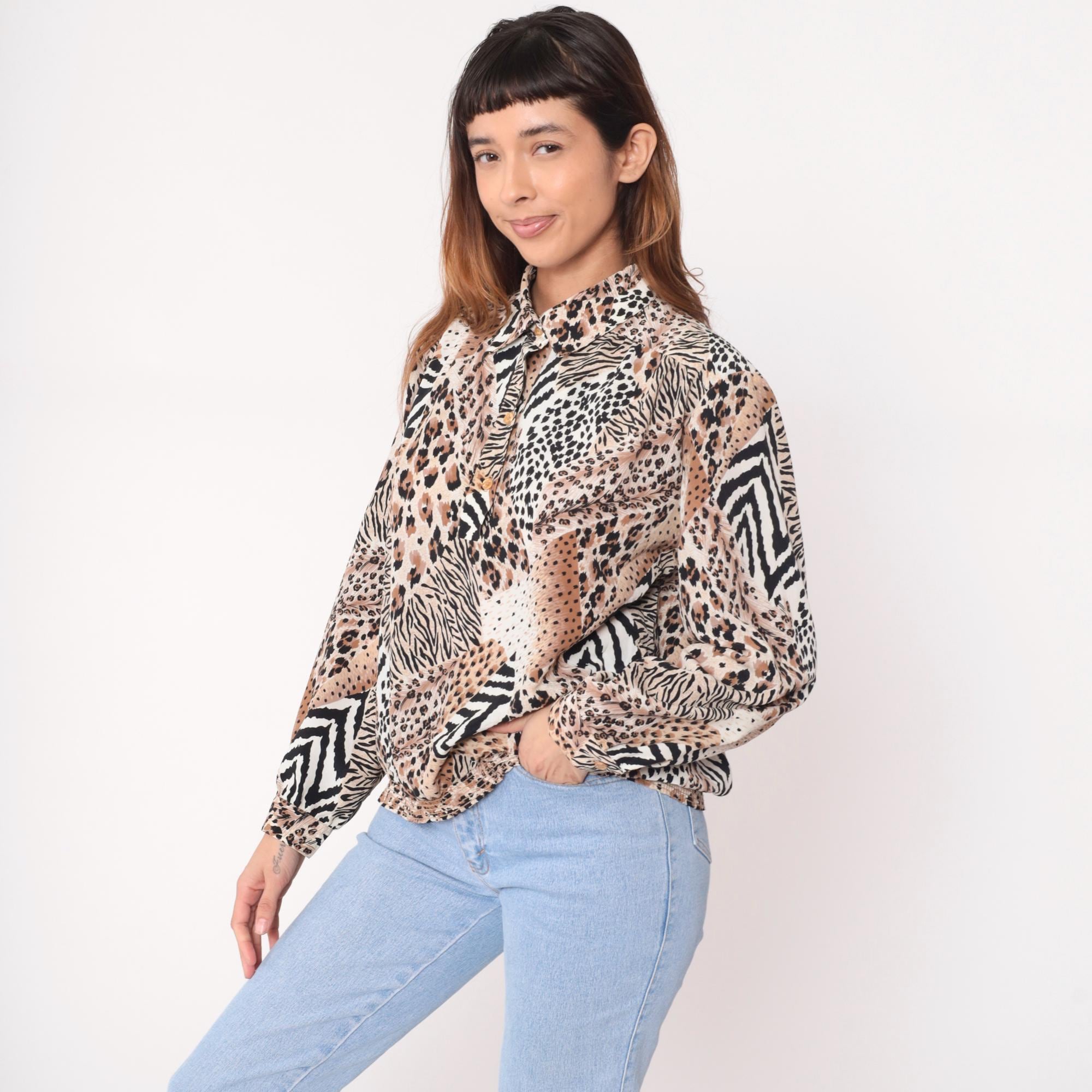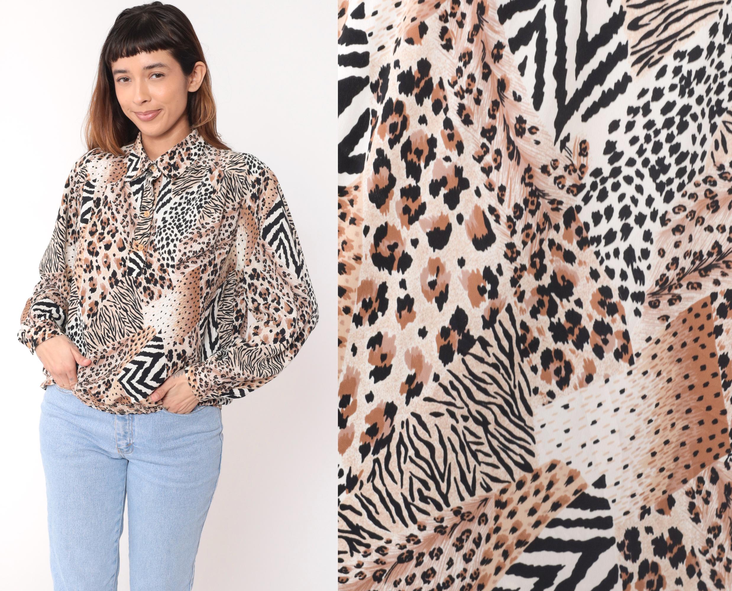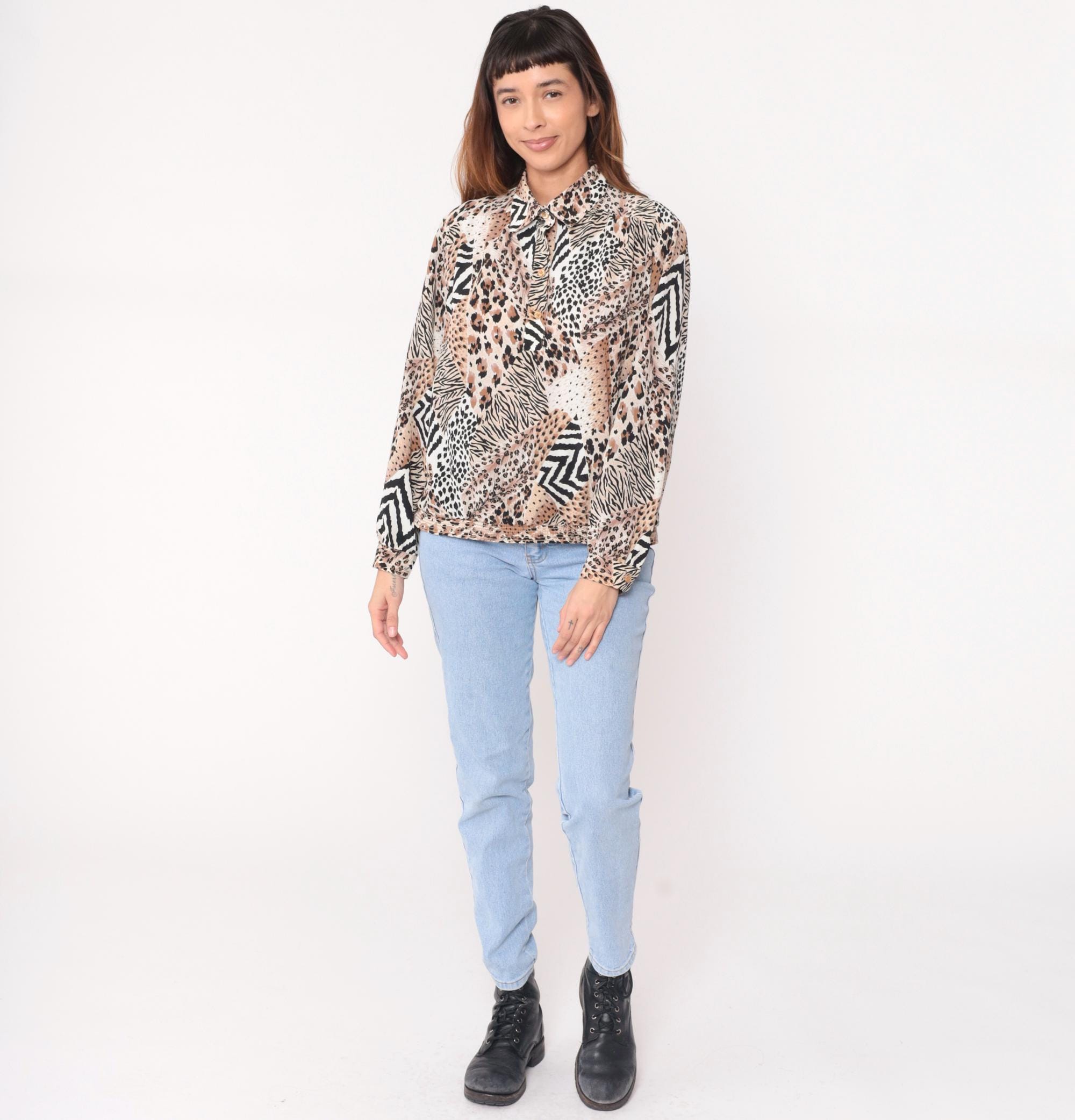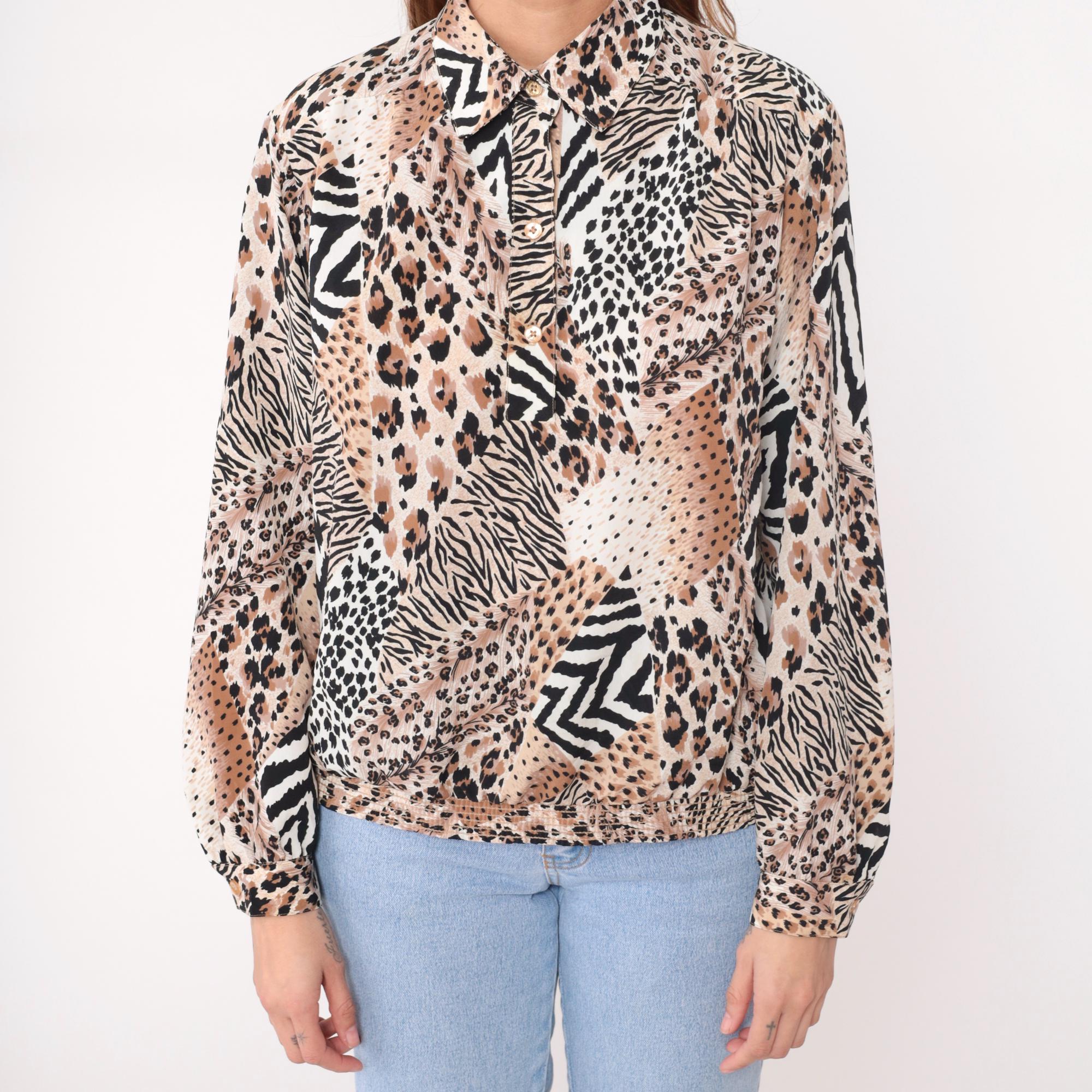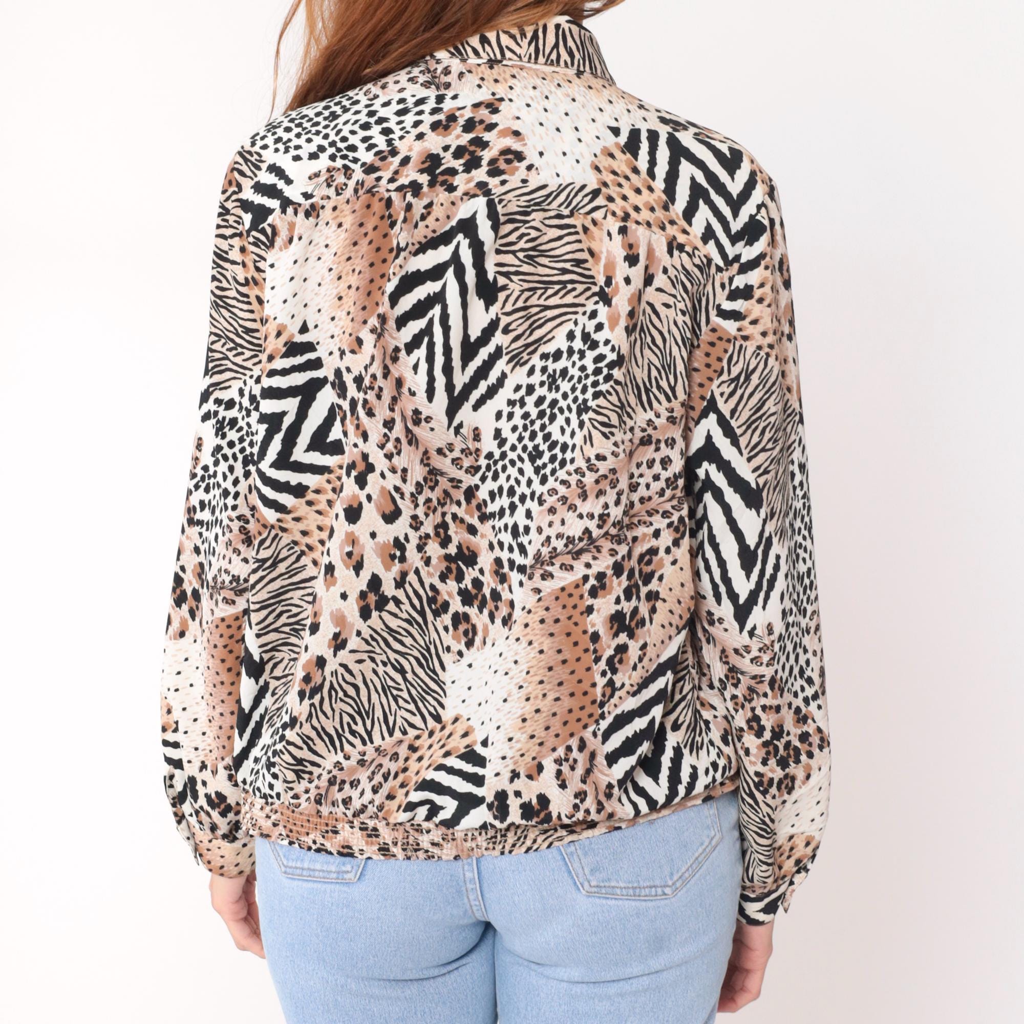 90s animal print blouse from Da Rue of California Petite with mixed leopard, zebra, and cheetah spot patterns in black, white, tan, and brown. Collared neckline with partial button front closure, long sleeves with elastic smocked cuffs, elastic smocked waistband creating a cropped blouson silhouette.