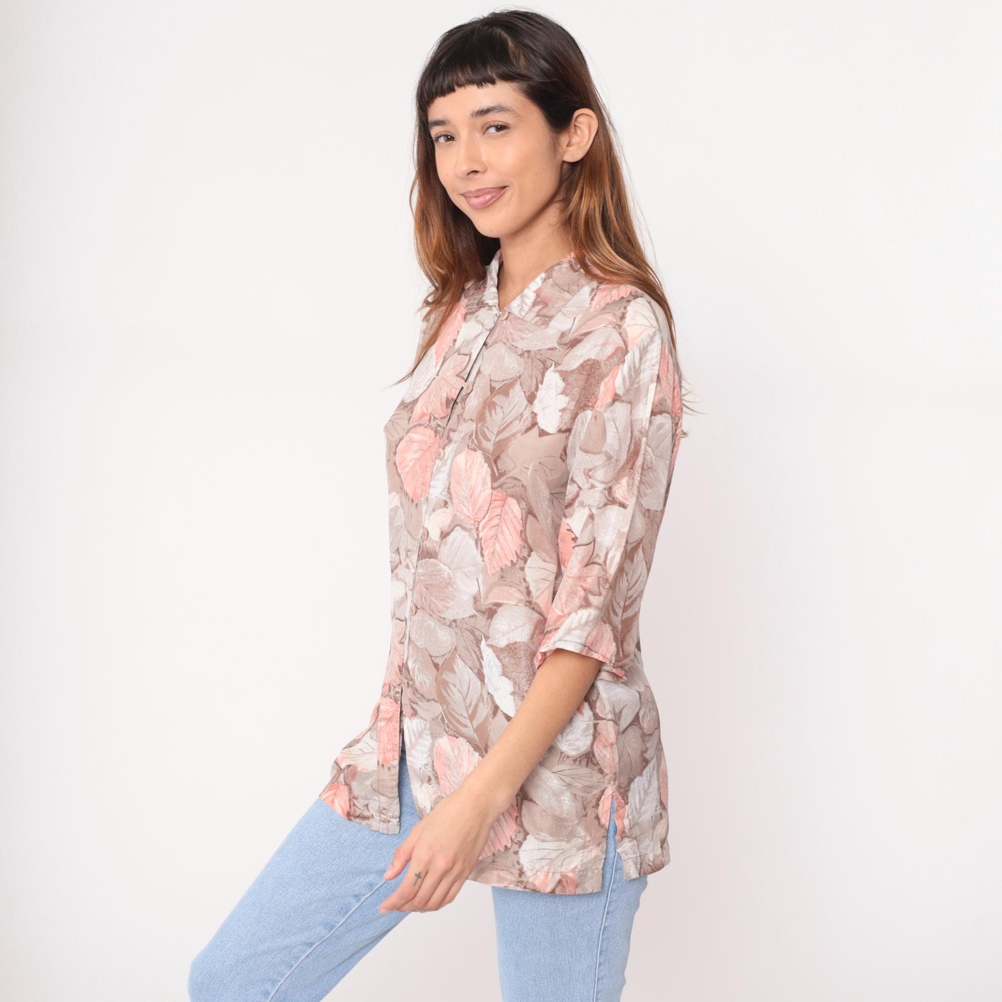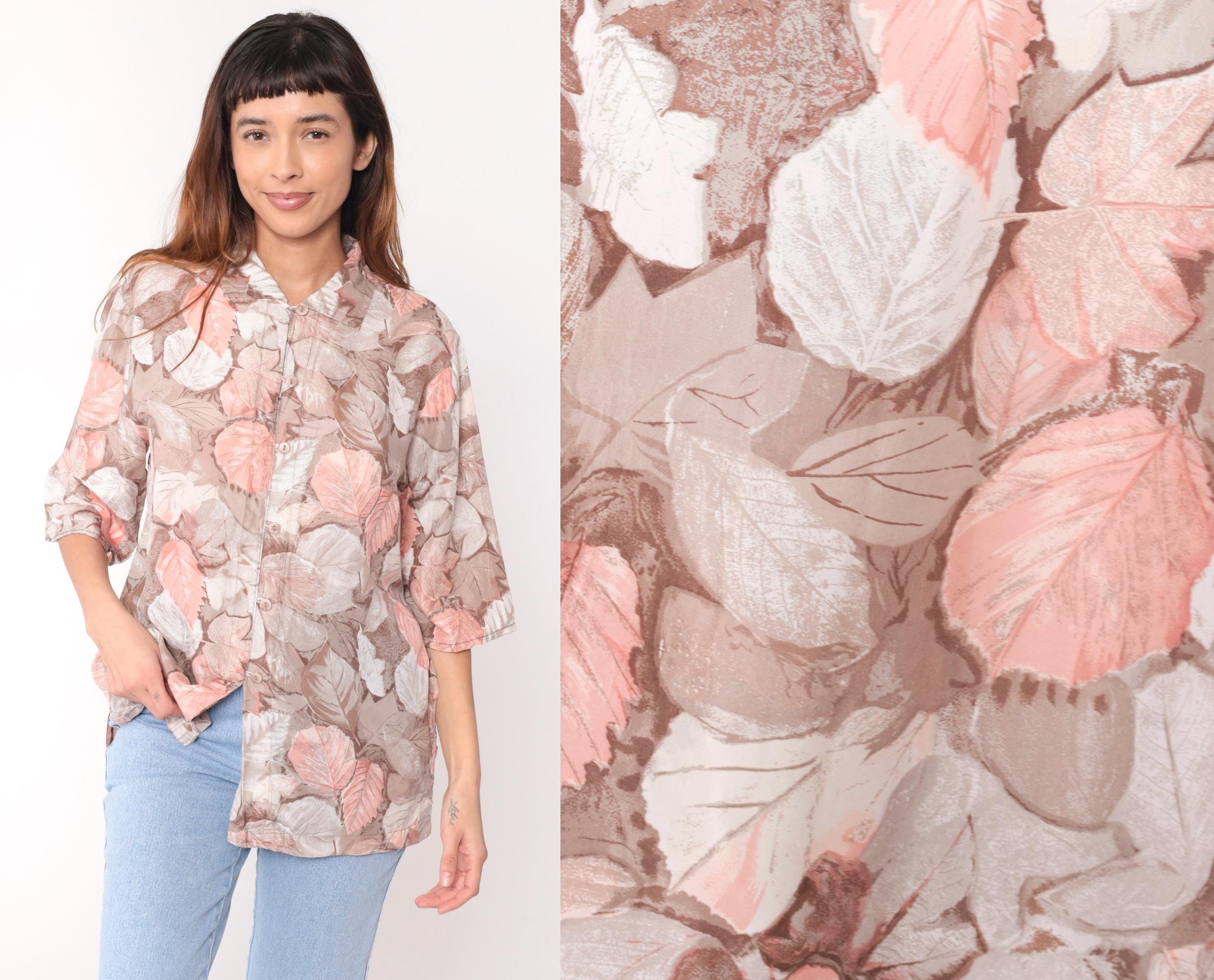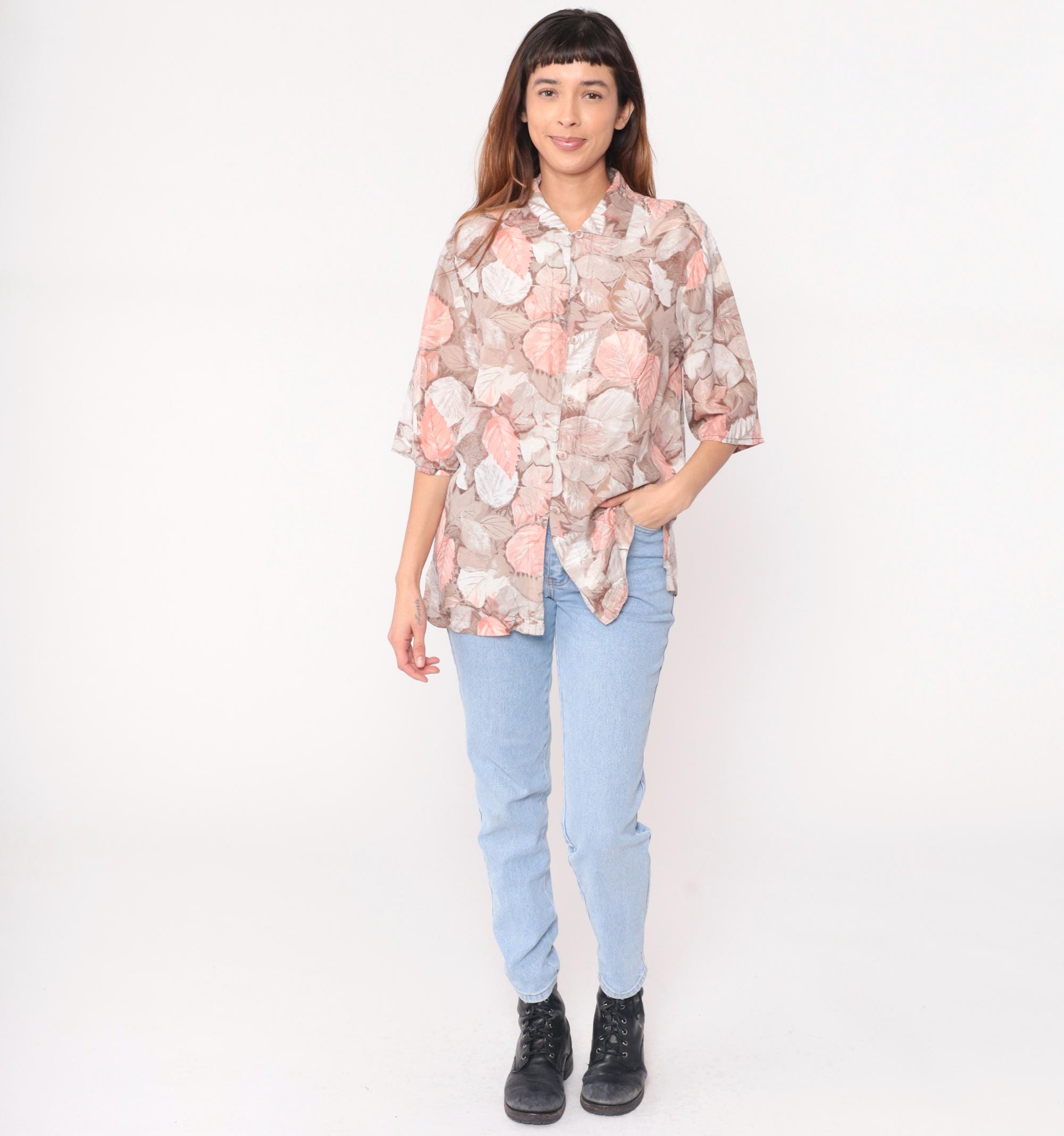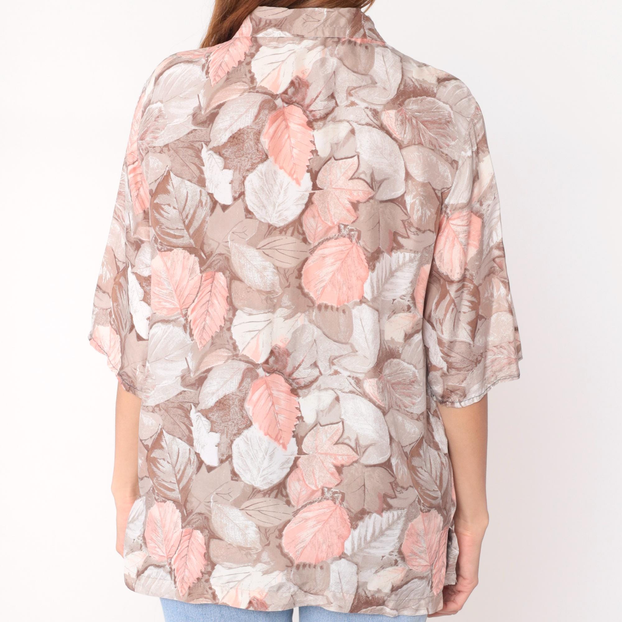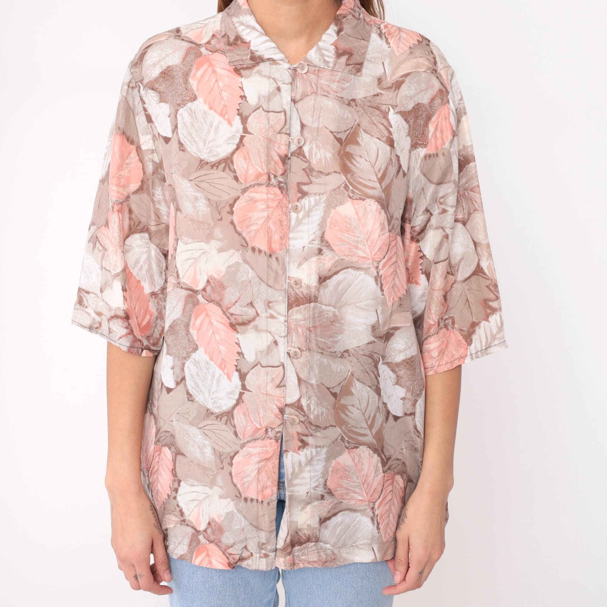 90s oversized collared shirt in a large-scale leaf print with pink, white, beige, and brown tones across the fabric. Button front closure with pointed collar and three-quarter length sleeves. Loose, boxy silhouette.