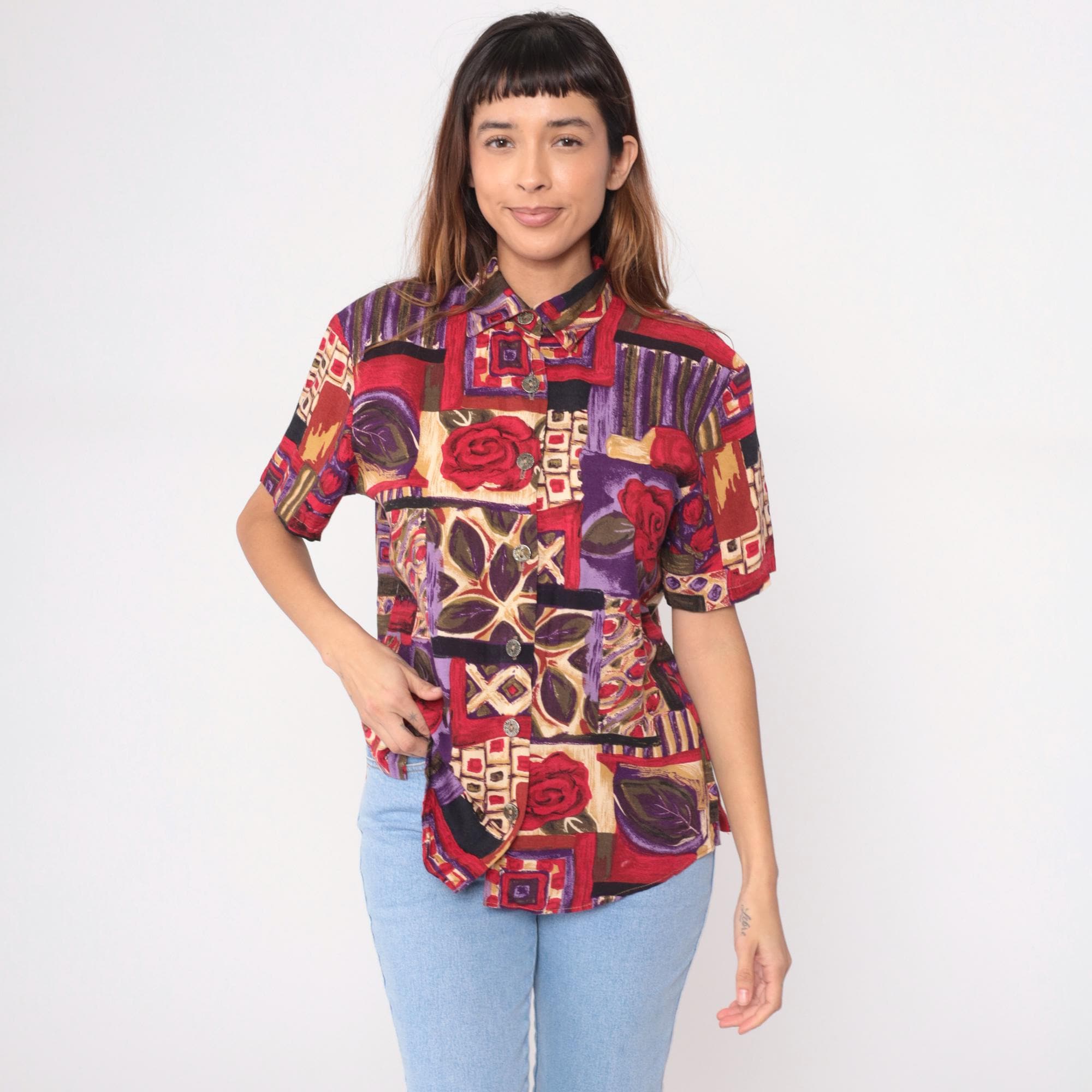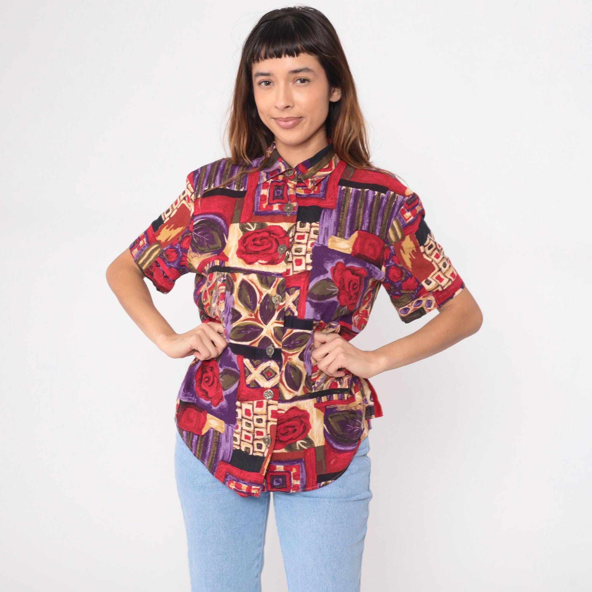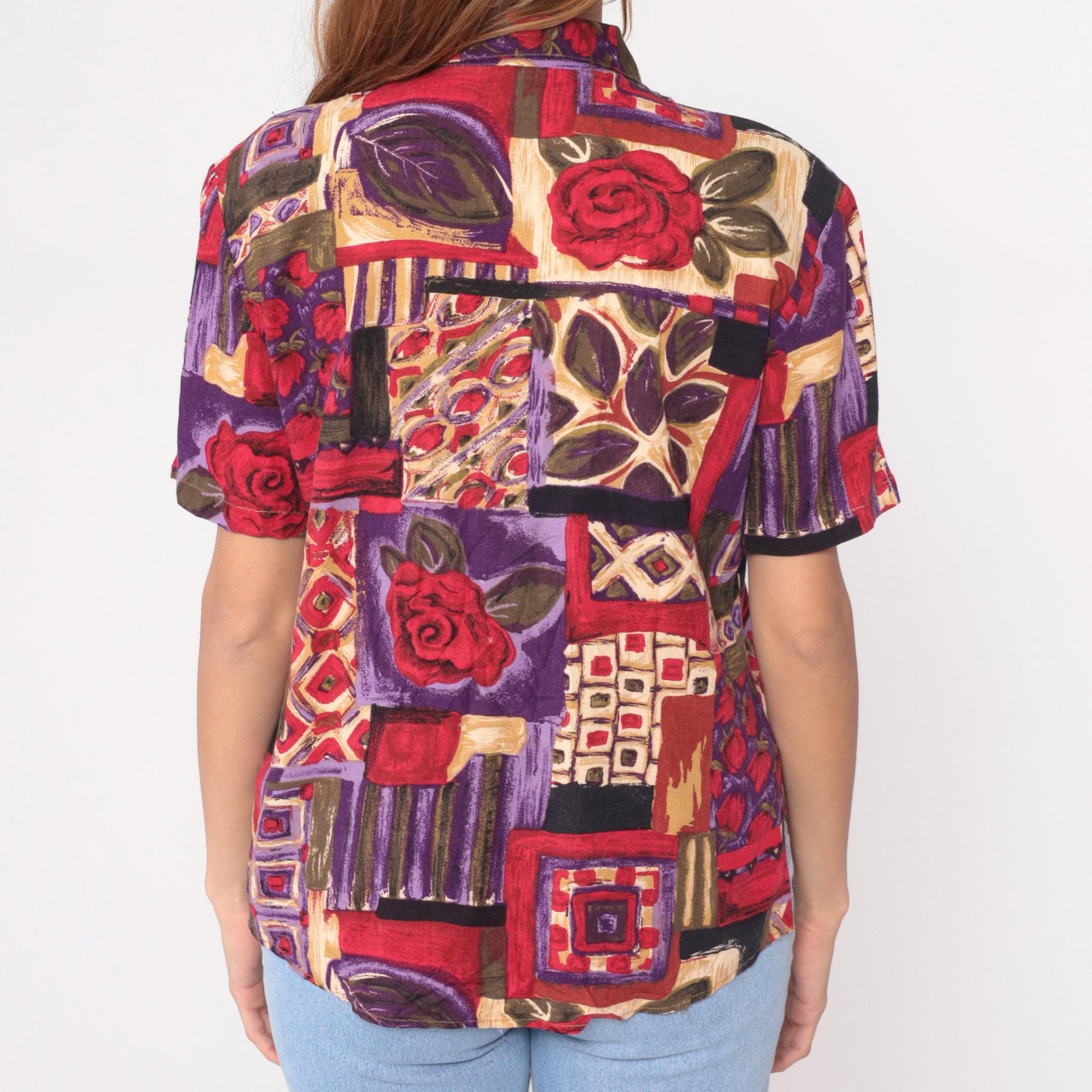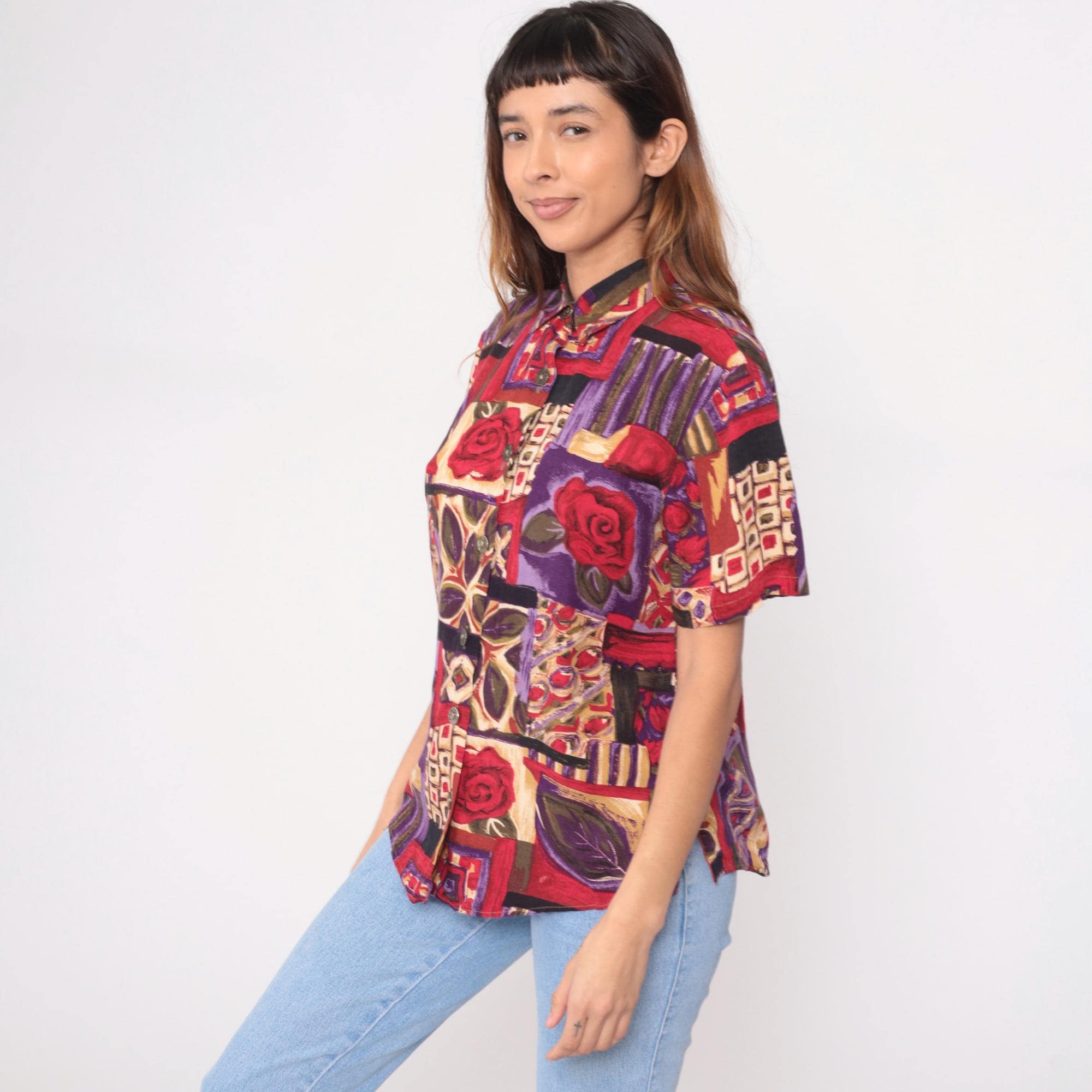 90s abstract patchwork shirt with geometric blocks, roses, and mixed patterns in purple, red, burgundy, cream, and brown. Button front closure with collar and short sleeves. All-over print features painterly roses, striped sections, diamond motifs, and rectangular grid designs.