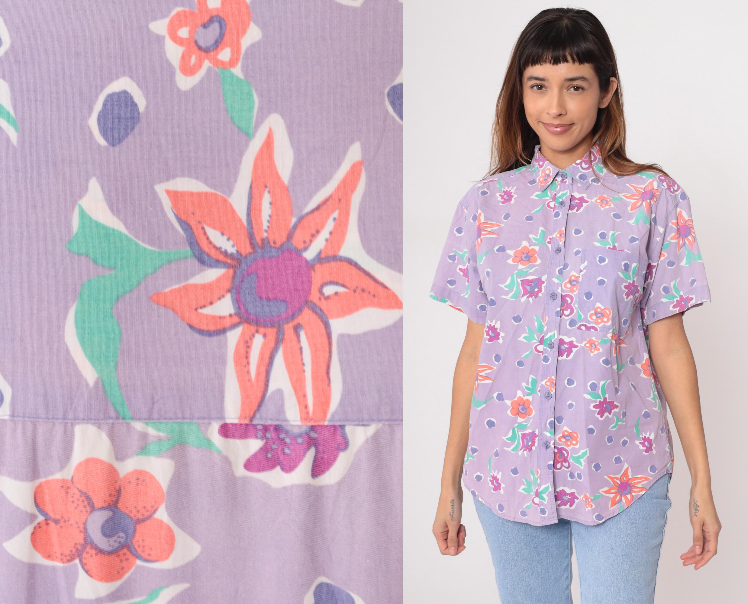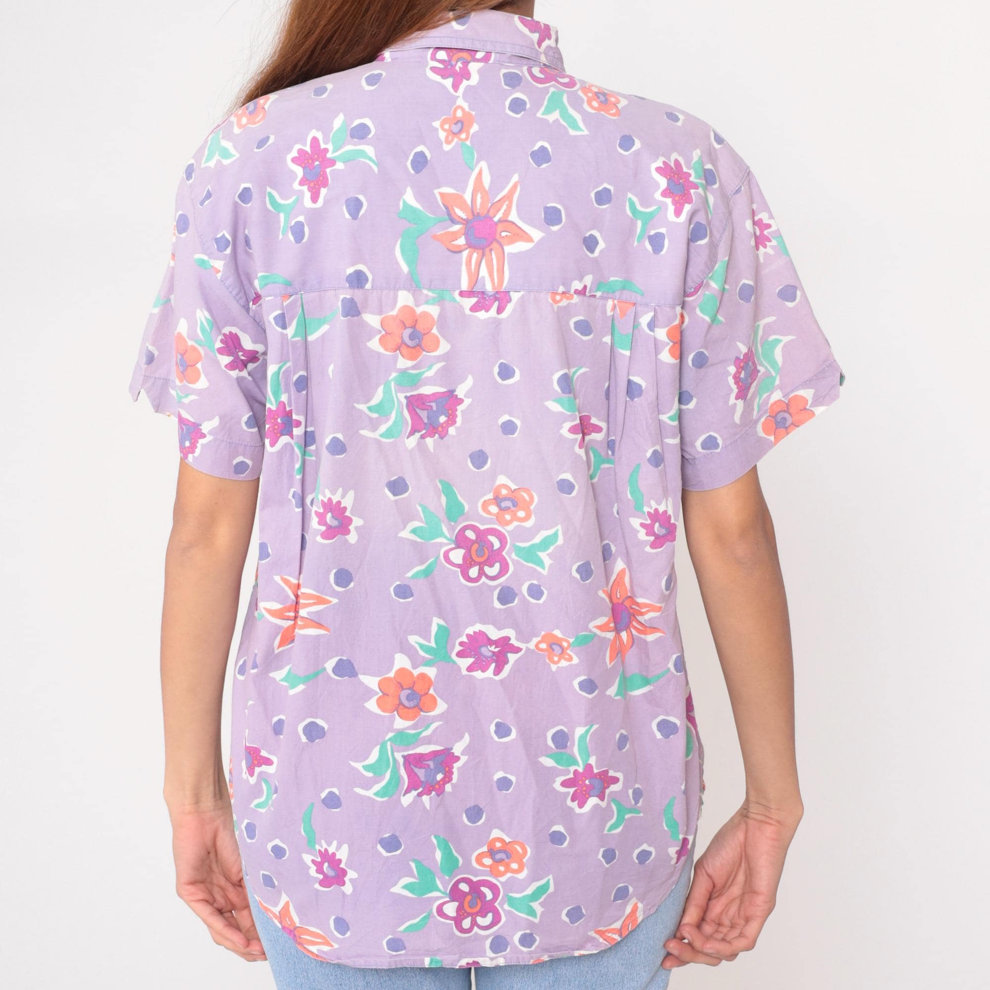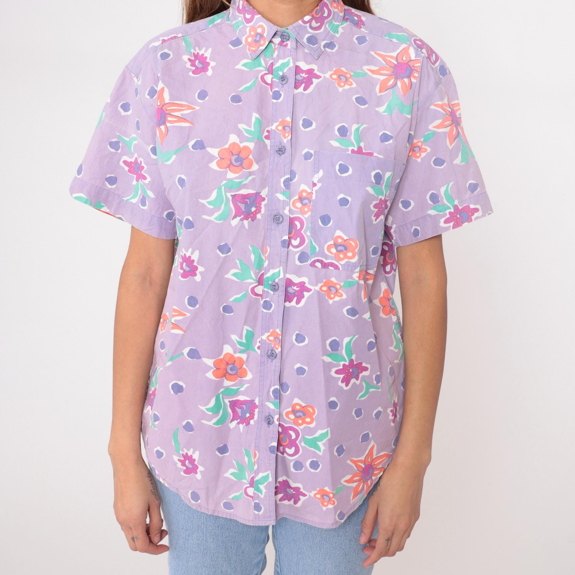 90s lavender button-up shirt from Preview International with floral print and polka dot background. Orange, pink, and purple flowers with green leaves across the fabric. Collared neckline, short sleeves, button front closure.