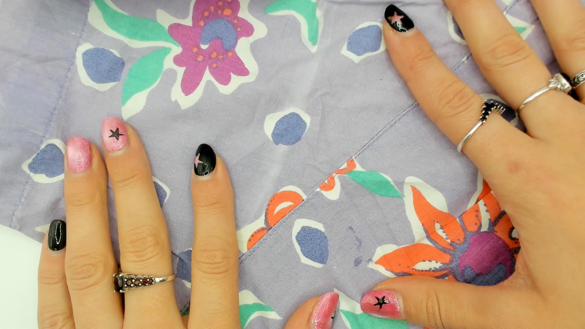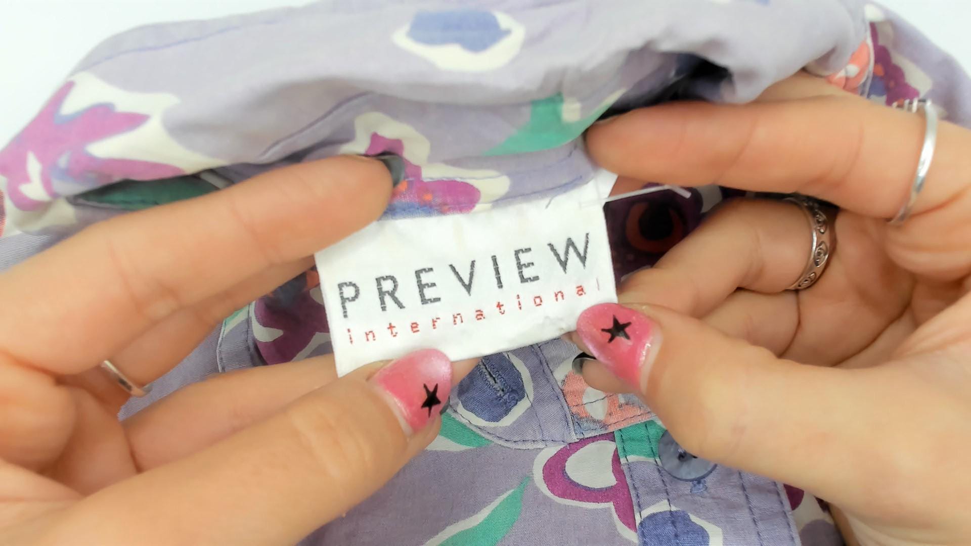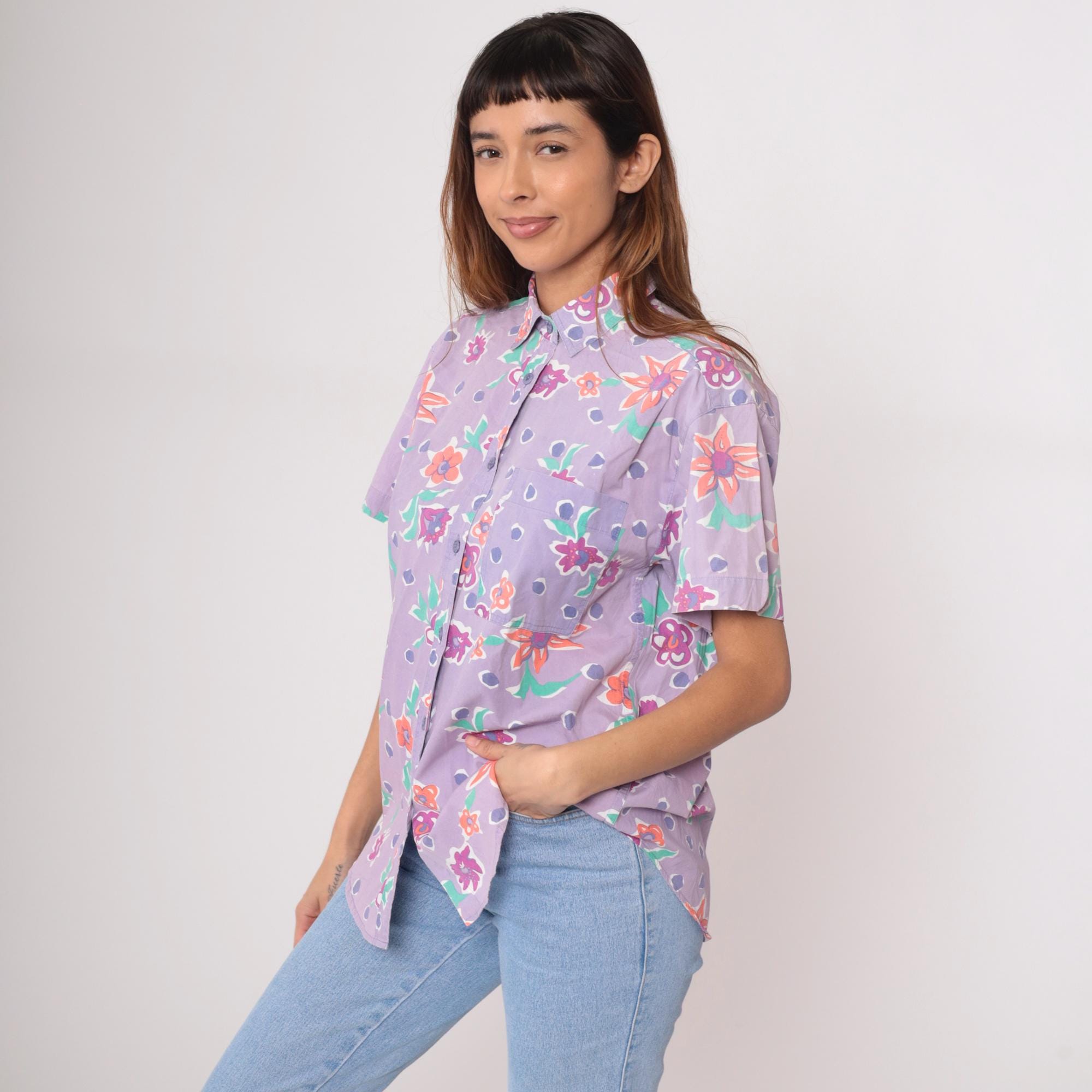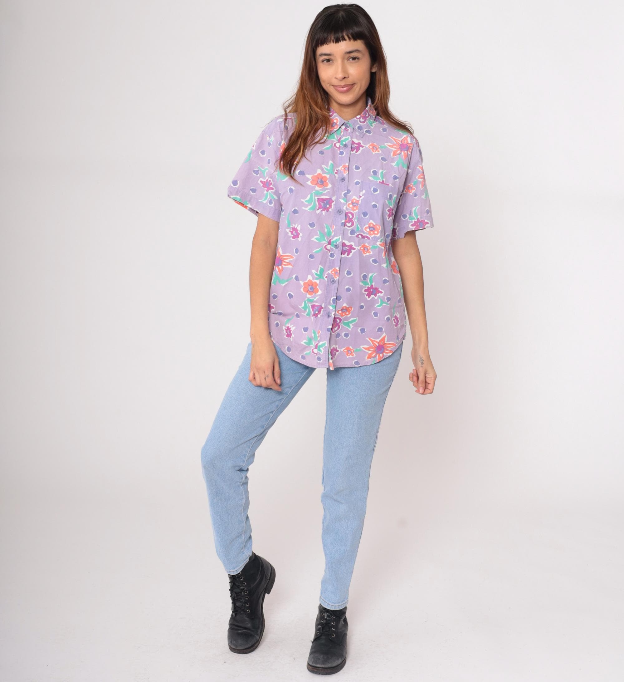 90s lavender button-up shirt from Preview International with floral print and polka dot background. Orange, pink, and purple flowers with green leaves across the fabric. Collared neckline, short sleeves, button front closure.