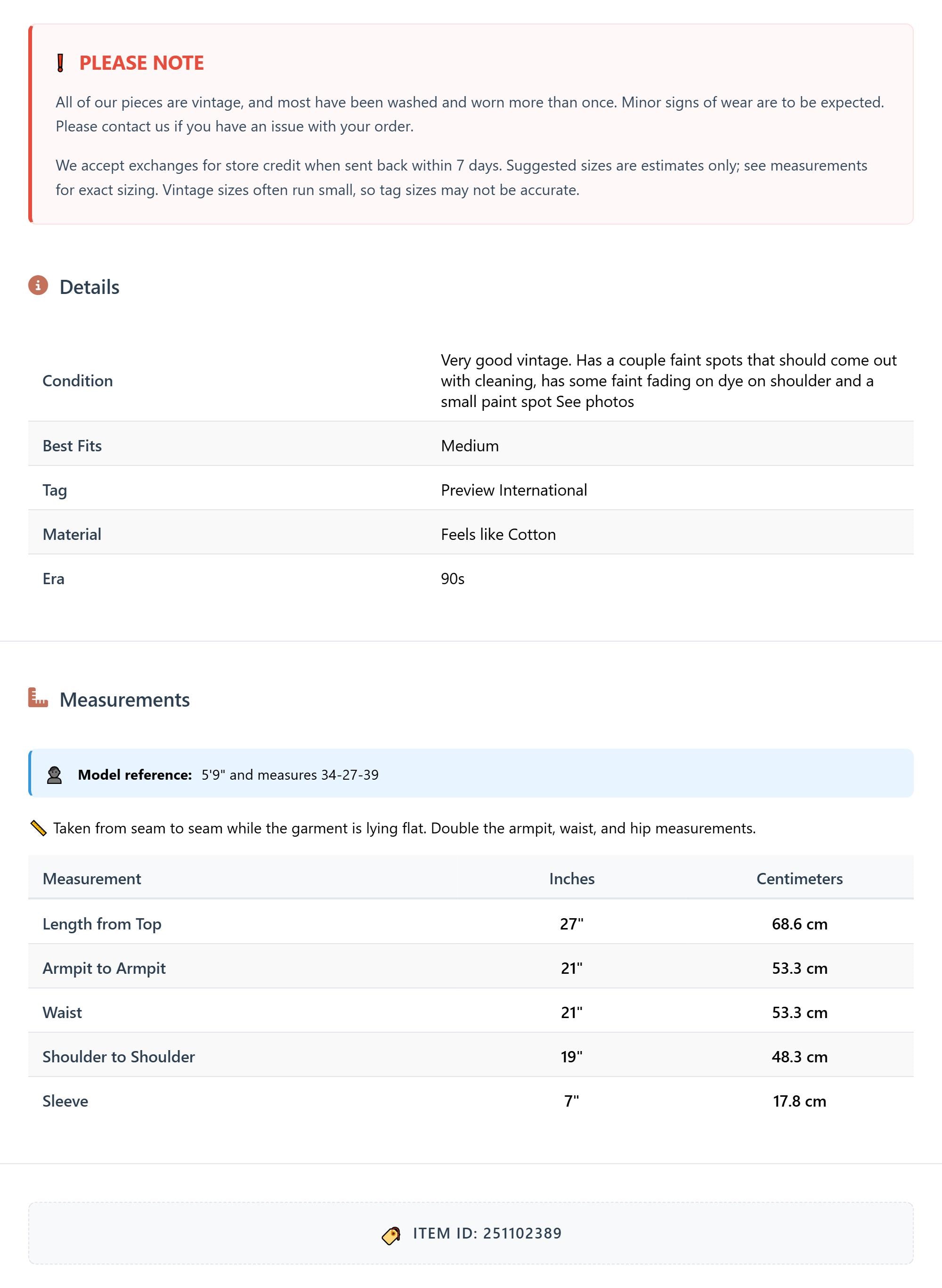 All of our pieces are vintage, and most have been washed and worn more than once. Minor signs of wear are to be expected. Please contact us if you have an issue with your order. We accept exchanges for store credit when sent back within 7 days.