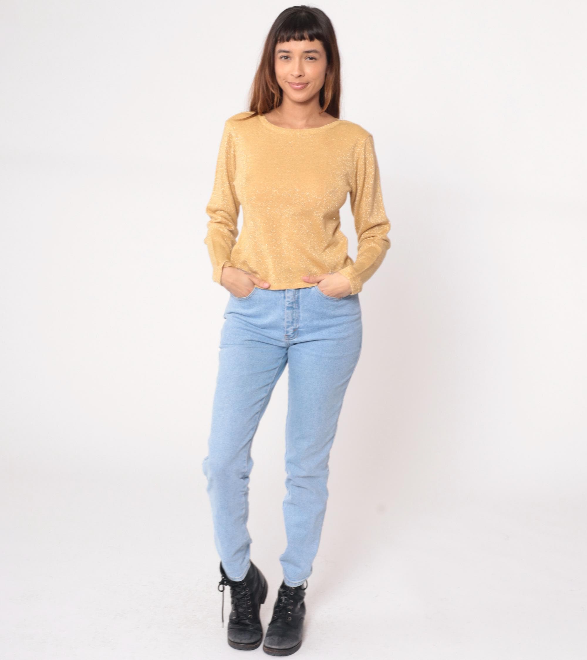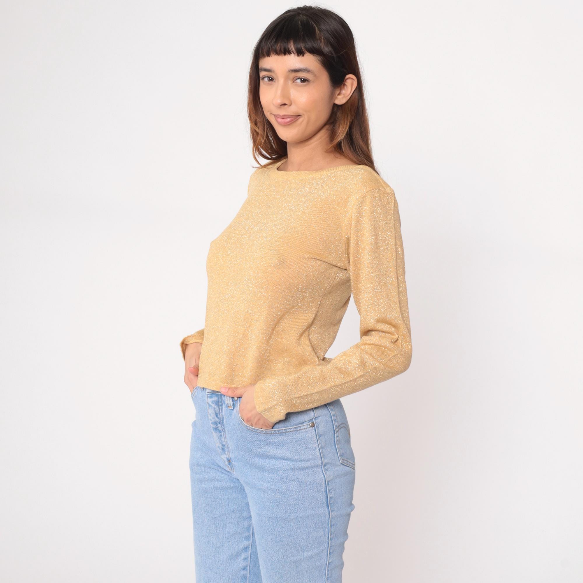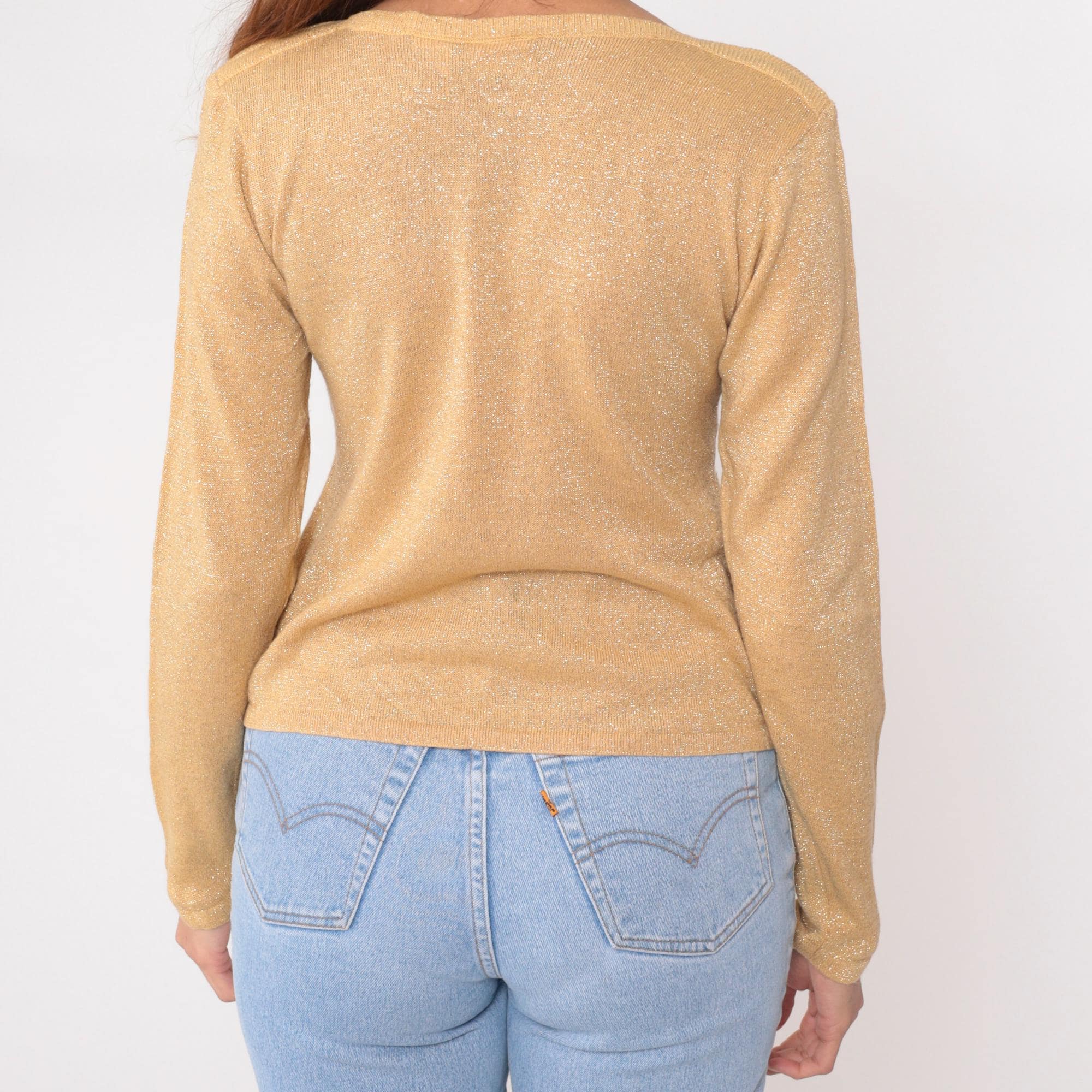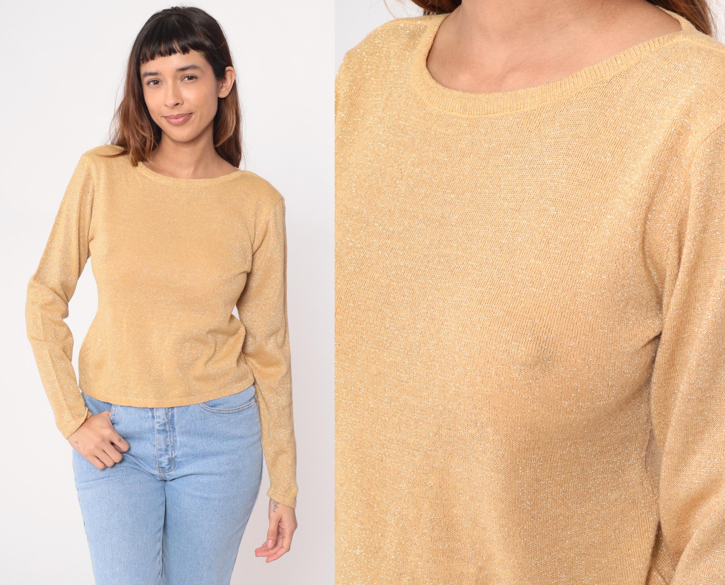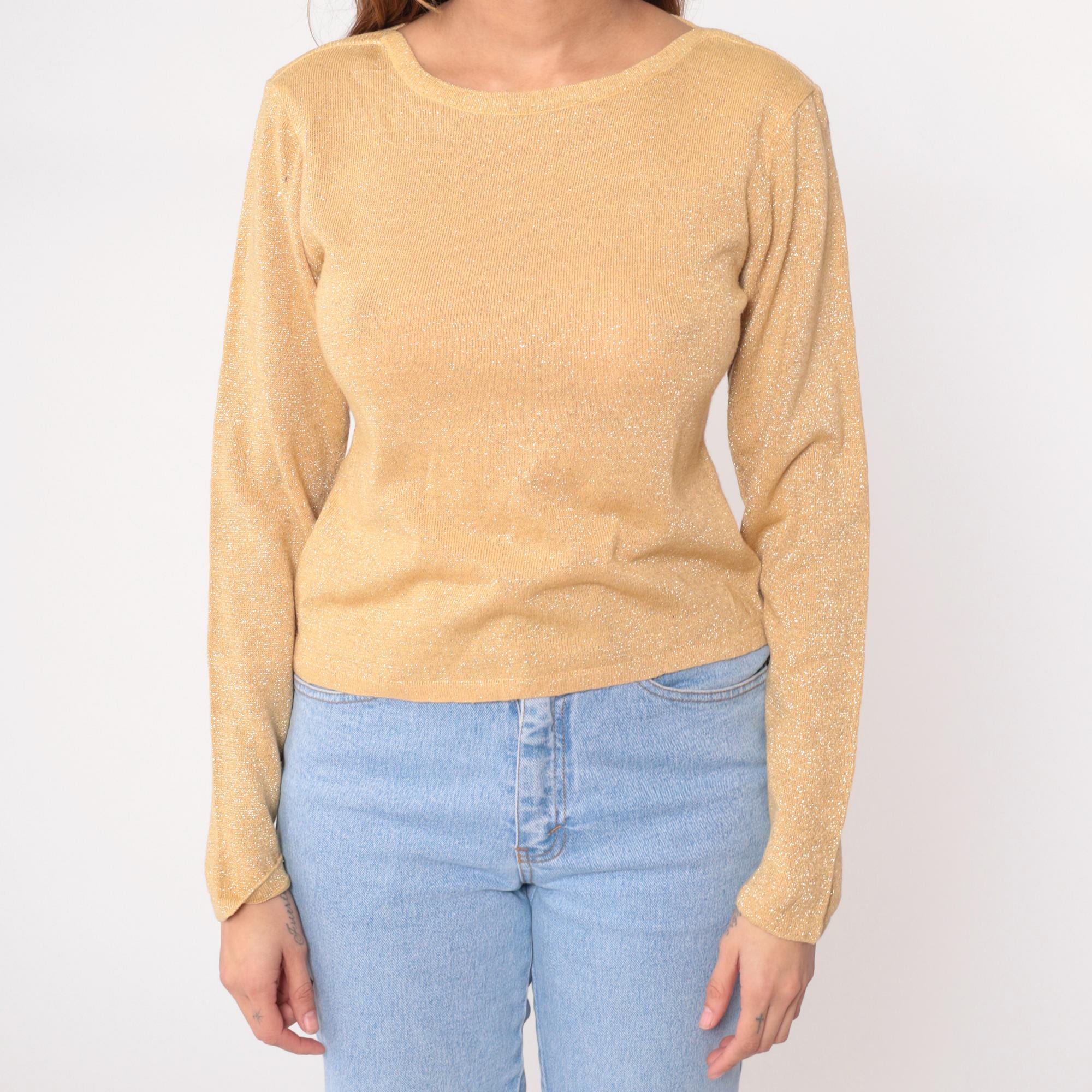 90s gold shimmer sweater from Newport News with crew neck and long sleeves. Ribbed collar, cuffs, and hem. Metallic thread woven throughout the knit fabric.