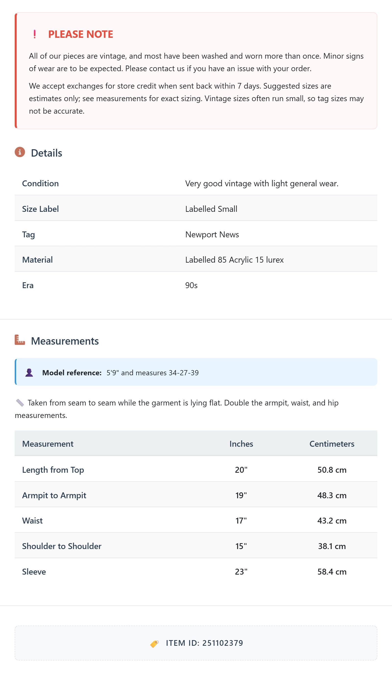 Suggested sizes are estimates only; see measurements for exact sizing. Vintage sizes often run small, so tag sizes may not be accurate.