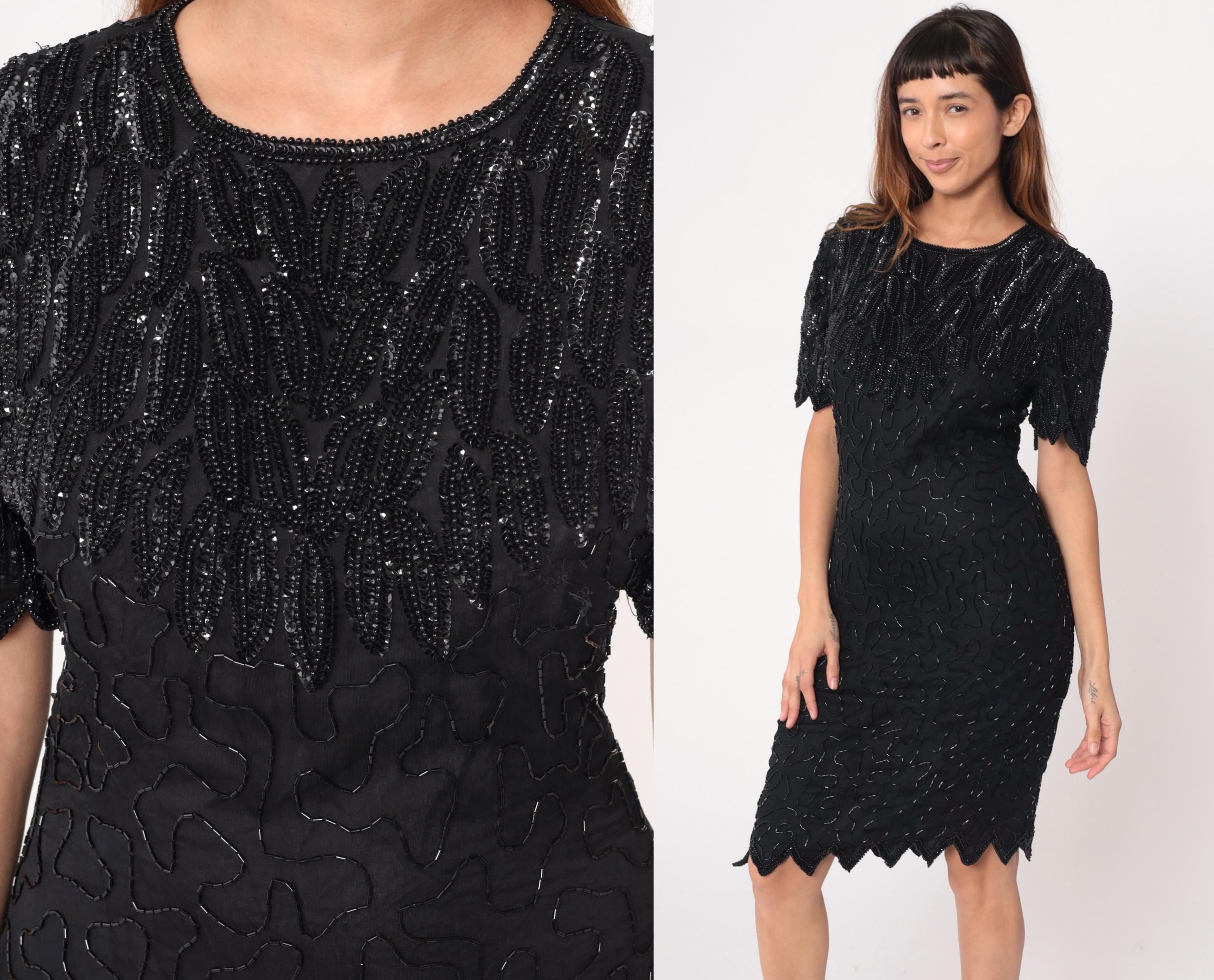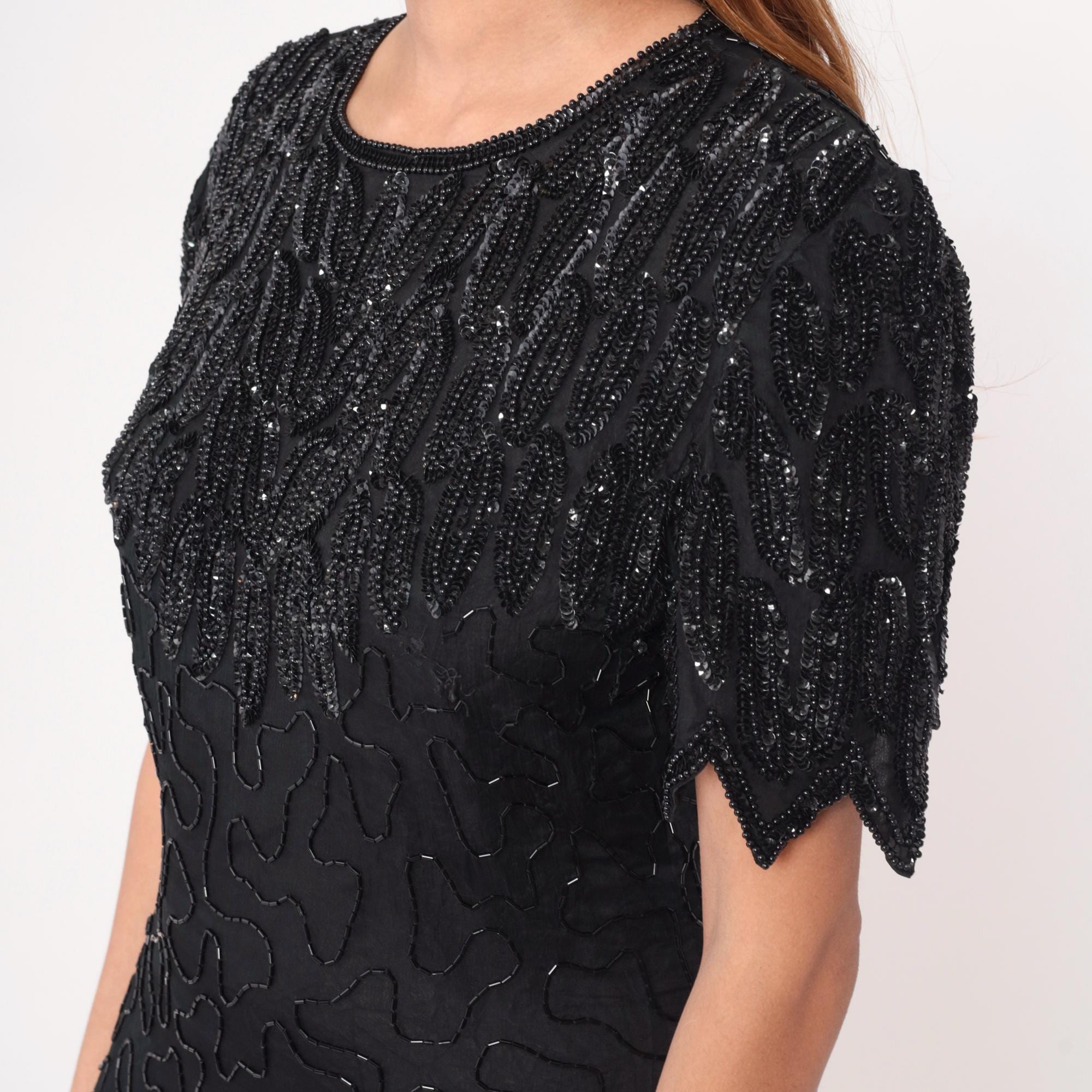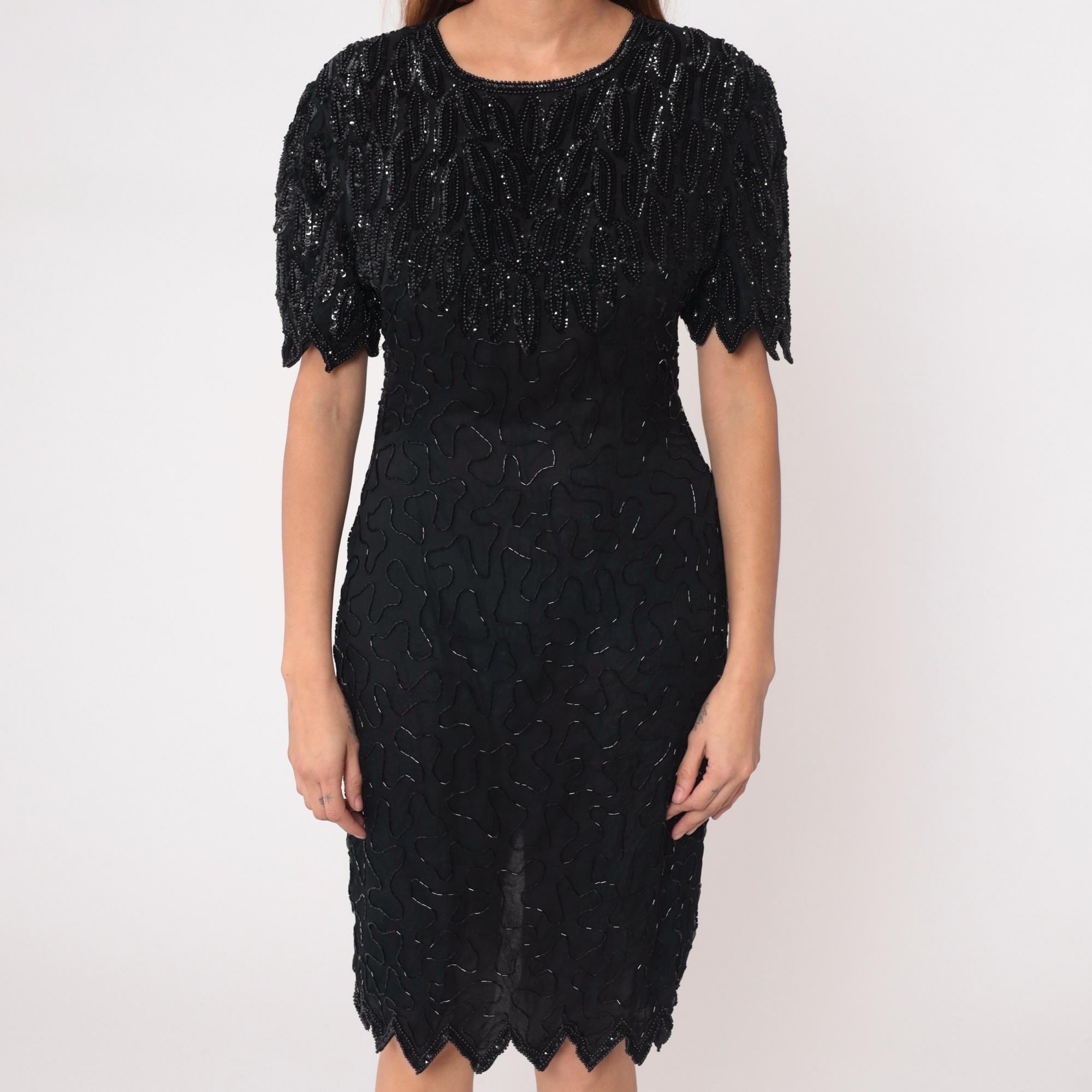 90s black silk dress from Laurence Kazar with heavy beaded embellishment across the entire garment. Short sleeves with dense beadwork and sequins, scalloped hem at bottom. Fitted knee-length silhouette with all-over embroidered appliqué pattern.