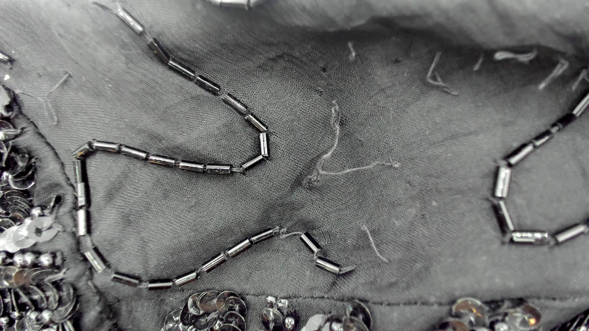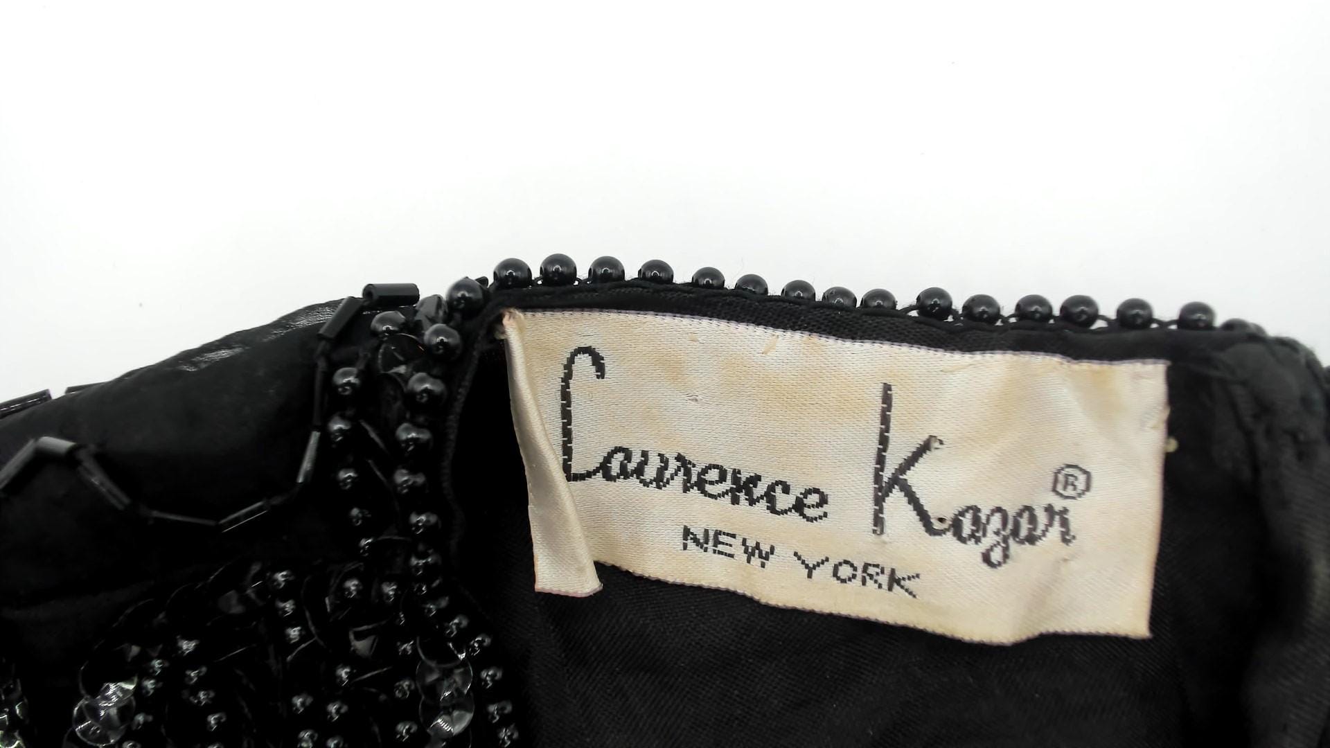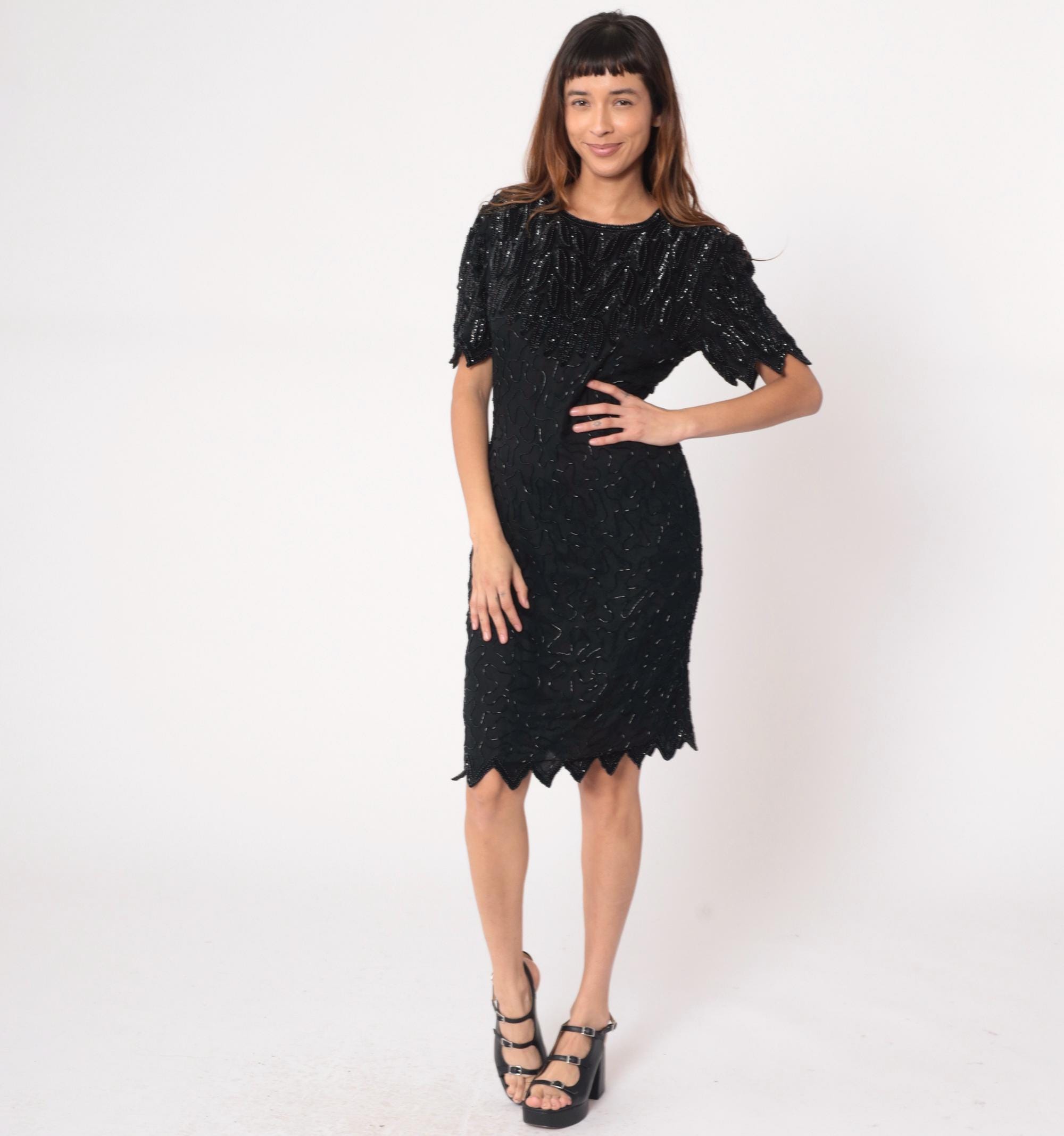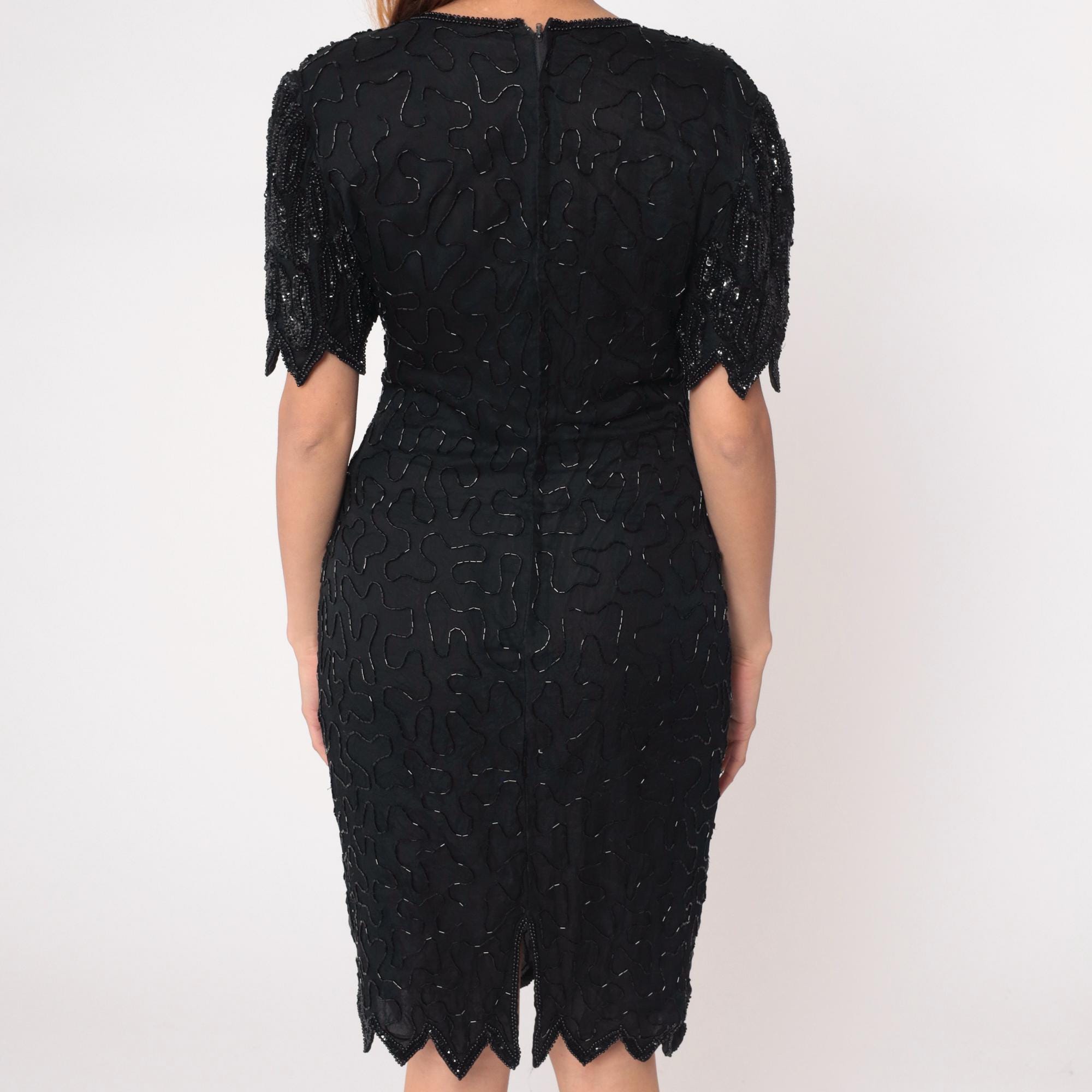 90s black silk dress from Laurence Kazar with heavy beaded embellishment across the entire garment. Short sleeves with dense beadwork and sequins, scalloped hem at bottom. Fitted knee-length silhouette with all-over embroidered appliqué pattern.