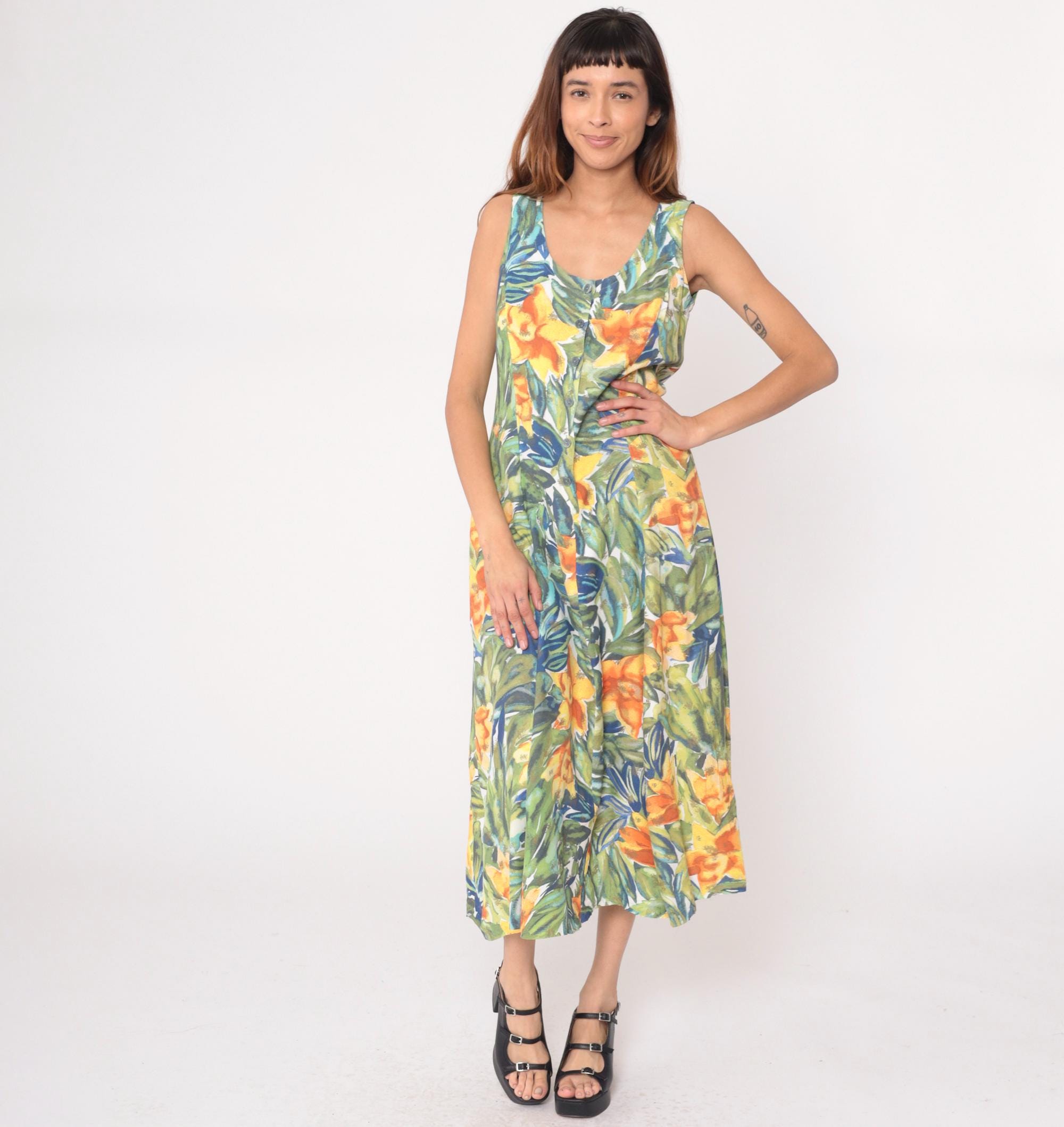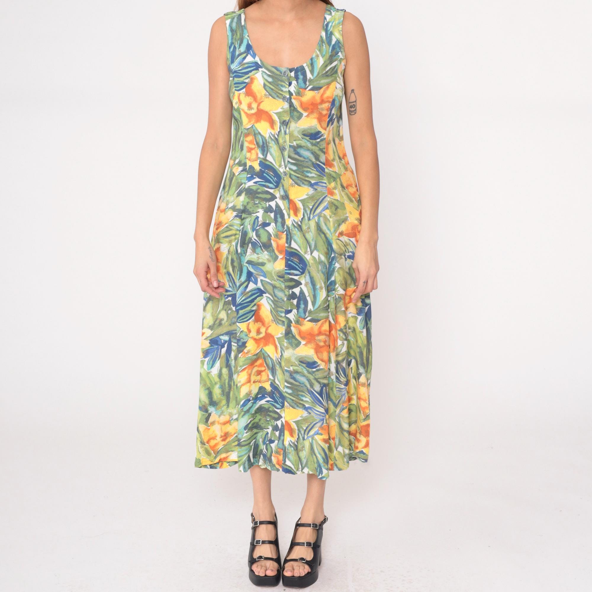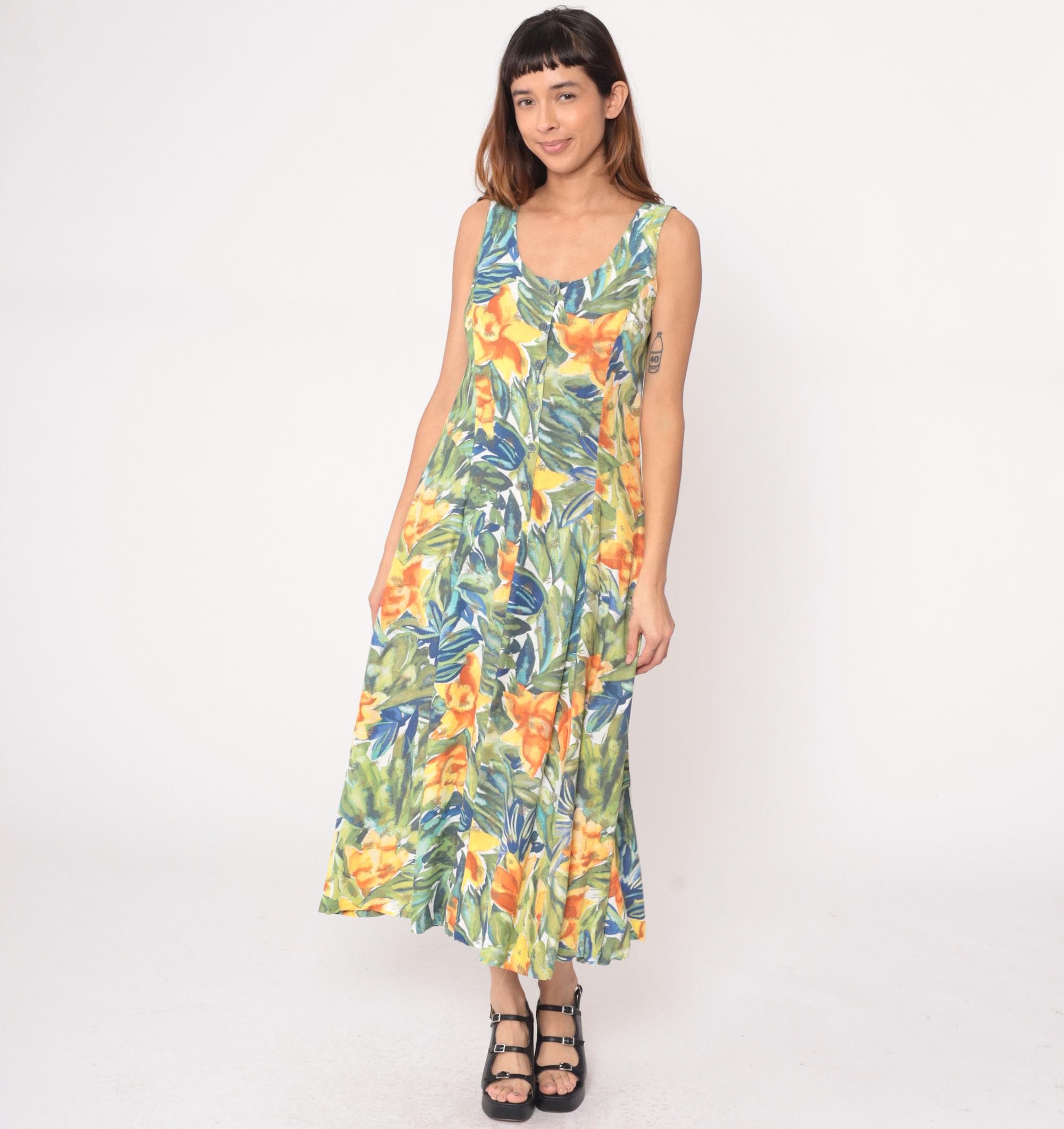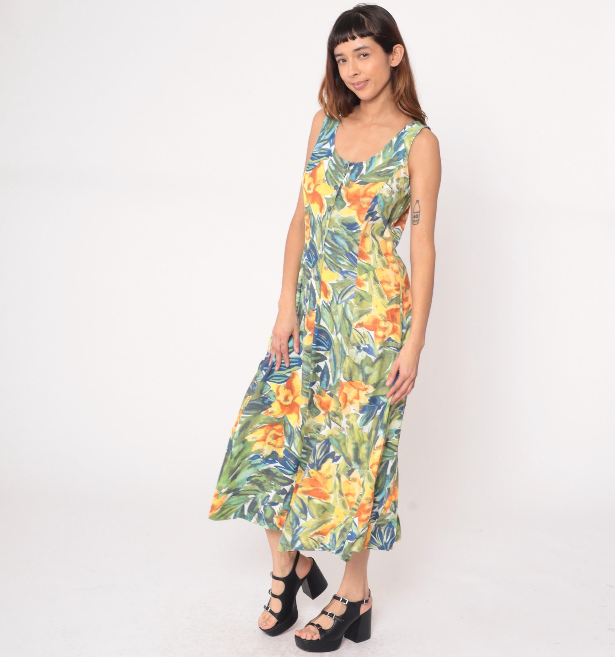 90s tropical print maxi dress from The Limited with yellow and orange flowers and green palm leaves on white background. Button front bodice with scoop neckline, sleeveless design, fitted bodice with A-line skirt.