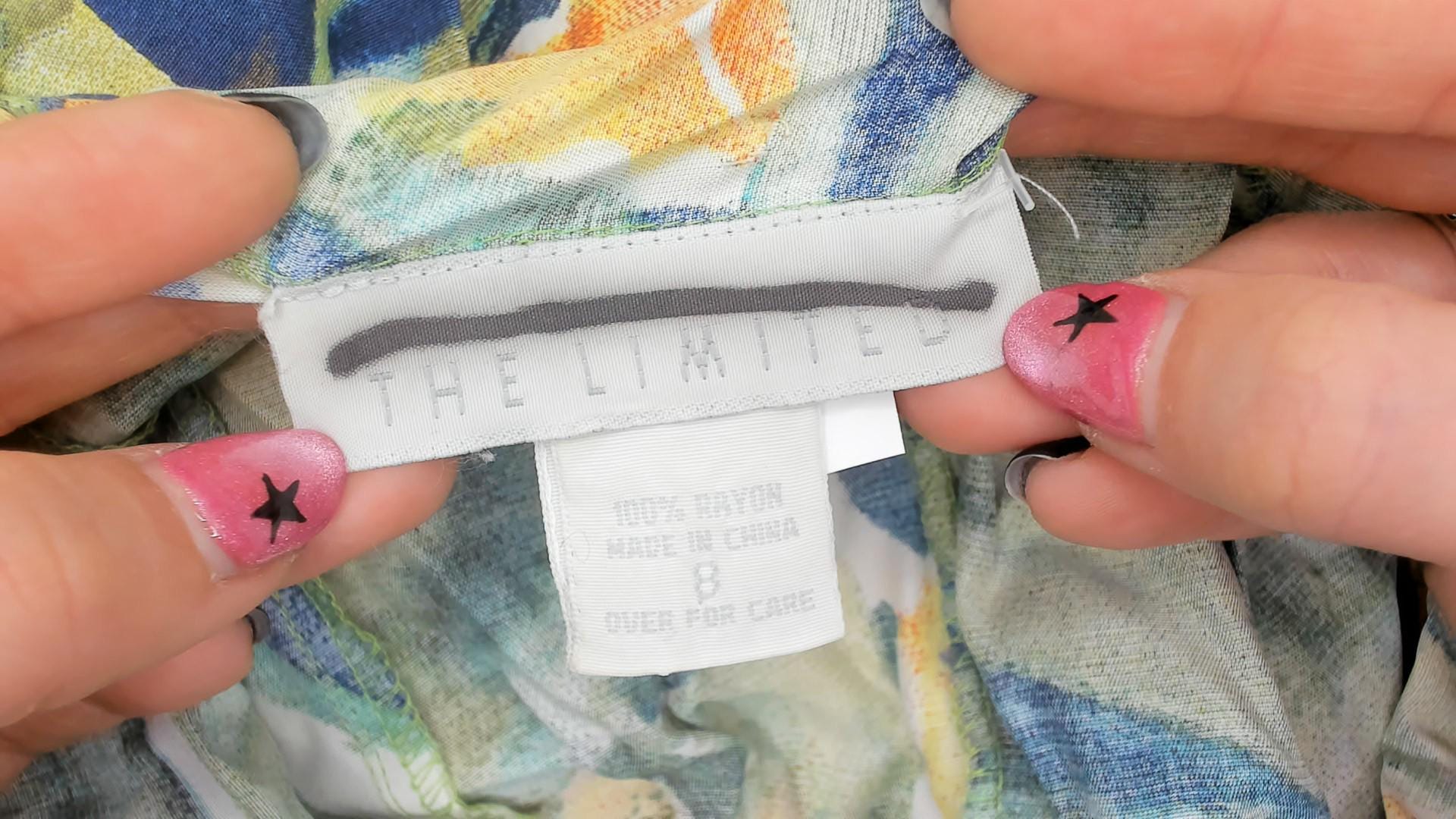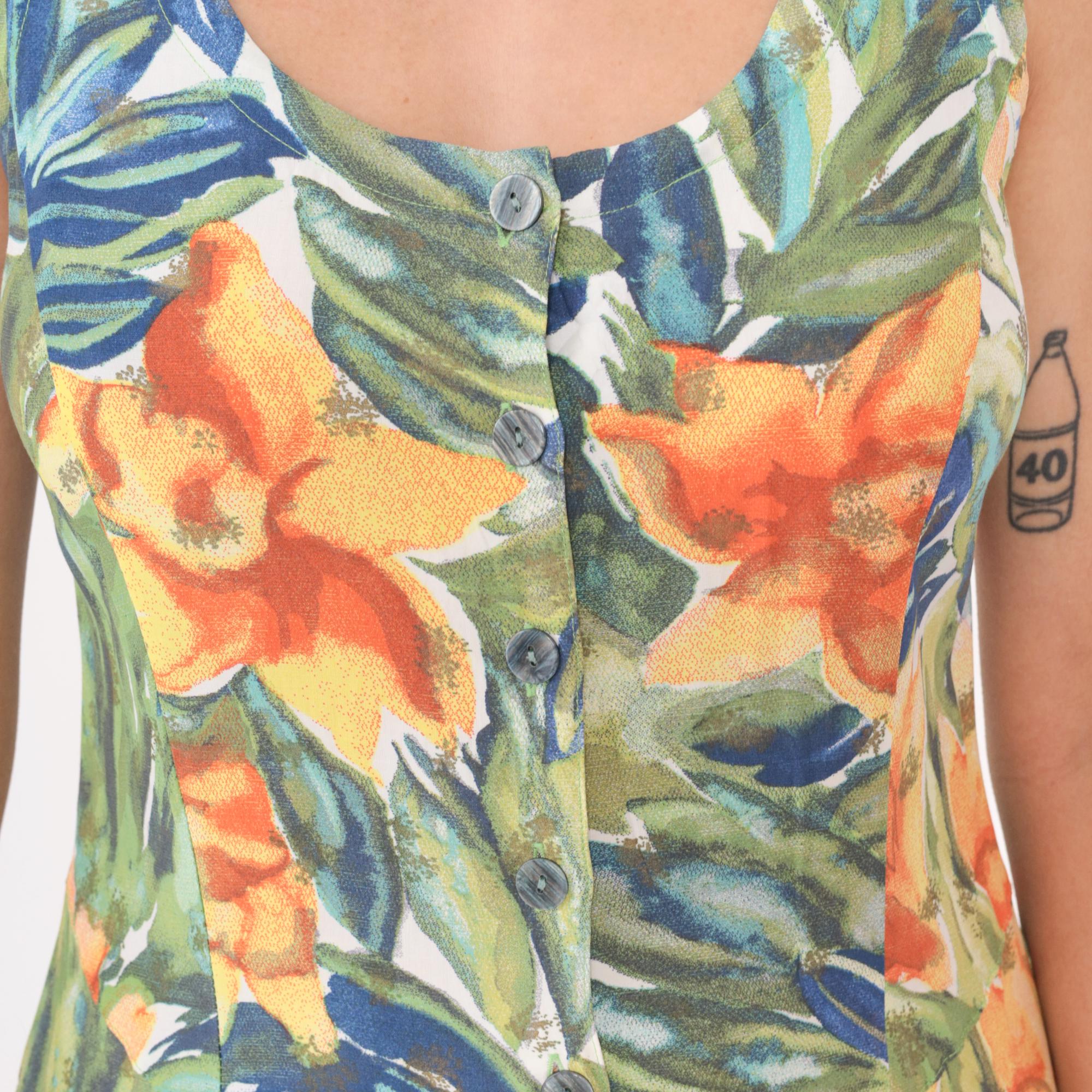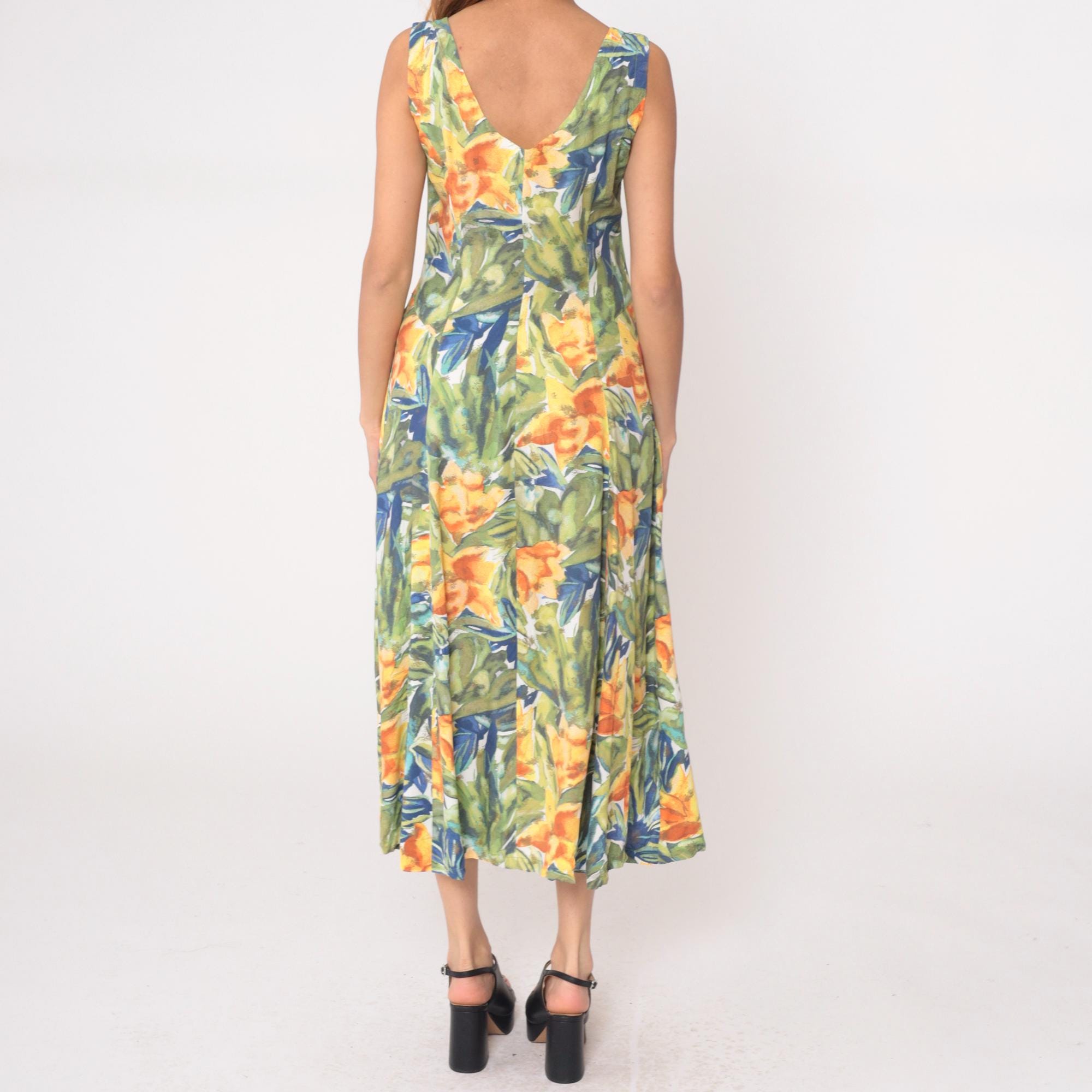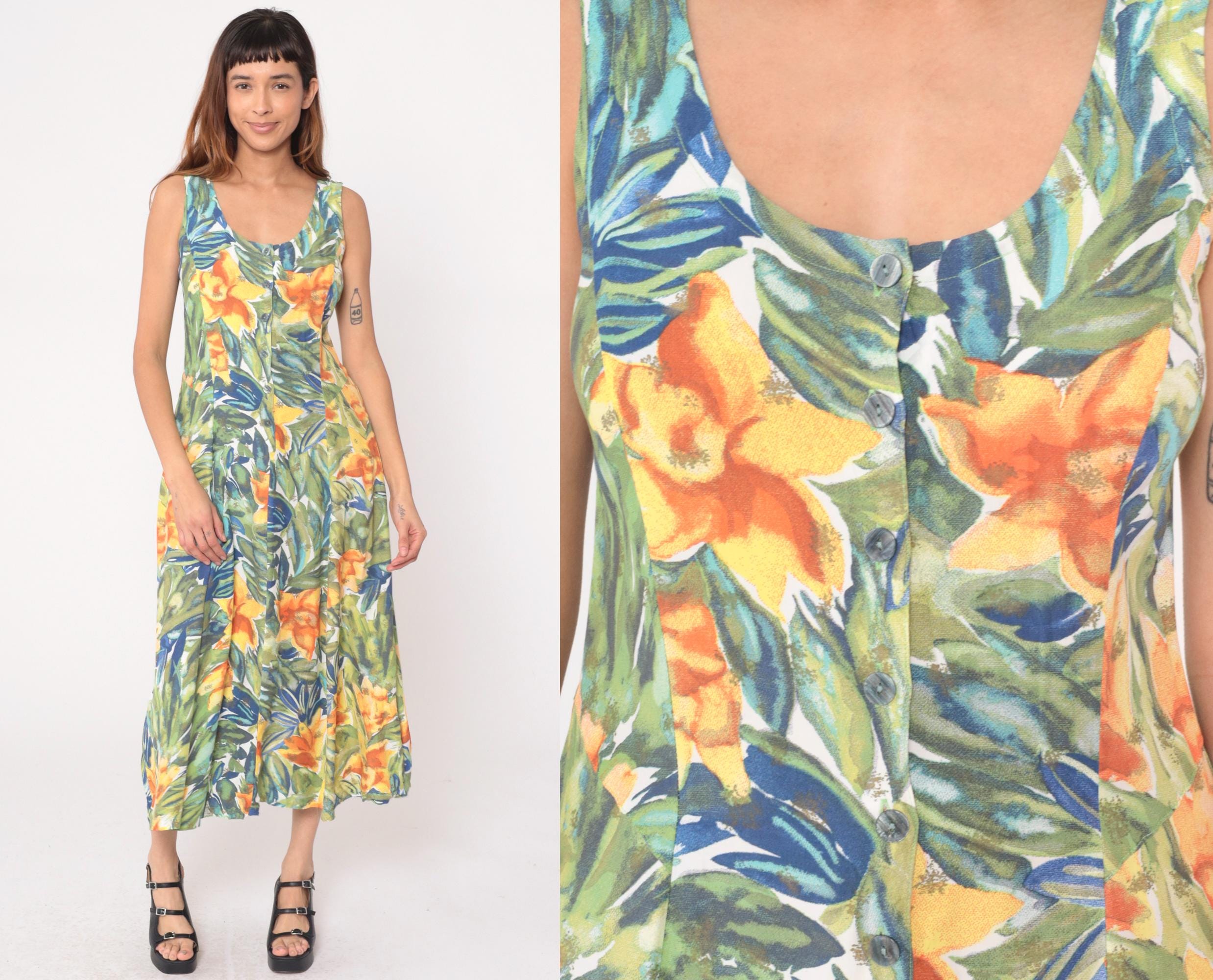 90s tropical print maxi dress from The Limited with yellow and orange flowers and green palm leaves on white background. Button front bodice with scoop neckline, sleeveless design, fitted bodice with A-line skirt.