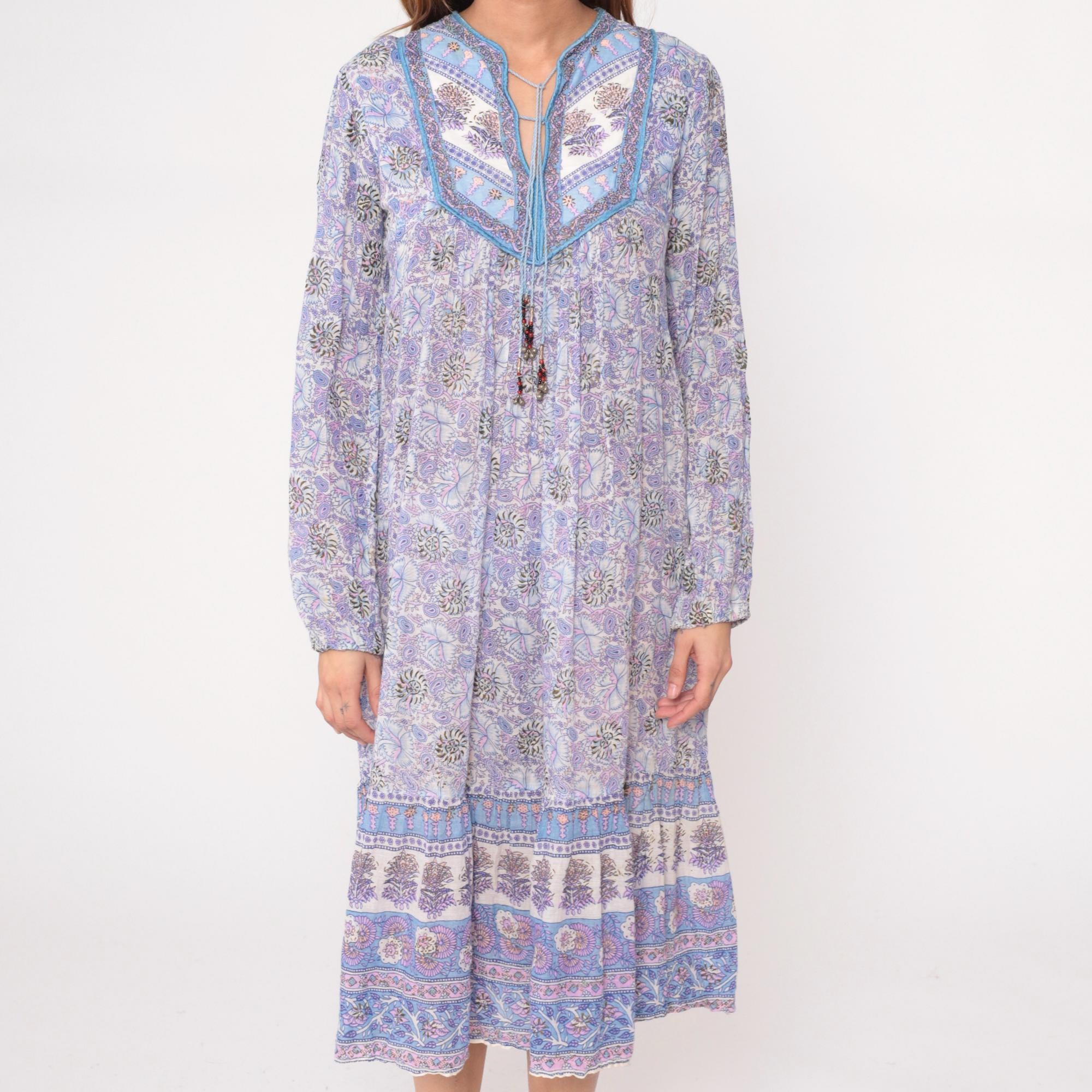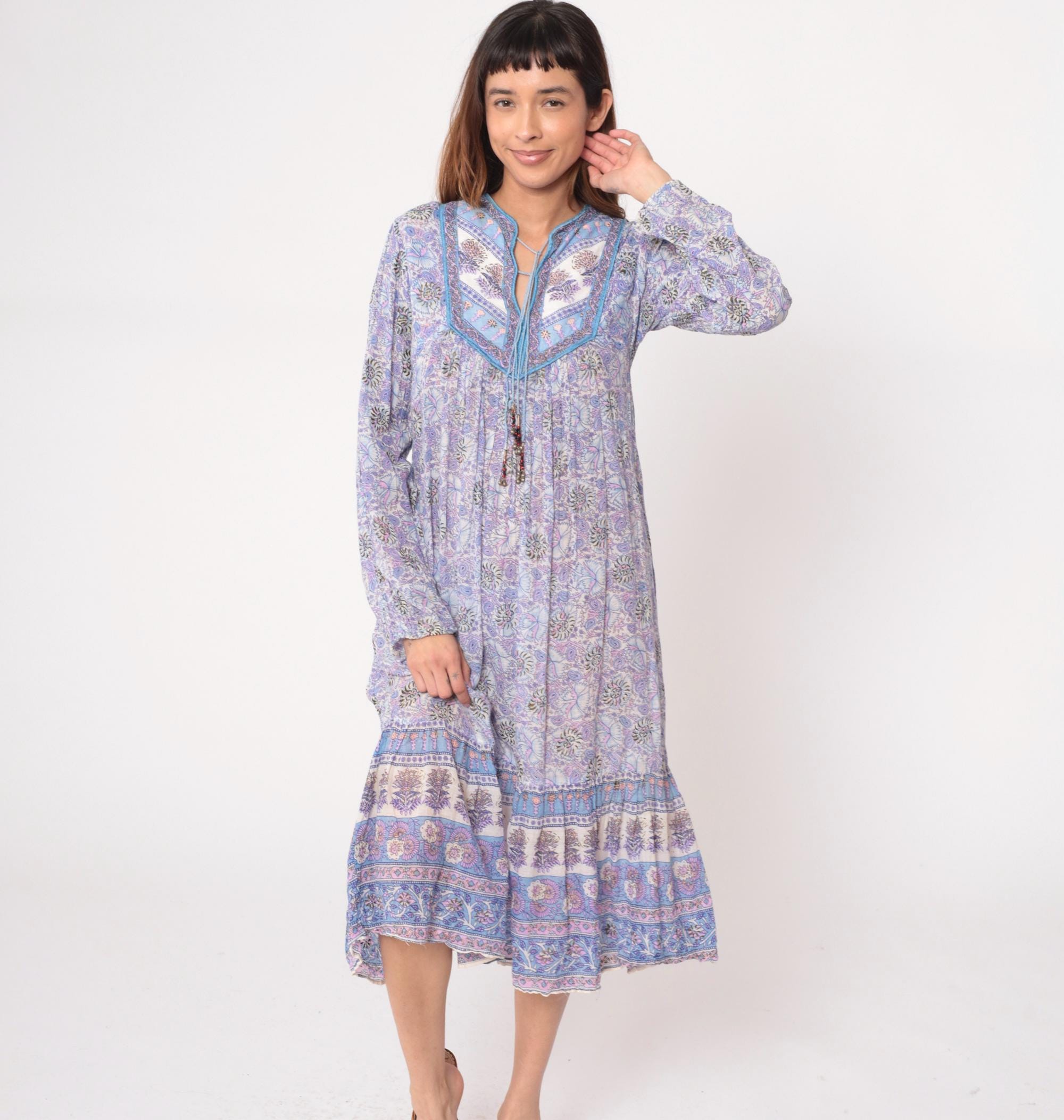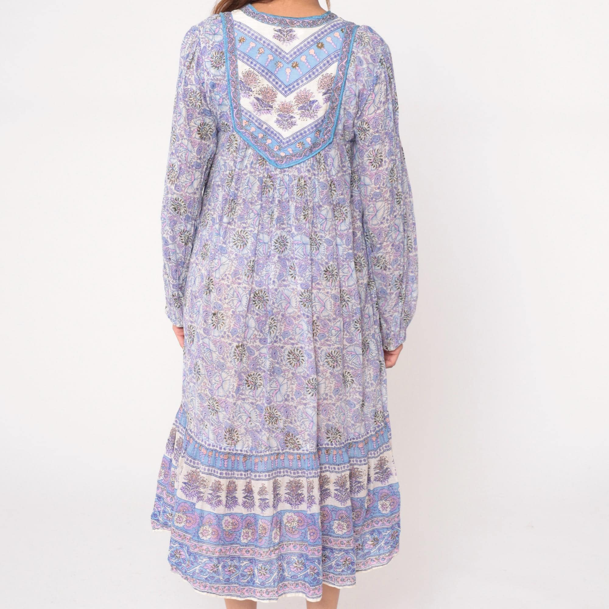 90s purple and lavender floral paisley maxi dress from Taja with beaded chevron yoke detail and tie closure at V-neckline. All-over paisley print with border print hem featuring cream sections and geometric patterns. Long sleeves, gathered waist, side pockets.