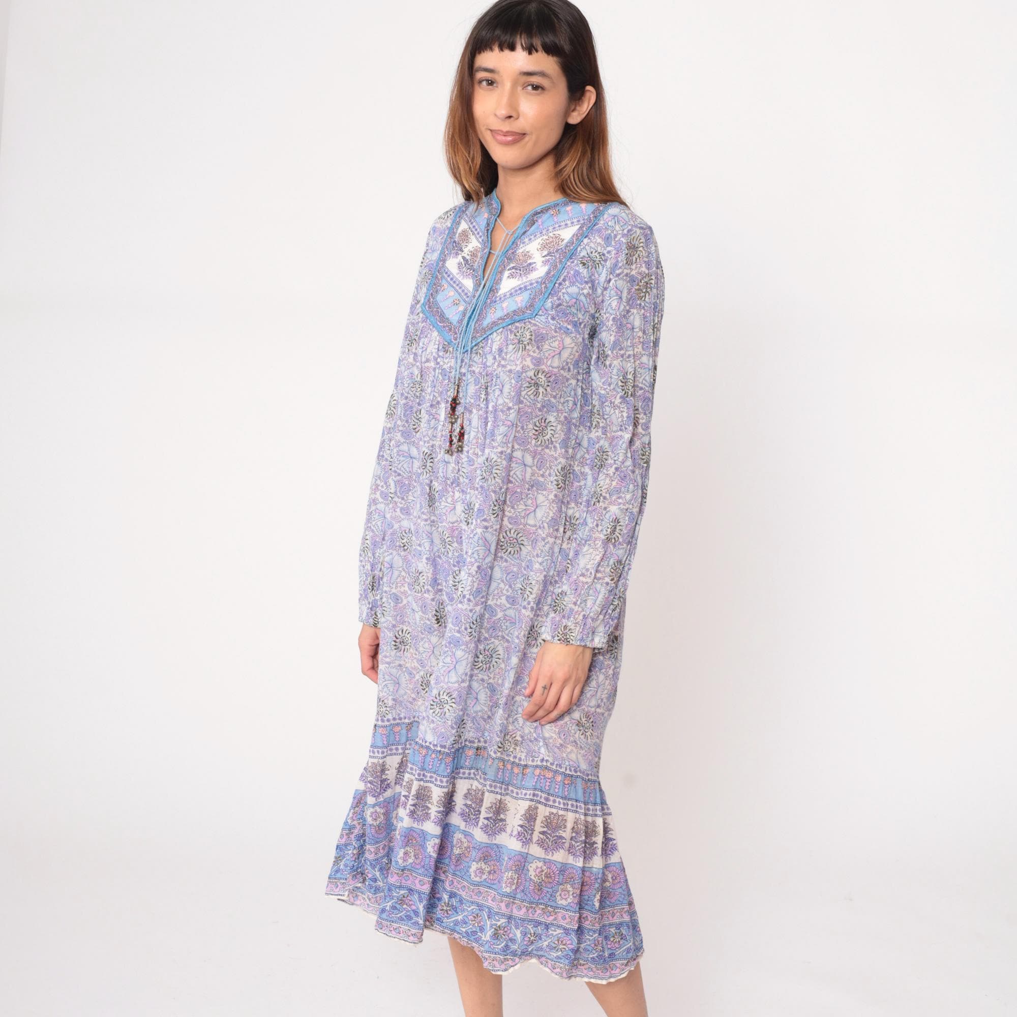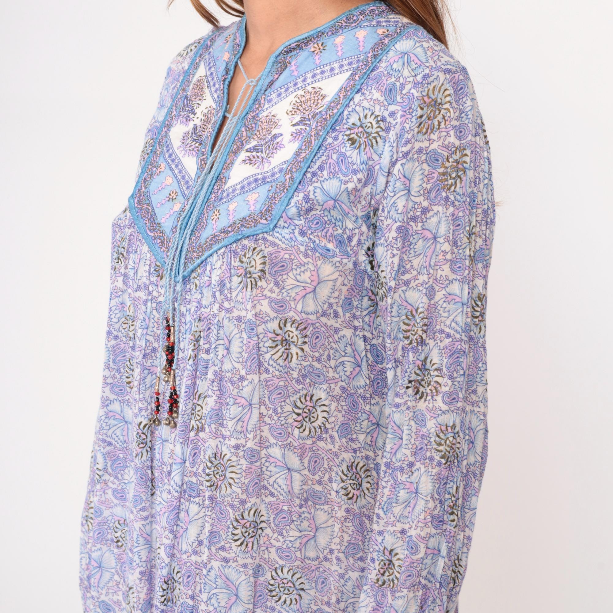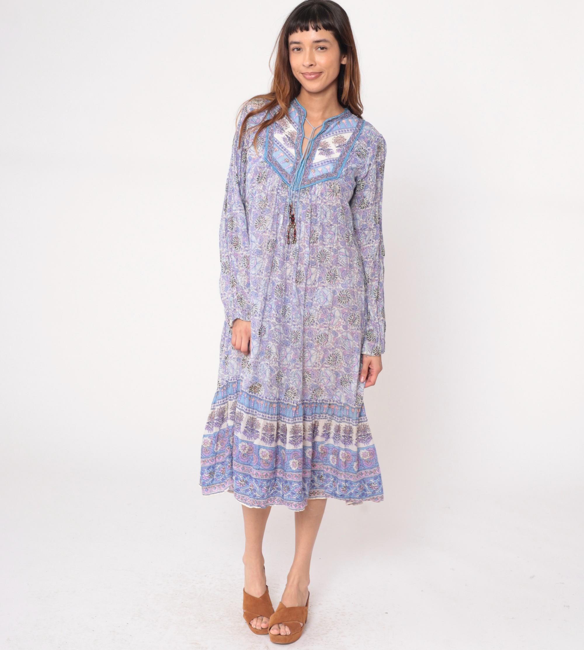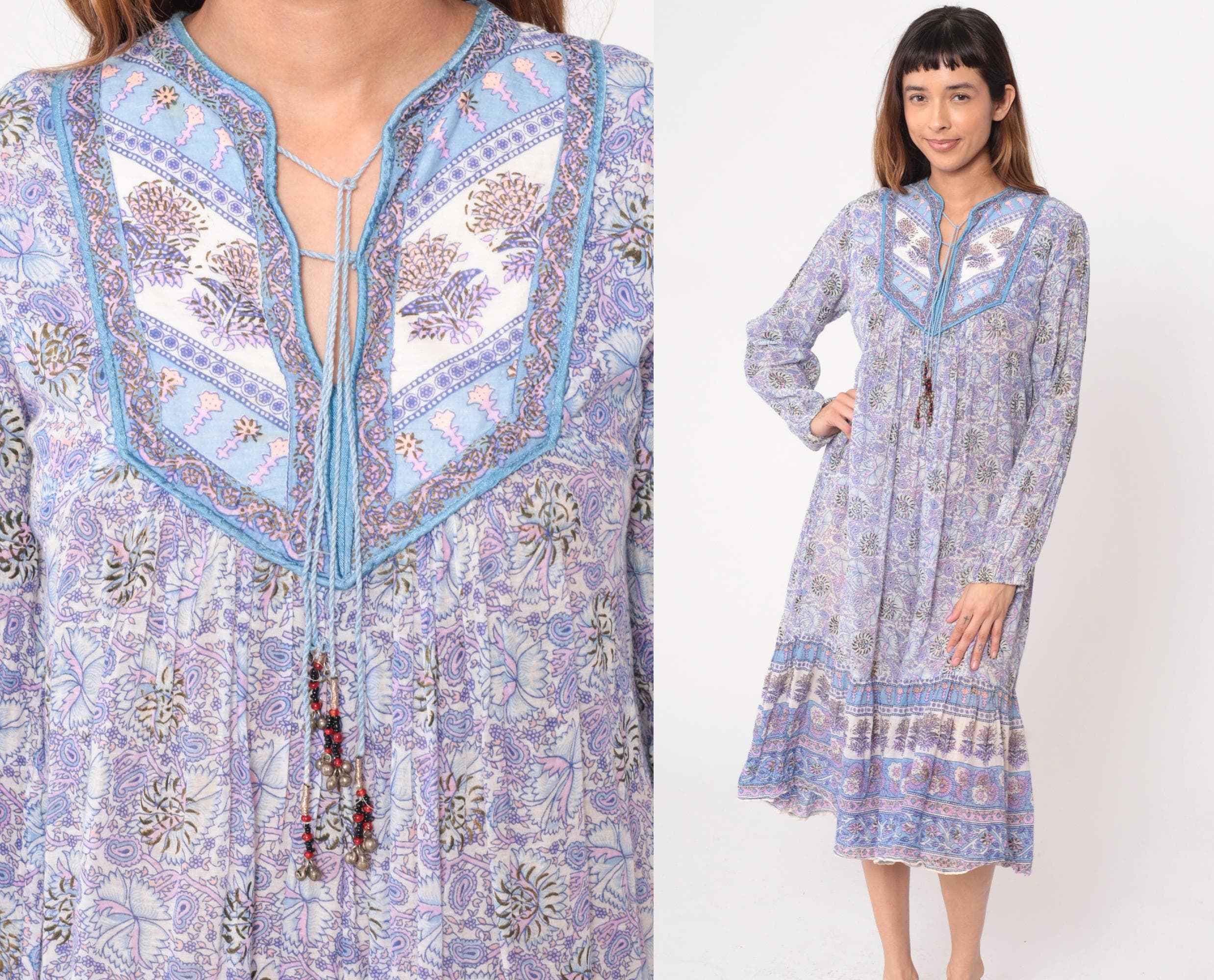 90s purple and lavender floral paisley maxi dress from Taja with beaded chevron yoke detail and tie closure at V-neckline. All-over paisley print with border print hem featuring cream sections and geometric patterns. Long sleeves, gathered waist, side pockets.