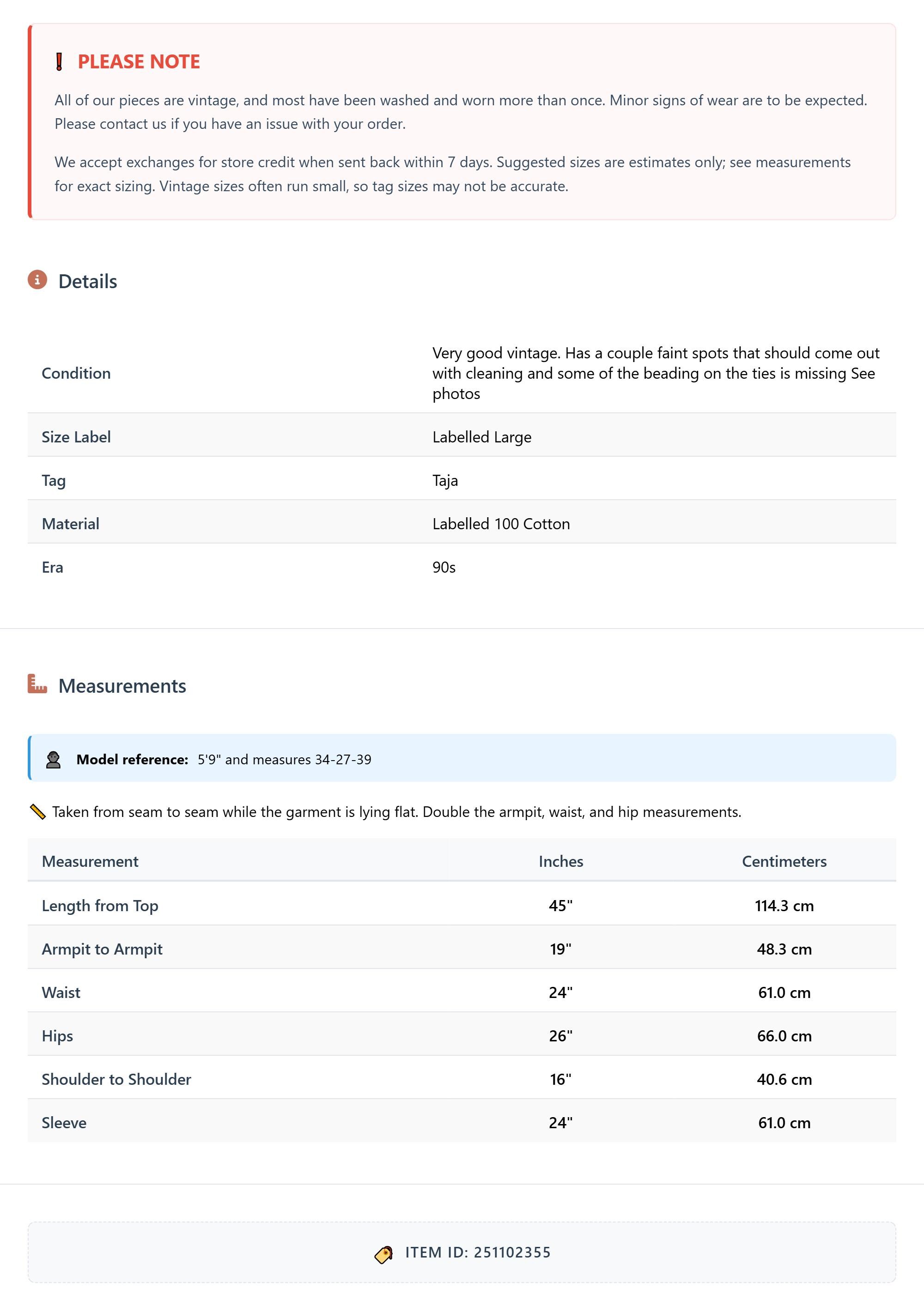All of our pieces are vintage, and most have been washed and worn more than once. Minor signs of wear are to be expected. Please contact us if you have an issue with your order. We accept exchanges for store credit when sent back within 7 days.