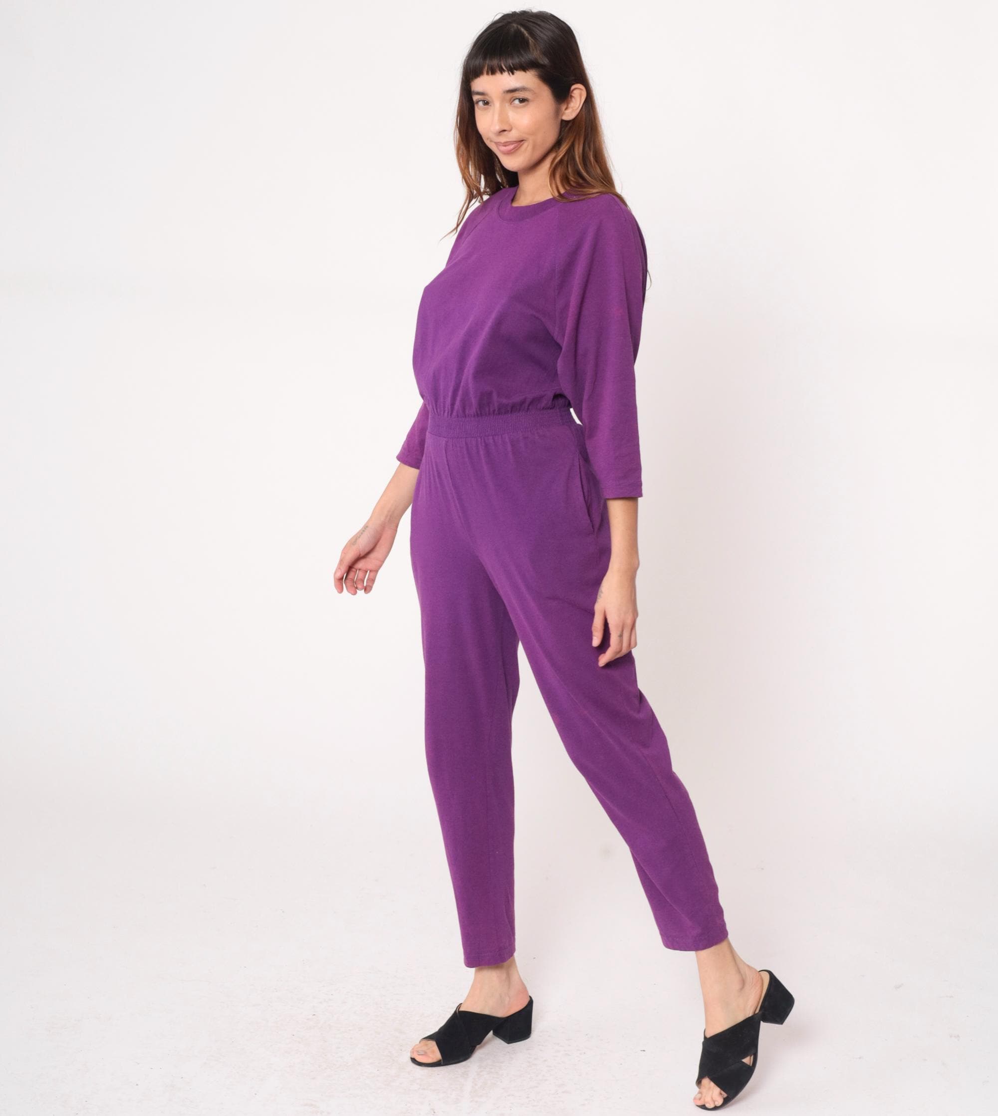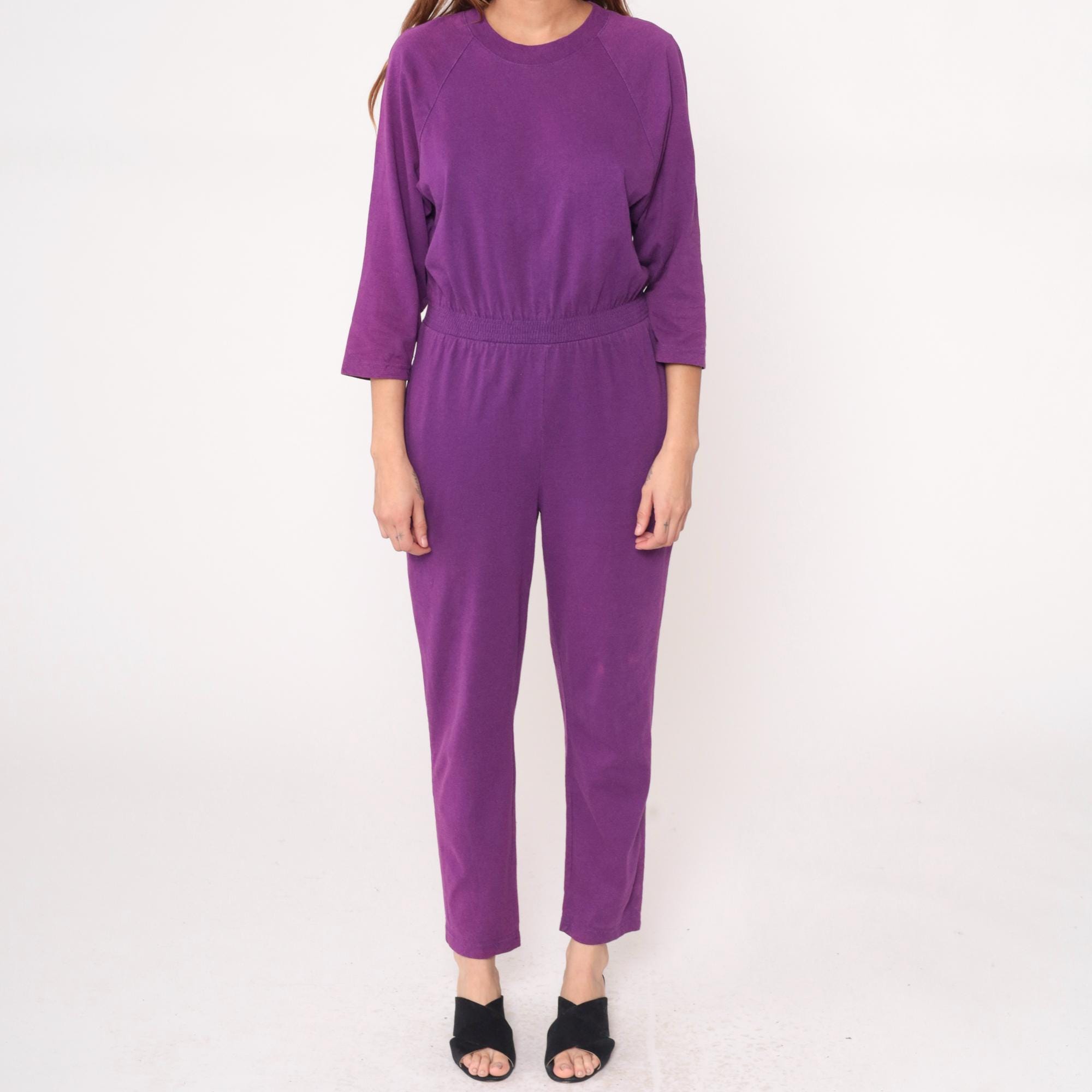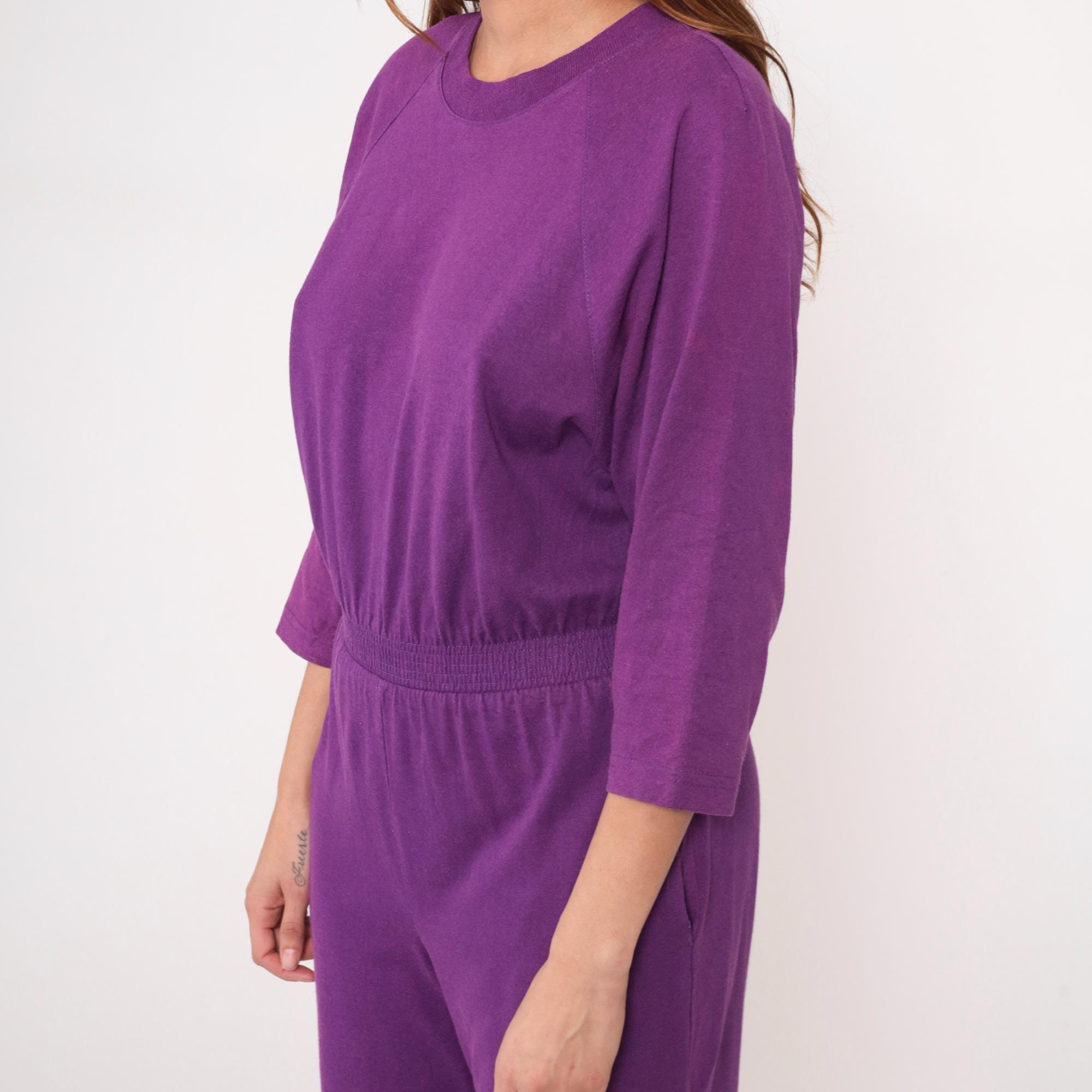 90s purple matching set with crew neck sweatshirt and tapered ankle pants. Raglan sleeves with ribbed cuffs, ribbed crew neckline, elastic waistband.
