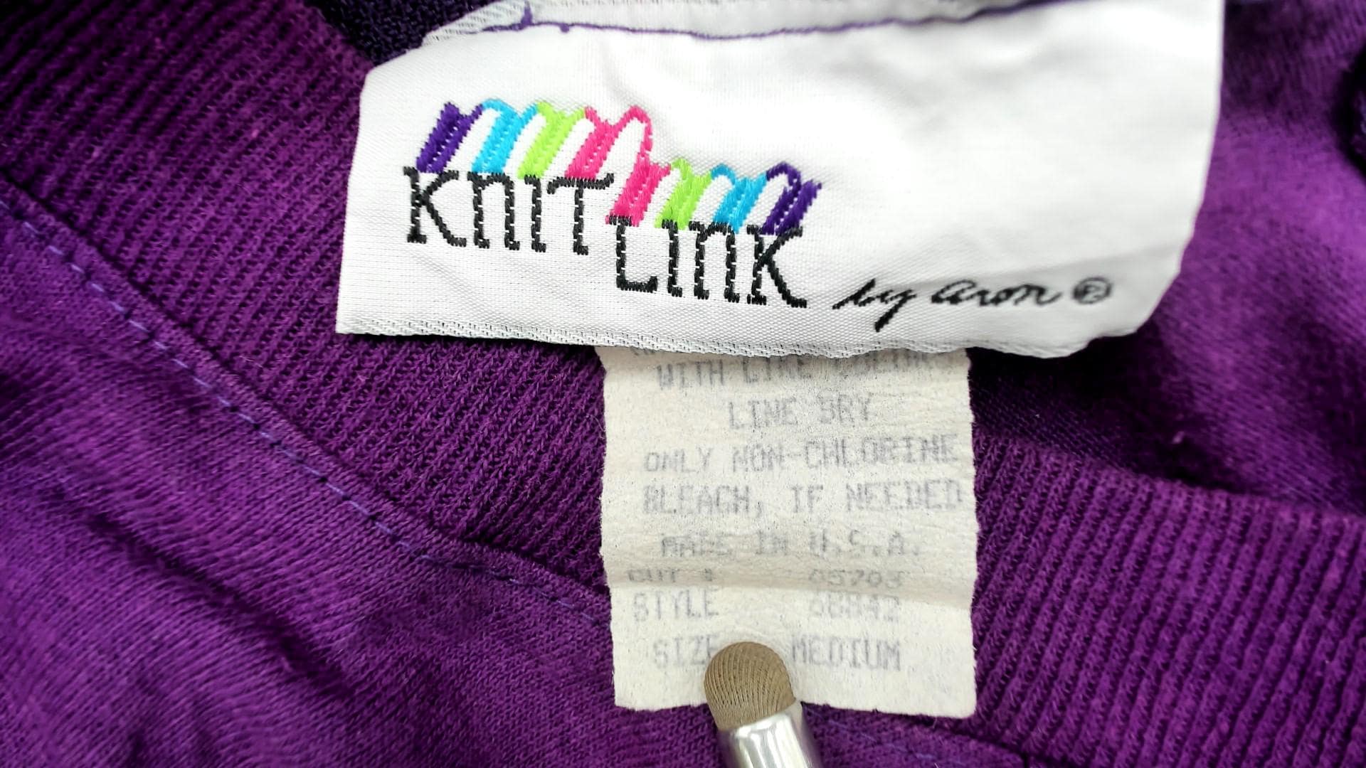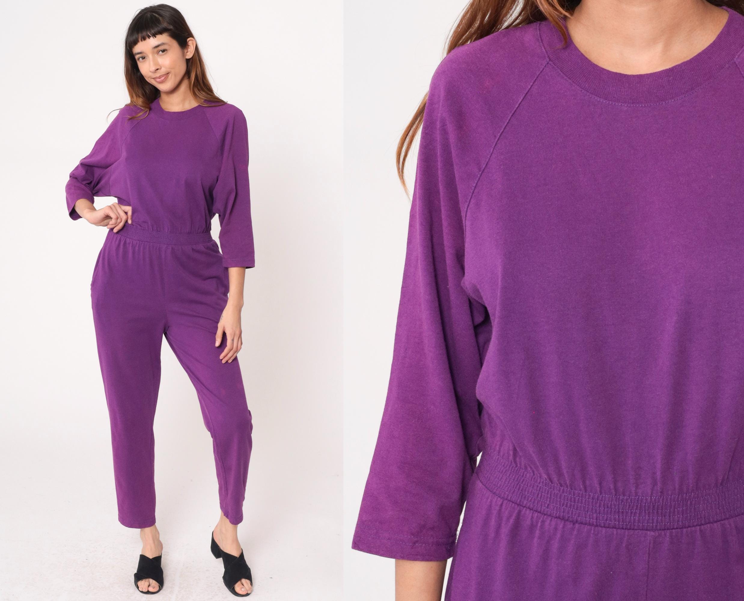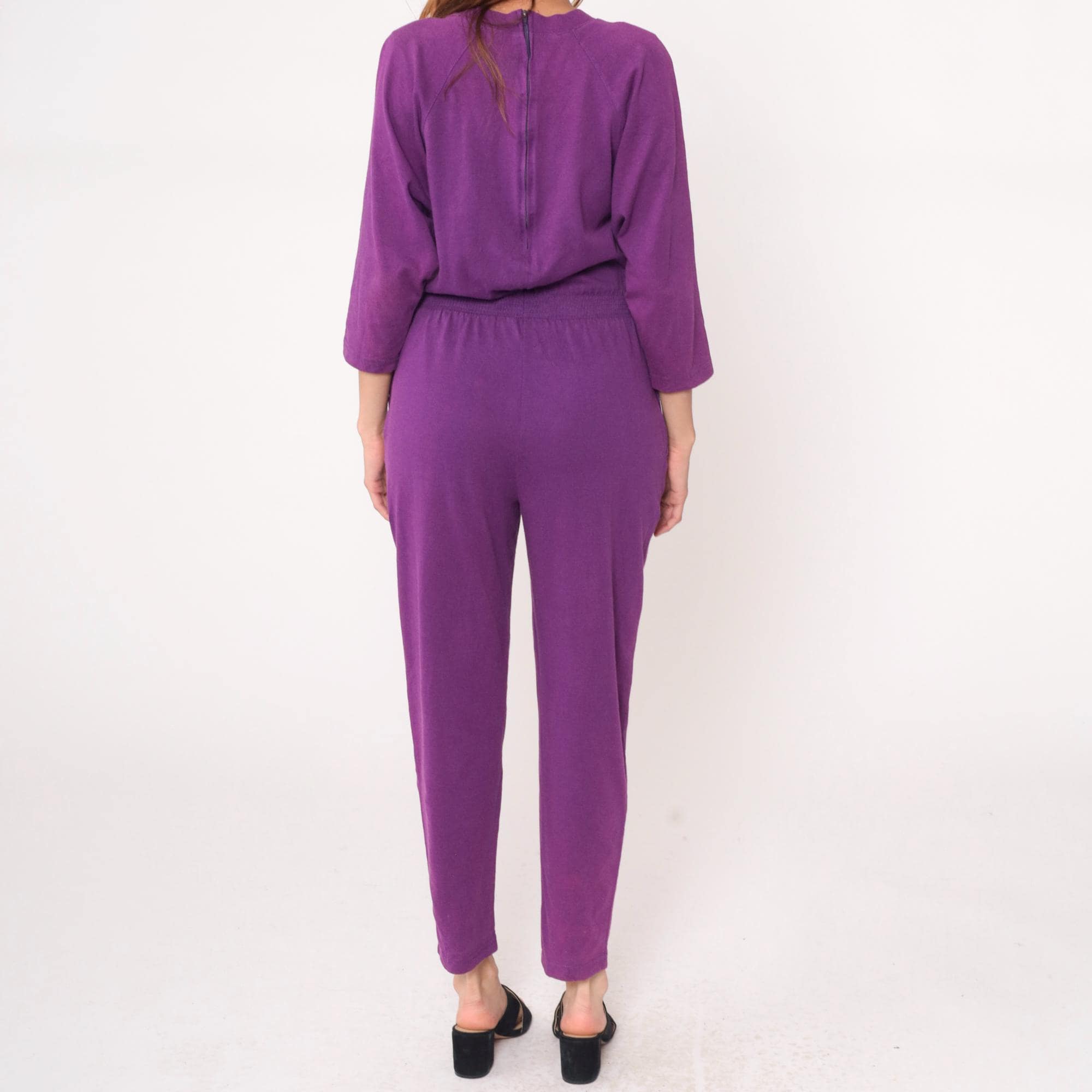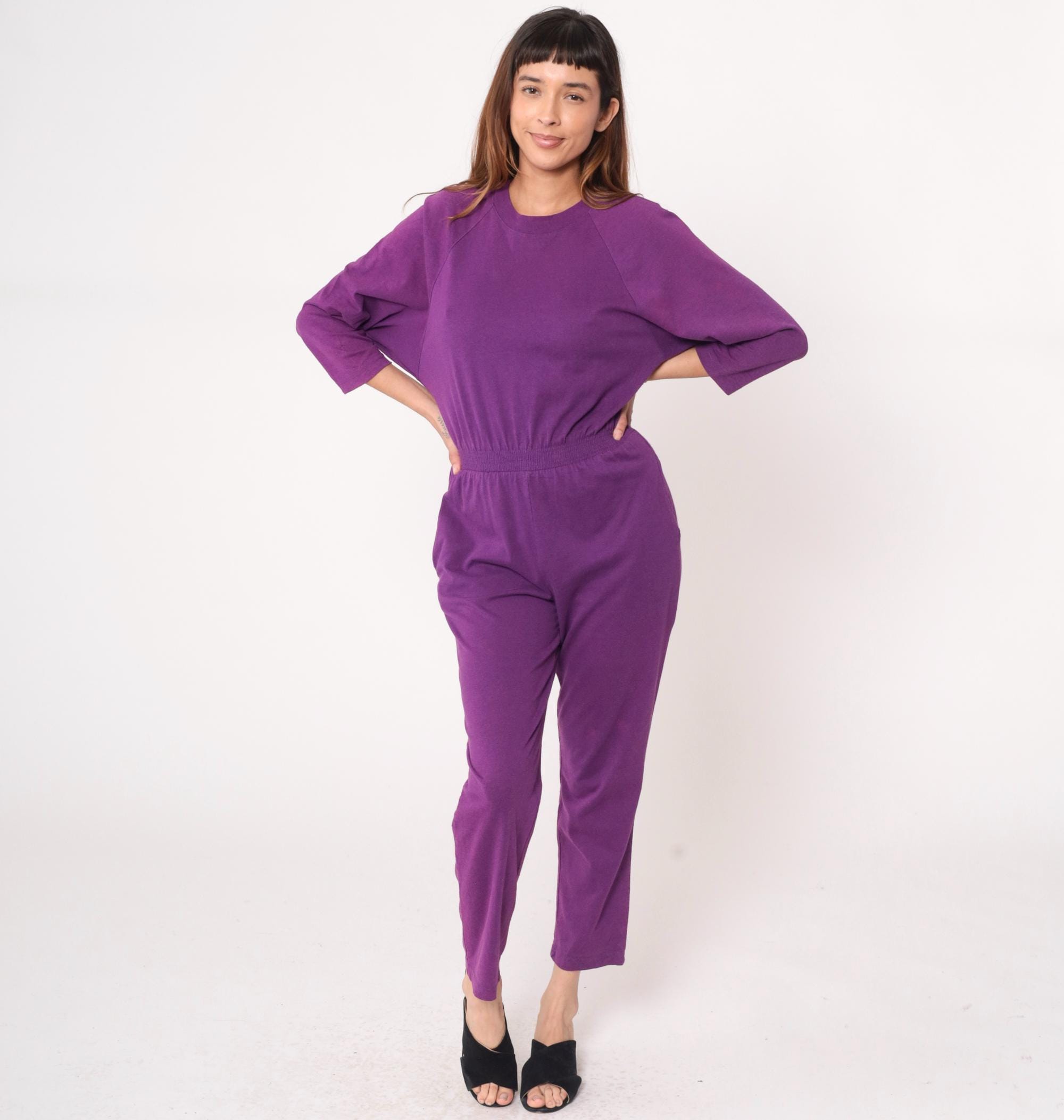90s purple matching set with crew neck sweatshirt and tapered ankle pants. Raglan sleeves with ribbed cuffs, ribbed crew neckline, elastic waistband.