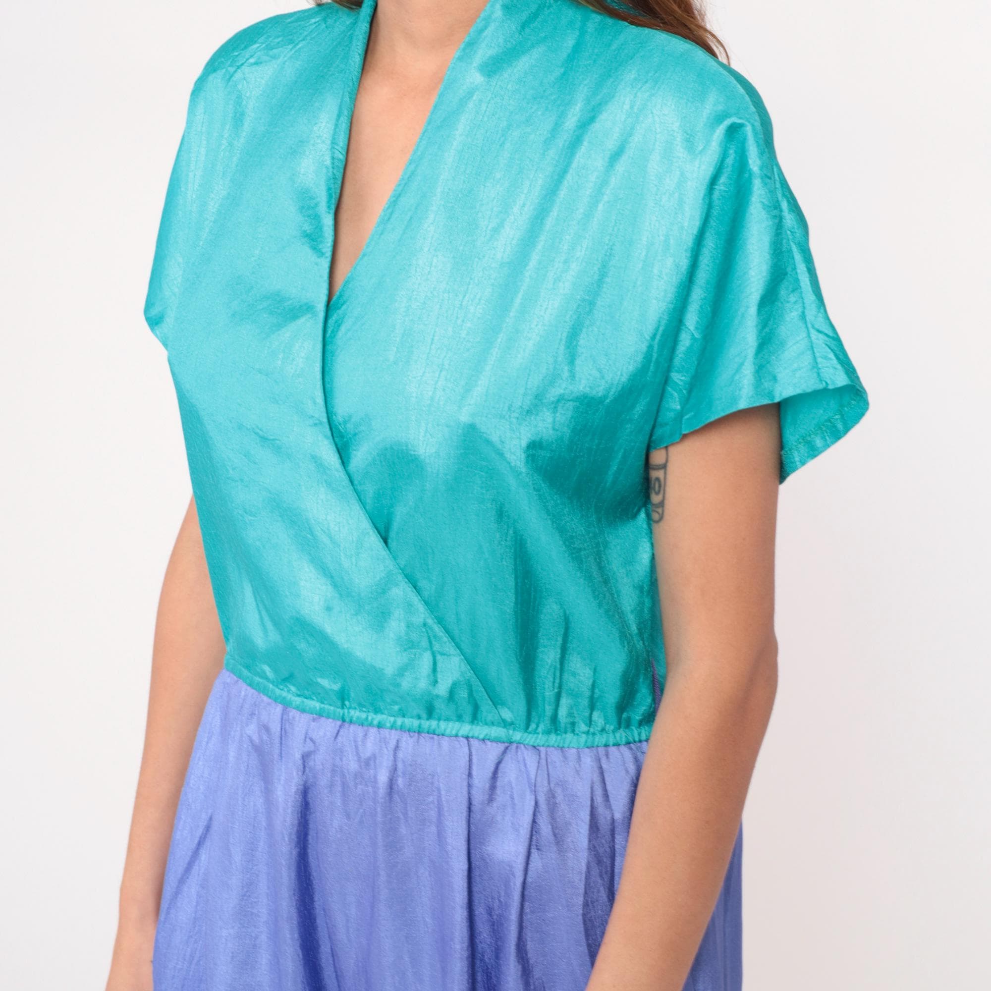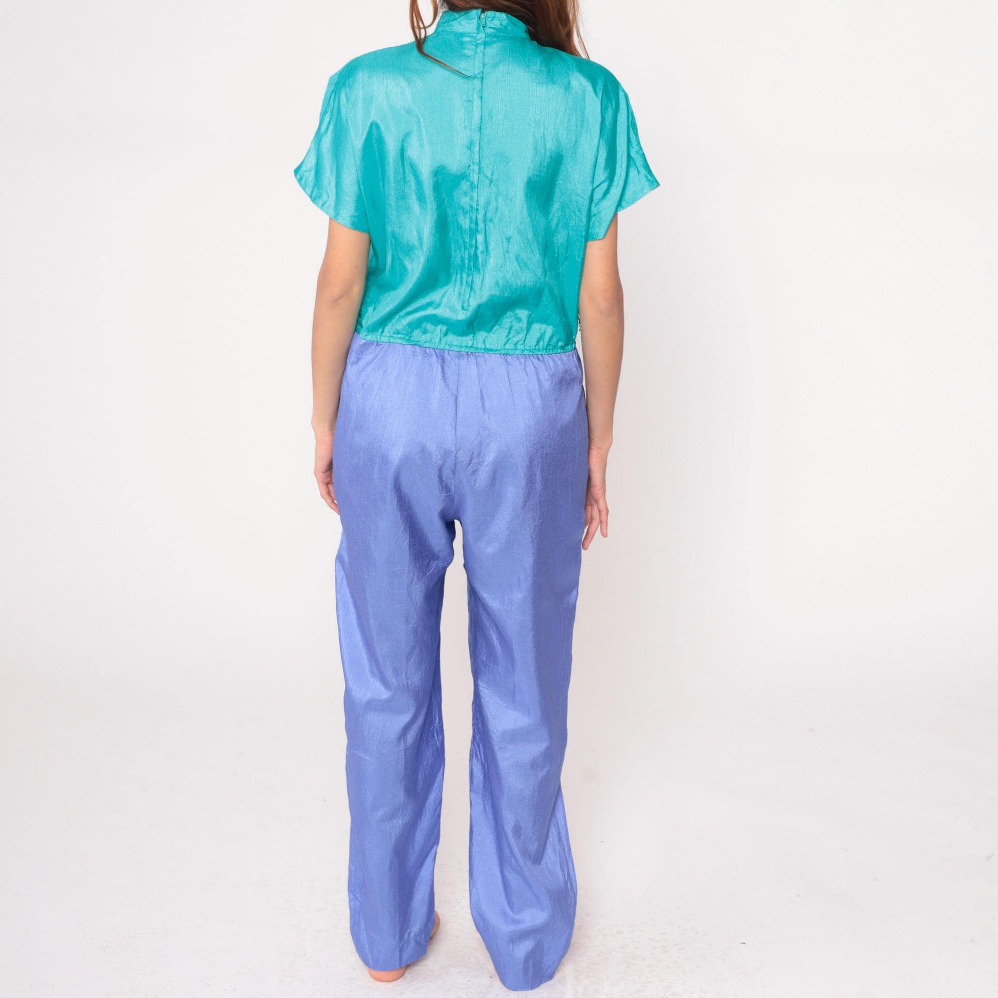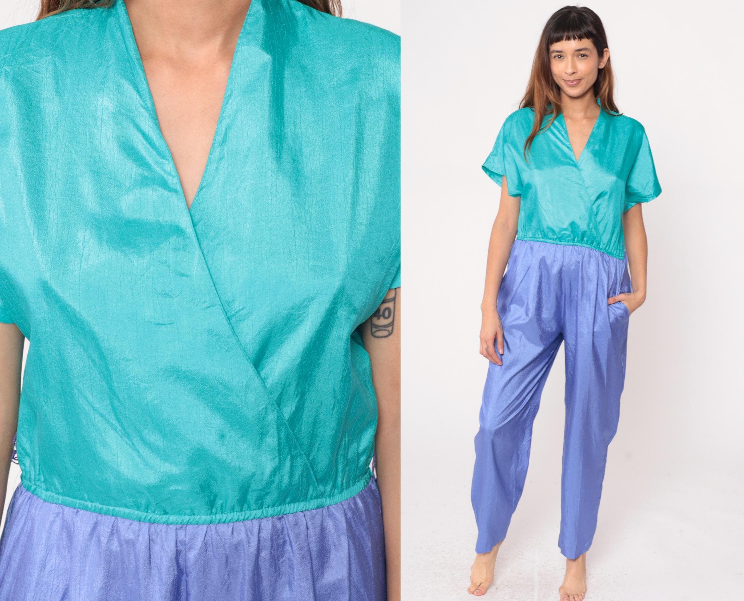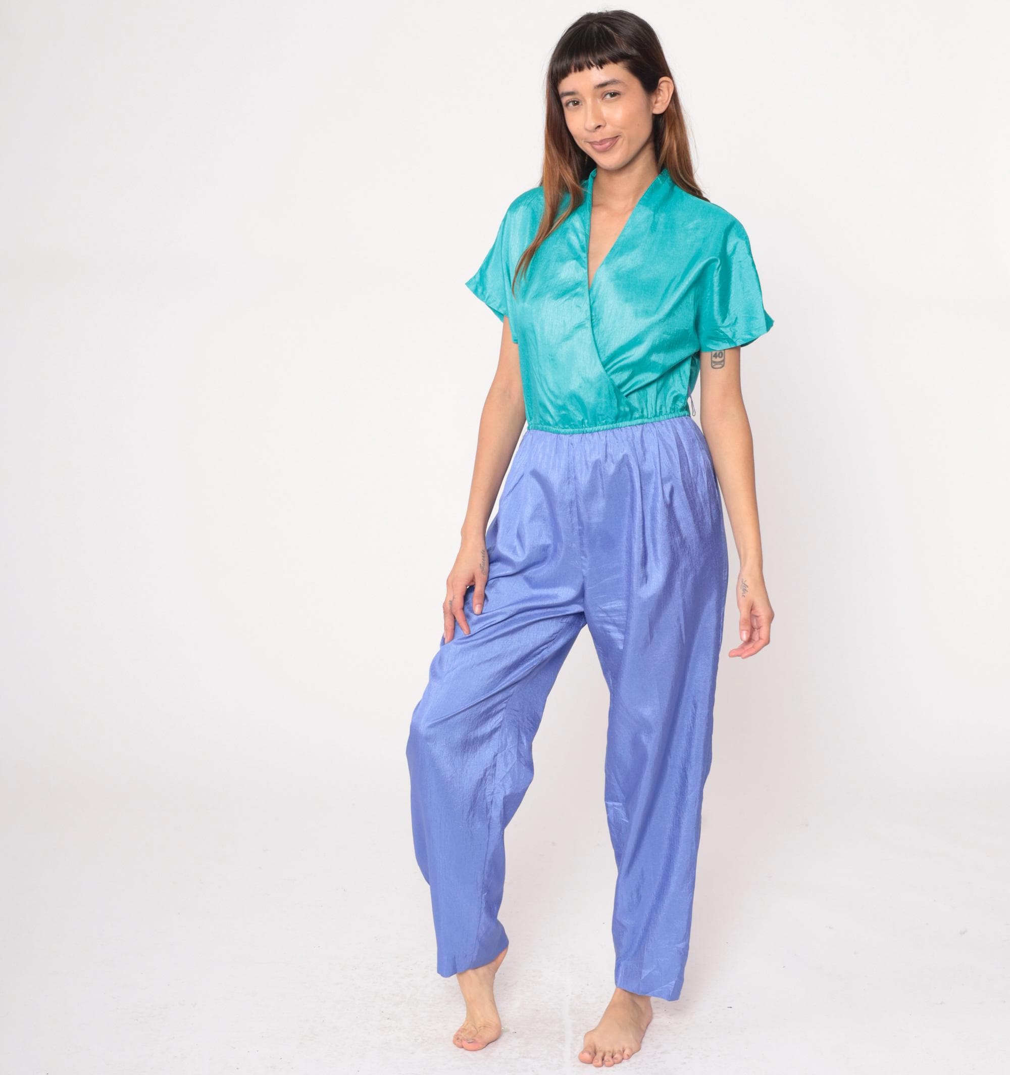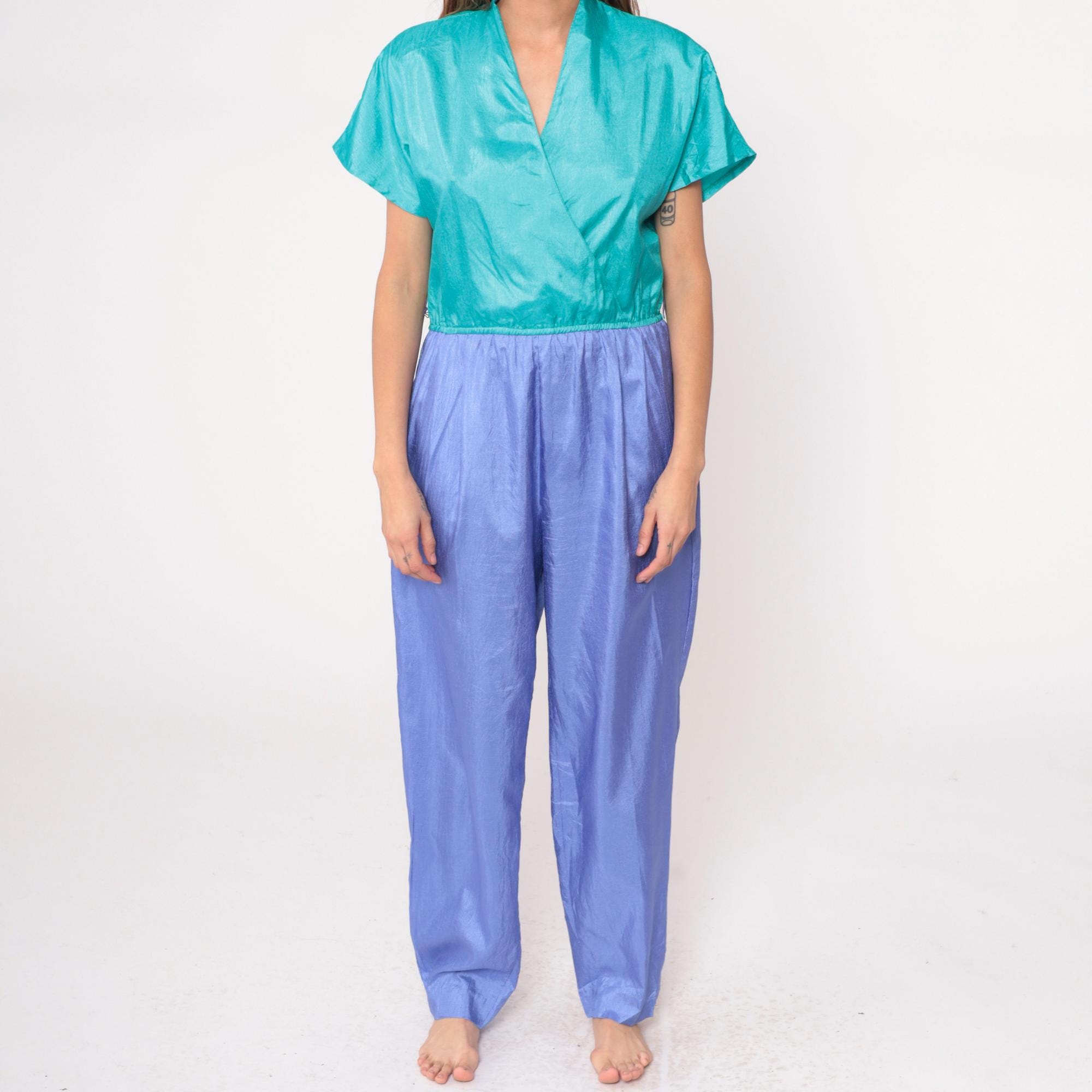90s color block jumpsuit from Joan Walters with teal surplice wrap front bodice and periwinkle purple pants. Short sleeves, elastic waist at color junction, tapered leg pants with elastic ankles.