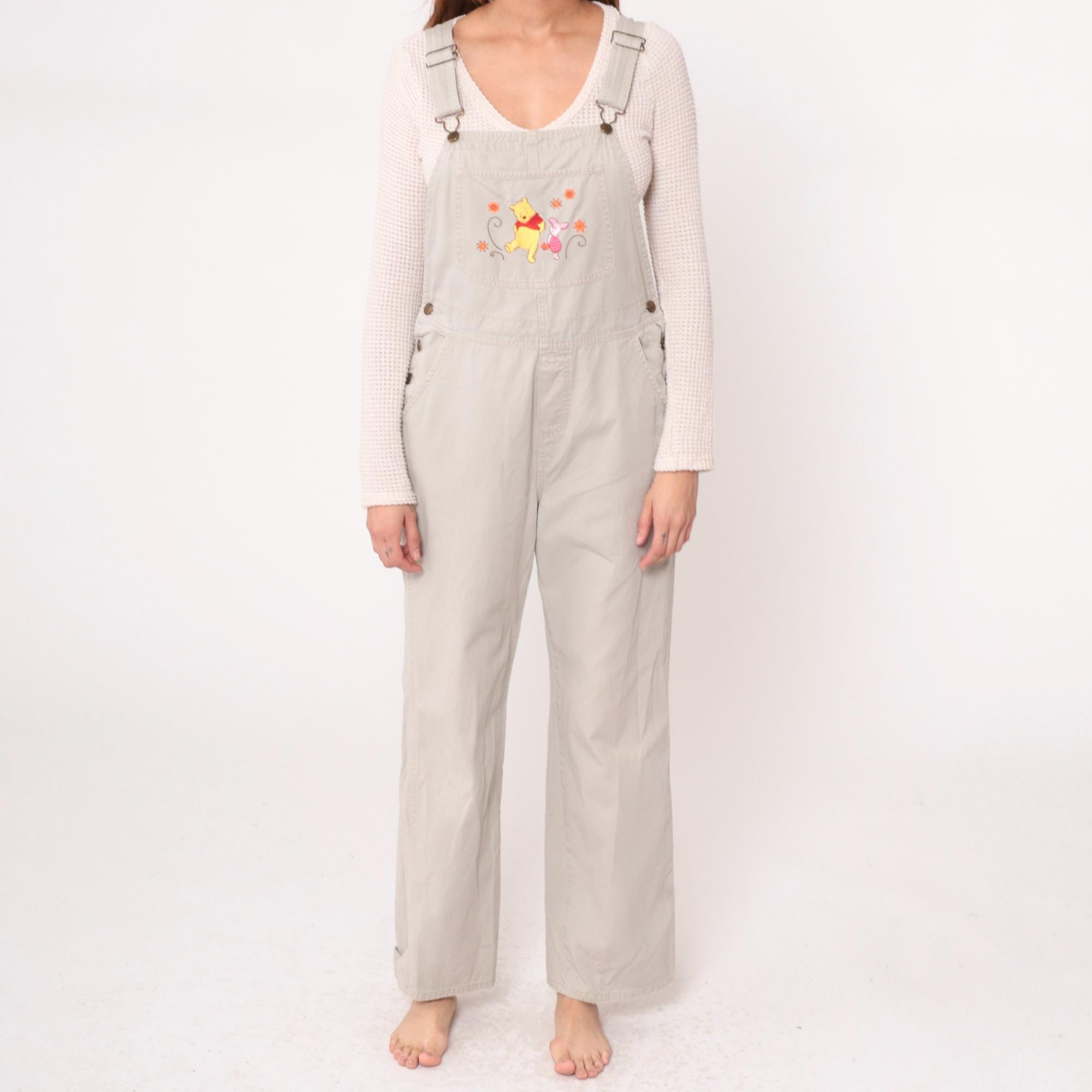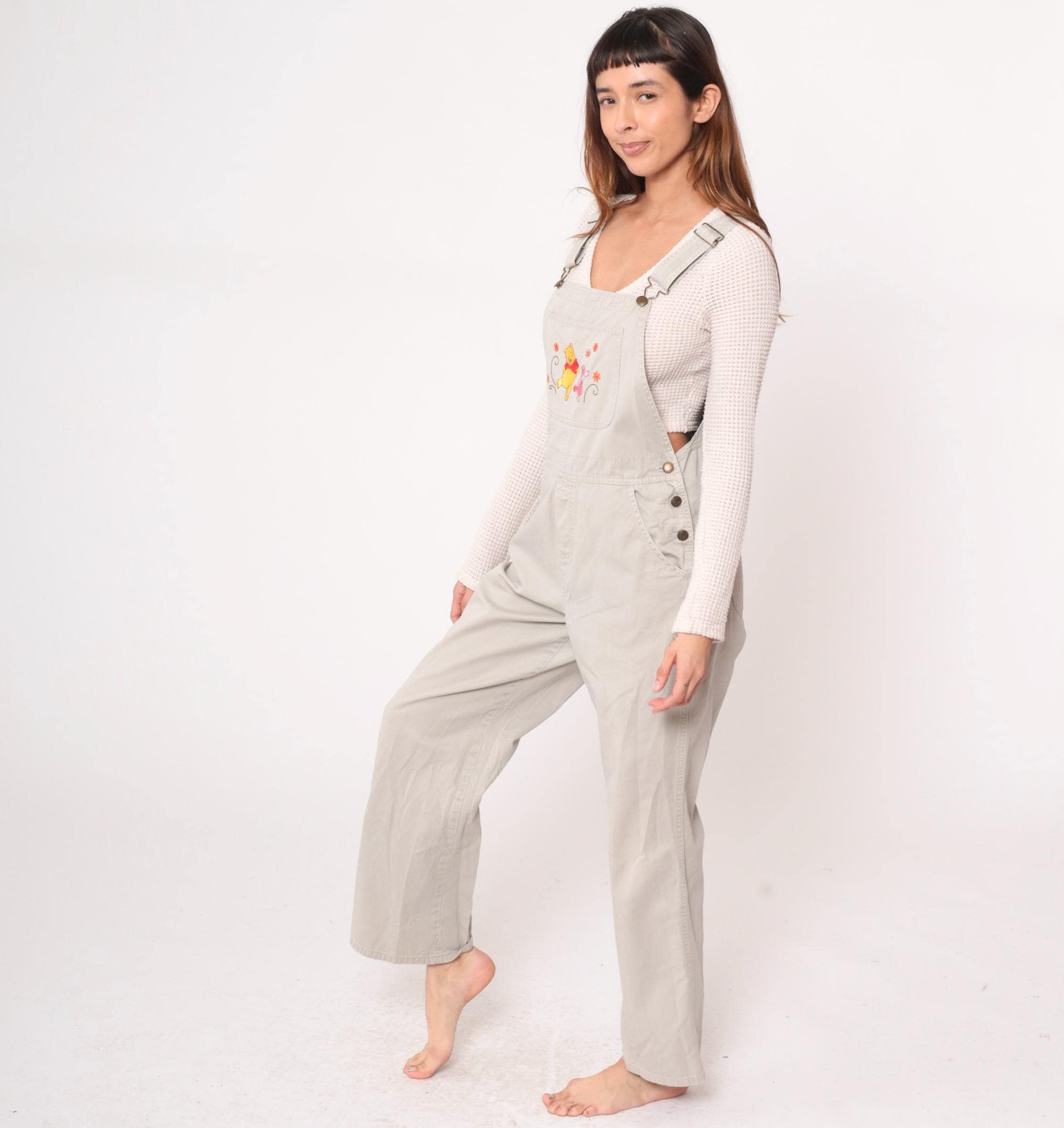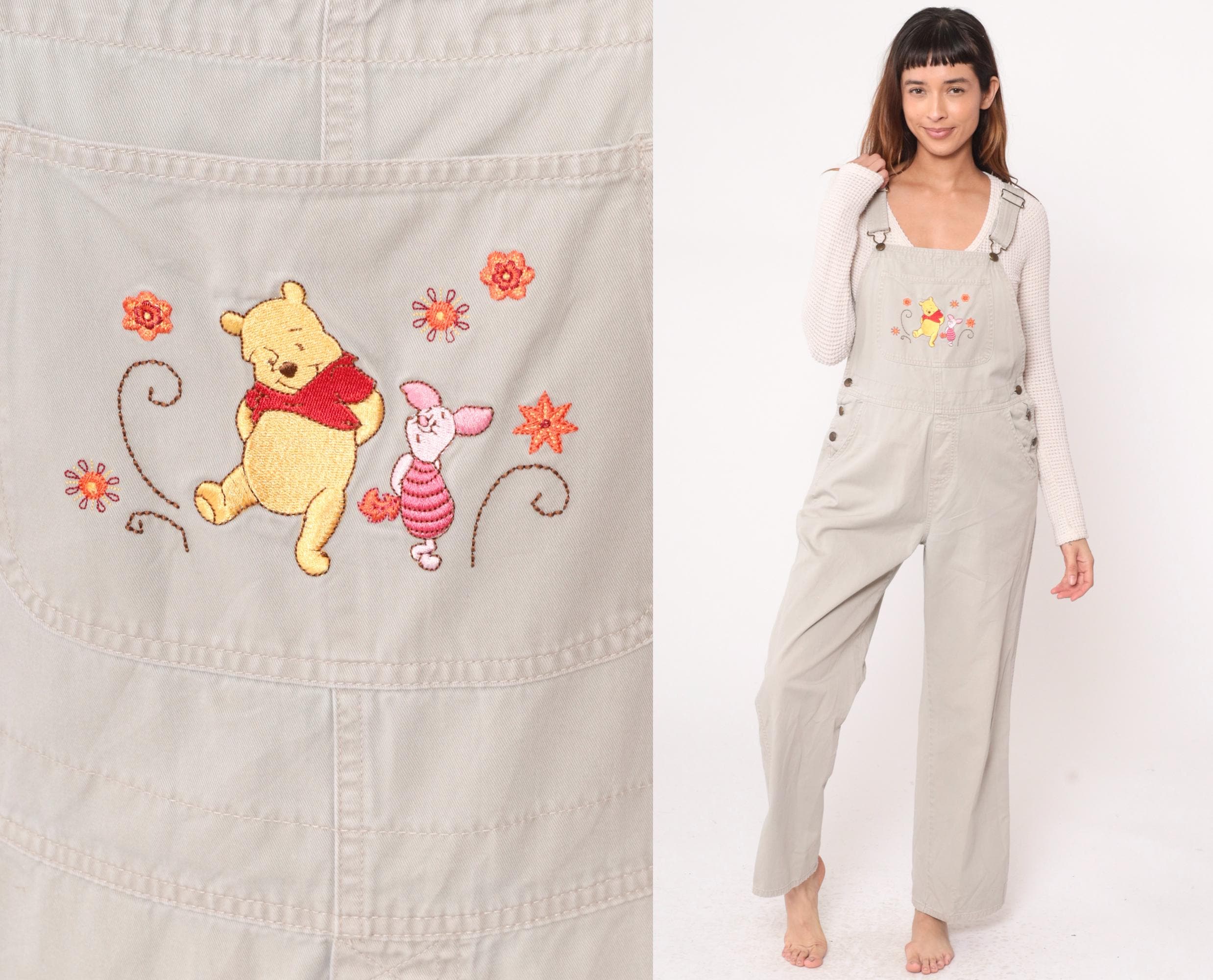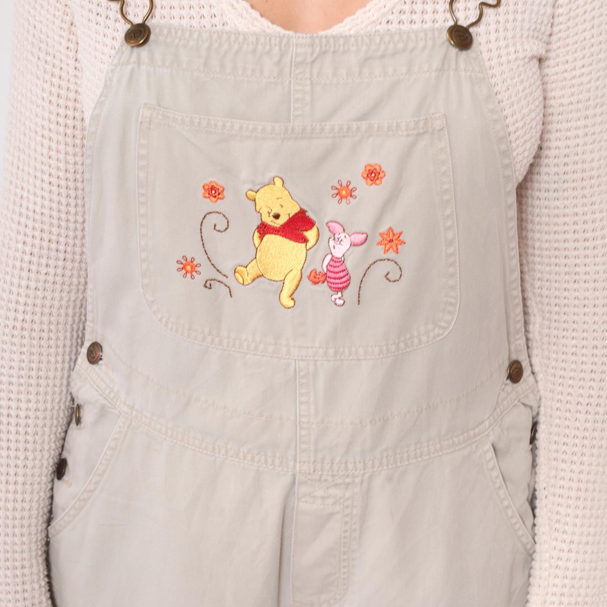 90s beige overalls with embroidered Winnie the Pooh and Piglet on chest surrounded by orange and coral floral embroidery, yellow and red "Pooh" oval patch on back. Adjustable straps with metal buckle closures, side button waist closures, front pockets, straight leg.