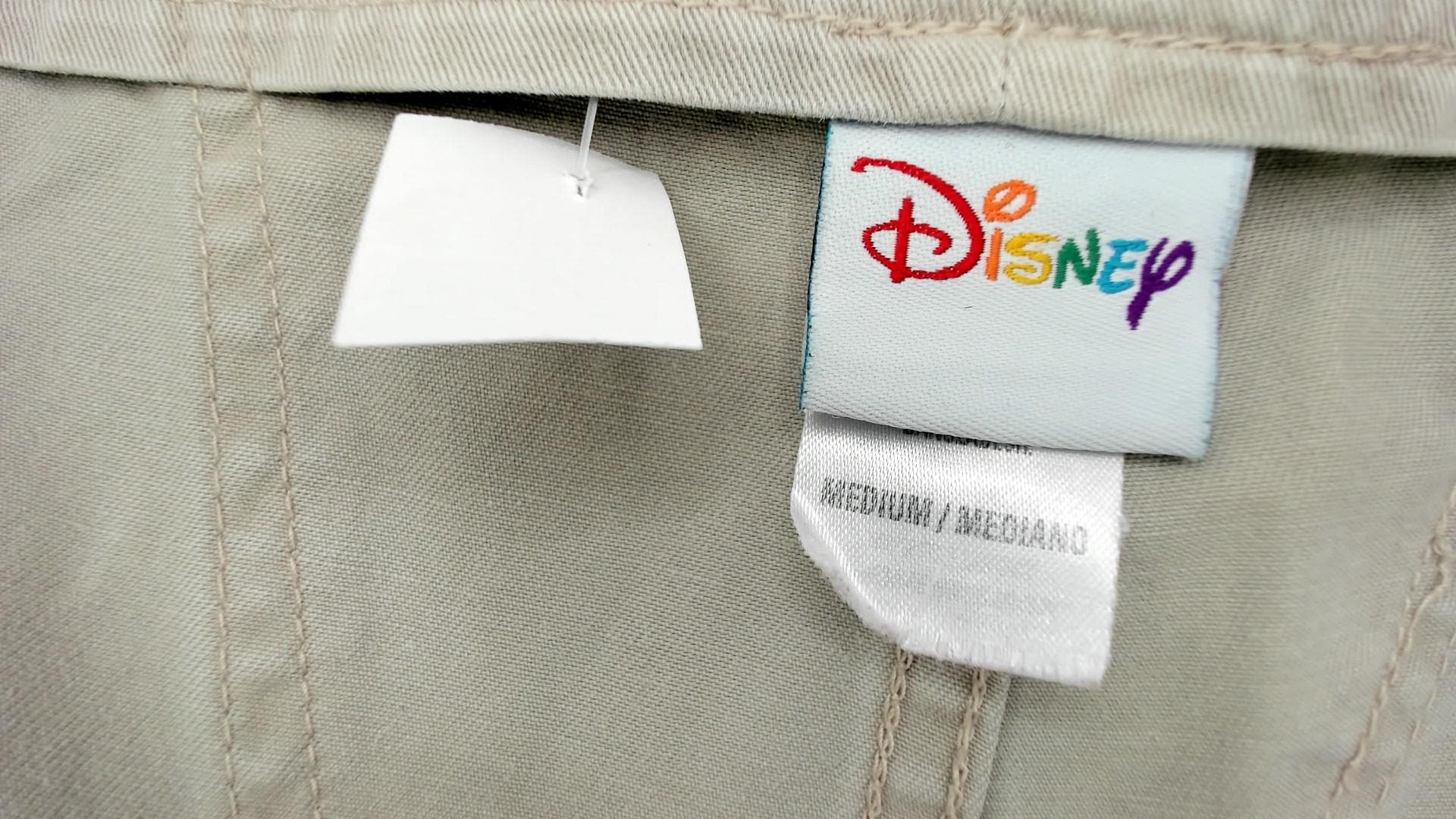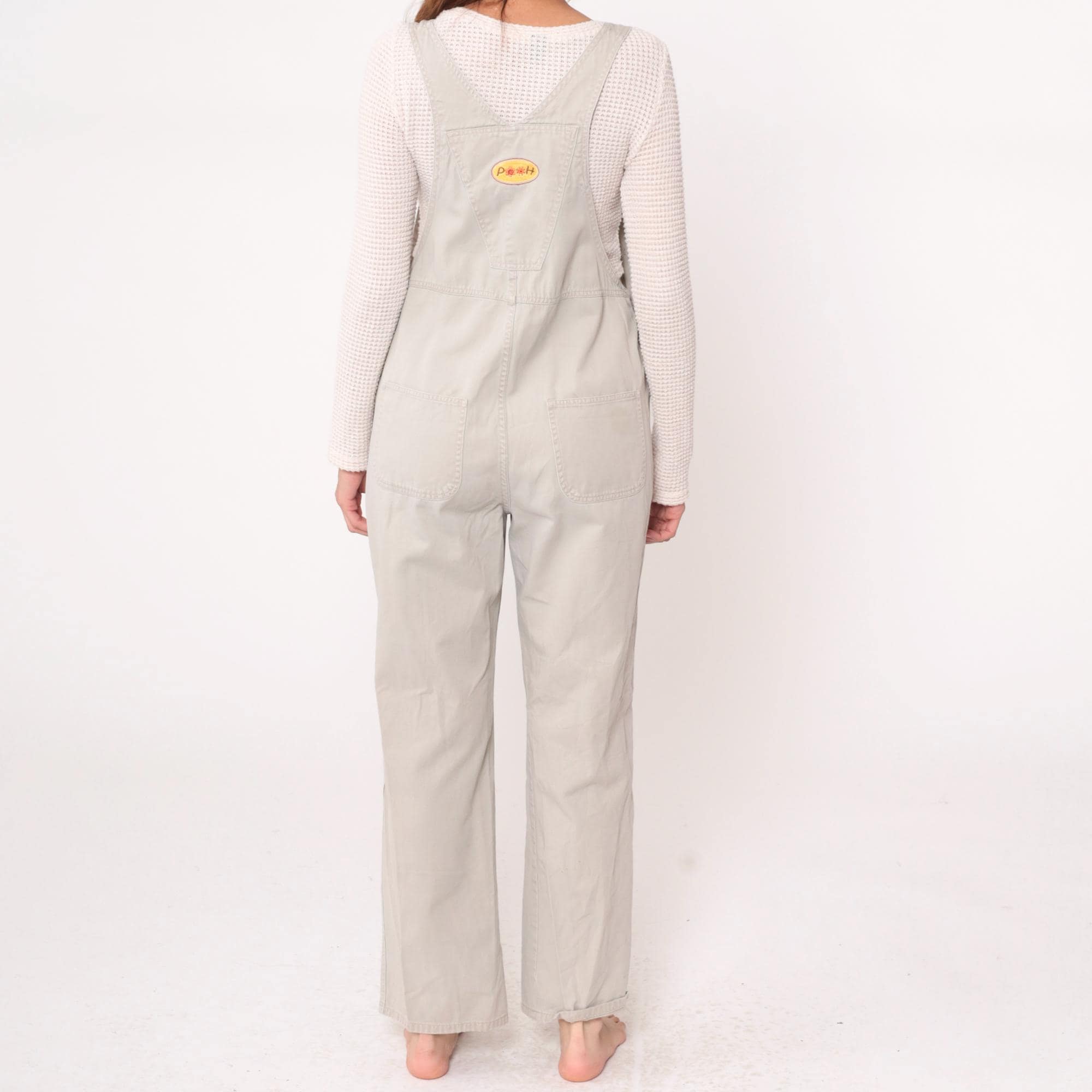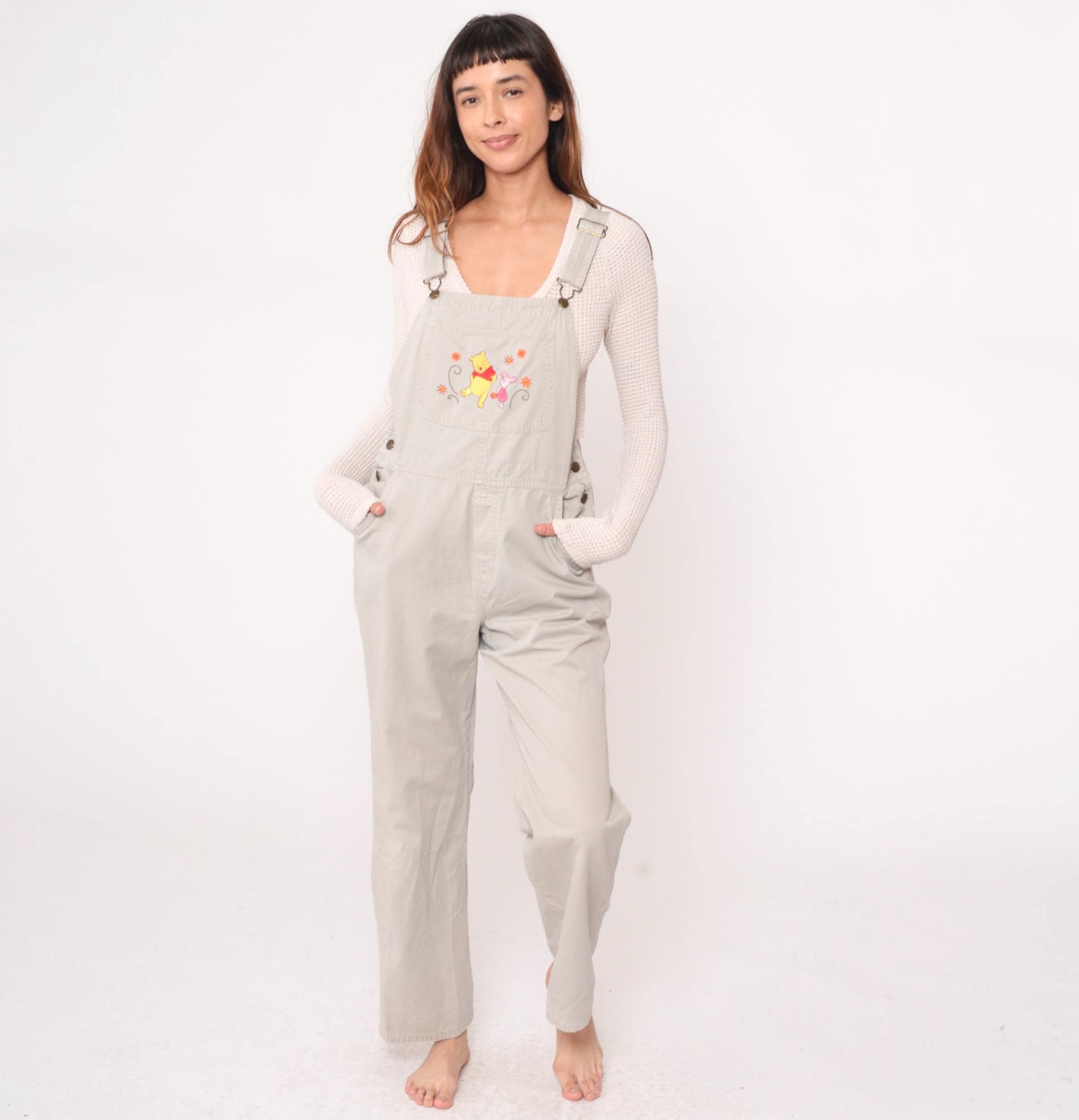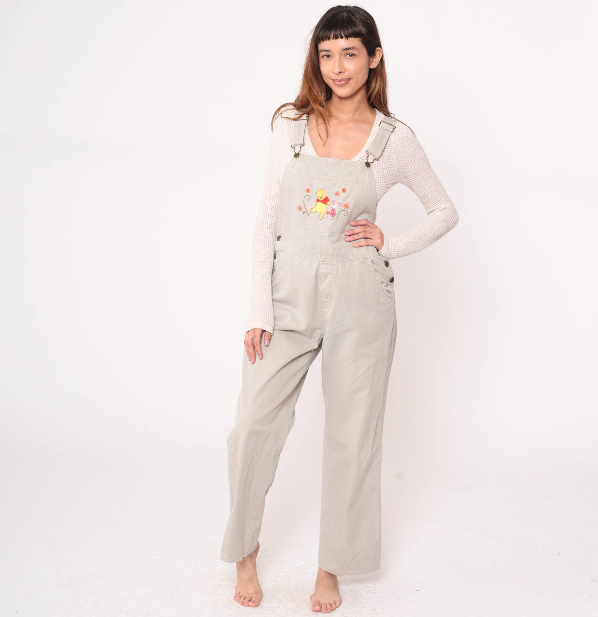 90s beige overalls with embroidered Winnie the Pooh and Piglet on chest surrounded by orange and coral floral embroidery, yellow and red "Pooh" oval patch on back. Adjustable straps with metal buckle closures, side button waist closures, front pockets, straight leg.