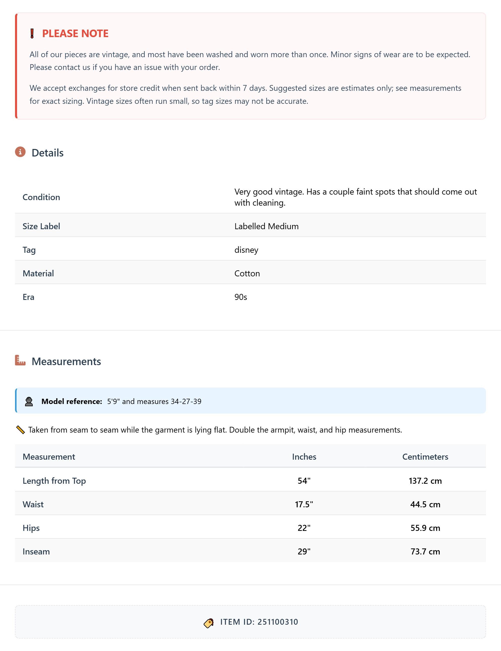 All of our pieces are vintage, and most have been washed and worn more than once. Minor signs of wear are to be expected. Please contact us if you have an issue with your order. We accept exchanges for store credit when sent back within 7 days.