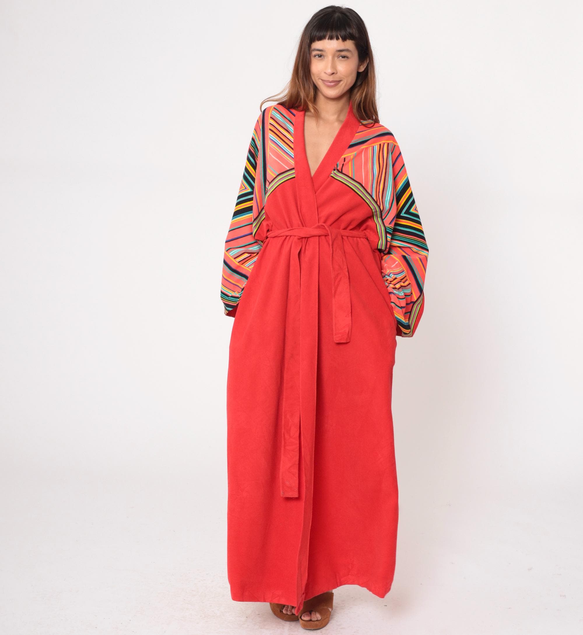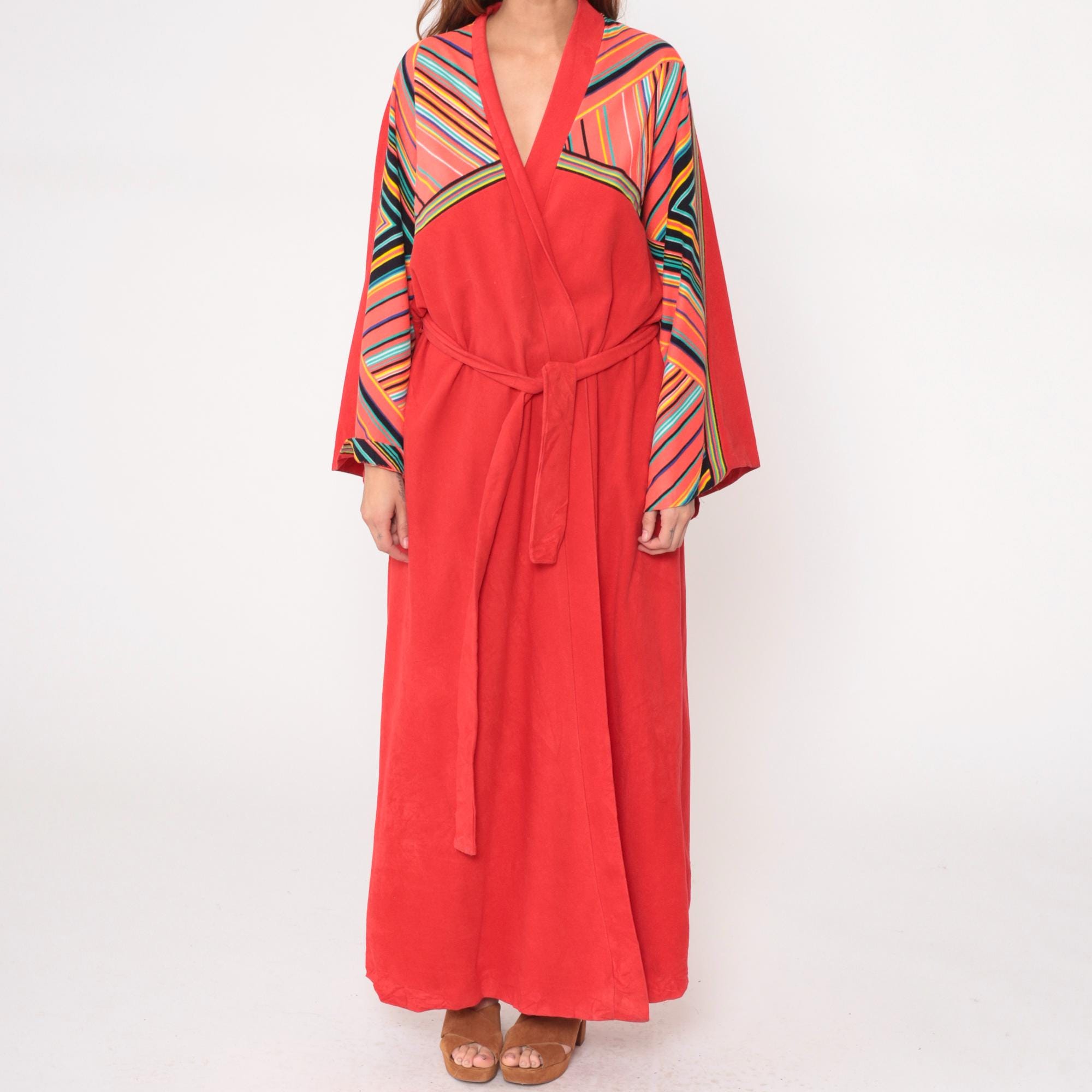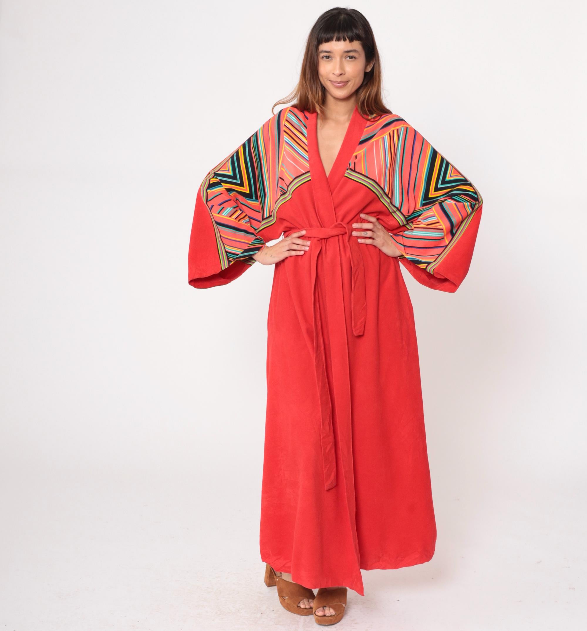 70s coral red maxi robe from Vanity Fair with multicolor diagonal striped sleeves and shoulder yoke in orange, yellow, blue, pink, green, and black stripes. Kimono wrap style with shawl collar, long sleeves, matching tie belt at waist.