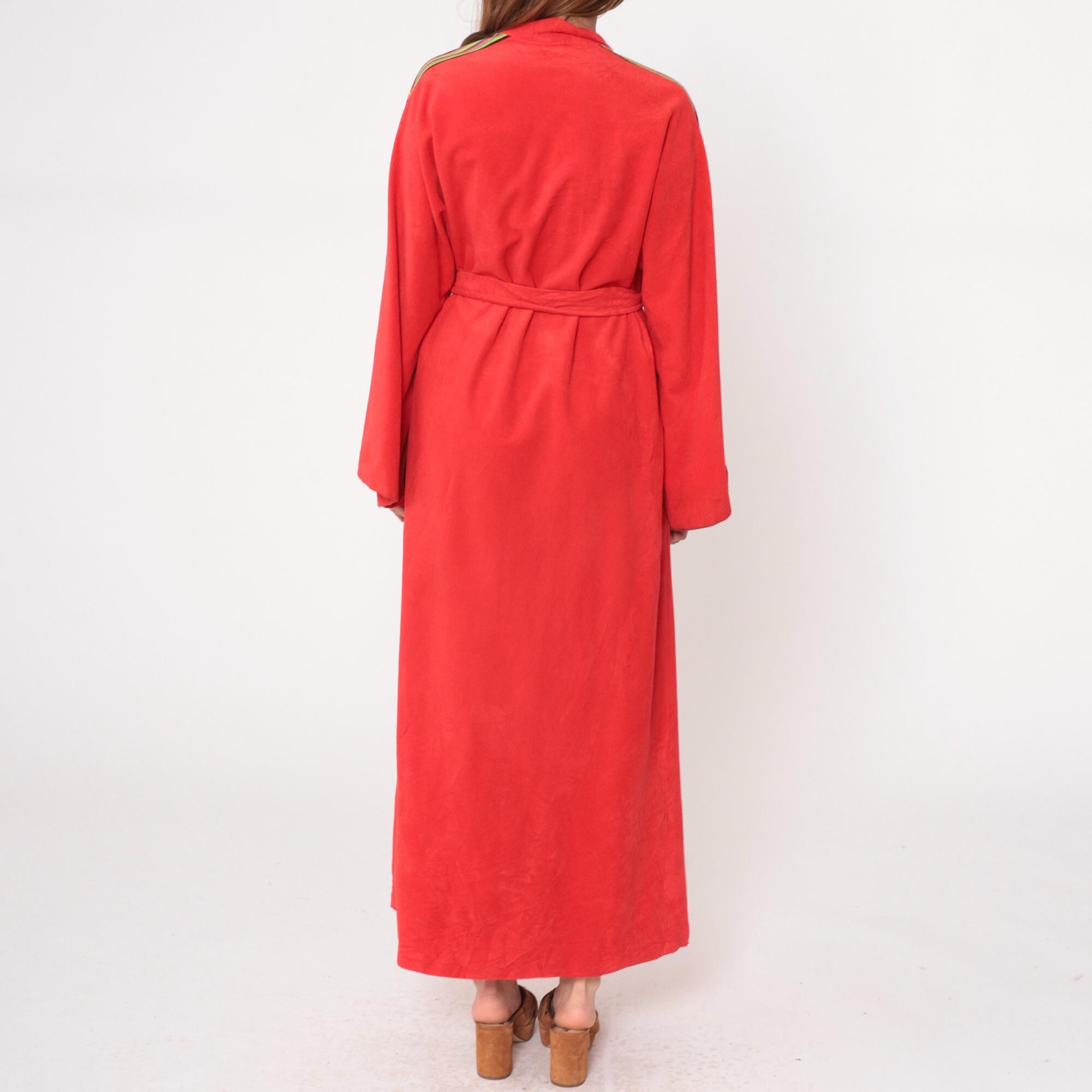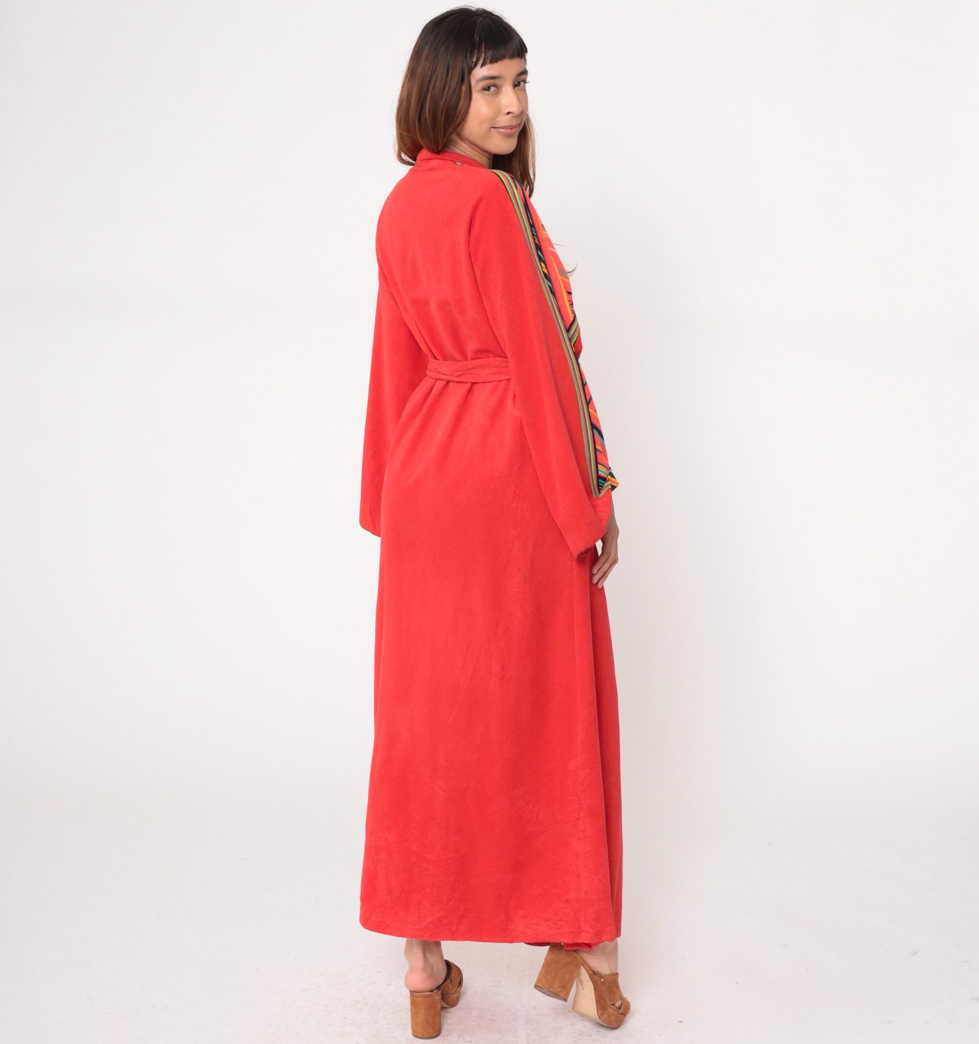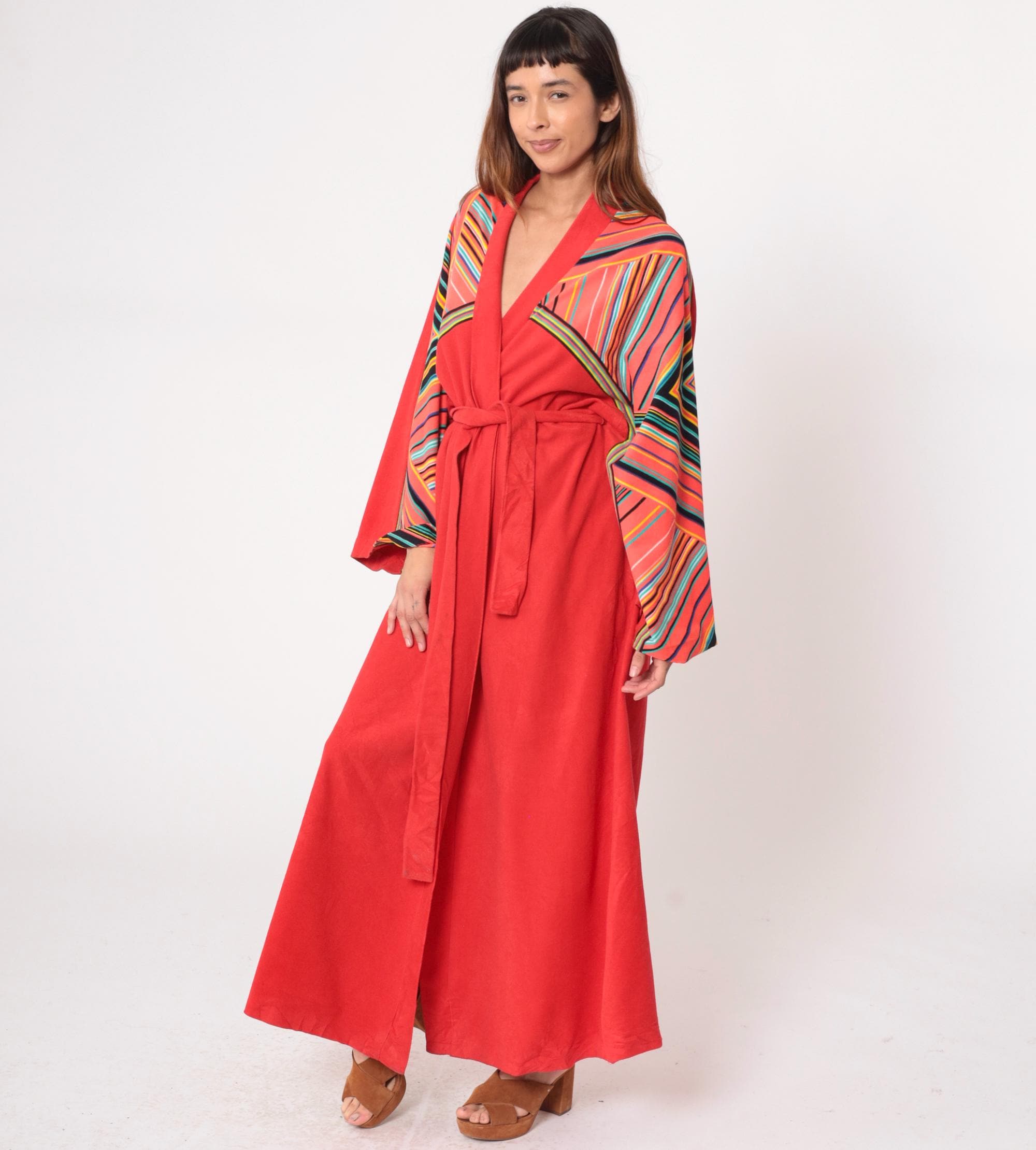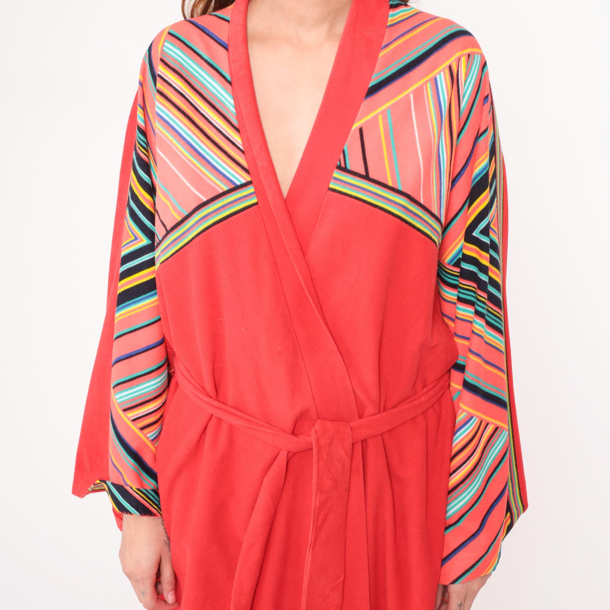 70s coral red maxi robe from Vanity Fair with multicolor diagonal striped sleeves and shoulder yoke in orange, yellow, blue, pink, green, and black stripes. Kimono wrap style with shawl collar, long sleeves, matching tie belt at waist.