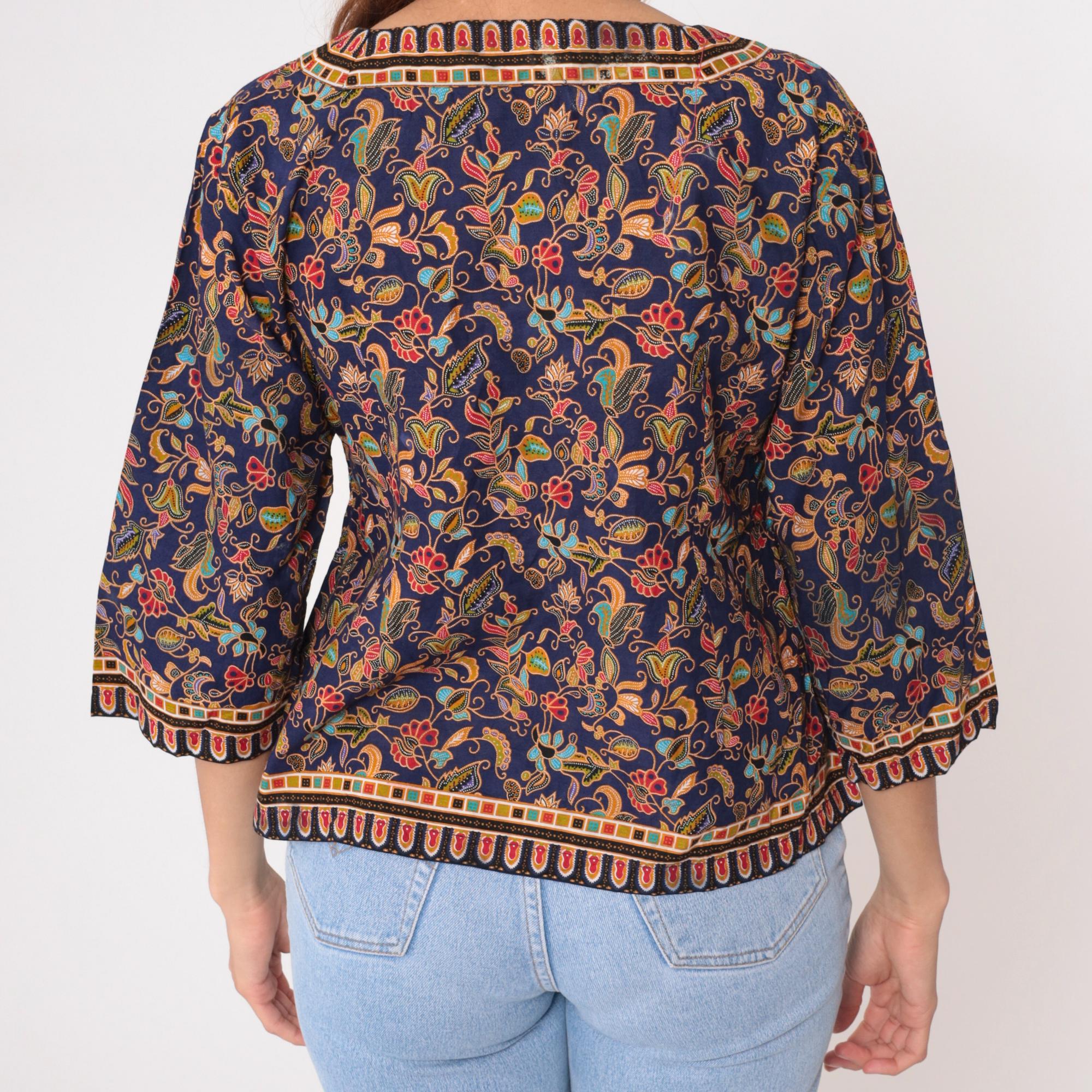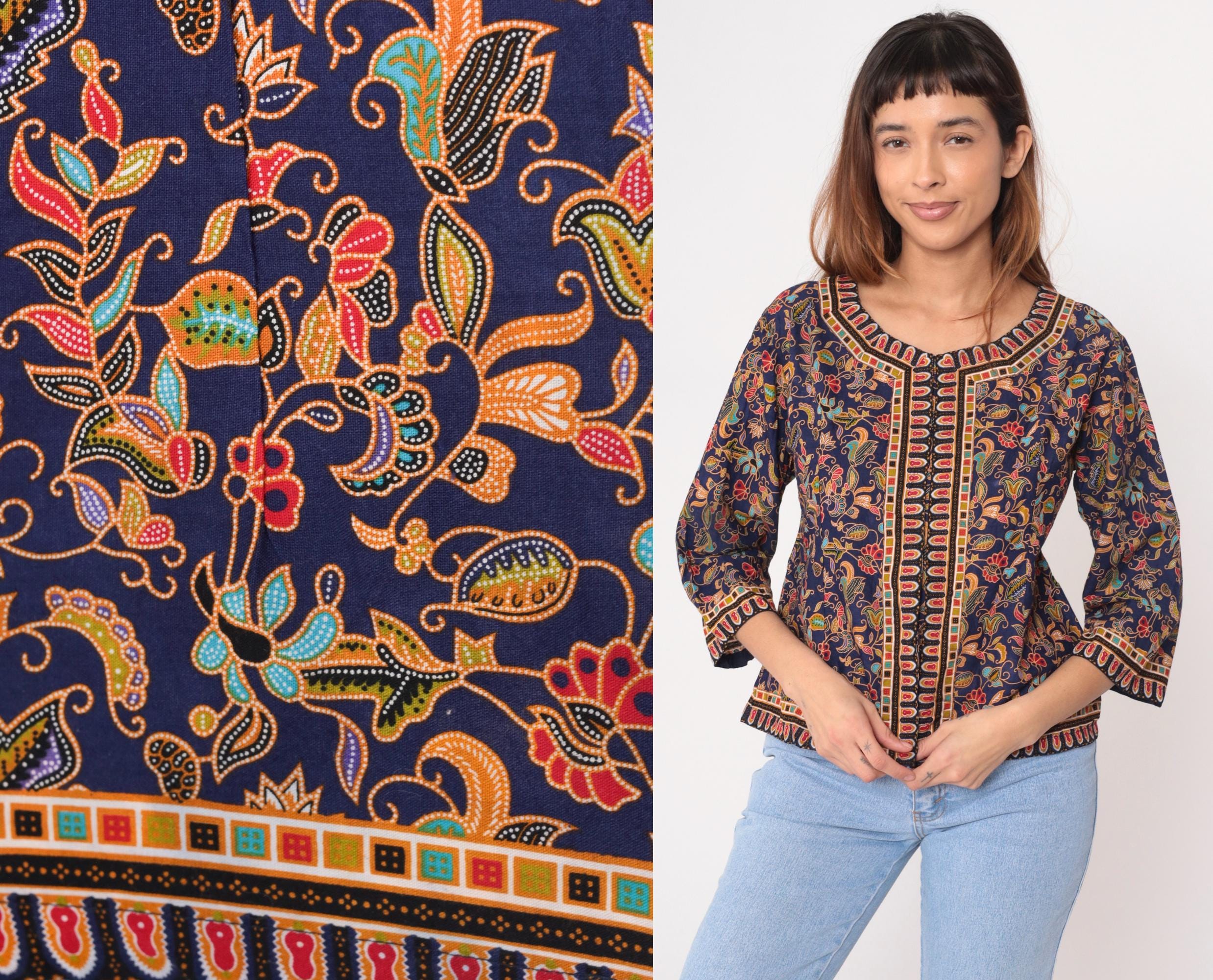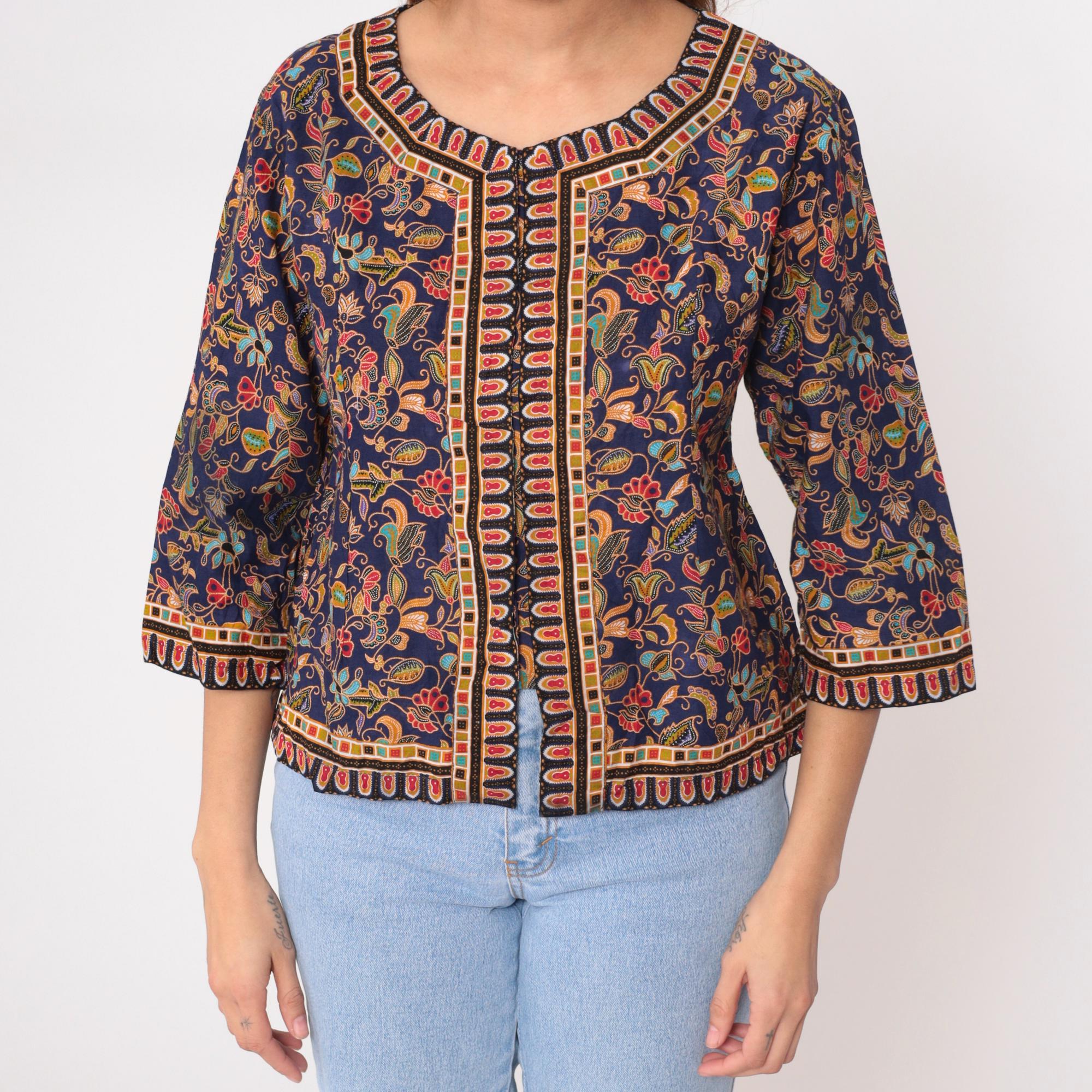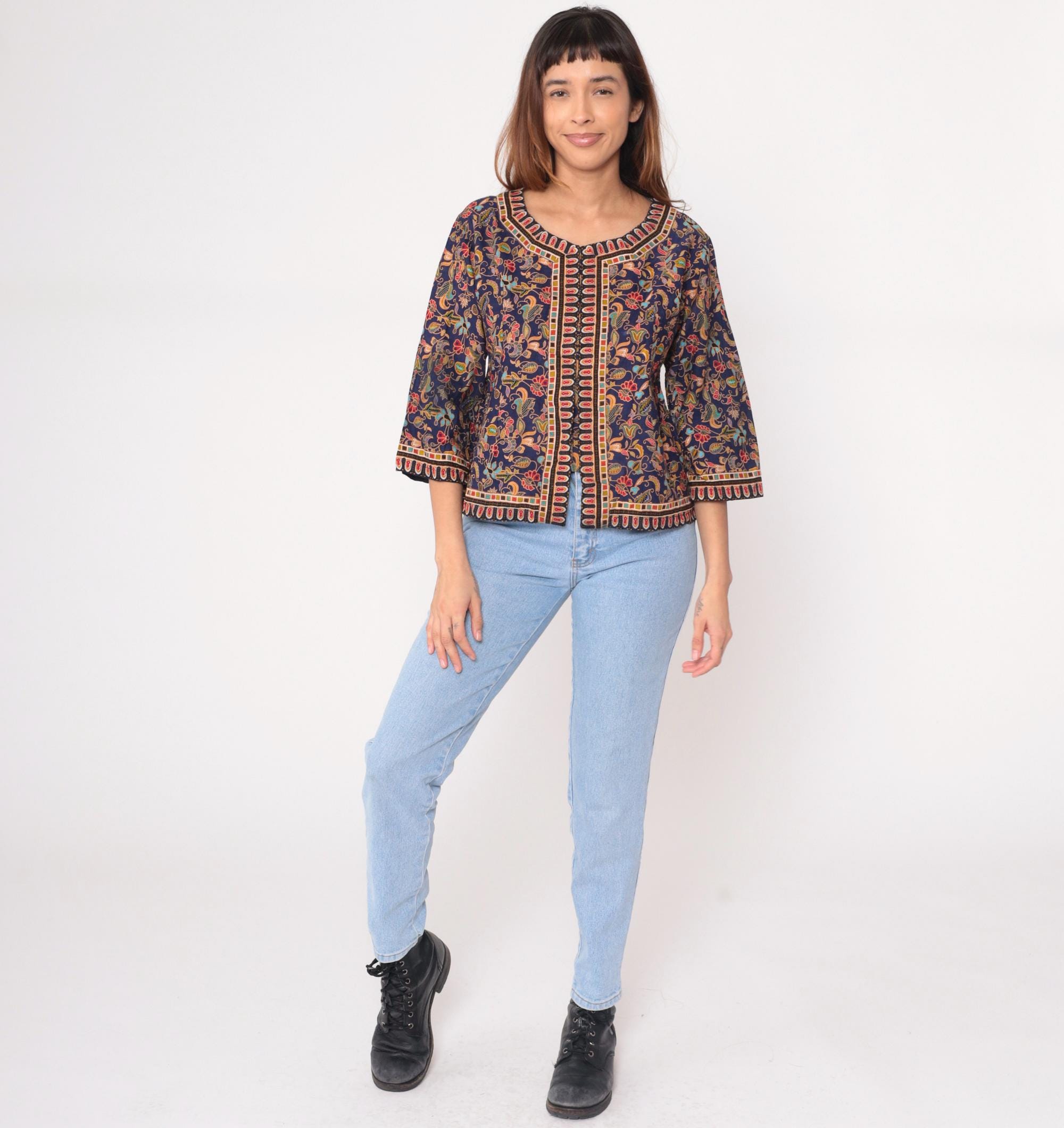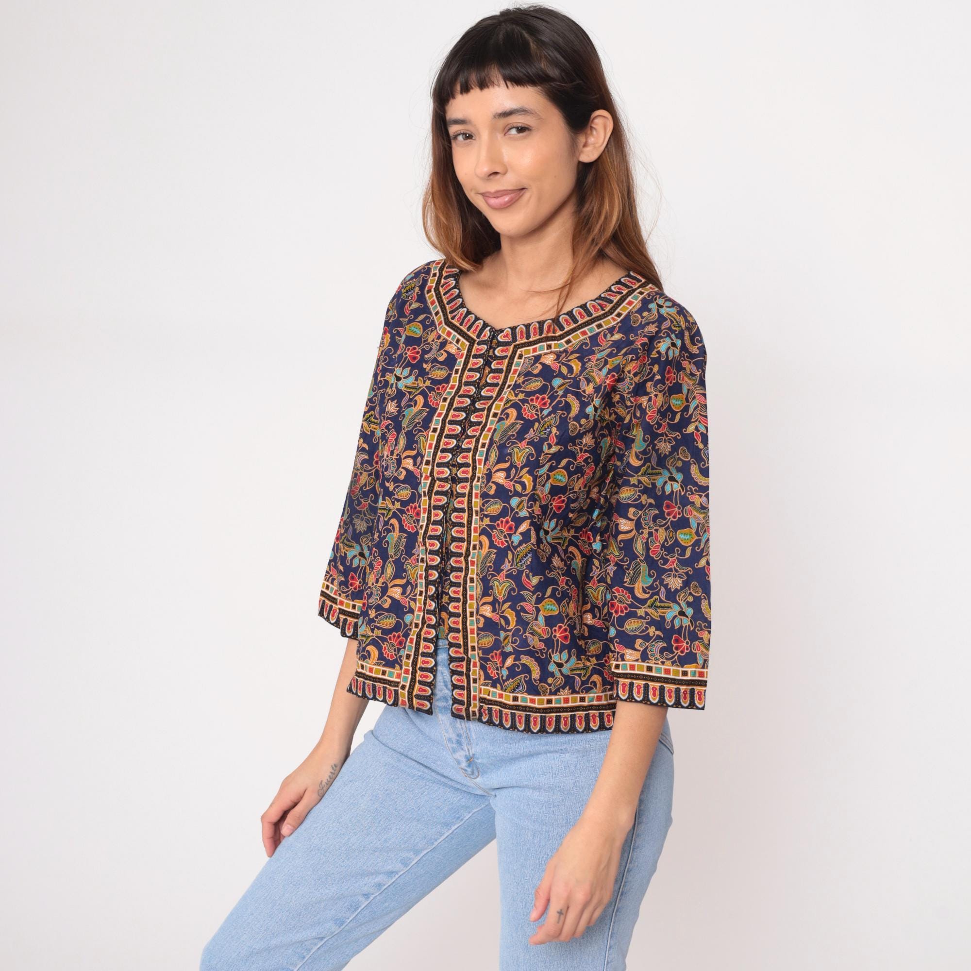 Y2K navy blue jacket with all-over floral paisley print in orange, yellow, red, turquoise, and coral. Geometric border trim with scalloped red oval shapes along round neckline, center front, sleeves, and hem. Open front style with 3/4 length sleeves and hip length.