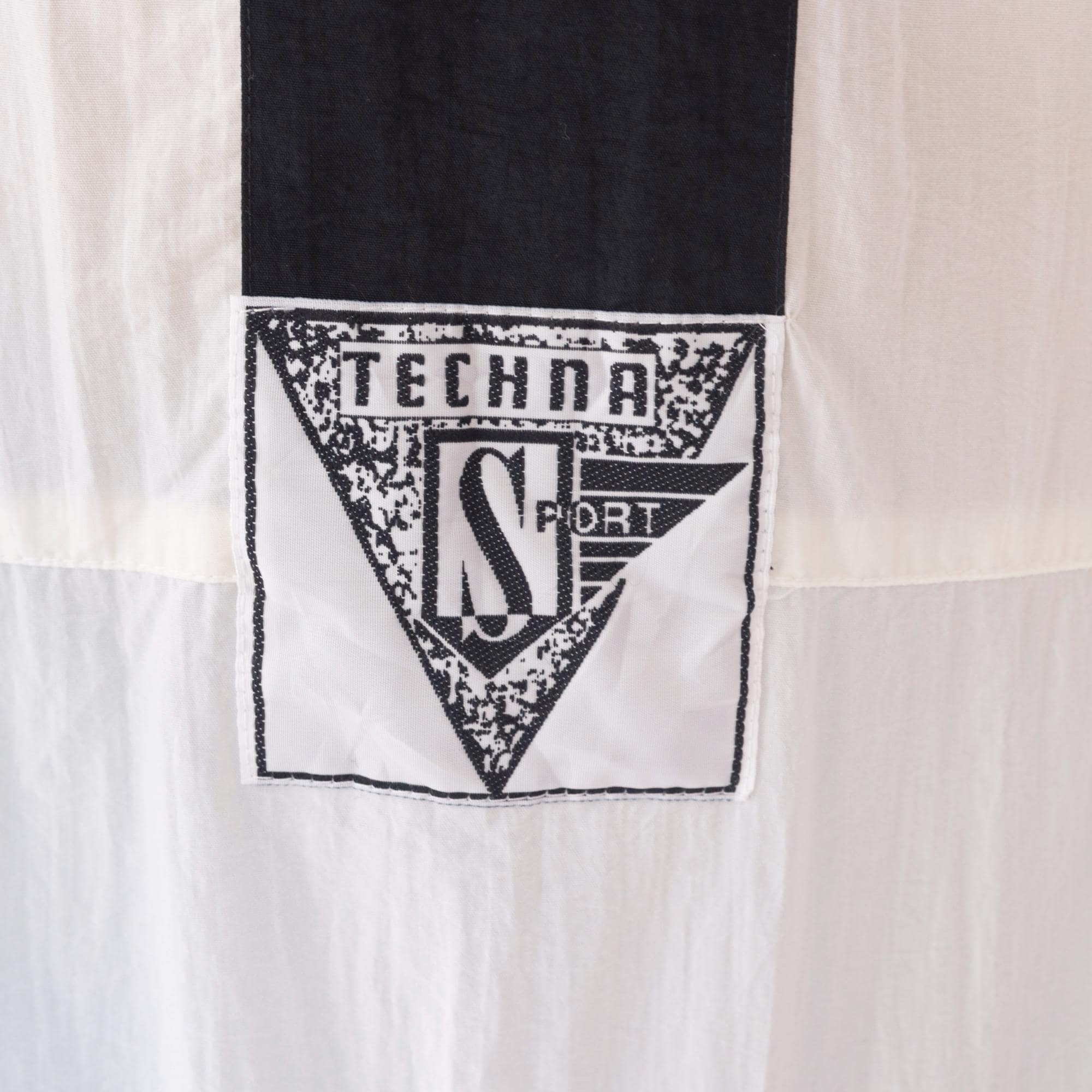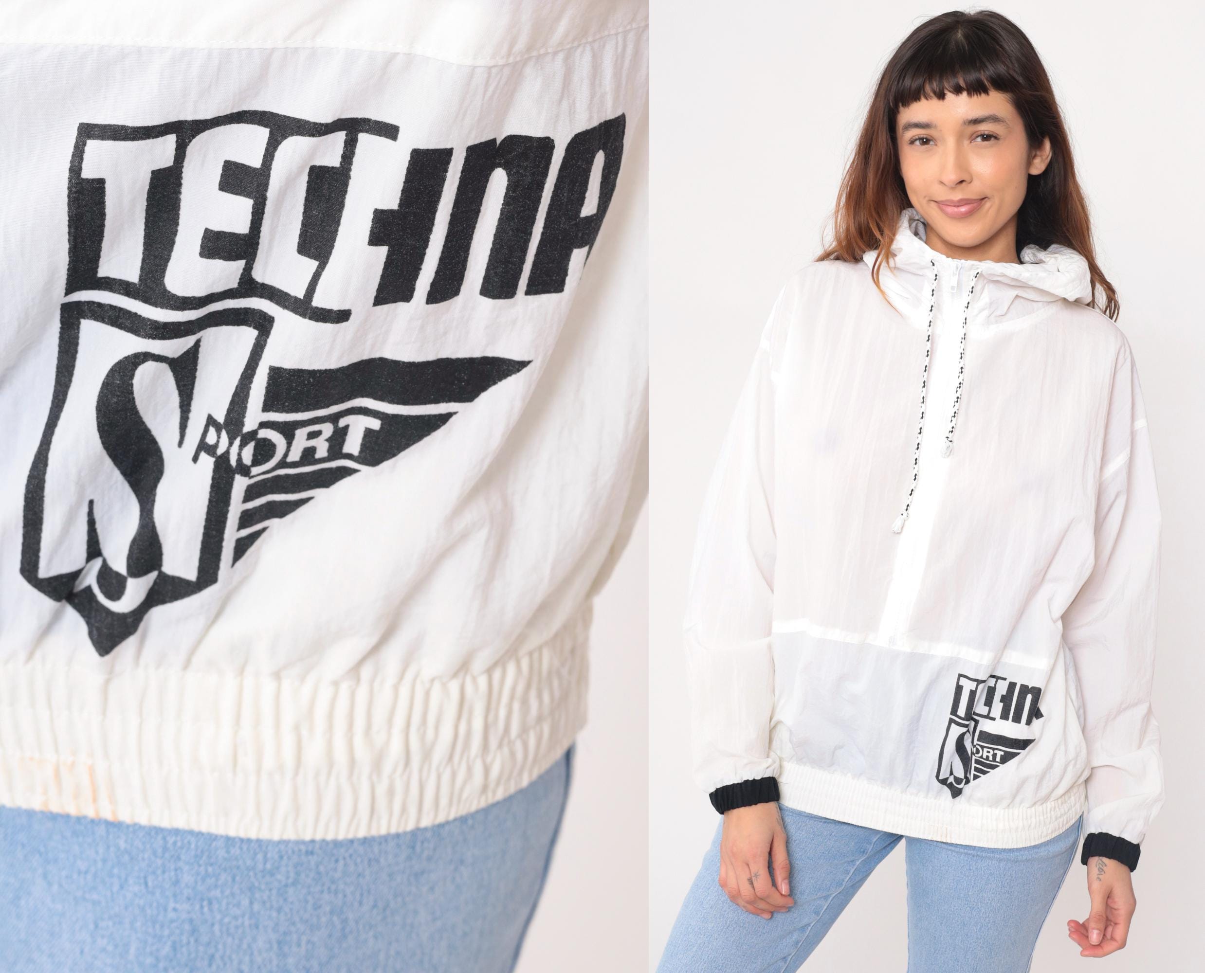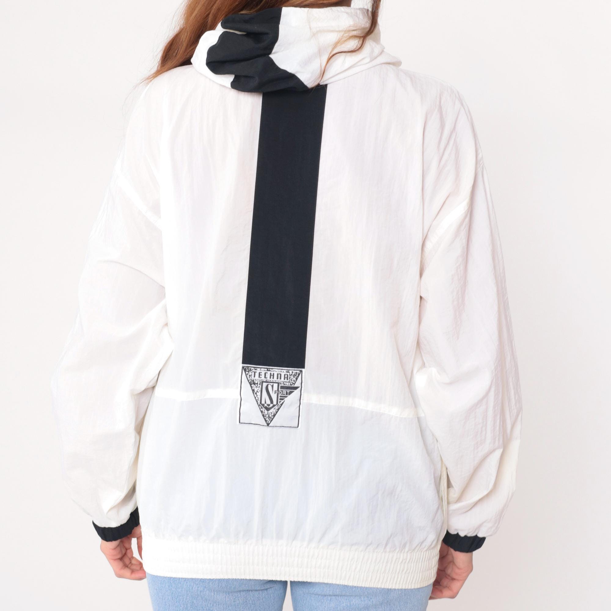 90s white nylon windbreaker pullover from Techno Sport with hood featuring black and white checkered drawstring. Half-zip front closure, "TECHNO SPORT" graphic on chest and matching scarf detail at neck. Black ribbed cuffs at wrists and elastic hem at waist.