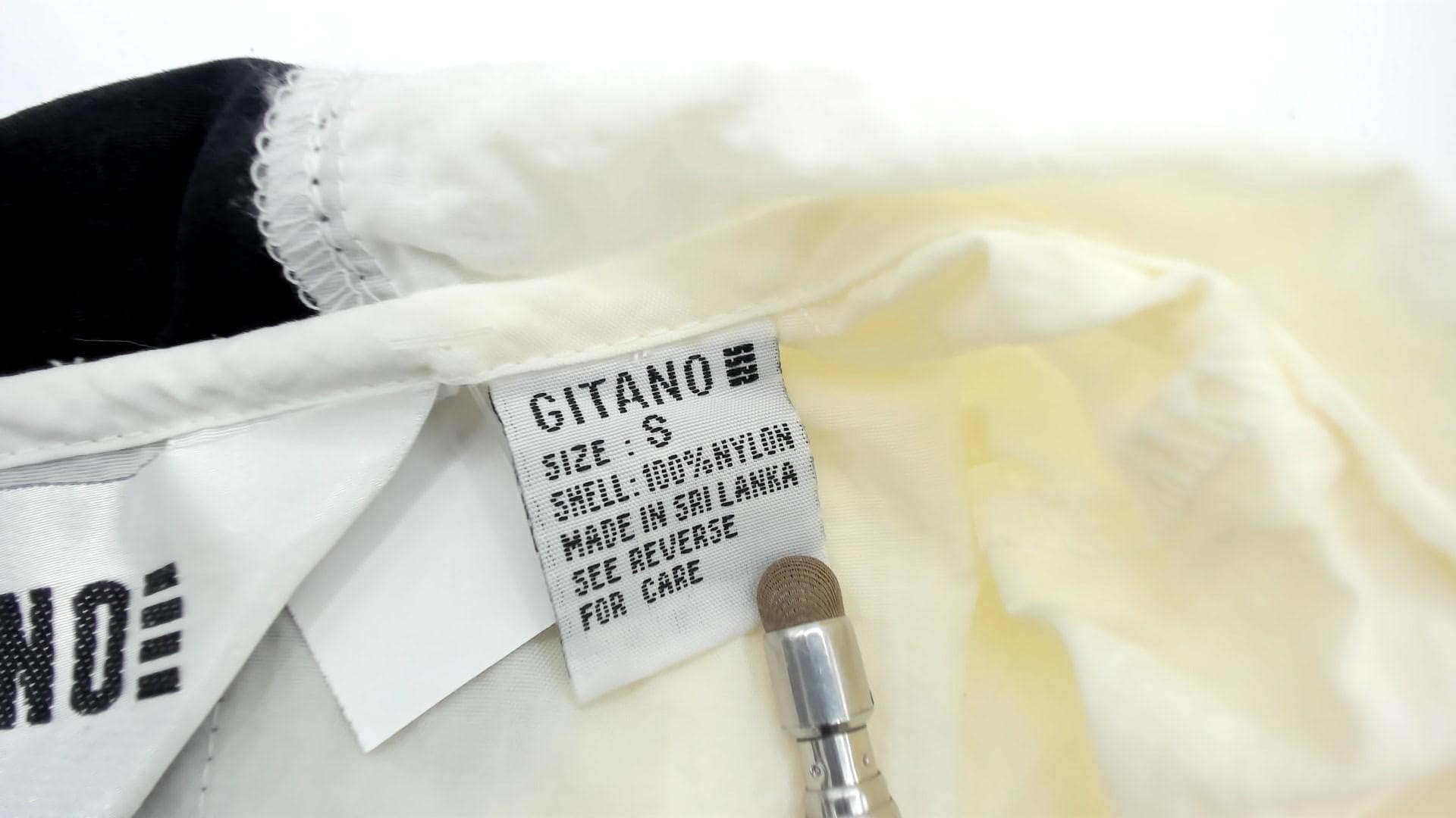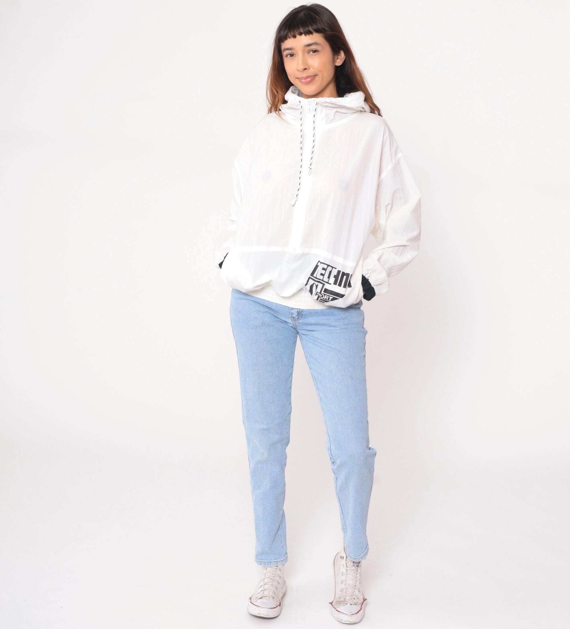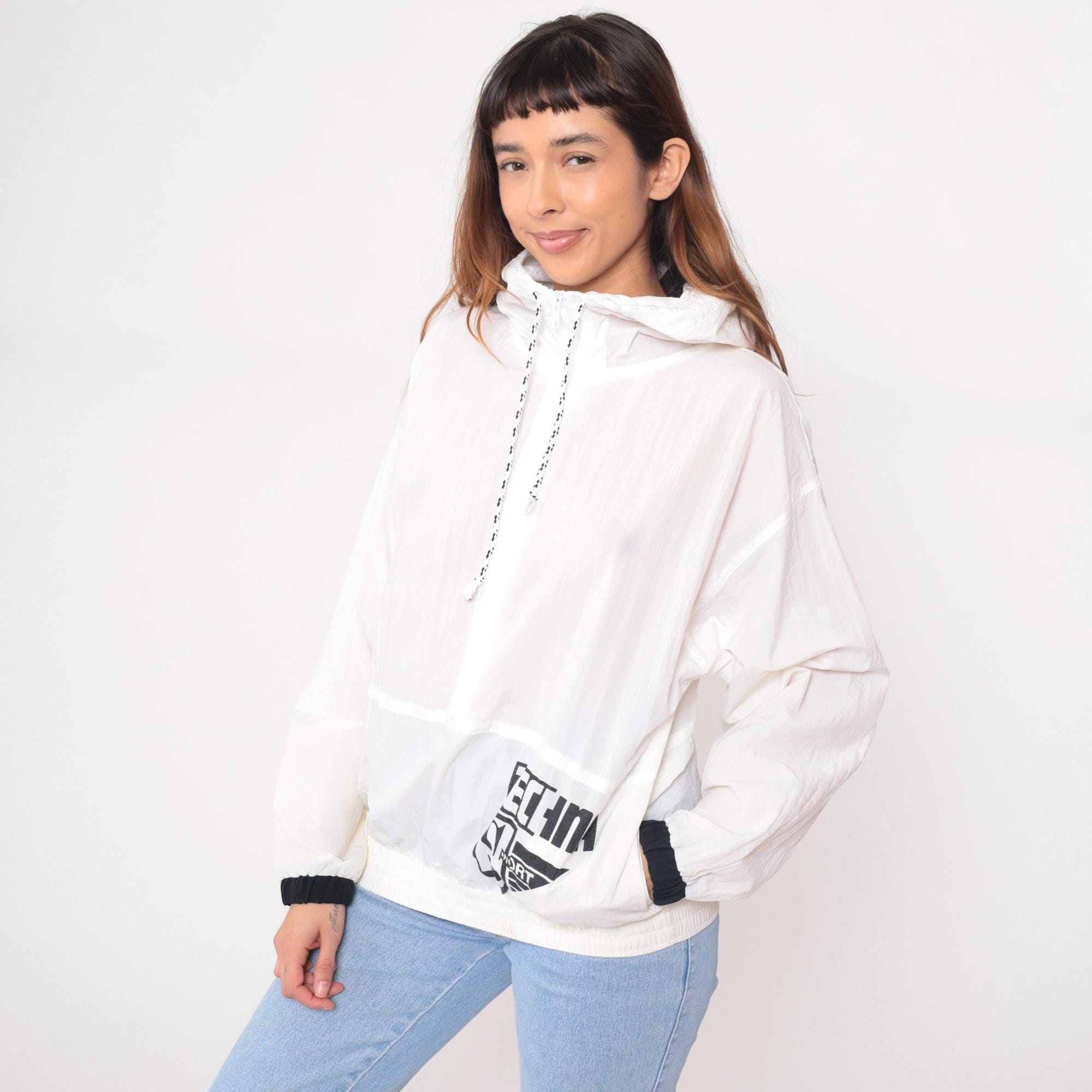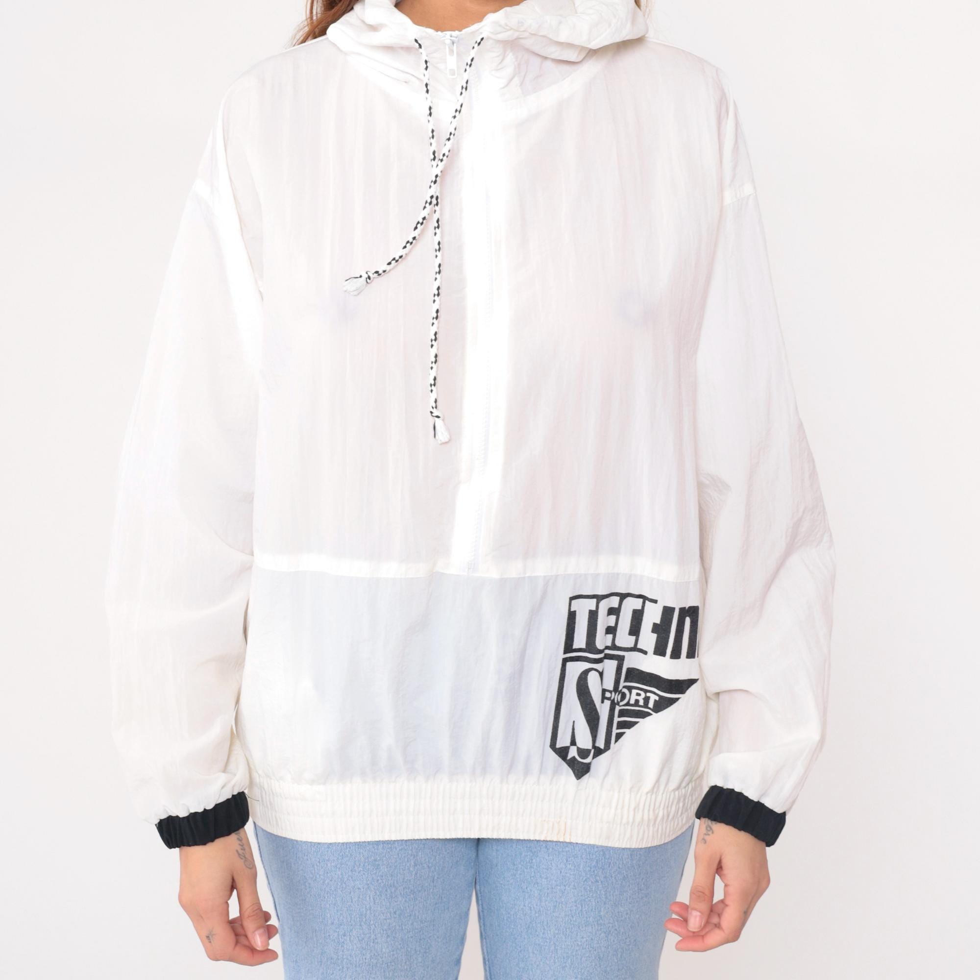 90s white nylon windbreaker pullover from Techno Sport with hood featuring black and white checkered drawstring. Half-zip front closure, "TECHNO SPORT" graphic on chest and matching scarf detail at neck. Black ribbed cuffs at wrists and elastic hem at waist.