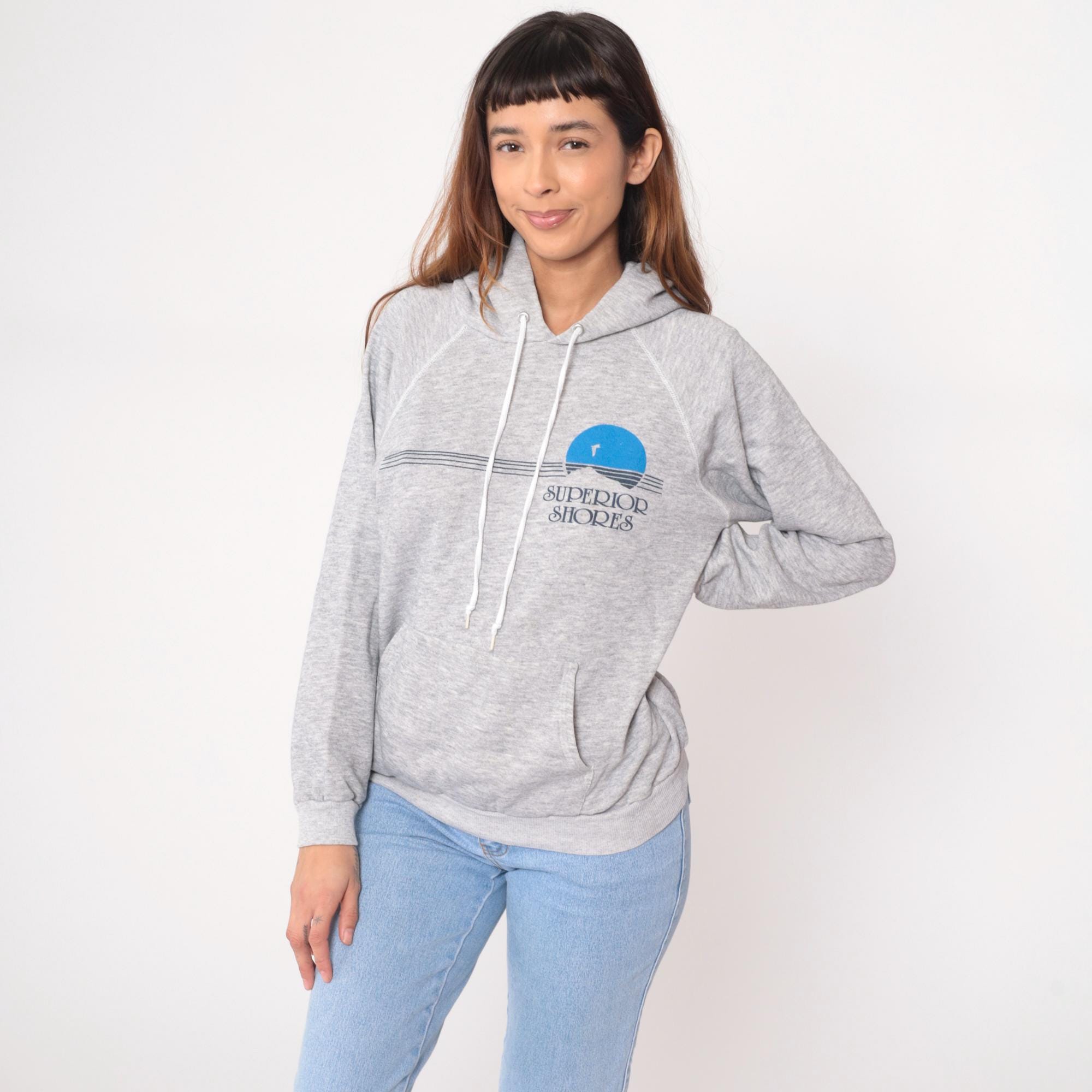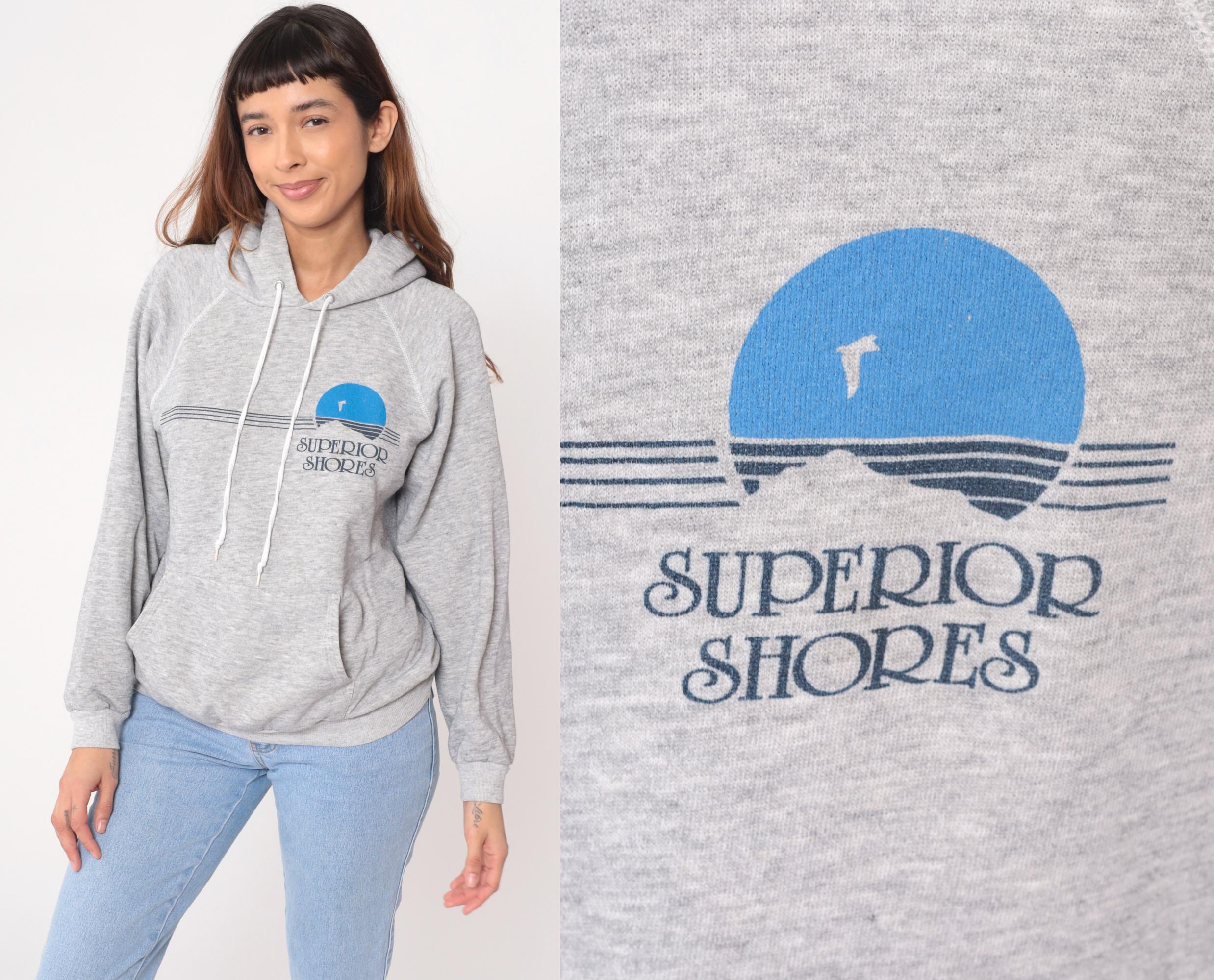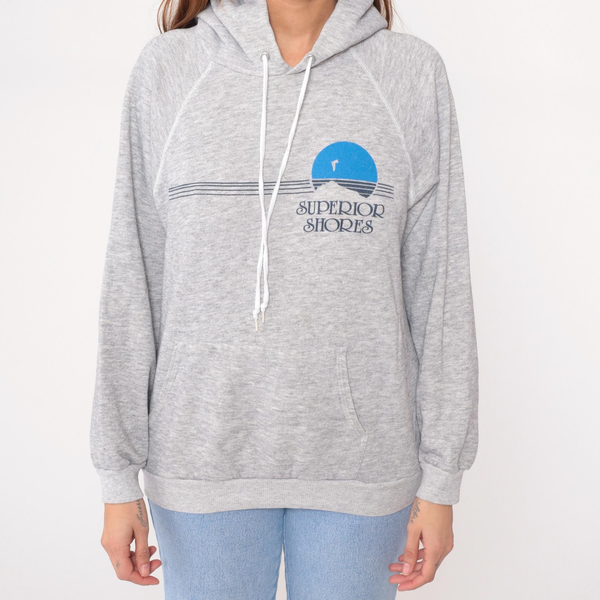 90s gray hoodie from Hanes with "Superior Shores" graphic on front, featuring blue sunset design with horizontal lines and seabird silhouette. Drawstring hood with white drawstrings, kangaroo pocket, raglan sleeves.
