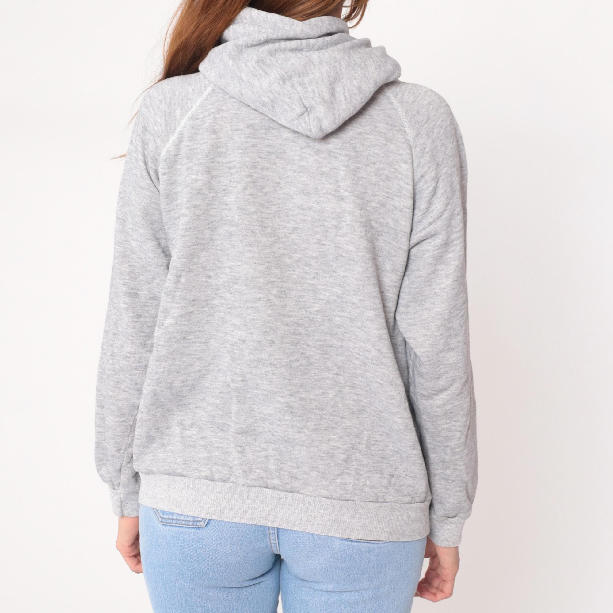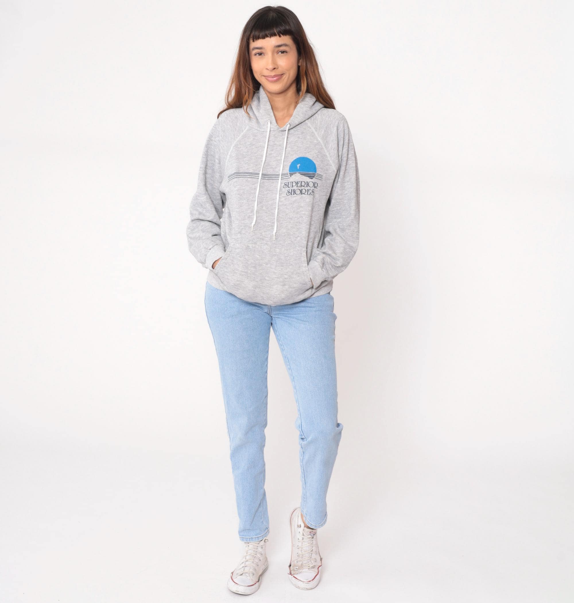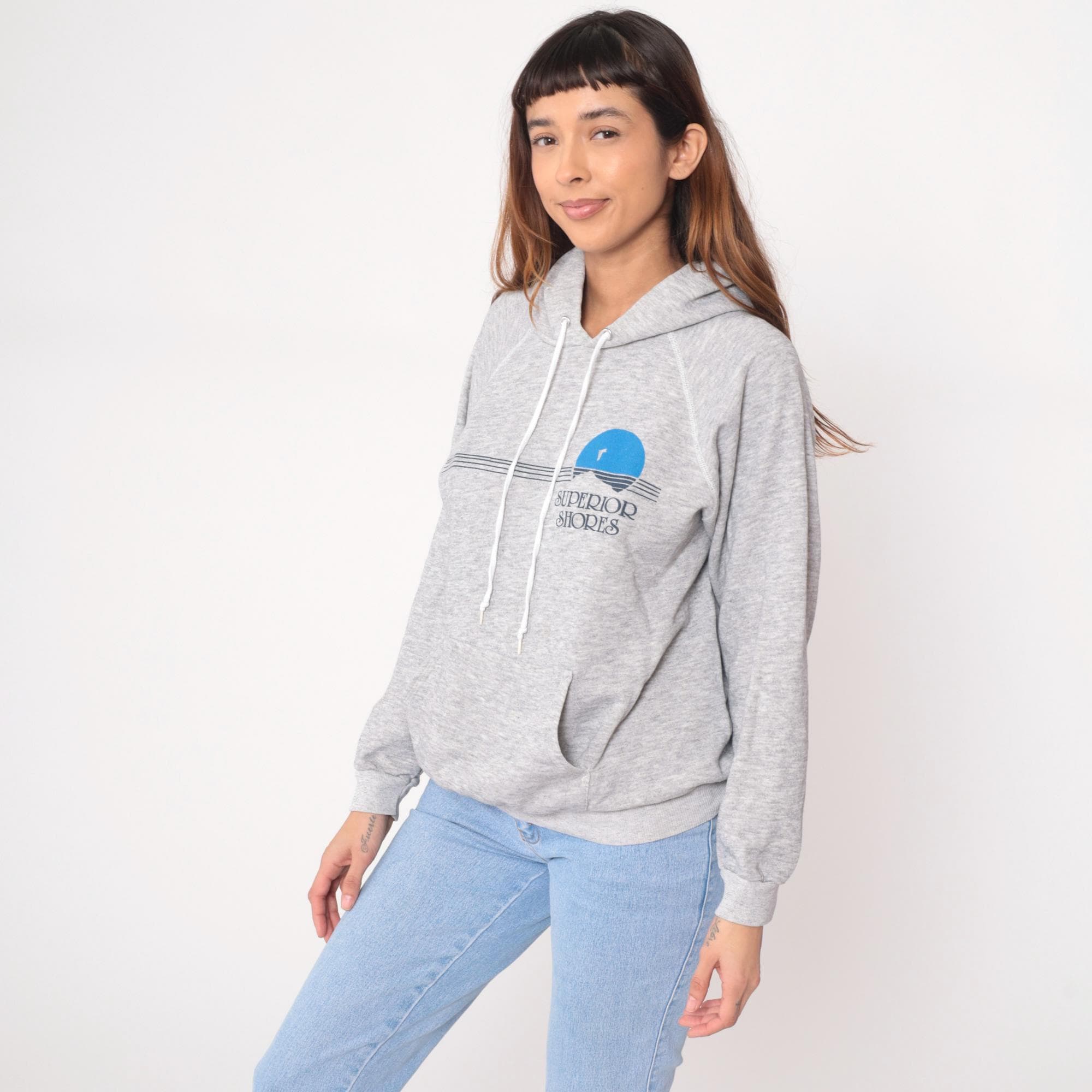 90s gray hoodie from Hanes with "Superior Shores" graphic on front, featuring blue sunset design with horizontal lines and seabird silhouette. Drawstring hood with white drawstrings, kangaroo pocket, raglan sleeves.