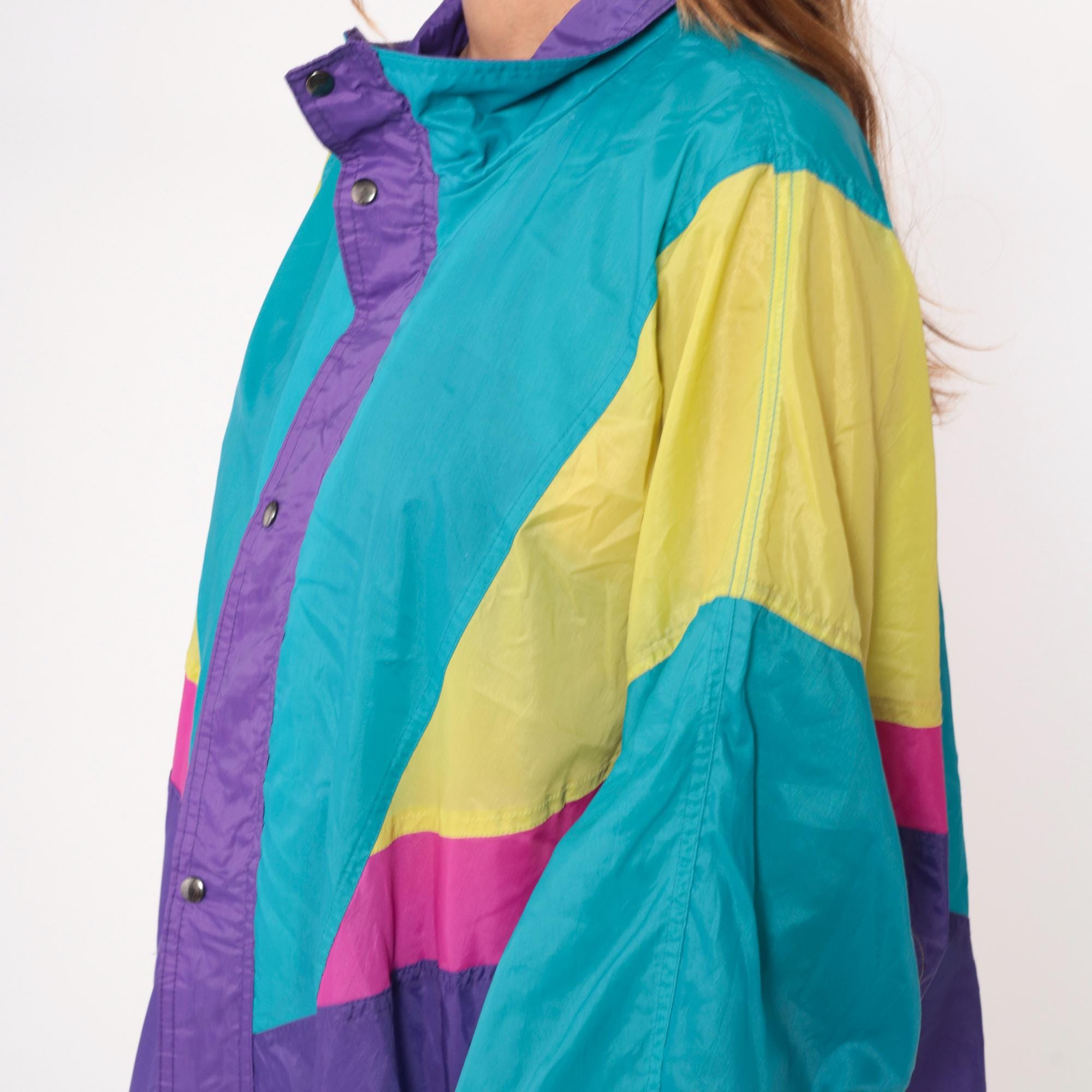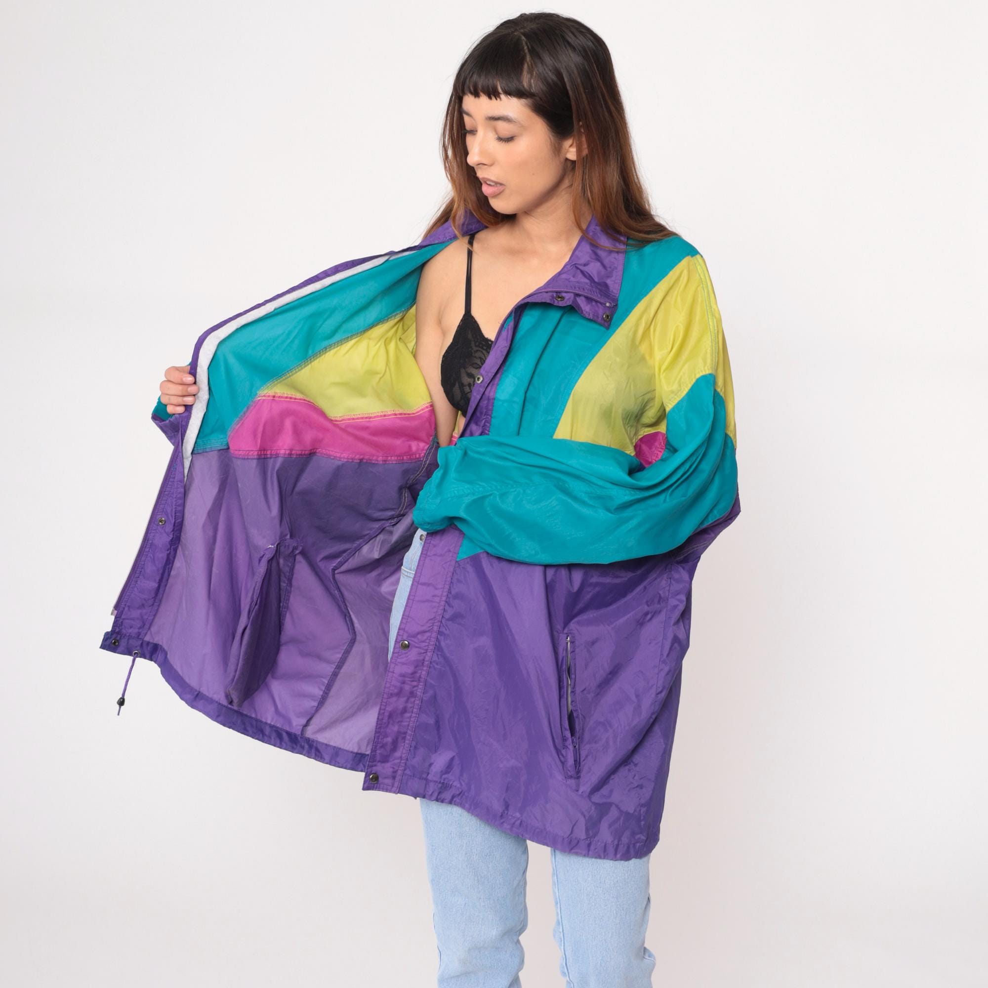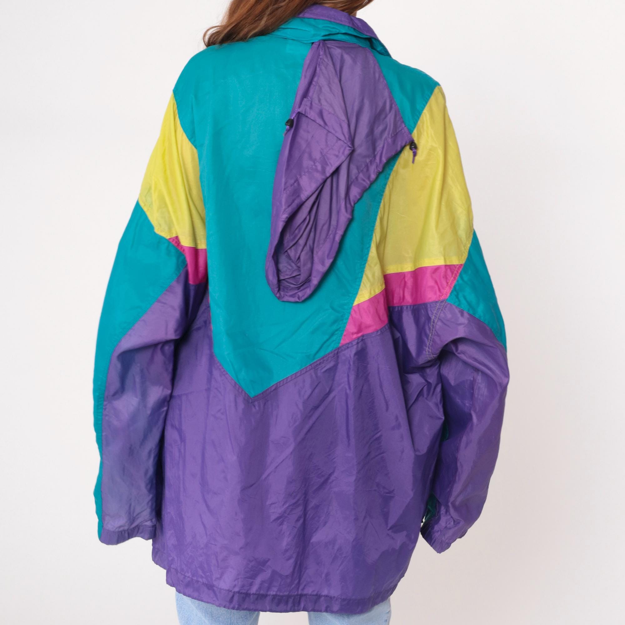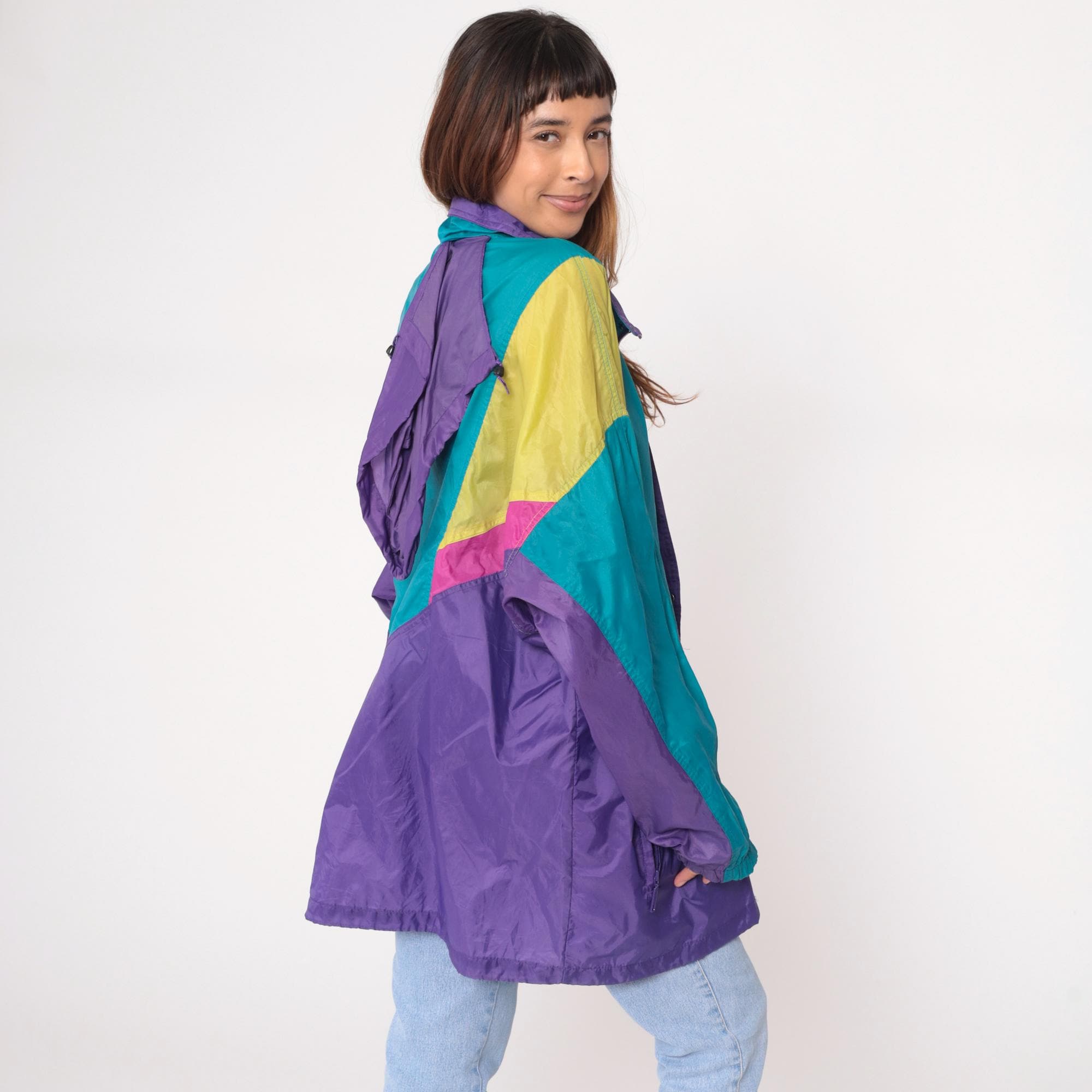 90s colorblock windbreaker from etirl in purple, turquoise, yellow, and pink geometric panels. Button and snap front closure, attached hood with drawstring and back collar storage pocket, elastic cuffs and hem.