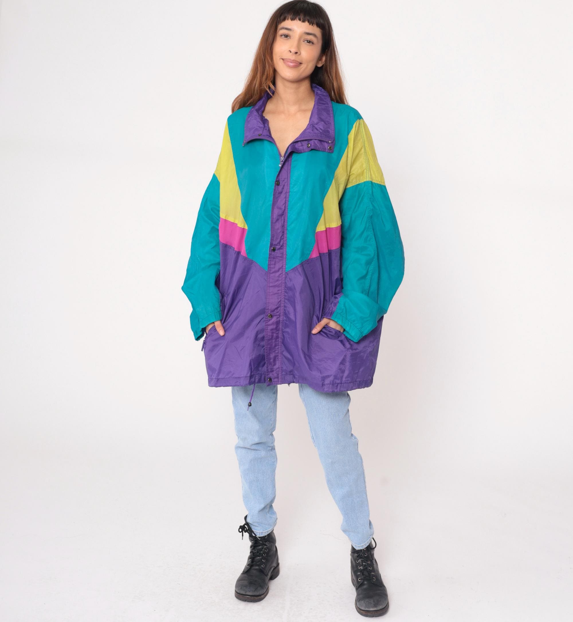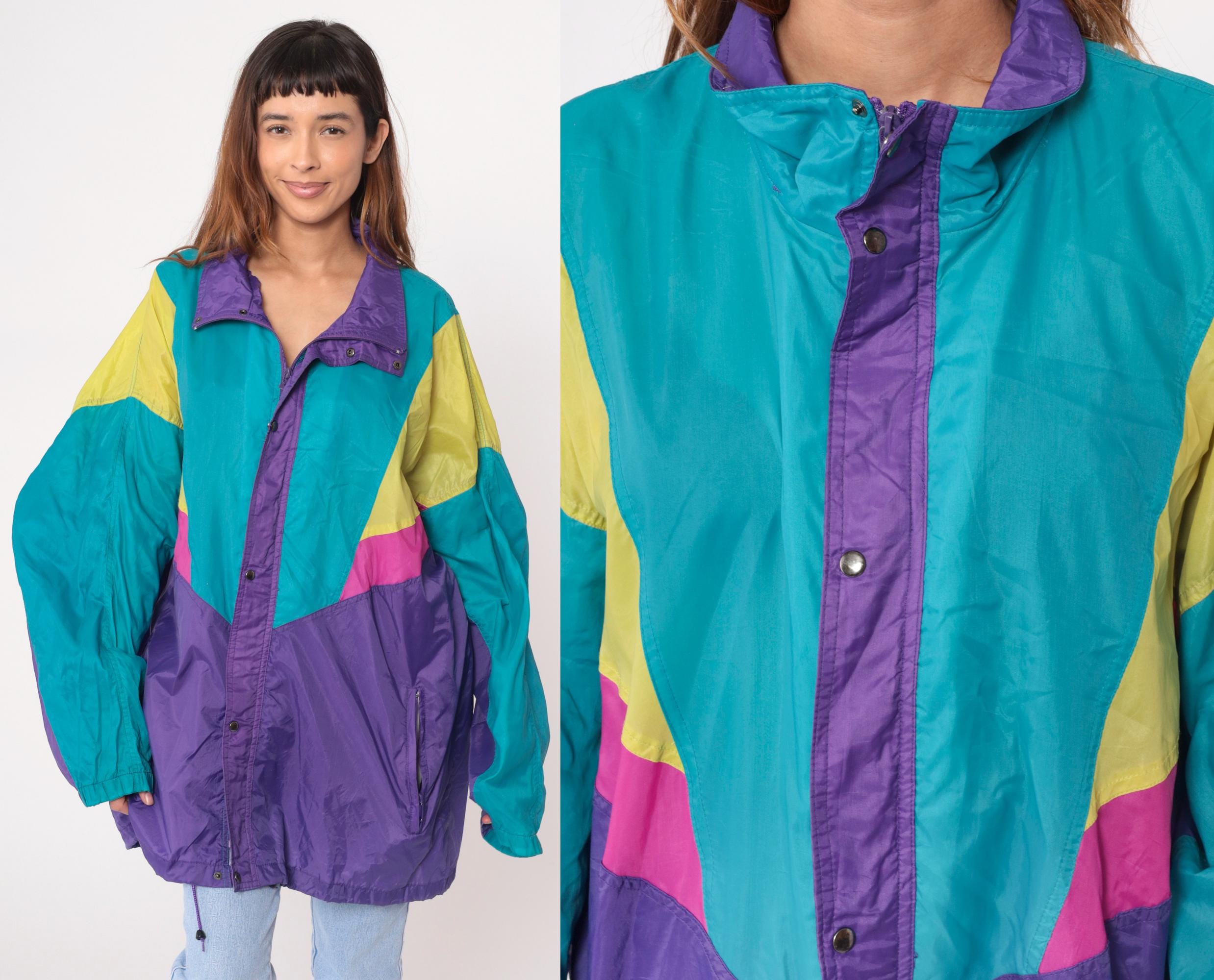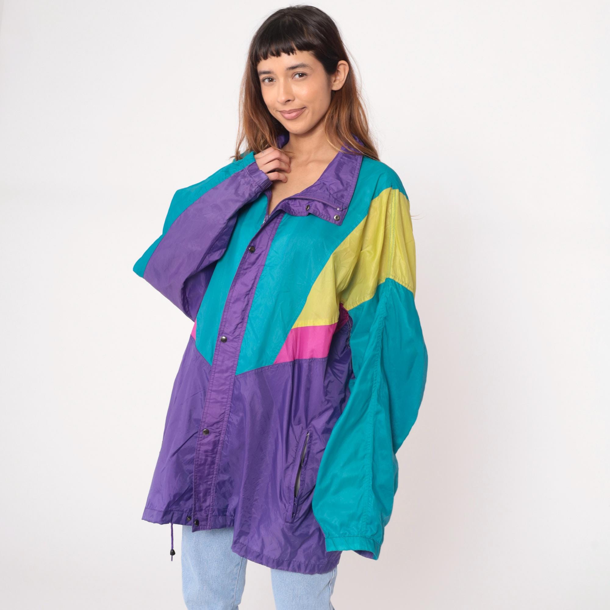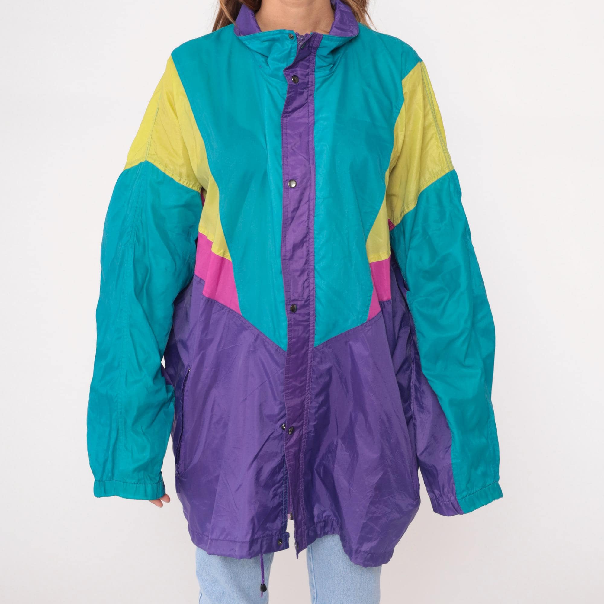 90s colorblock windbreaker from etirl in purple, turquoise, yellow, and pink geometric panels. Button and snap front closure, attached hood with drawstring and back collar storage pocket, elastic cuffs and hem.