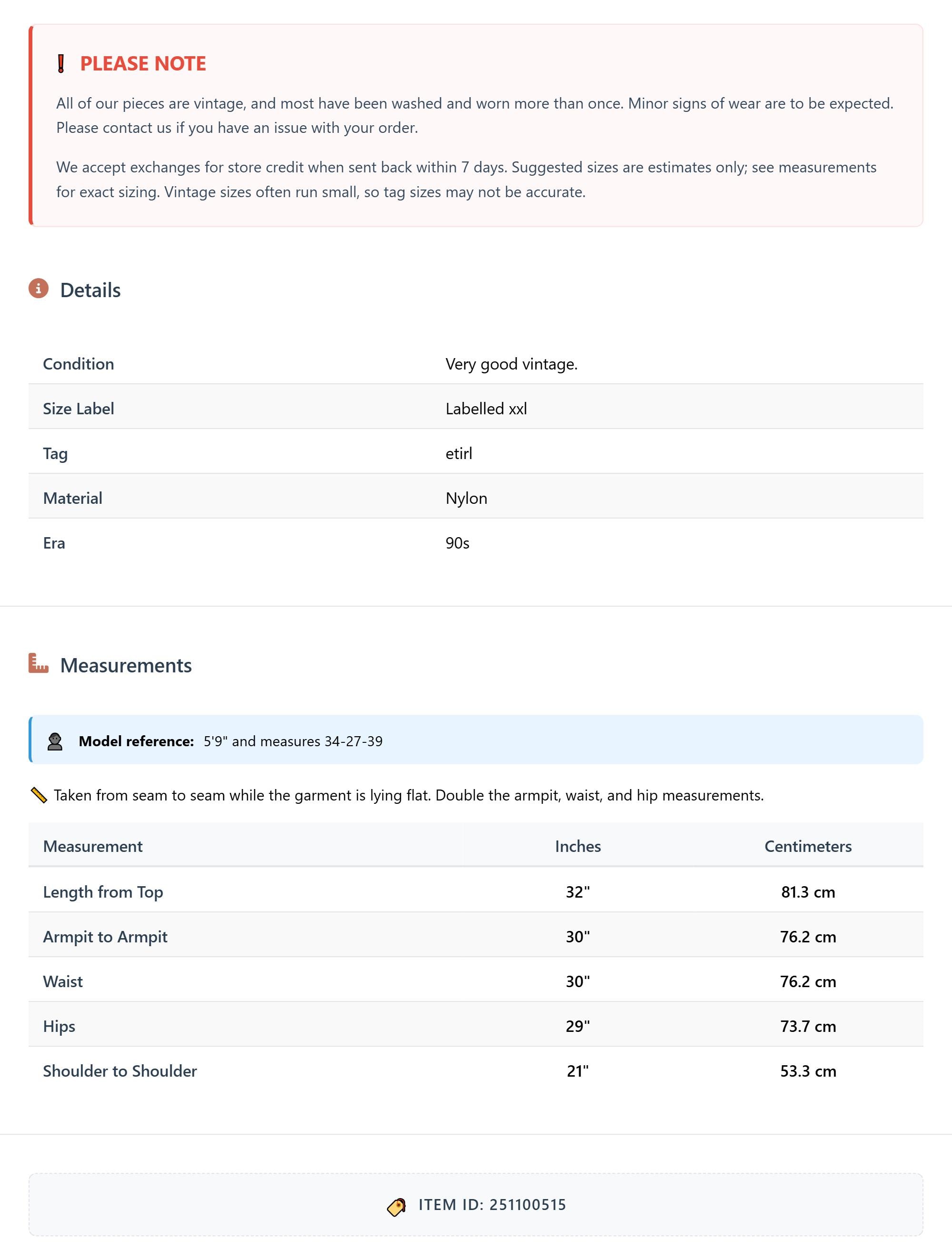 All of our pieces are vintage, and most have been washed and worn more than once. Minor signs of wear are to be expected. Please contact us if you have an issue with your order. We accept exchanges for store credit when sent back within 7 days.
