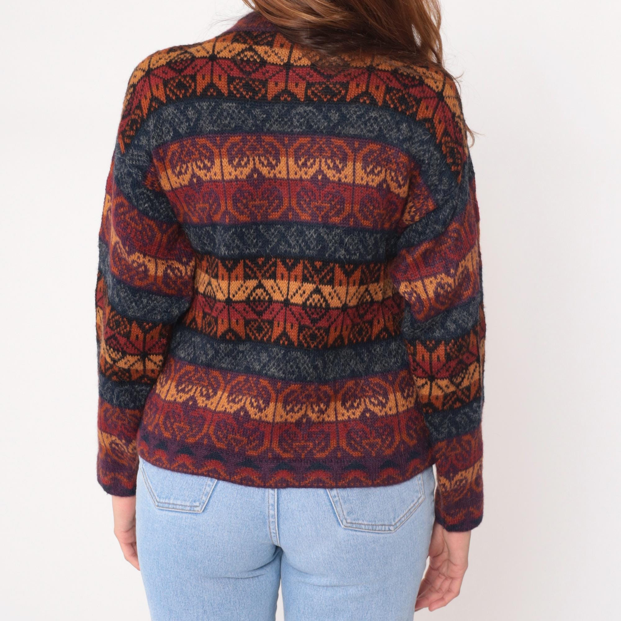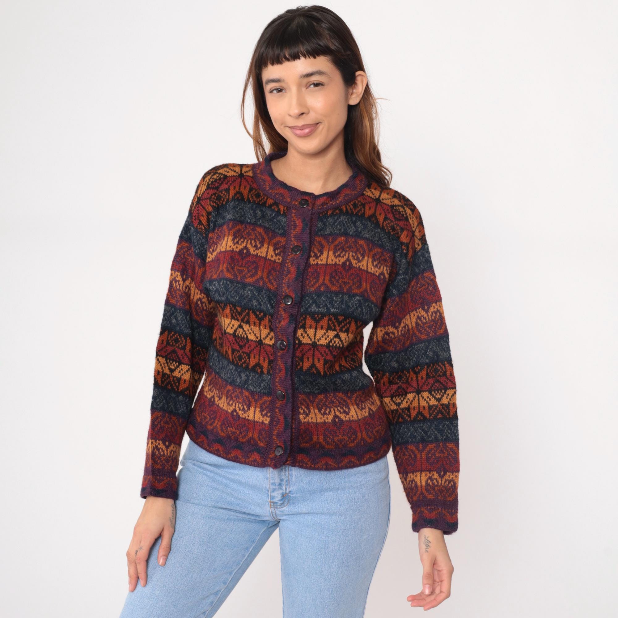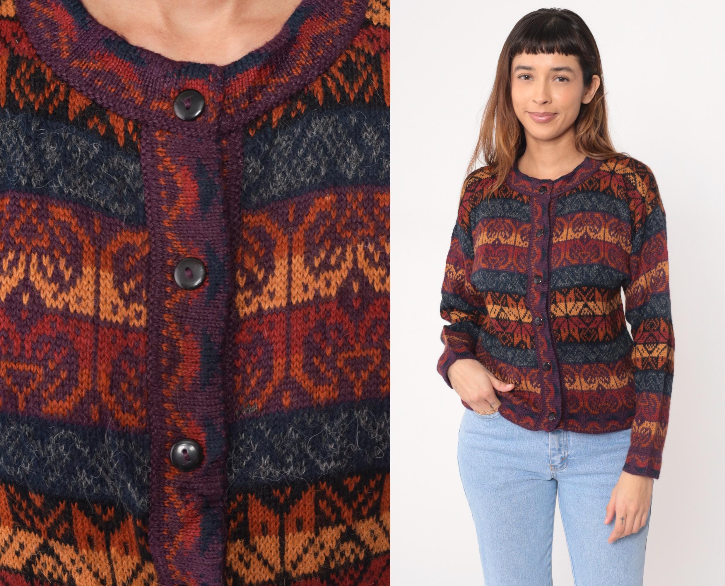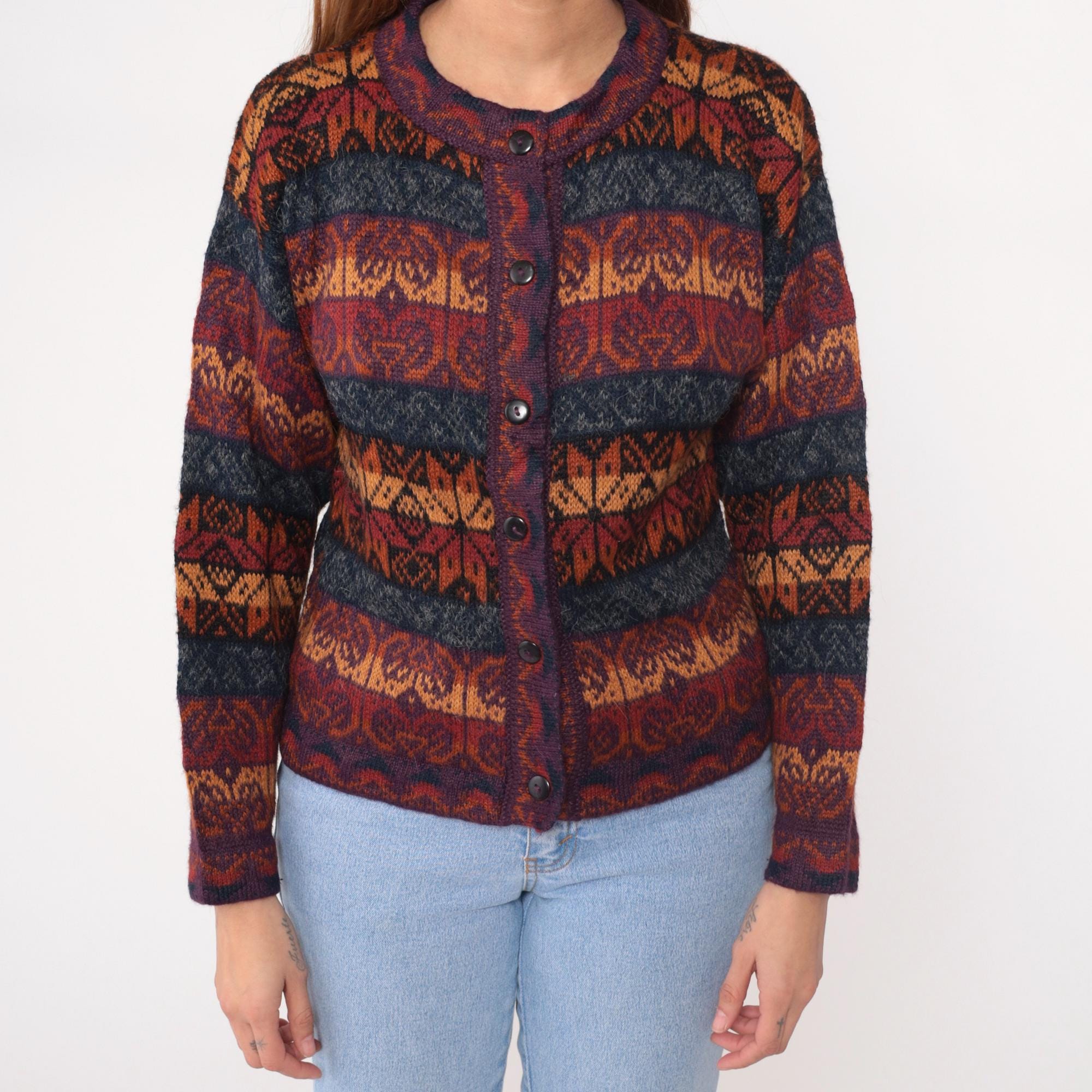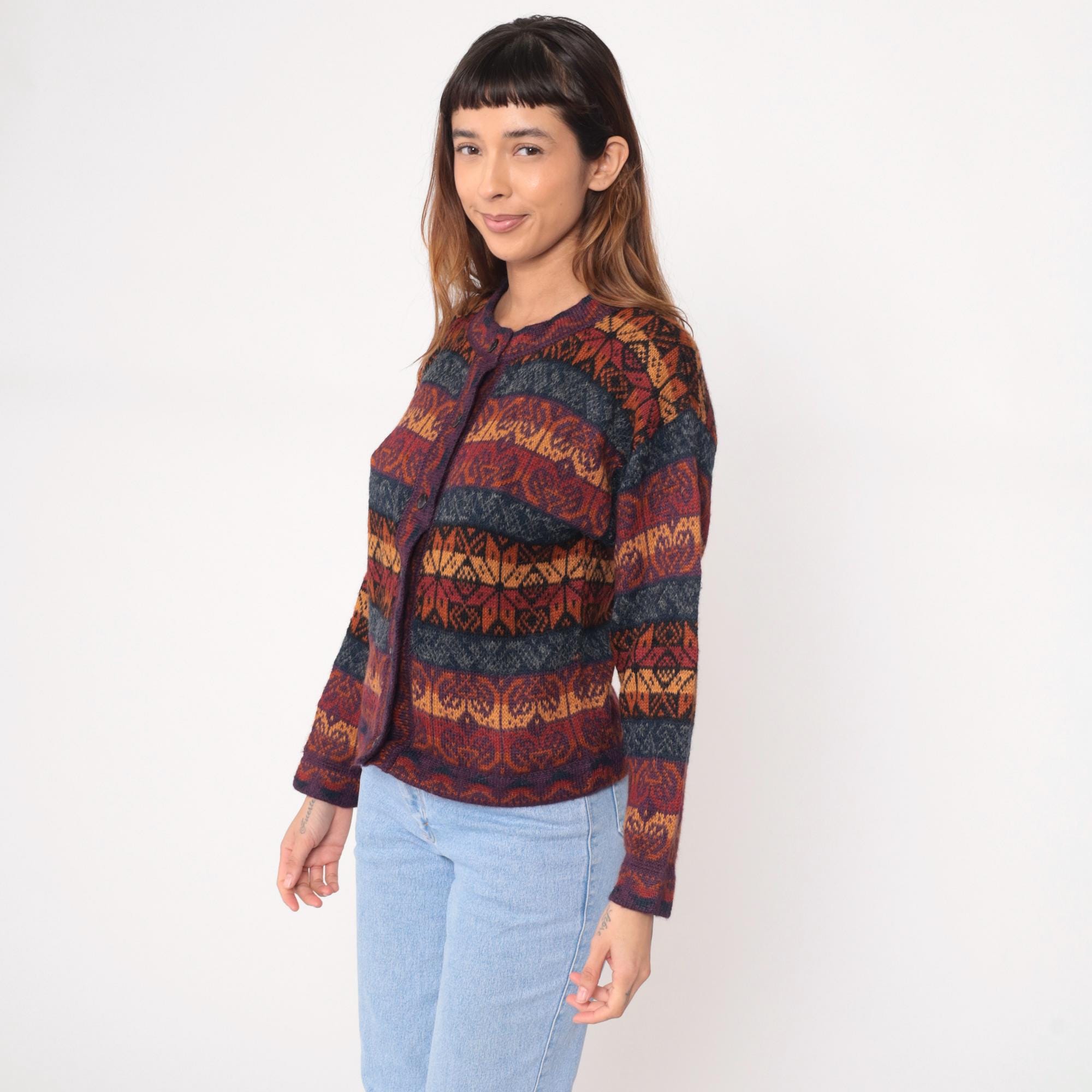 90s burgundy and rust striped cardigan with Fair Isle geometric patterns in horizontal bands across the body and sleeves. Round neckline, button front closure with dark purple buttons, long sleeves.