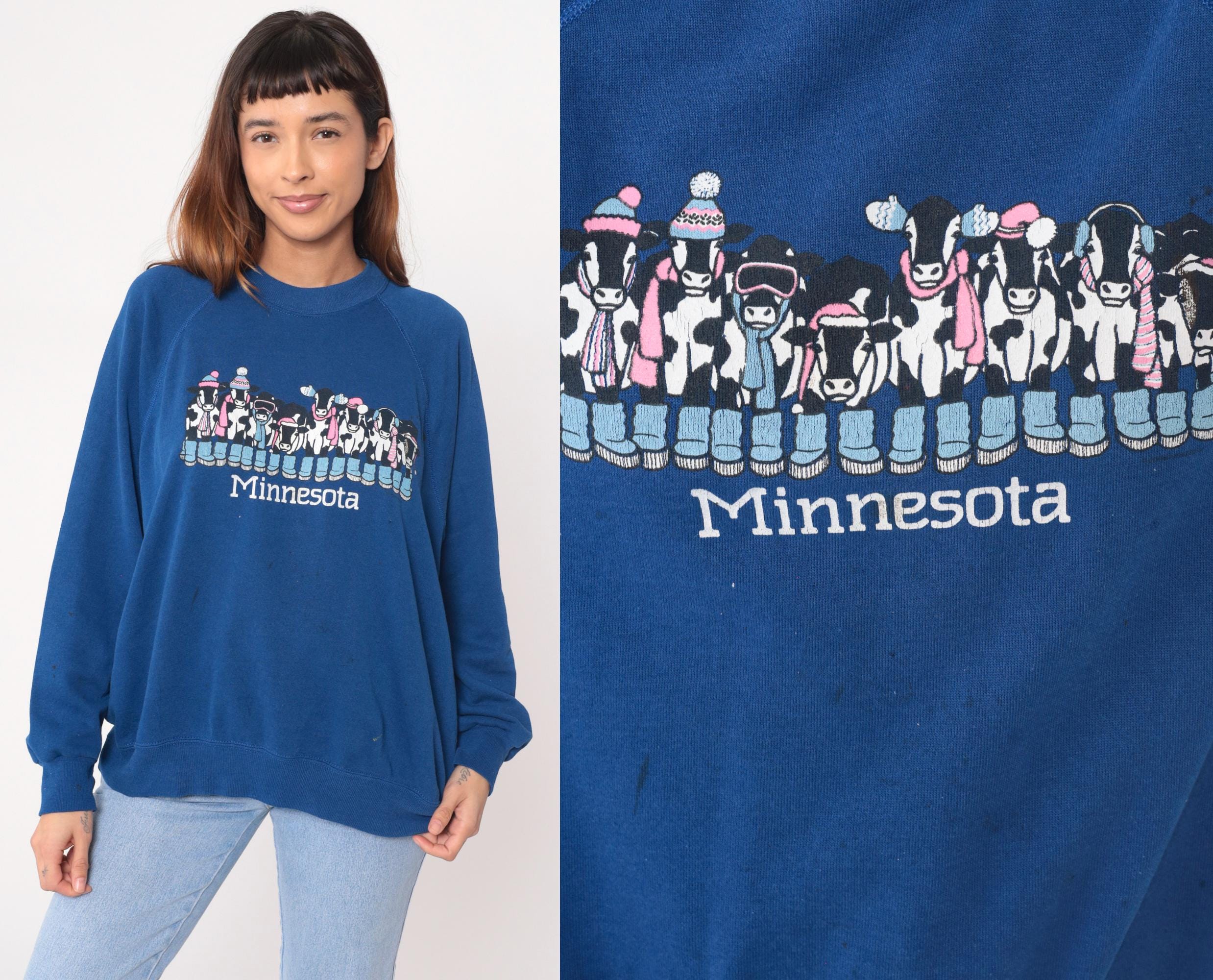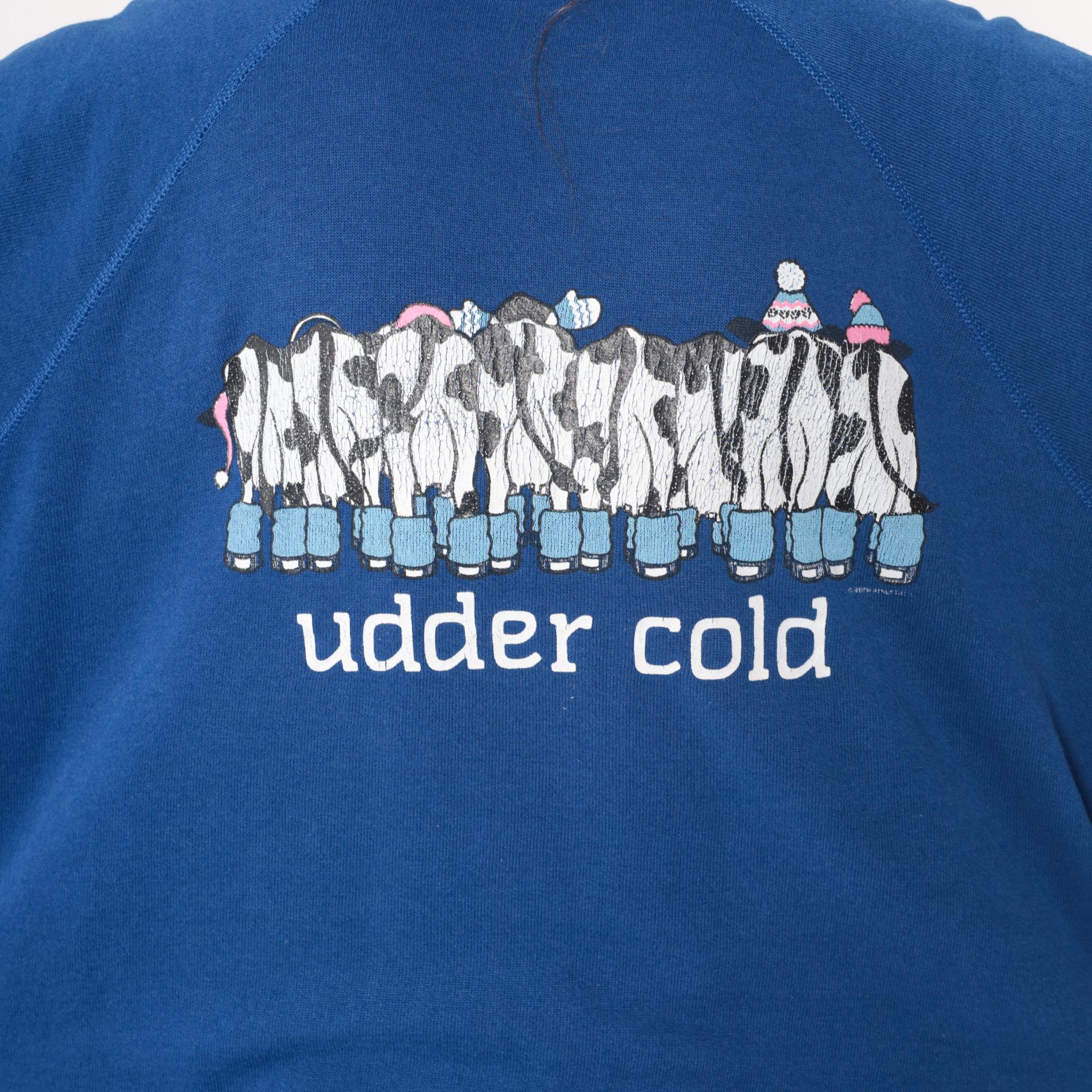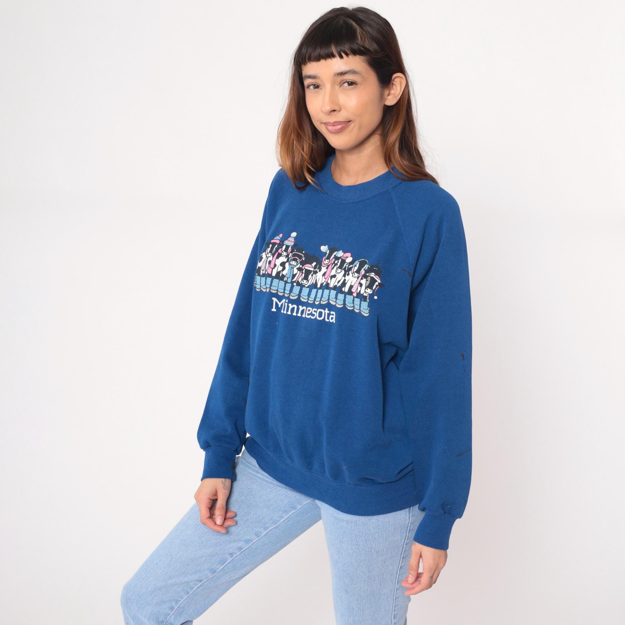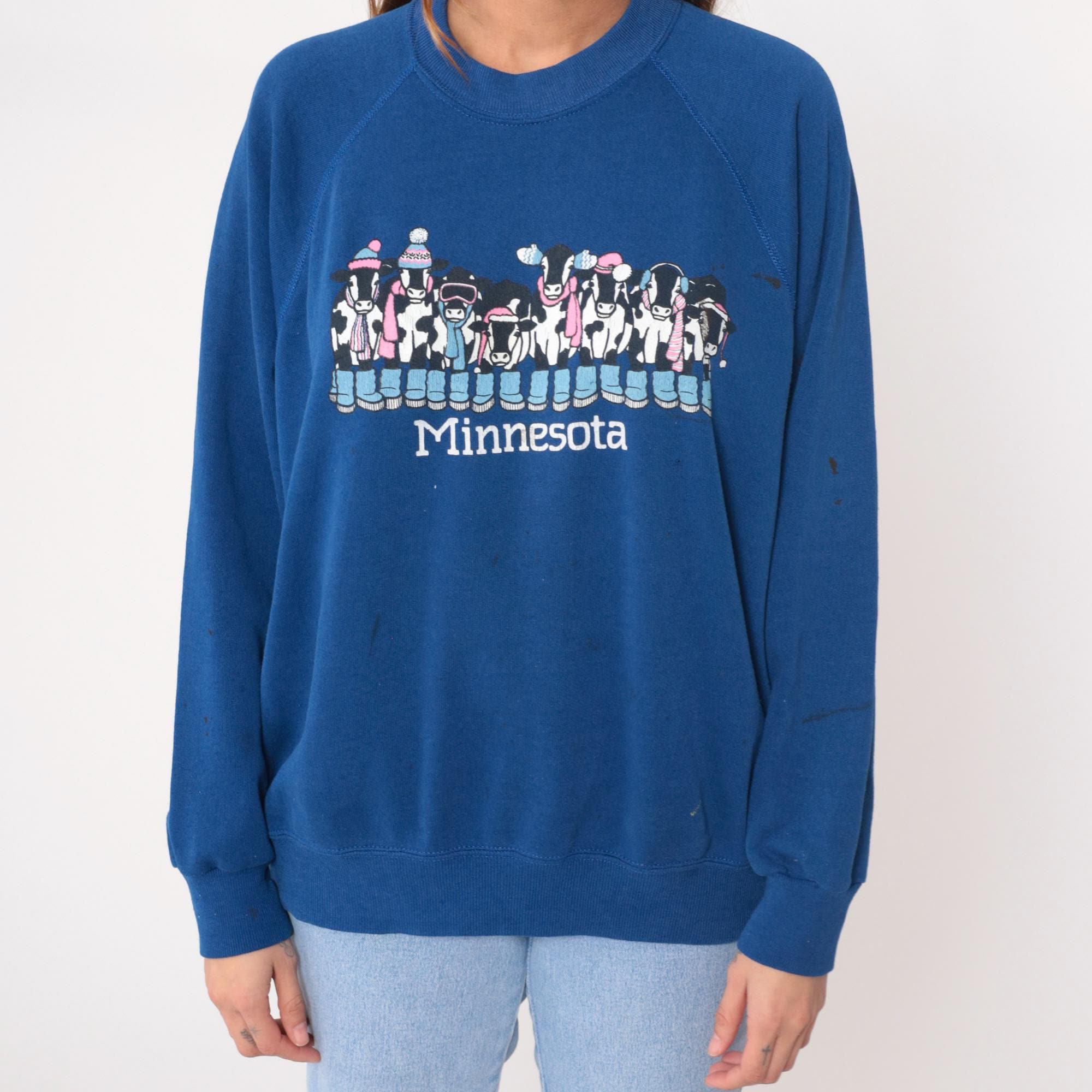 90s royal blue sweatshirt from bassett walker with Holstein cow graphic print on front and back. Front shows row of cows wearing winter hats and scarves with "Minnesota" text below, back shows the same cows from behind with "udder cold" pun text. Raglan sleeves, crew neck, ribbed cuffs and hem.