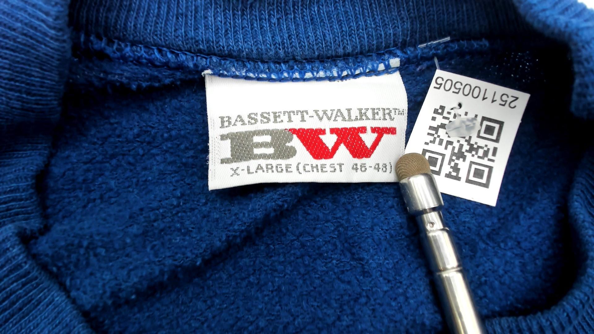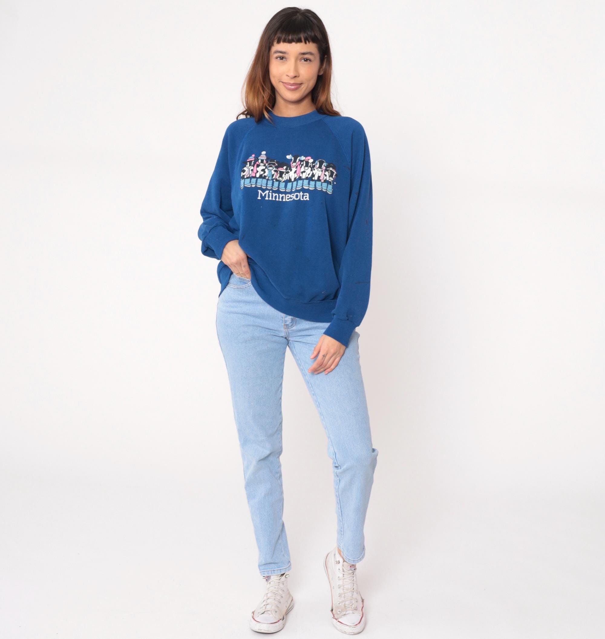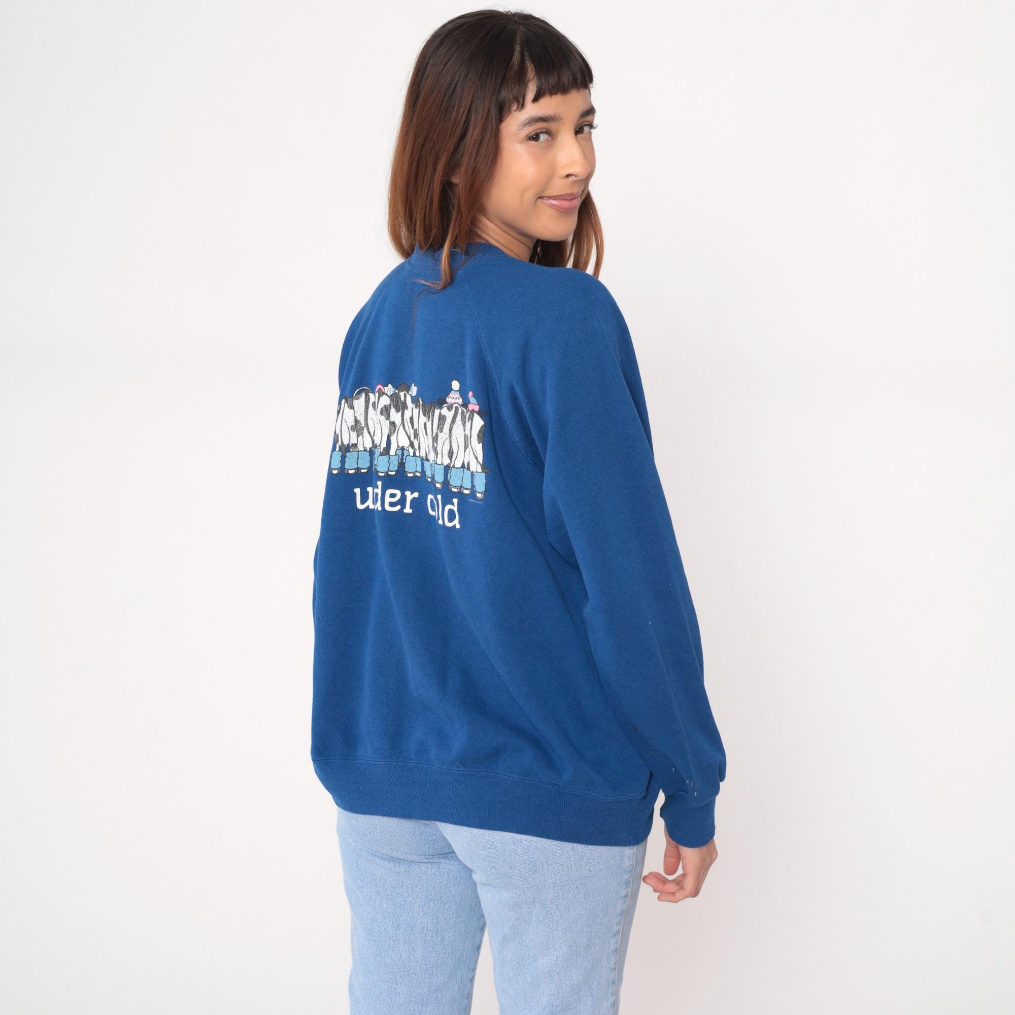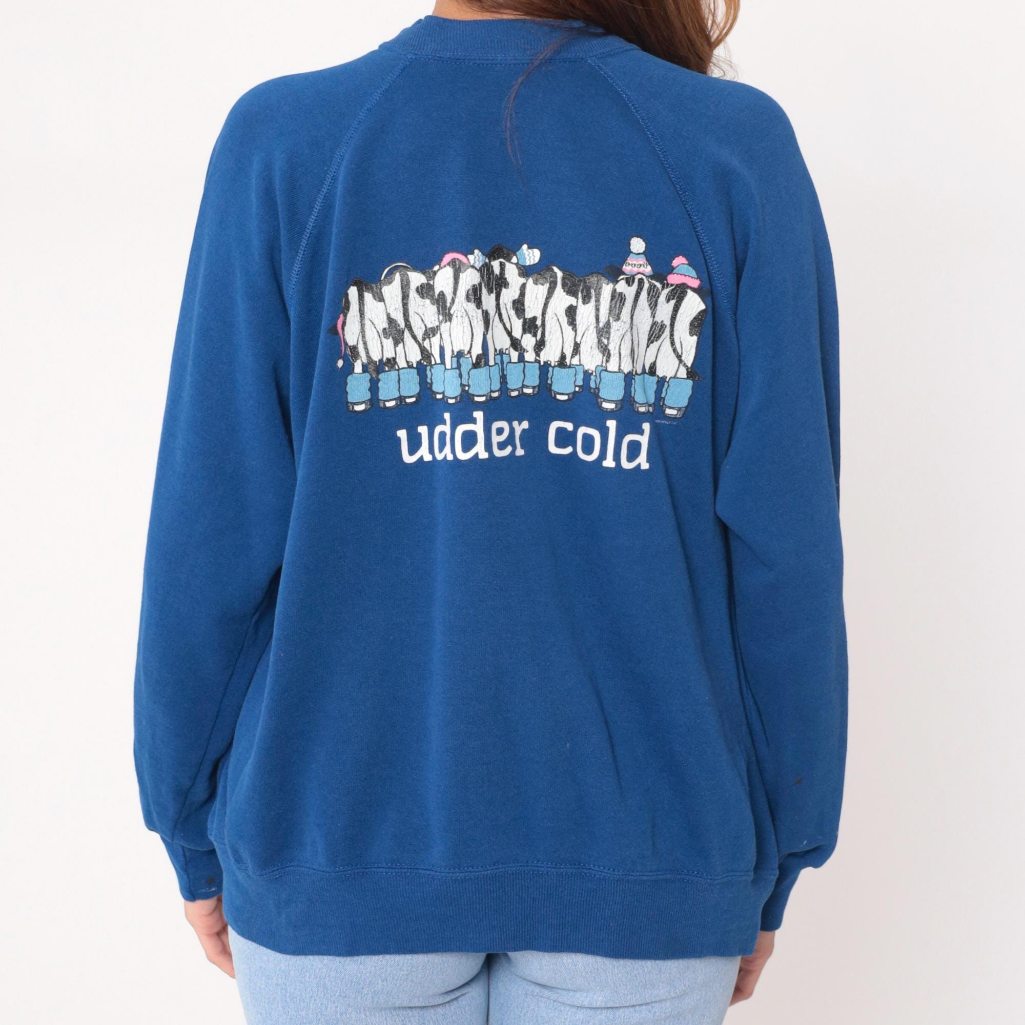 90s royal blue sweatshirt from bassett walker with Holstein cow graphic print on front and back. Front shows row of cows wearing winter hats and scarves with "Minnesota" text below, back shows the same cows from behind with "udder cold" pun text. Raglan sleeves, crew neck, ribbed cuffs and hem.