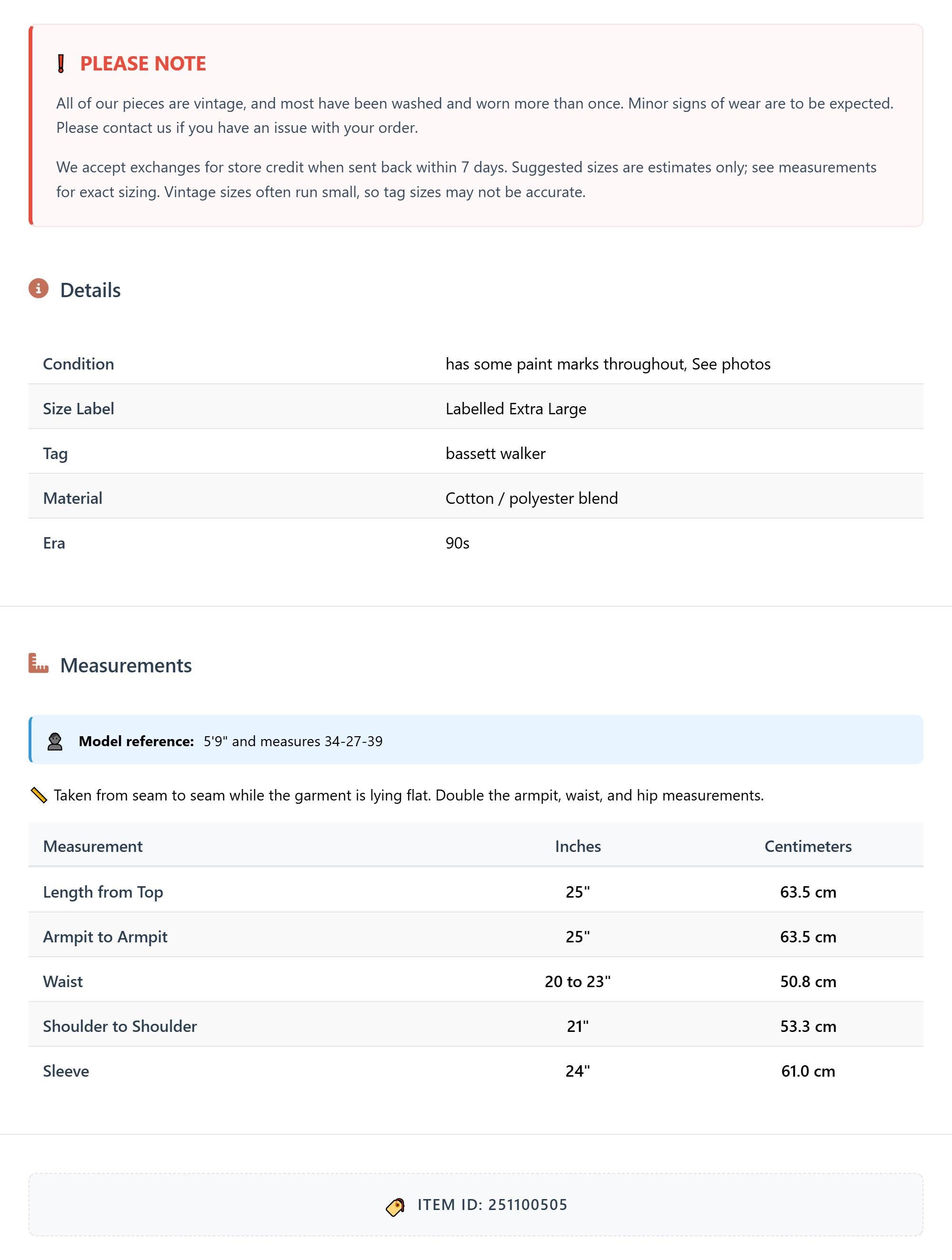 All of our pieces are vintage, and most have been washed and worn more than once. Minor signs of wear are to be expected. Please contact us if you have an issue with your order. We accept exchanges for store credit when sent back within 7 days.